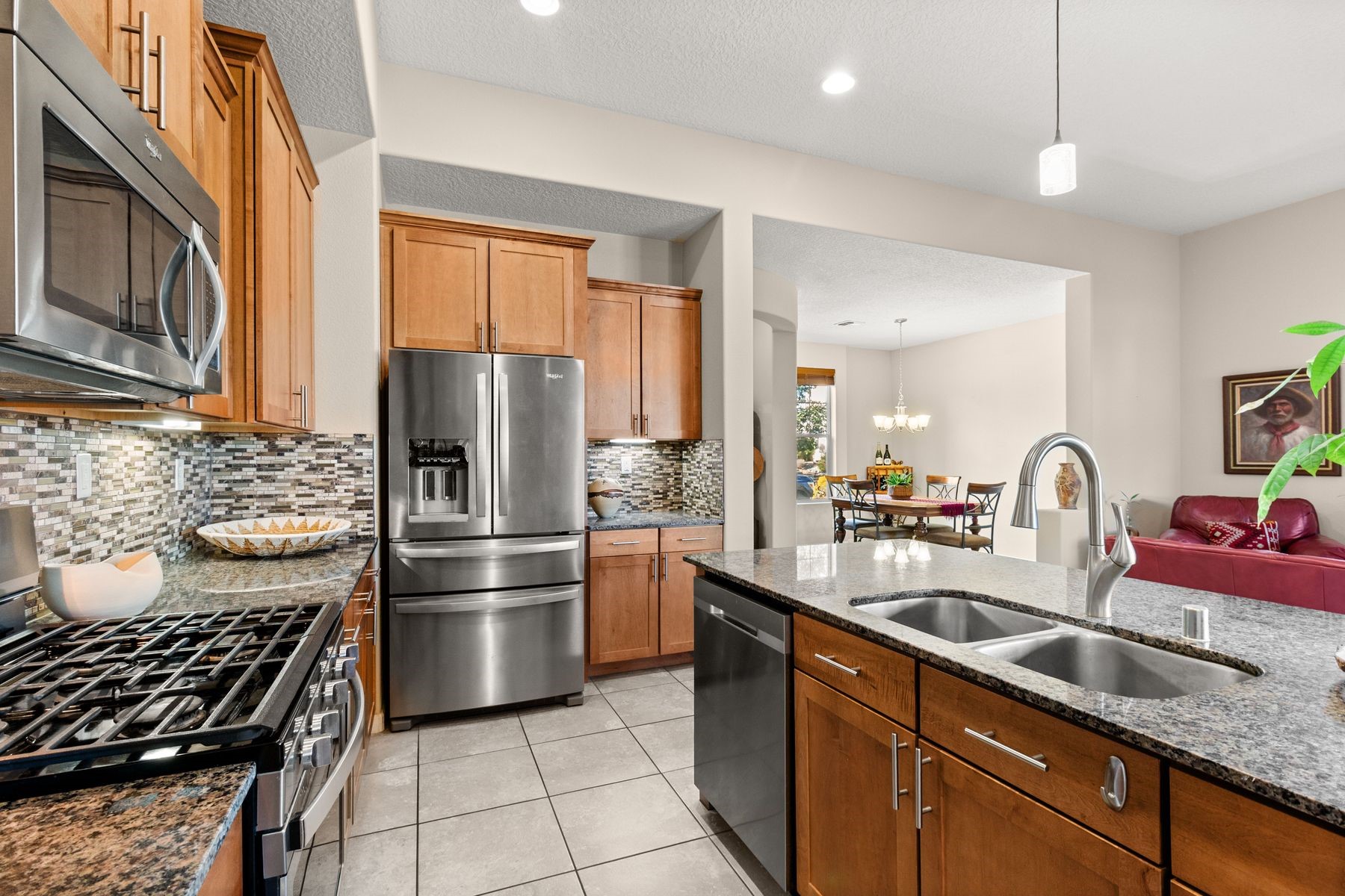 This Rancho Viejo home combines soft contemporary style with functional design. The open concept floor plan supports easy living, and the primary suite is privately located away from the guest bedrooms. Refined touches add a timeless character, and the property enjoys striking views of the Sangre de Cristo Mountains. A community park with picnic tables, benches, and playground equipment sits just a block away, adding to the appeal. Stretching across 11,000 rolling acres, Rancho Viejo is thoughtfully planned to provide a sense of community, while maintaining the wide open spaces with 50 percent of the land preserved as natural open space, parks and winding trails. The combination of comfort, style, and setting makes this a truly inviting residence.