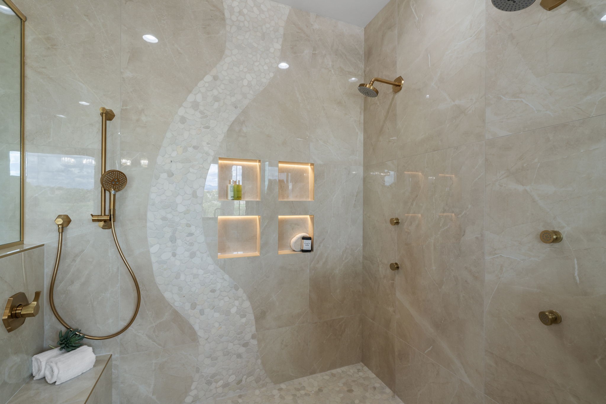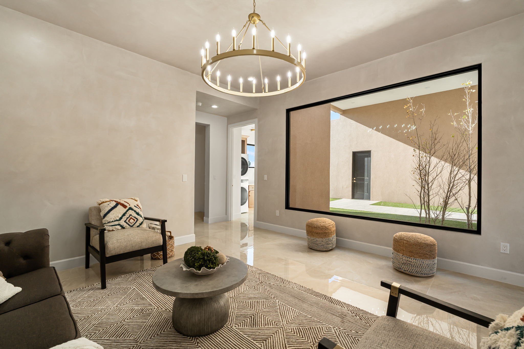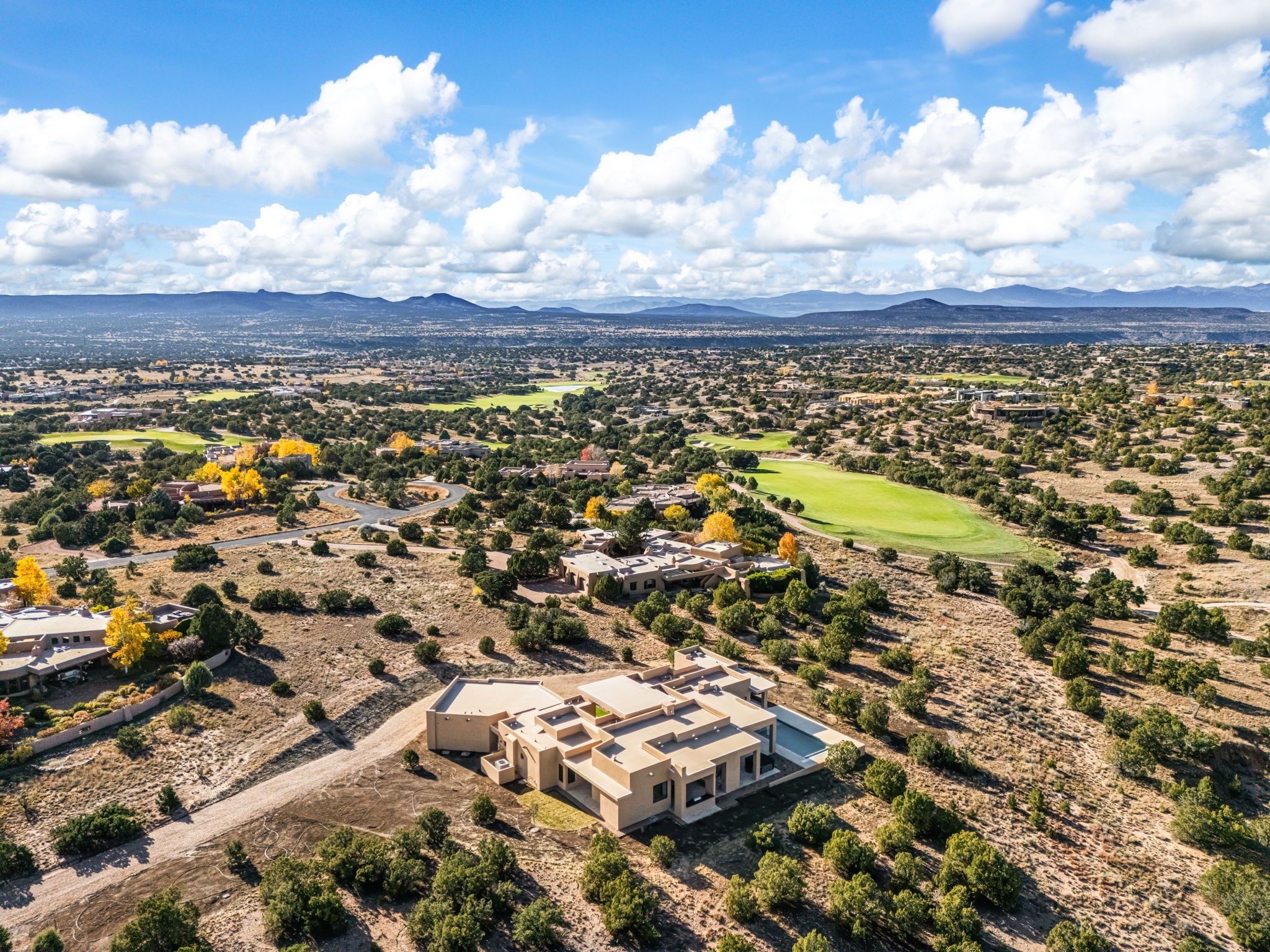 Nestled in the prestigious Las Campanas community of Santa Fe, this newly built custom single story estate blends modern elegance with timeless Southwestern charm. Perched to overlook the lush fairways of the world-class golf course and endless views of the Sangre De Cristo Mountains , the home offers an unmatched lifestyle of sophistication and serenity. As one of the few residences approved for a private pool, it also features a soothing hot tub for year-round enjoyment. Expansive outdoor living spaces are paired with built-in speakers both inside and out, creating the perfect setting for entertaining or relaxing. Inside, enjoy breathtaking views through oversized Pella windows spanning more than 10 feet wide. The chef's kitchen is outfitted with high-end appliances, a spacious island, and refined finishes. The master suite and main living areas are enhanced with radiant in-floor heating for comfort in every season, while each bathroom has been individually designed with custom touches, including built-in mood lighting in the showers. Practicality meets luxury with a fully outfitted laundry room, mudroom entry from the garage, and an oversized epoxy-coated garage ideal for vehicles and recreational toys. Additional details such as Venetian plaster walls and thoughtful design elements throughout make this home truly one of a kind. Built by Candelaria Homes, you 'll know you made the right choice. Golf course views are of the 12th and 13th holes. Don't miss this rare opportunity in Santa Fe's most sought-after enclave offers a retreat of elegance, comfort, and distinction.