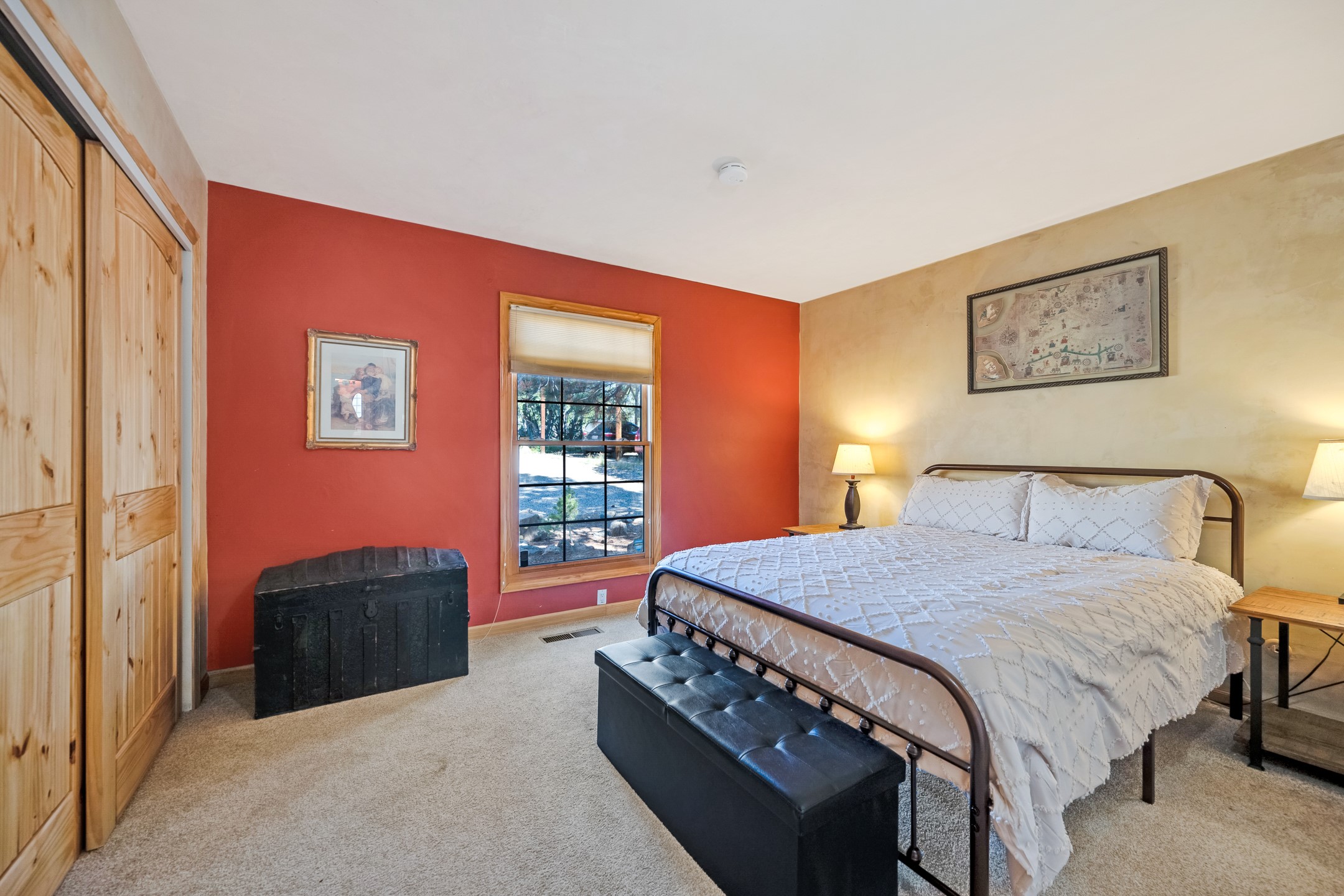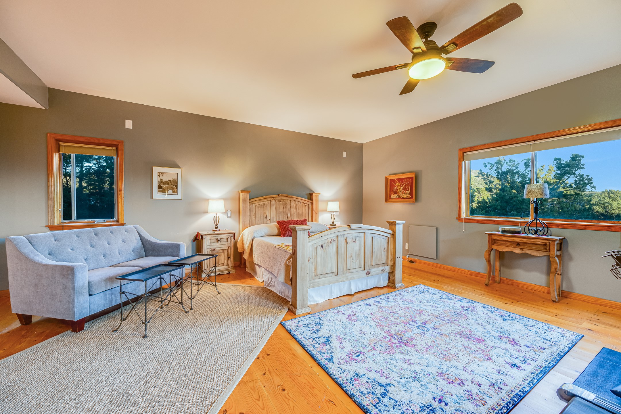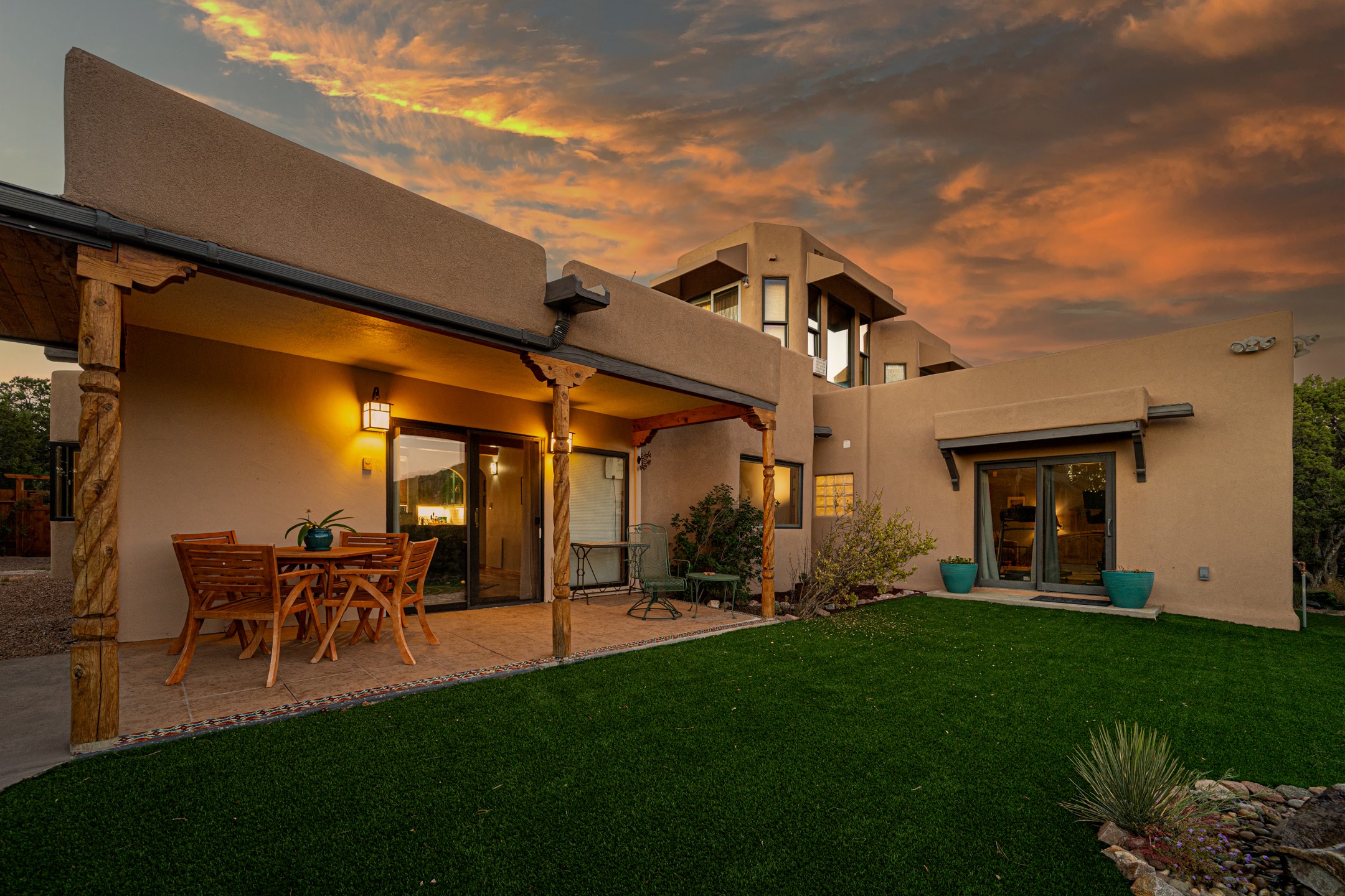 In a serene, tree-filled setting with sweeping views of the Sangre de Cristo foothills, this single-level 2600 sqft main residence offers comfort and privacy. Featuring three bedrooms and two bathrooms, a cheerful office with built-ins, separate living and dining rooms, and a completely renovated custom kitchen, the generous floor plan has space for everyone. Enjoy a cozy fire while watching the sun dip beyond the horizon or take in your morning coffee on the back portal while the fountain gurgles - this home will entice you to slow your pace and enjoy living amongst the pion trees. The primary bedroom is a true sanctuary, with a generous walk-in closet, a well-appointed ensuite bath, and direct backyard access to provide a seamless indoor-outdoor flow. A bonus room and a dedicated laundry room off the kitchen add to the functionality while the STUDIO CASITA (additional 478 sqft) with a private entrance is perfect for creative work, quiet retreats, and passive income. Other features include a tiled foyer, wood floors, beamed ceilings, stone countertops, and enhanced lighting throughout. Set on a private, 2+ acre lot with mature landscaping, the property is further augmented by a separate carport, RV space, an electric vehicle charger, and SOLAR PANELS for energy efficiency. Insurance was currently renewed, providing peace of mind. This property blends Southwest charm with modern updates and a flexible layout--a rare find with built-in investment opportunity.