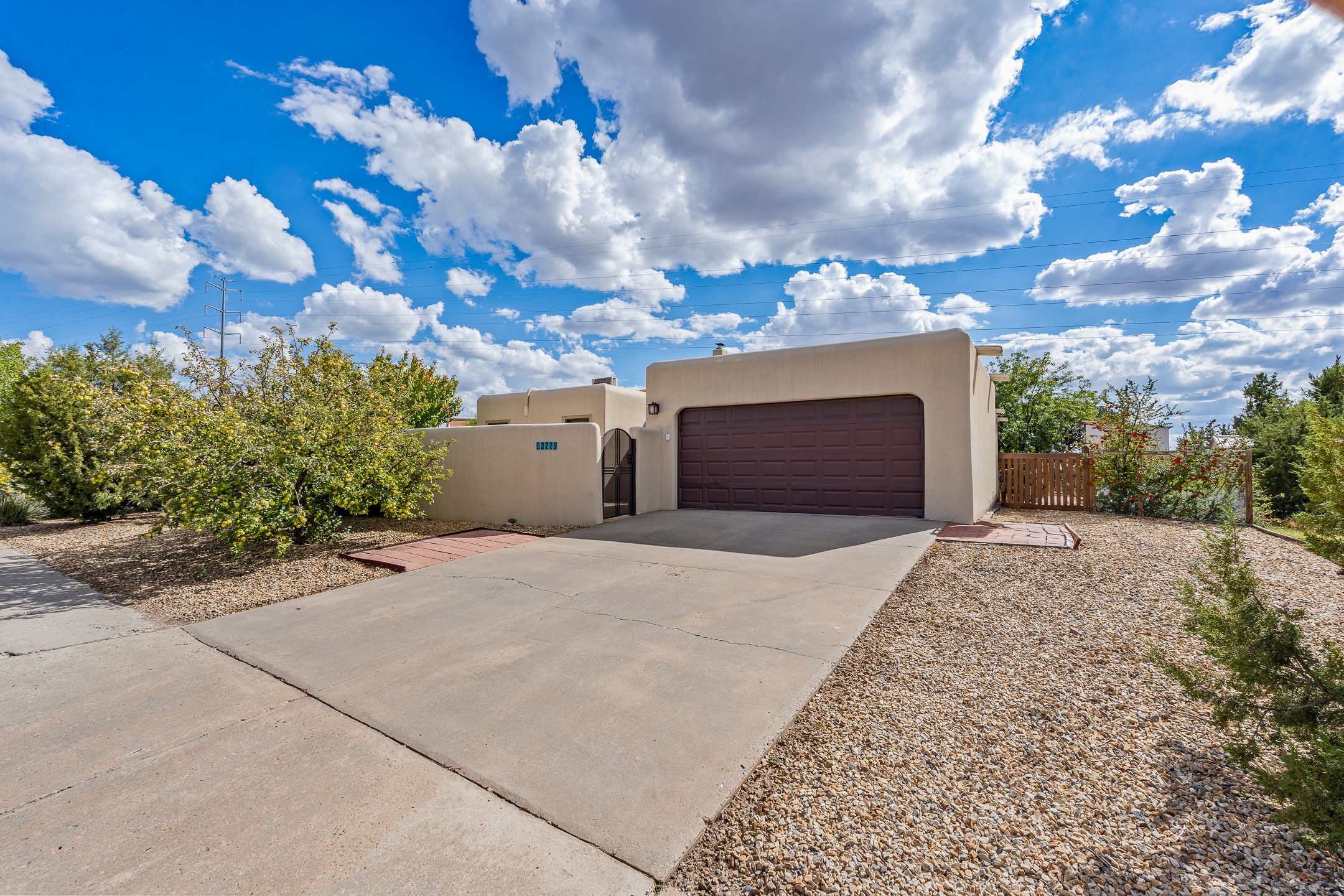 Welcome to this light-filled and beautifully maintained single-level home, ideally situated for easy access to all that Santa Fe has to offer. Located on an elevated .45-acre lot, this 1,900 sq. ft. property offers both comfort and accessibility. Inside, you'll find three spacious bedrooms, three bathrooms, and a flexible attached office/studio that can serve as a 4th bedroom or creative space. Architectural highlights include high beamed ceilings, T&G ceiling, with clerestory windows, skylights, and a classic kiva-style fireplace -- all creating a warm, Southwestern ambiance. Enjoy year-round comfort with hot water baseboard heating and mini-split systems for heating and cooling. Step inside to a private entry courtyard with flagstone and a fully enclosed backyard featuring a brick patio, perfect for outdoor entertaining. Relax under the pergola swing with your morning coffee or evening glass of wine while taking in breathtaking views of the Sandia and Ortiz Mountains. The yard is beautifully landscaped with multiple fruit trees, drip irrigation, and includes a large storage shed. Don't miss this rare opportunity to own a peaceful and versatile home with majestic sunrises and sunsets, just a short drive to downtown Santa Fe.