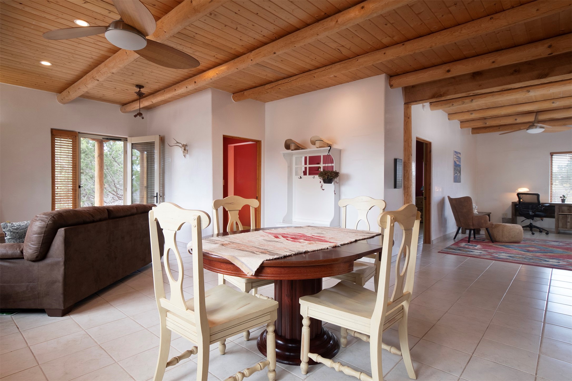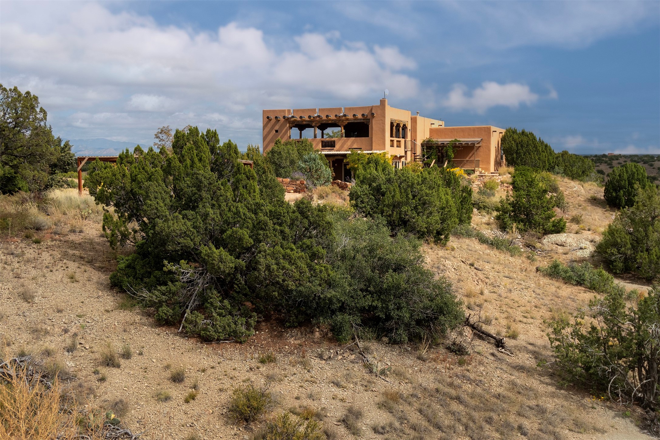 Set on 15 private acres with commanding forever views, this exceptional property combines the best of rural living with a strong sense of community & a lifestyle that embraces the outdoors.The main home offers nearly 3,500 square feet of living space, complemented by an attached 1,100 square foot ADU/guest house. Perfect for independent living, extended family, private guest quarters, a home office, or potential rental income, the guest house provides both flexibility & privacy.Inside the main residence, classic Santa Fe charm shines throughout. A spacious chef's kitchen is the heart of the home, while high ceilings with cedar latillas, hard trowel plaster walls, and multiple kiva fireplaces add warmth and character. A pellet stove ensures cozy comfort.Outdoor living takes center stage in every direction. Whether gathering around the kiva fireplace, relaxing on the patios, or entertaining on the elevated margarita deck with 360-degree sunset views, this property was designed to connect with nature & wide-open skies.Adding to its appeal, the home is equipped with green energy features including a Tesla Powerwall and a solar array, ensuring minimal electric costs while supporting sustainable living.This rare offering blends timeless Southwestern design with modern energy efficiency and endless opportunities for living, working, and entertaining--truly Rancho Alegre country living at its best.