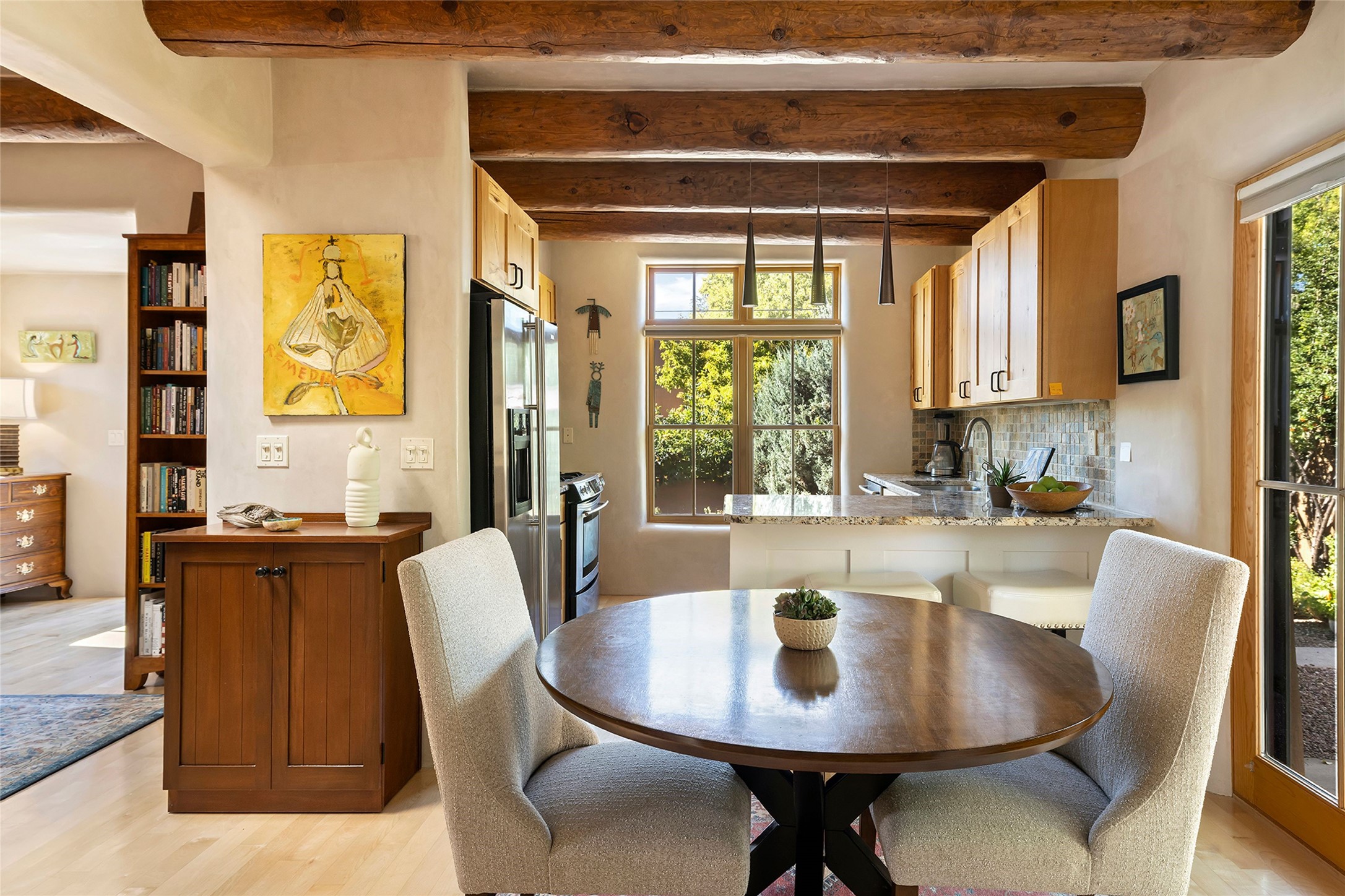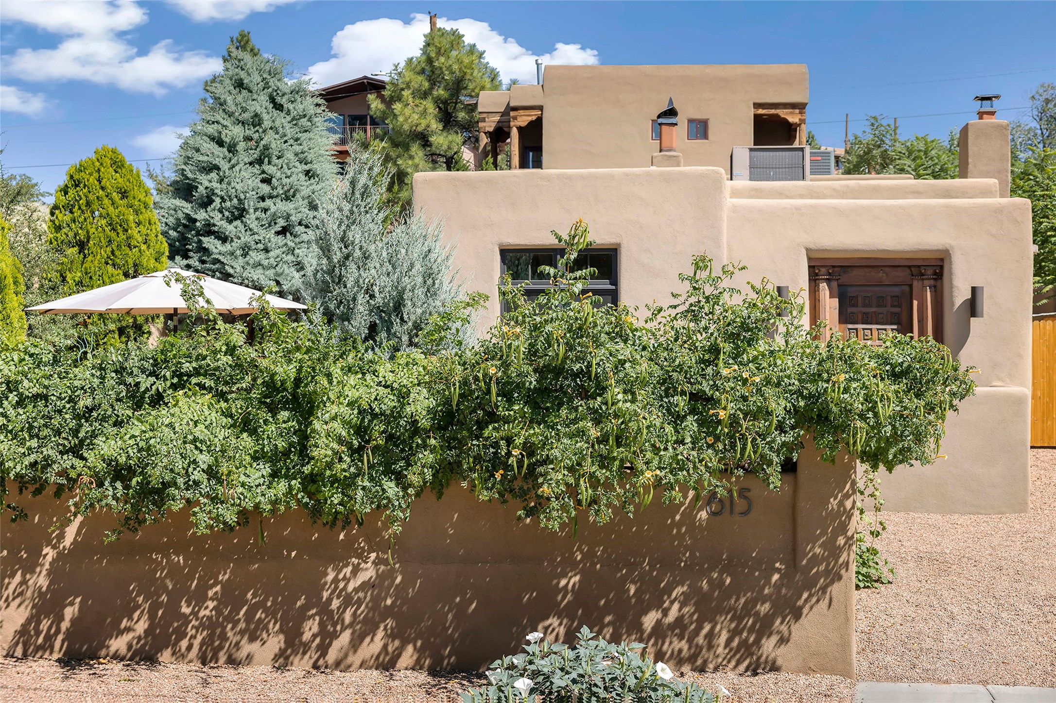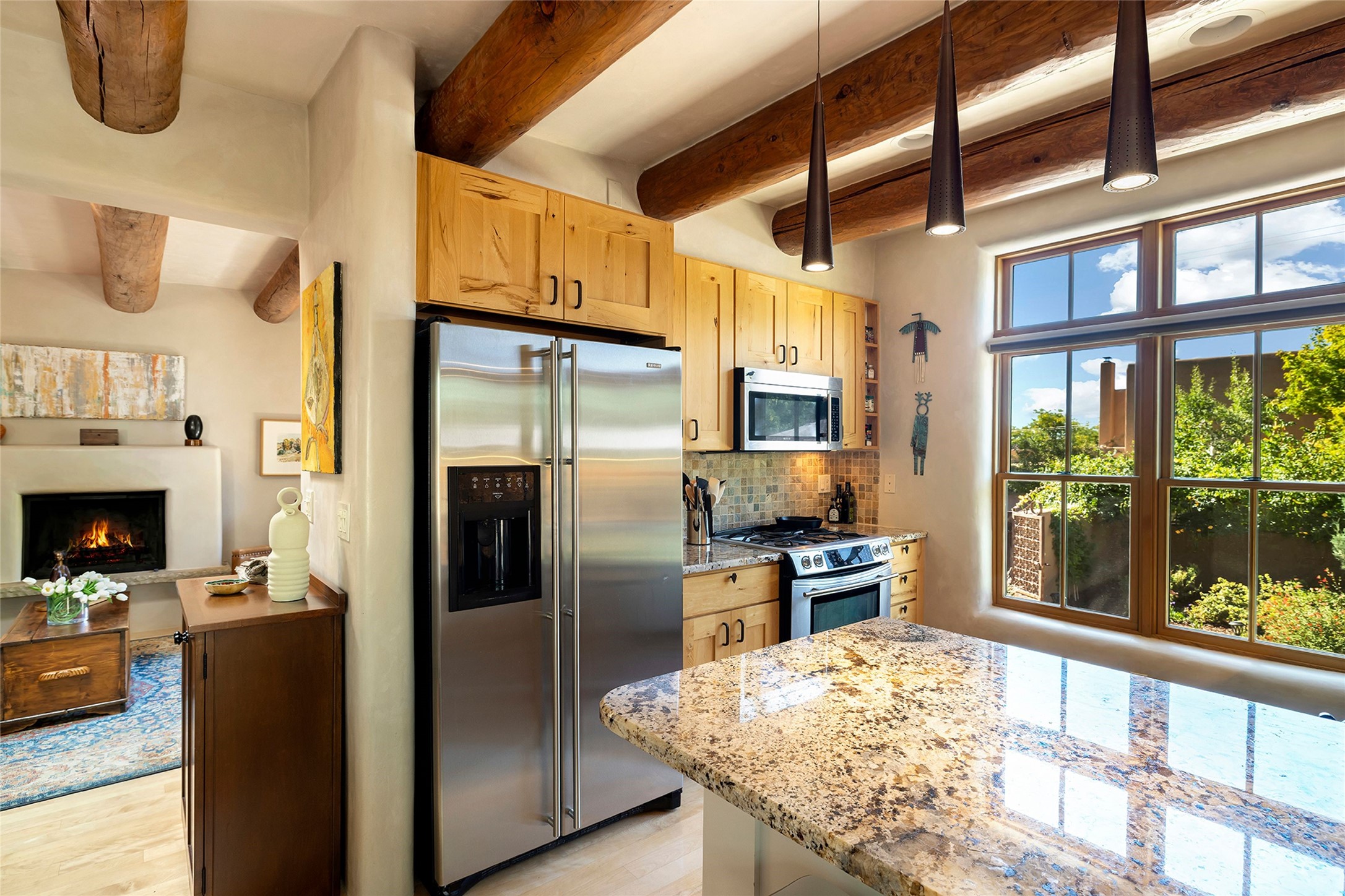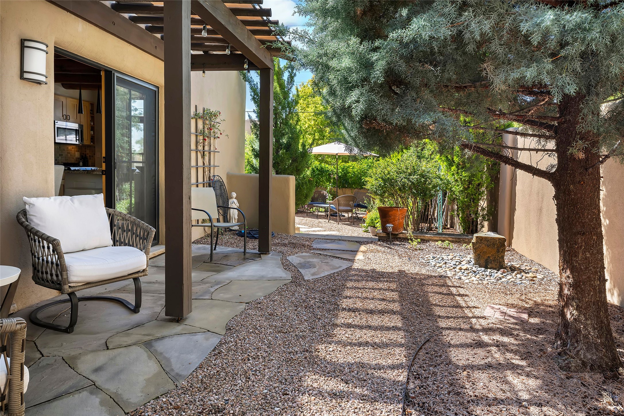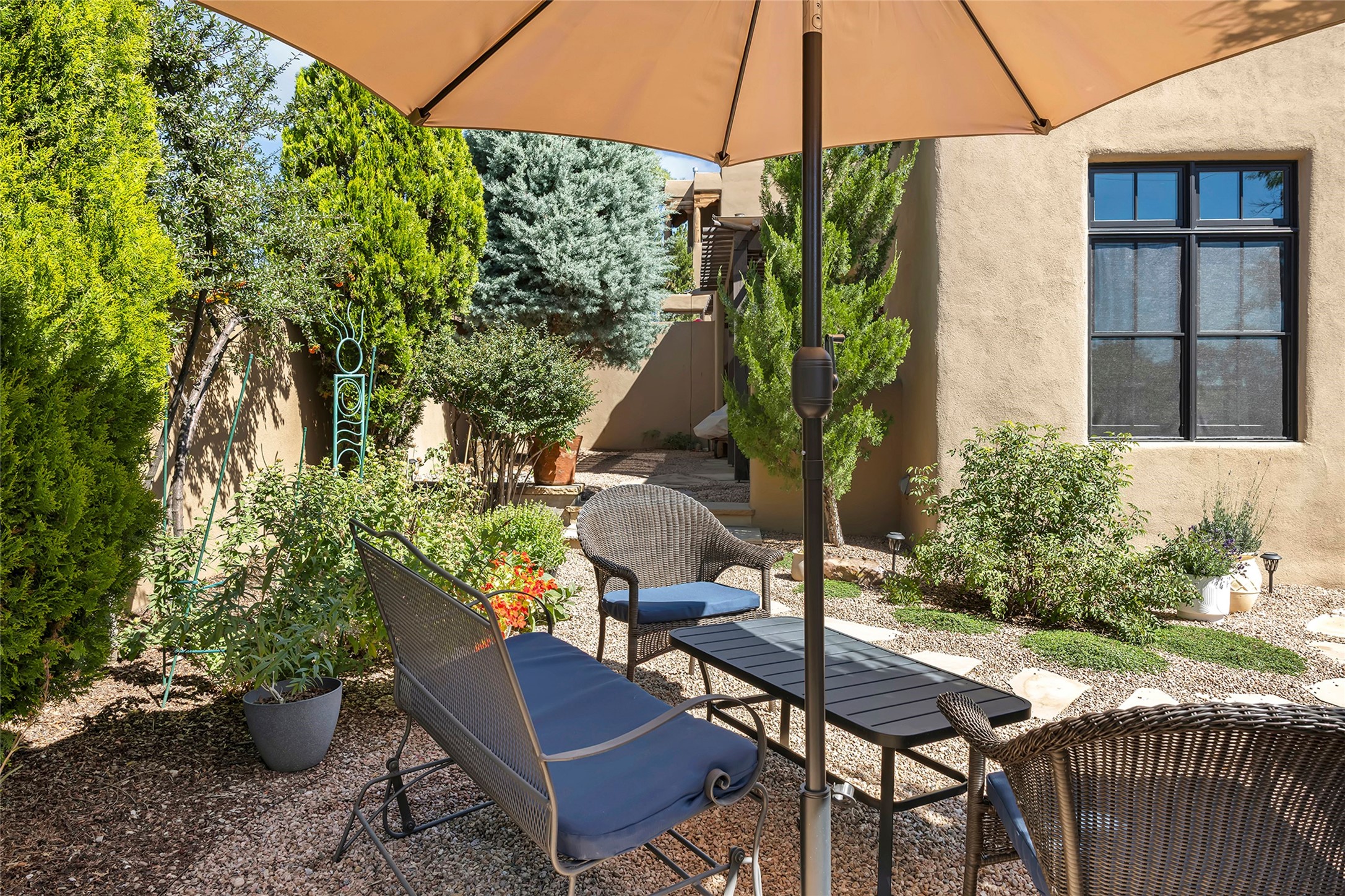 Just steps from the historic Santa Fe Plaza, this exquisite and beautifully updated Juniper Terrace condominium captures the essence of timeless Santa Fe architecture enhanced by sophisticated modern updates. Set within one of the city's most desirable locations, this rare single-level, two-bedroom, two-bath residence offers a seamless blend of style, comfort, and authenticity. The home's inviting living room, anchored by rich vigas and a grand central fireplace, creates a warm and elegant gathering space. The modern chef's kitchen, designed for both beauty and functionality, features granite countertops, high-end appliances, and a breakfast bar that opens gracefully to the dining area and expansive outdoor entertaining spaces. The private owner's suite is a serene retreat, featuring a spa-inspired bath with a jetted tub/shower, and direct access to a secluded patio. The guest suite, complete with its own ensuite bath and private patio access, provides versatility for hosting guests or creating a personal workspace. Multiple enclosed courtyards and lushly landscaped patios invite year-round outdoor living, enhanced by vibrant plantings and a tranquil water feature. Additional highlights include hardwood flooring, creamy plaster walls, rich vigas throughout, and convenient off-street parking. Offering both intimacy and sophistication, this remarkable property exemplifies the ultimate Santa Fe experience--just a short stroll from world-class dining, galleries, and the cultural heart of the city, this incredible home is not to be missed!