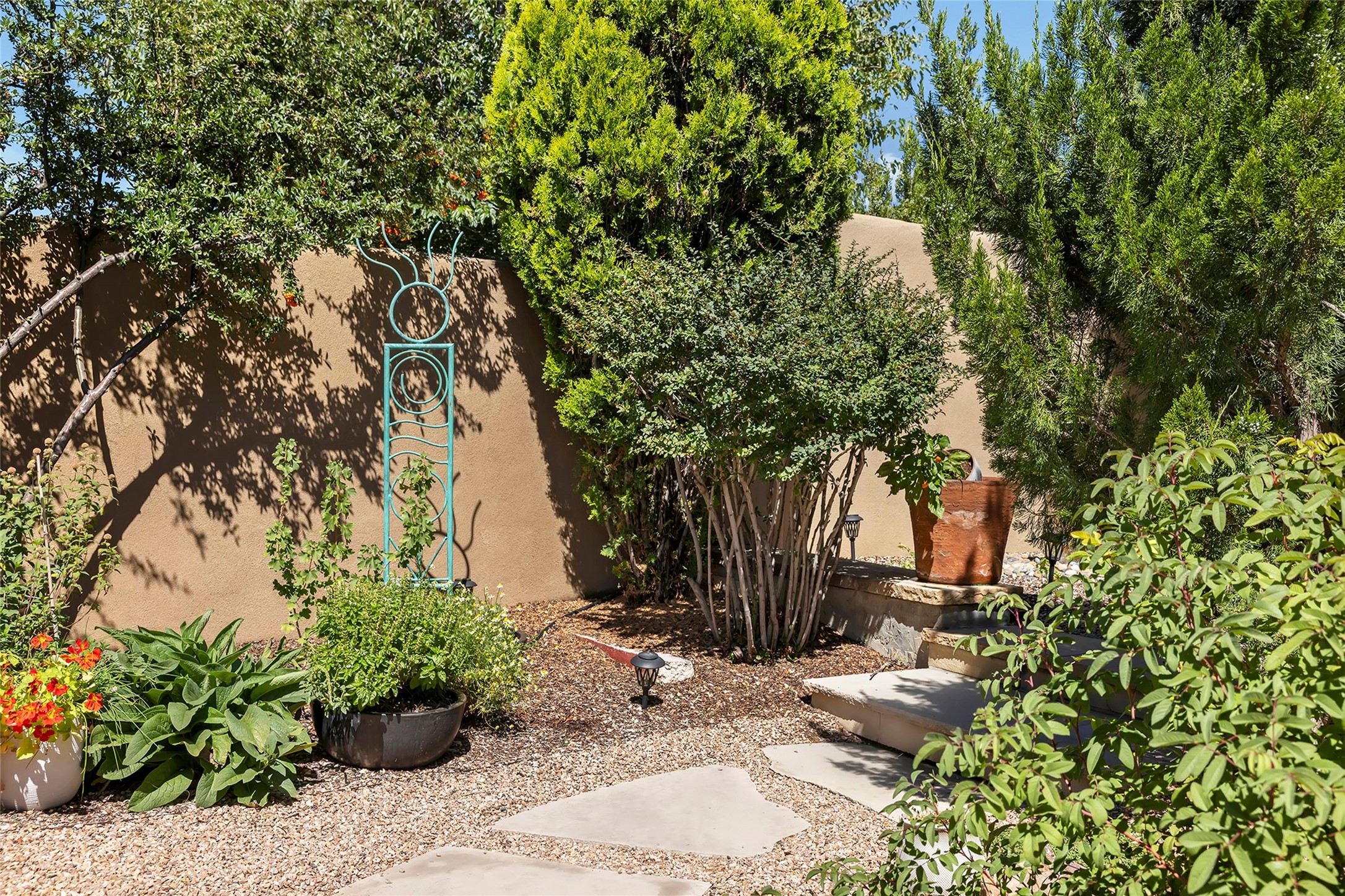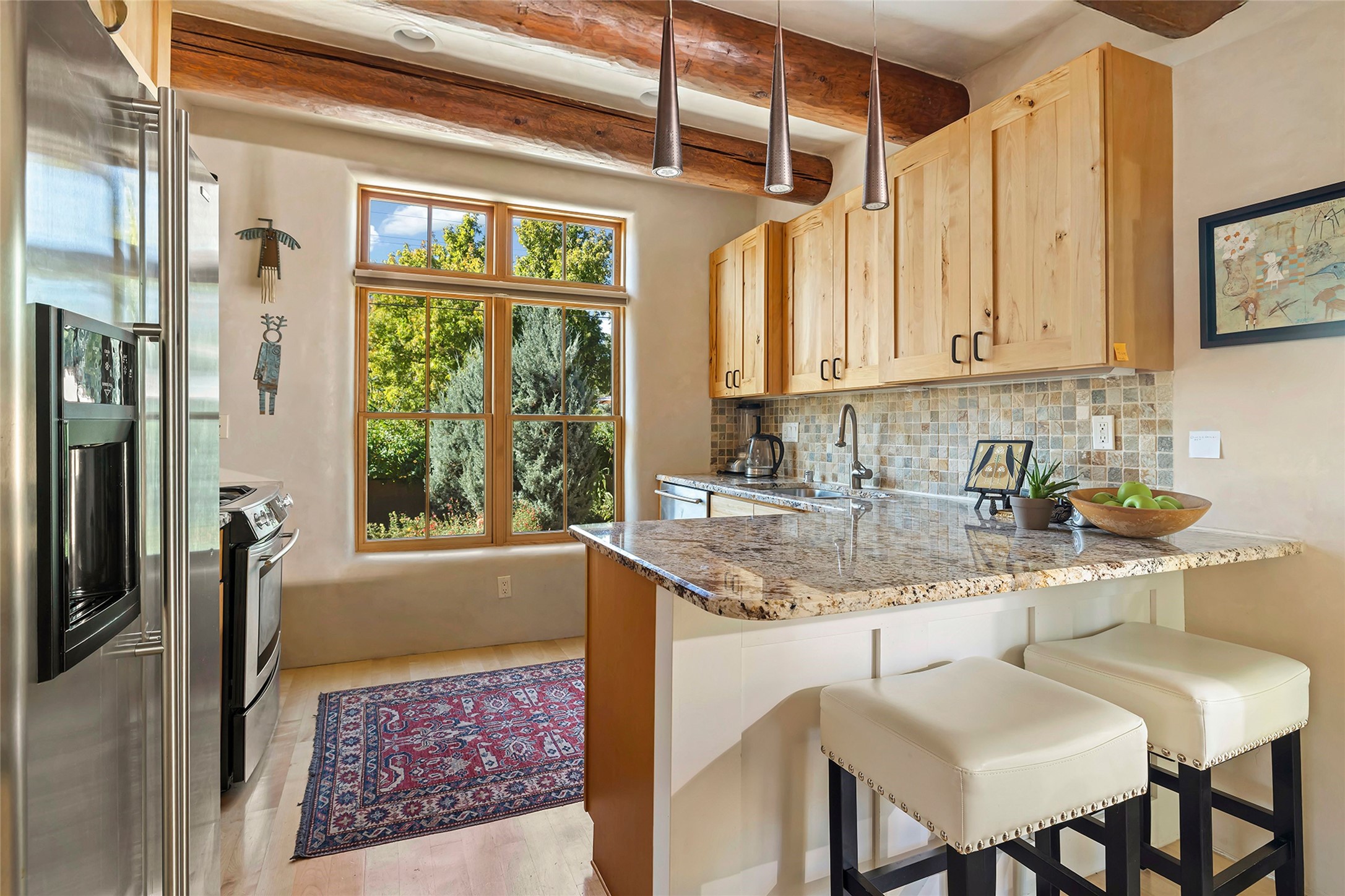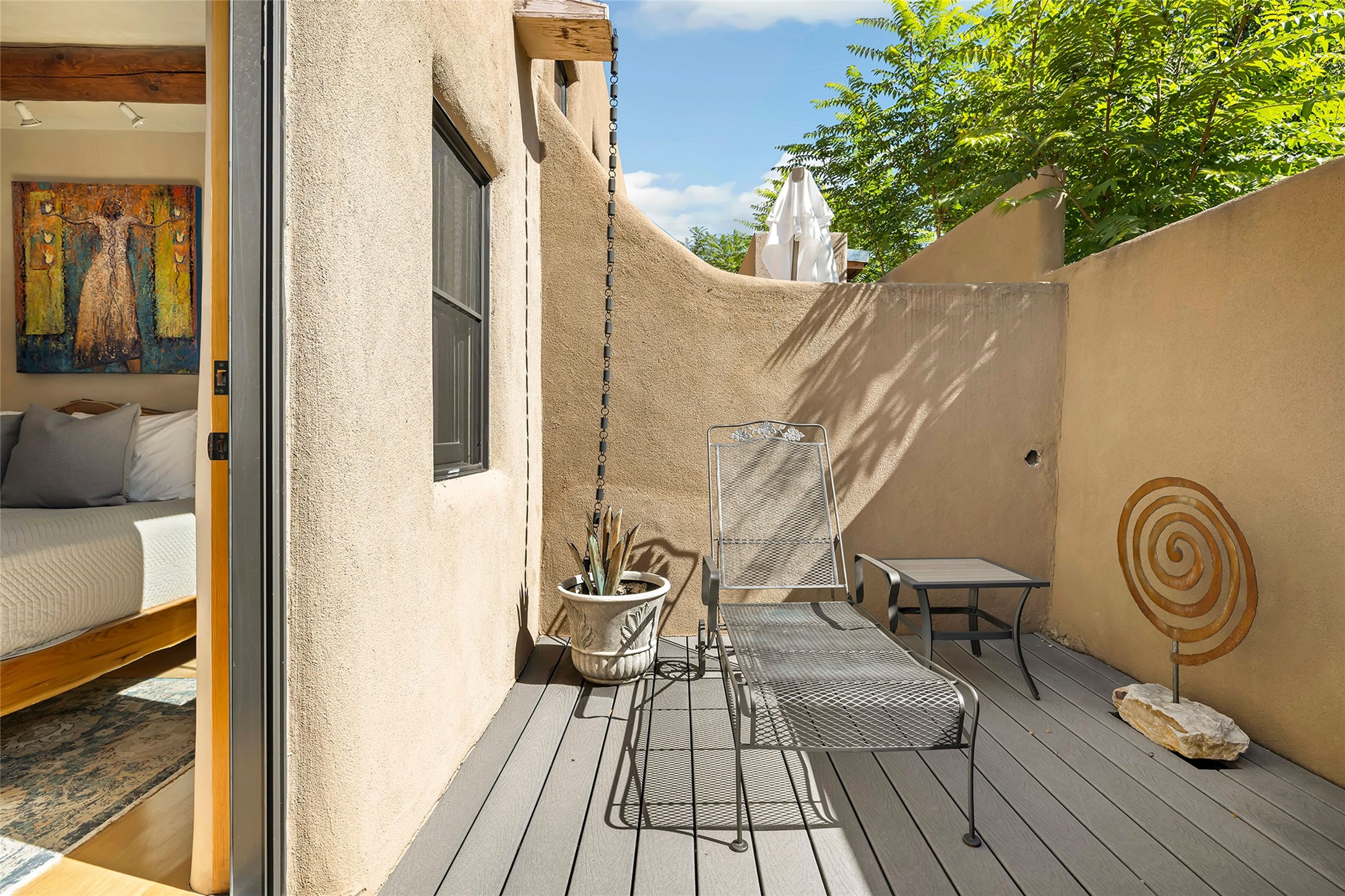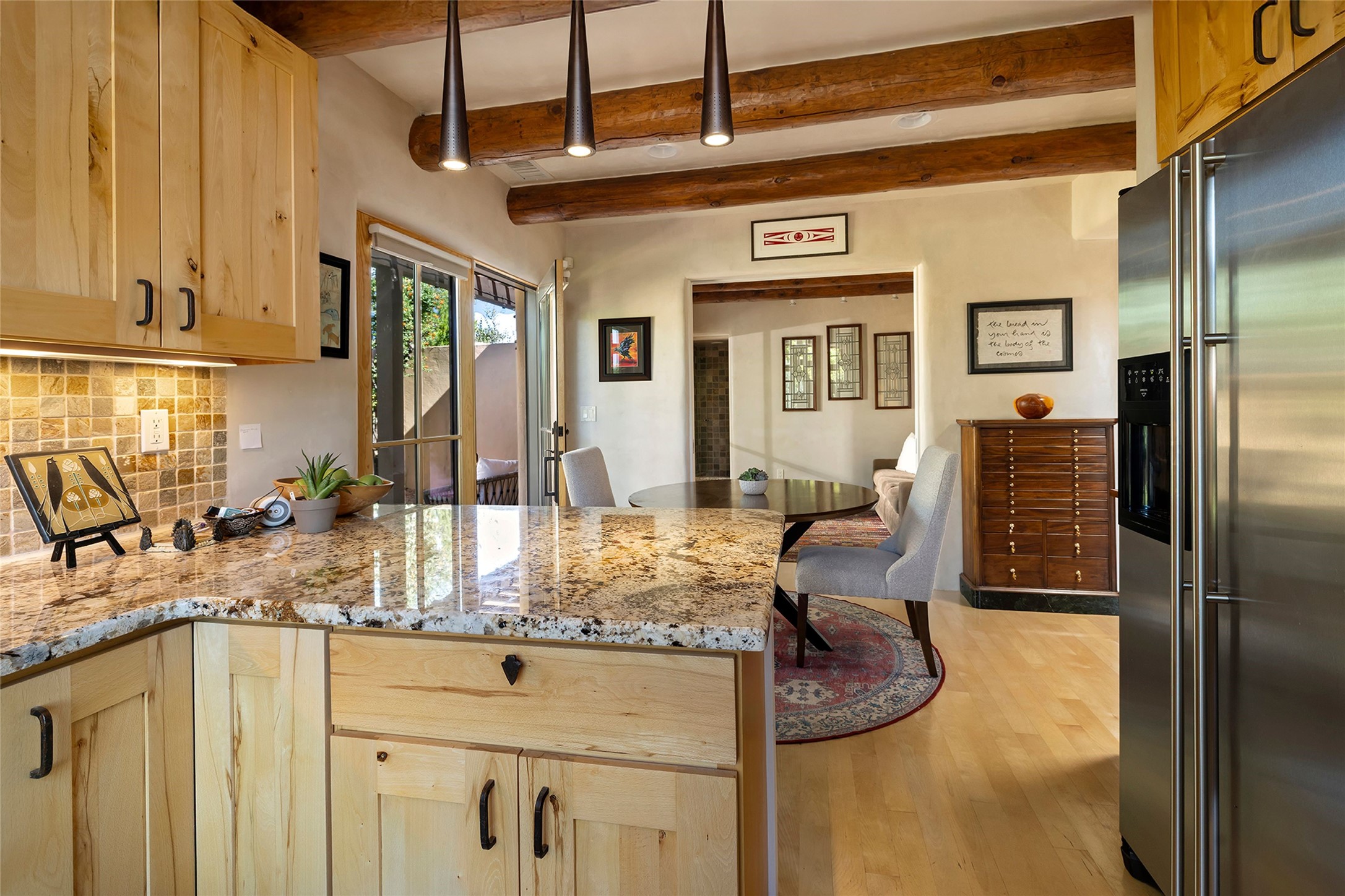 Just steps from the historic Santa Fe Plaza, this exquisite and beautifully updated Juniper Terrace condominium captures the essence of timeless Santa Fe architecture enhanced by sophisticated modern updates. Set within one of the city's most desirable locations, this rare single-level, two-bedroom, two-bath residence offers a seamless blend of style, comfort, and authenticity. The home's inviting living room, anchored by rich vigas and a grand central fireplace, creates a warm and elegant gathering space. The modern chef's kitchen, designed for both beauty and functionality, features granite countertops, high-end appliances, and a breakfast bar that opens gracefully to the dining area and expansive outdoor entertaining spaces. The private owner's suite is a serene retreat, featuring a spa-inspired bath with a jetted tub/shower, and direct access to a secluded patio. The guest suite, complete with its own ensuite bath and private patio access, provides versatility for hosting guests or creating a personal workspace. Multiple enclosed courtyards and lushly landscaped patios invite year-round outdoor living, enhanced by vibrant plantings and a tranquil water feature. Additional highlights include hardwood flooring, creamy plaster walls, rich vigas throughout, and convenient off-street parking. Offering both intimacy and sophistication, this remarkable property exemplifies the ultimate Santa Fe experience--just a short stroll from world-class dining, galleries, and the cultural heart of the city, this incredible home is not to be missed!