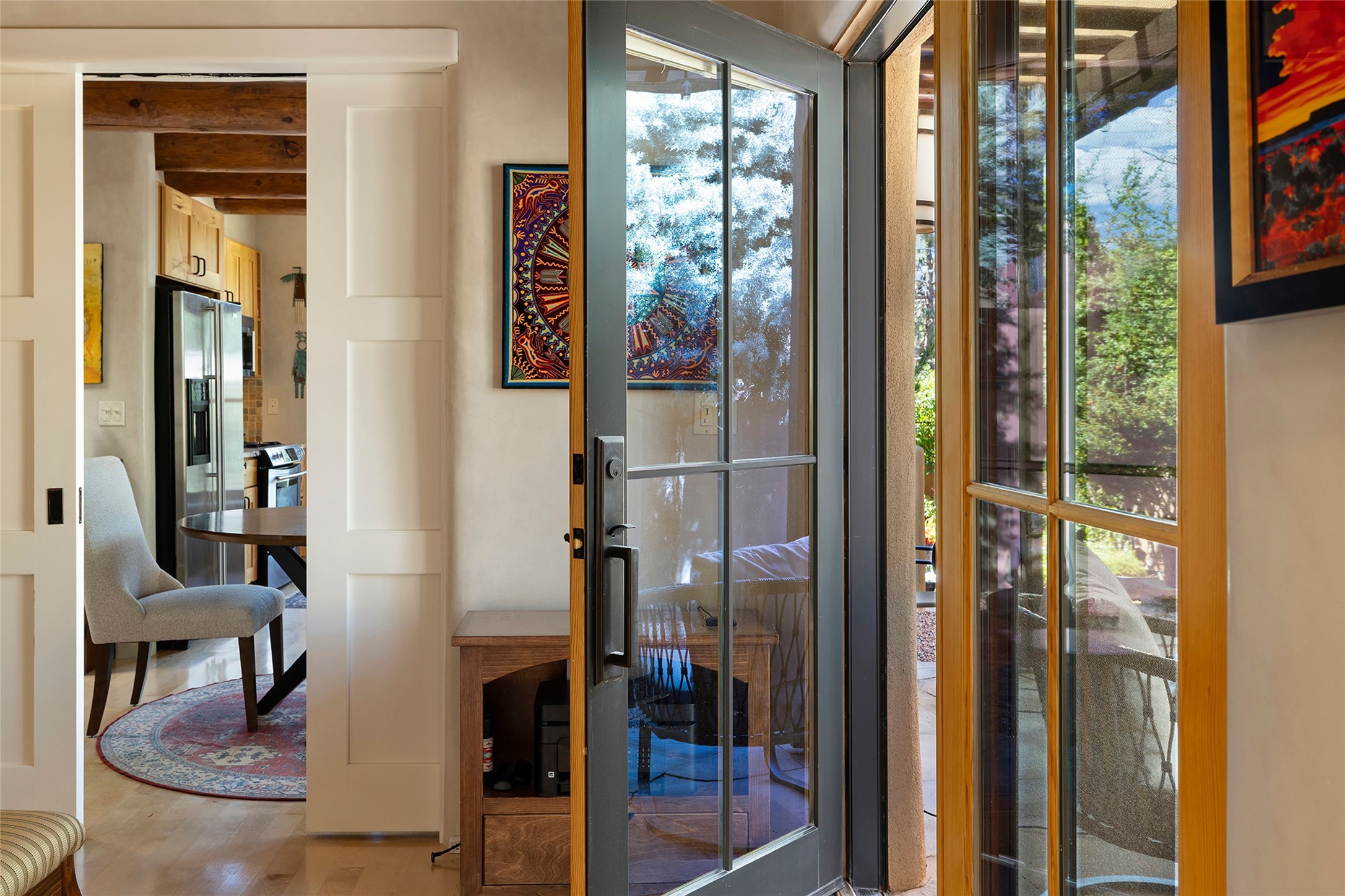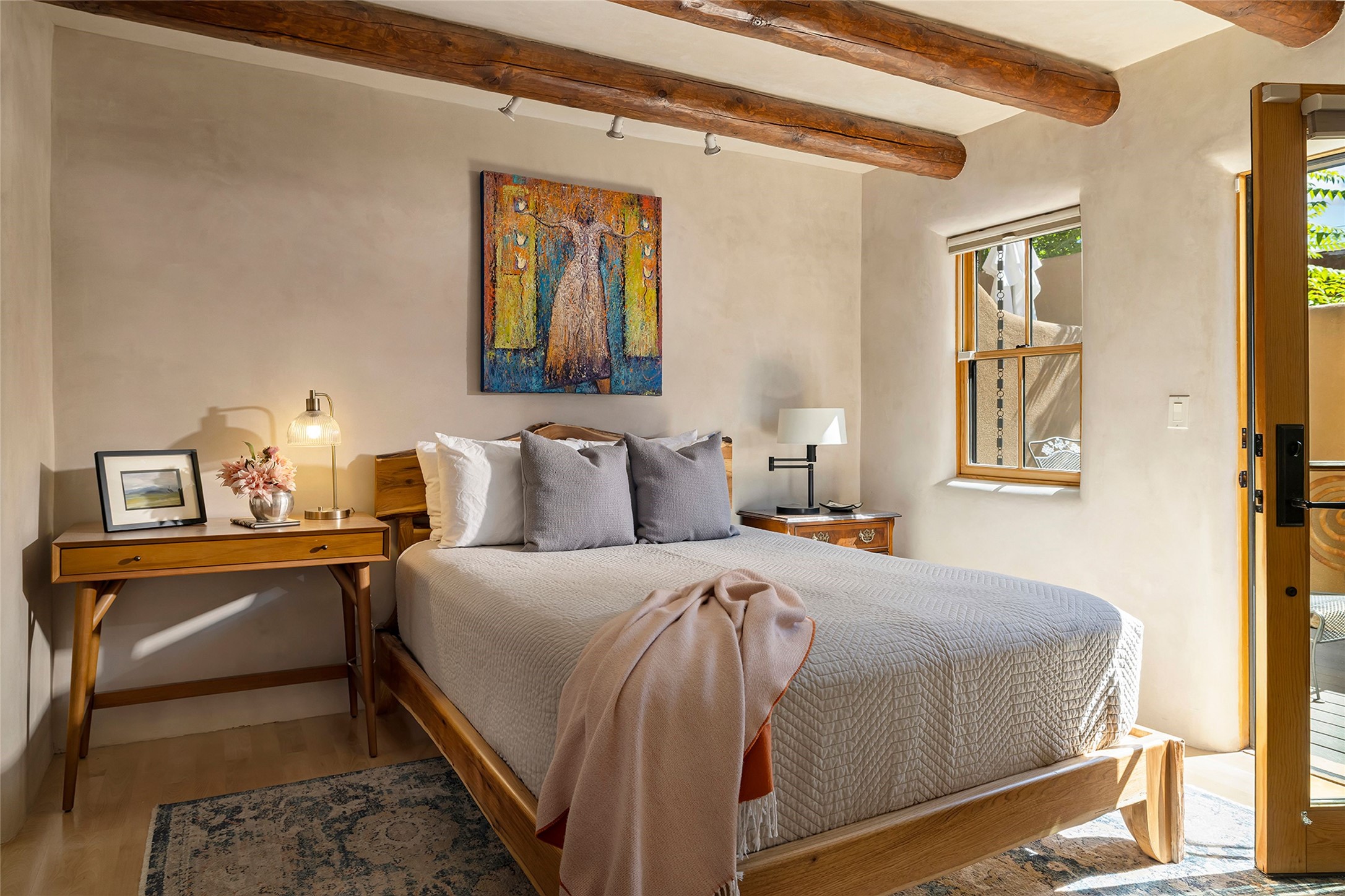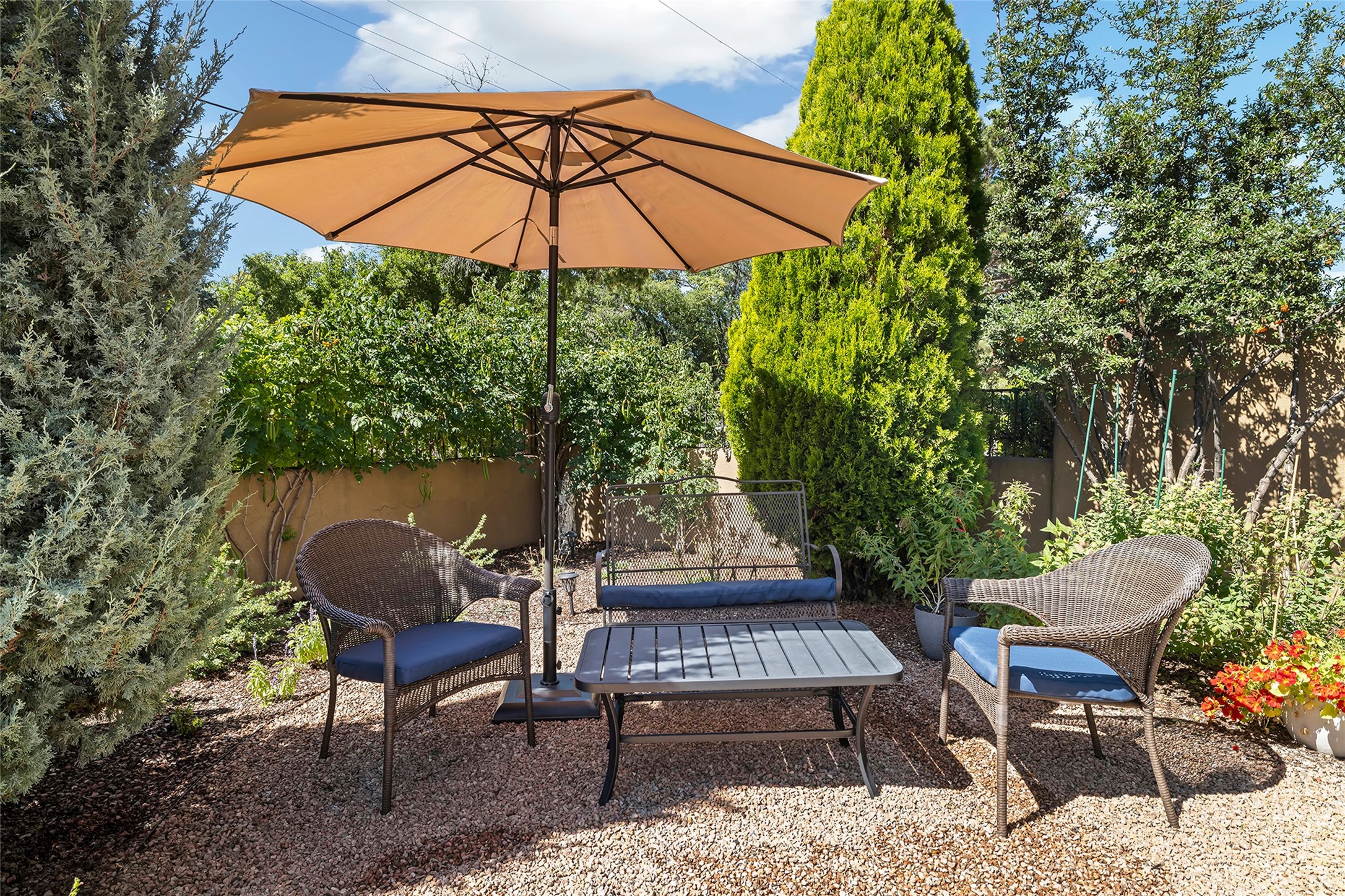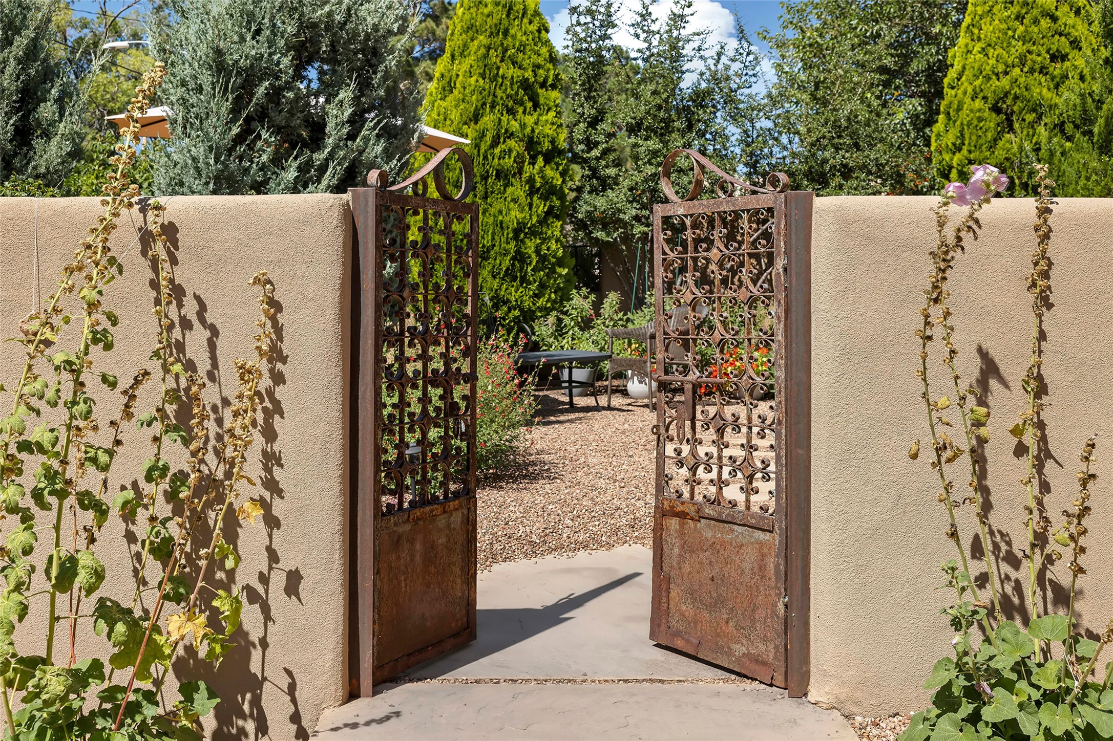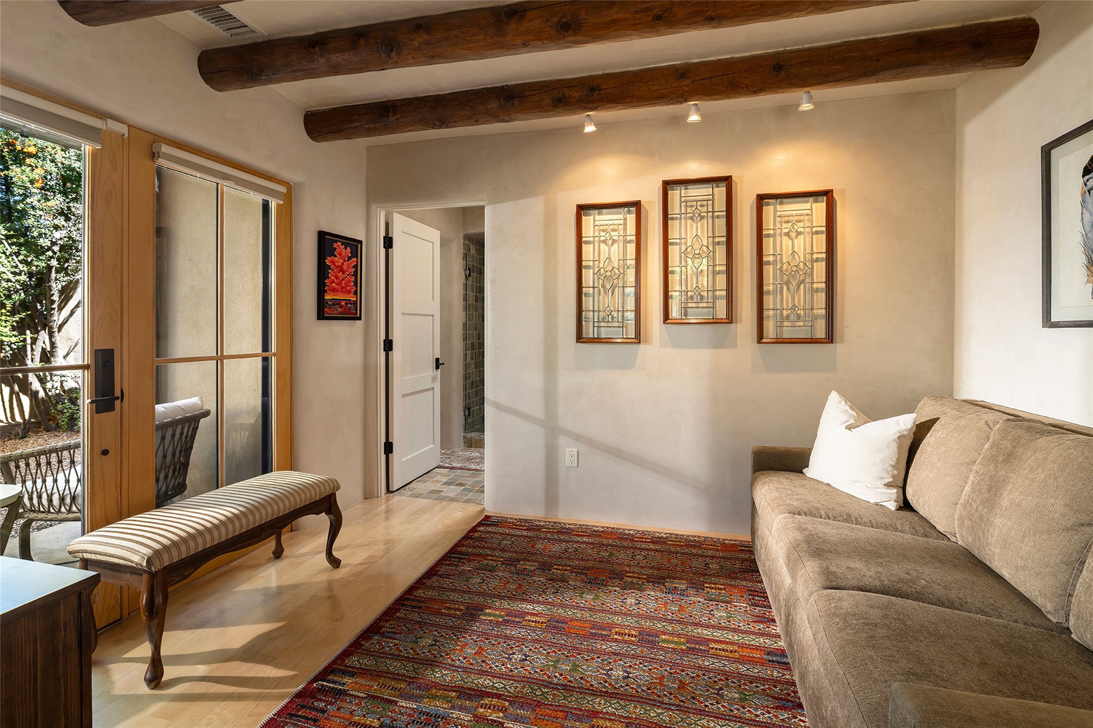 Just steps from the historic Santa Fe Plaza, this exquisite and beautifully updated Juniper Terrace condominium captures the essence of timeless Santa Fe architecture enhanced by sophisticated modern updates. Set within one of the city's most desirable locations, this rare single-level, two-bedroom, two-bath residence offers a seamless blend of style, comfort, and authenticity. The home's inviting living room, anchored by rich vigas and a grand central fireplace, creates a warm and elegant gathering space. The modern chef's kitchen, designed for both beauty and functionality, features granite countertops, high-end appliances, and a breakfast bar that opens gracefully to the dining area and expansive outdoor entertaining spaces. The private owner's suite is a serene retreat, featuring a spa-inspired bath with a jetted tub/shower, and direct access to a secluded patio. The guest suite, complete with its own ensuite bath and private patio access, provides versatility for hosting guests or creating a personal workspace. Multiple enclosed courtyards and lushly landscaped patios invite year-round outdoor living, enhanced by vibrant plantings and a tranquil water feature. Additional highlights include hardwood flooring, creamy plaster walls, rich vigas throughout, and convenient off-street parking. Offering both intimacy and sophistication, this remarkable property exemplifies the ultimate Santa Fe experience--just a short stroll from world-class dining, galleries, and the cultural heart of the city, this incredible home is not to be missed!