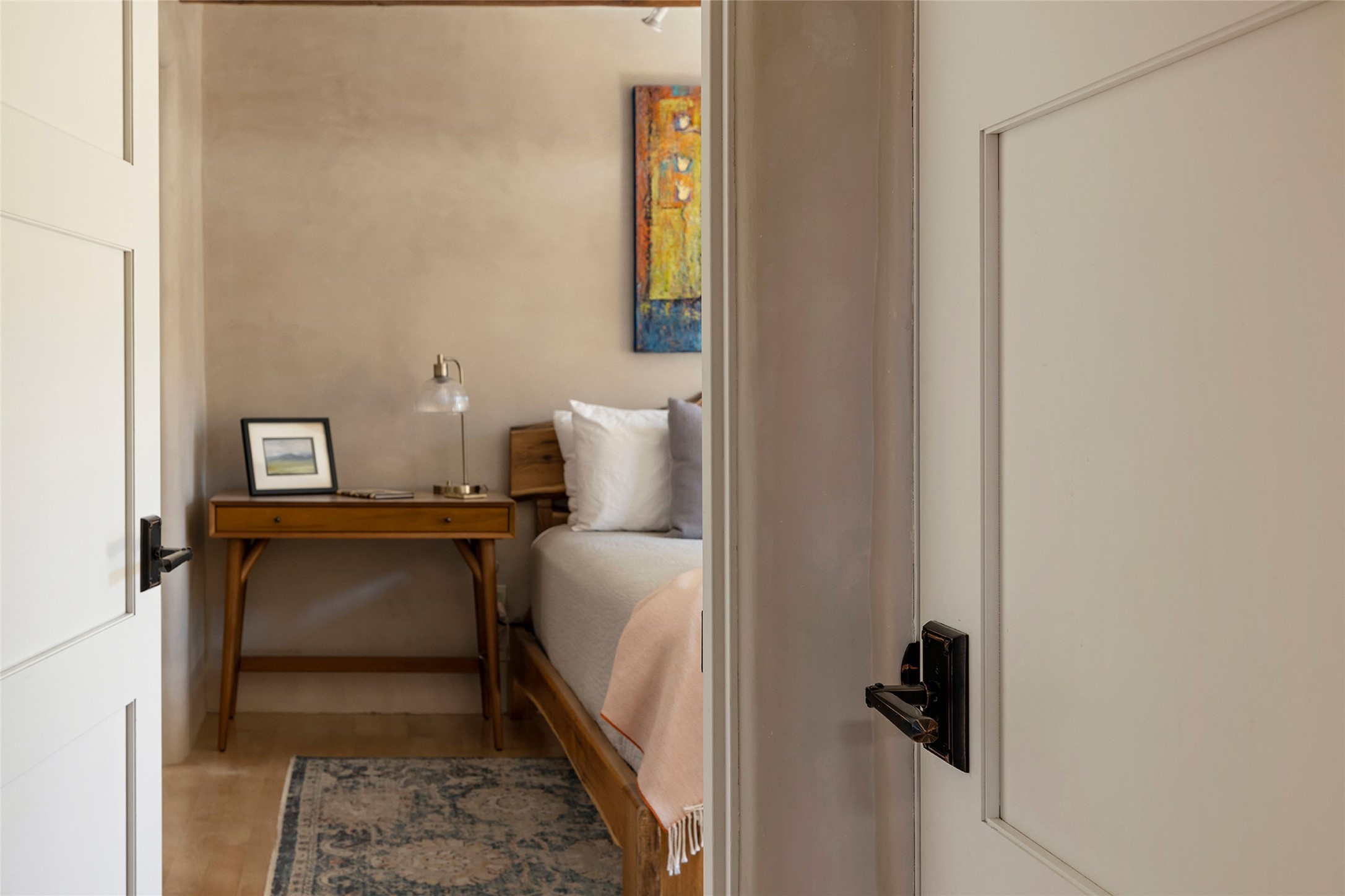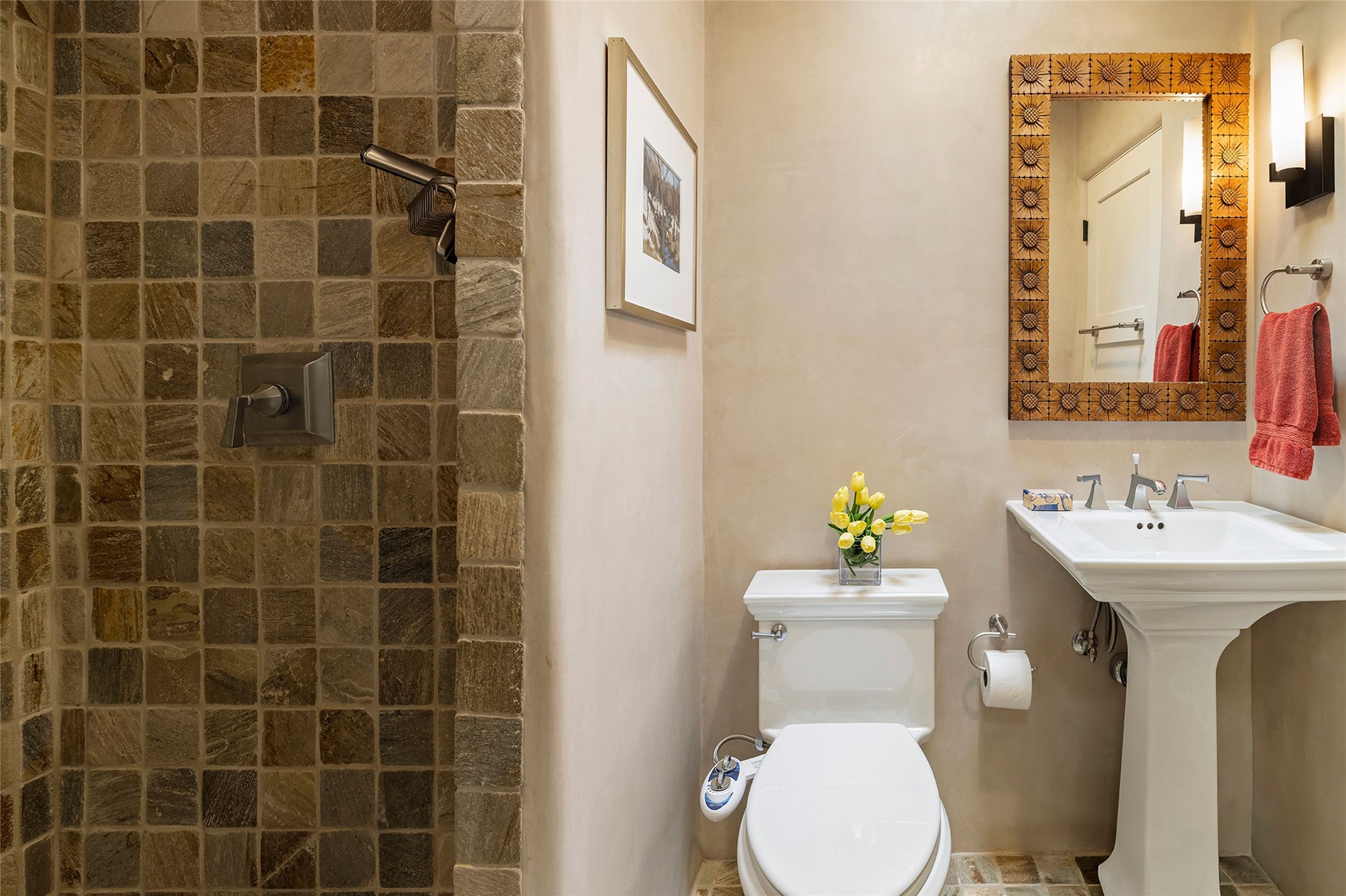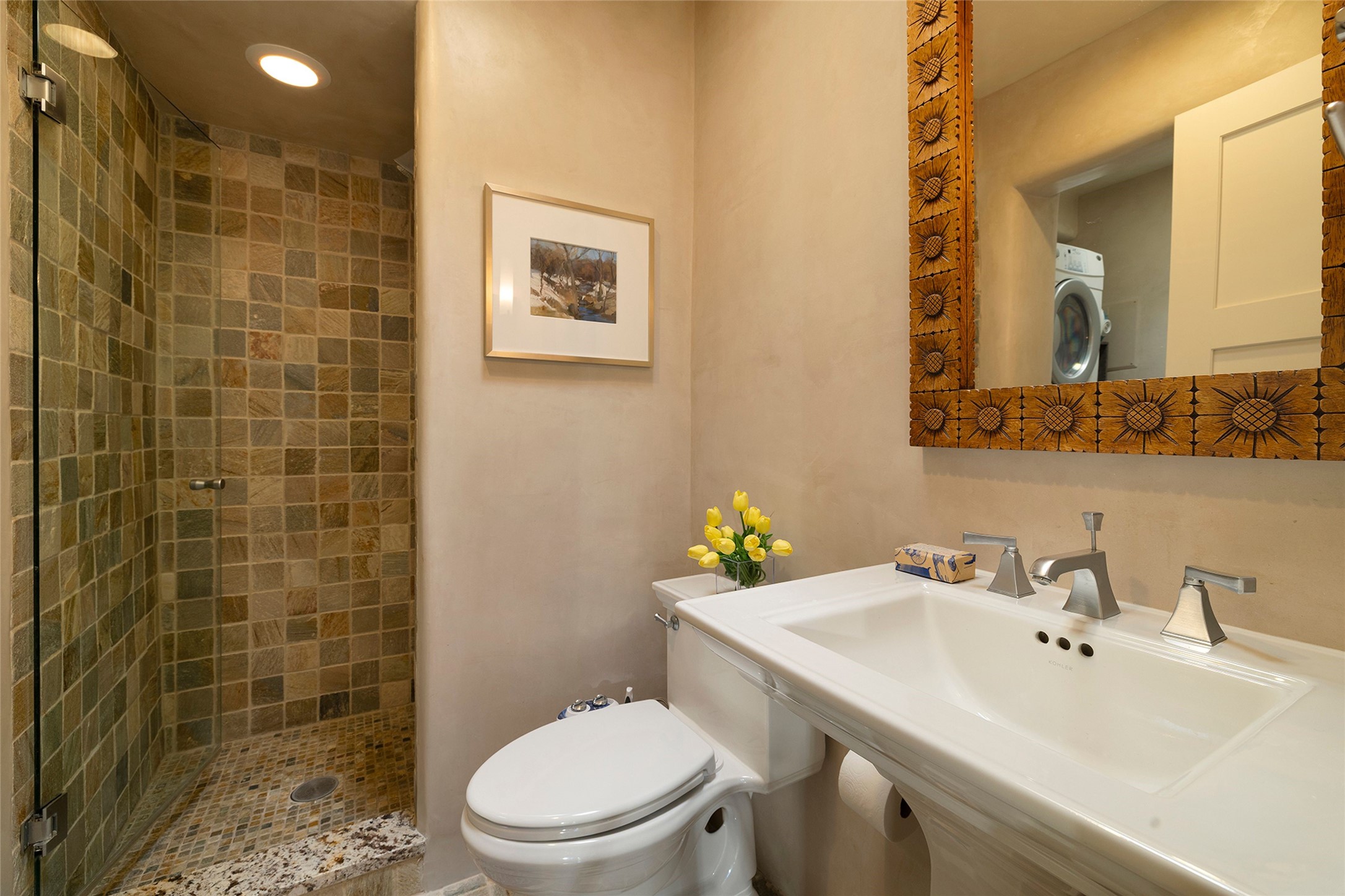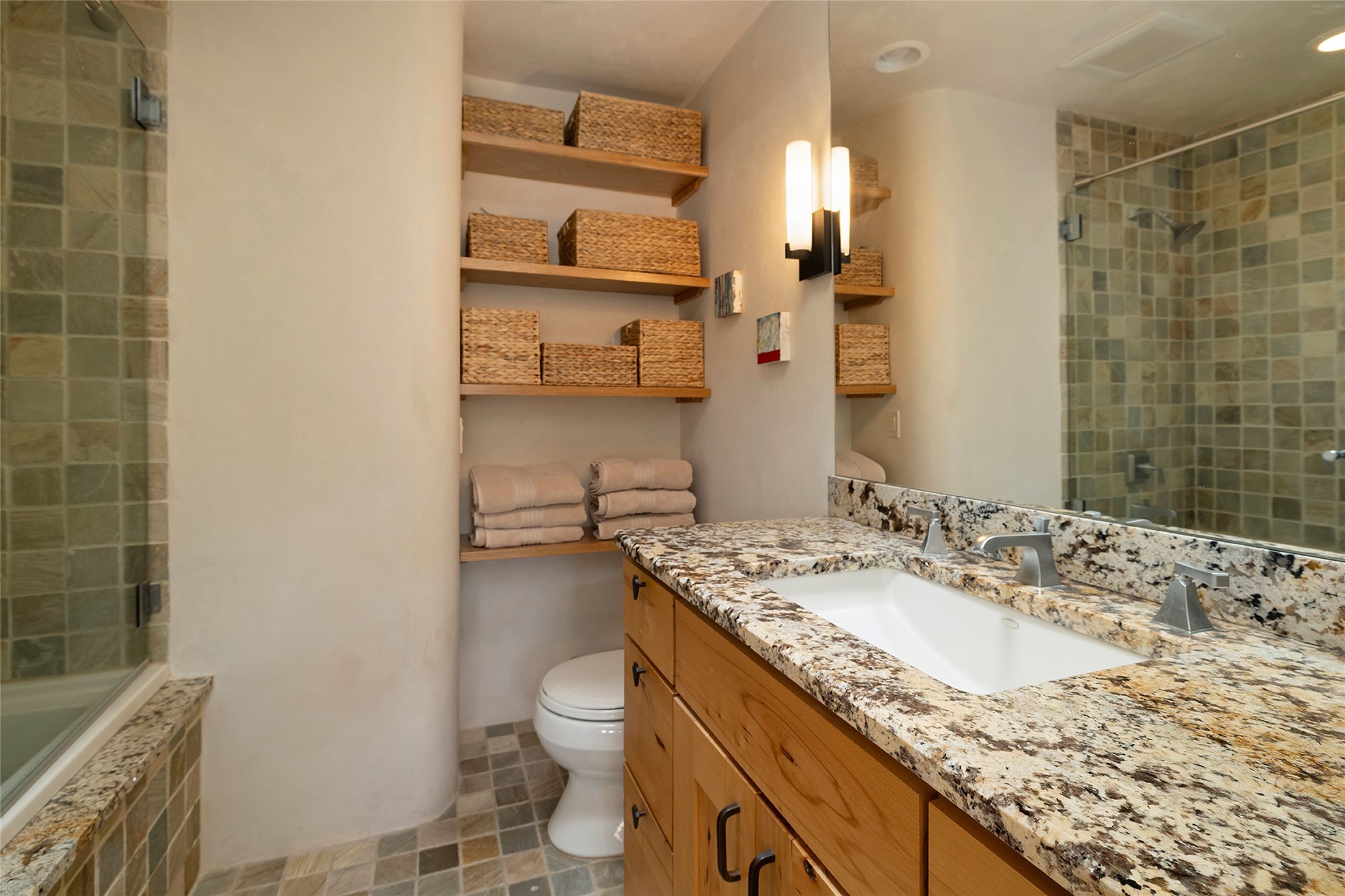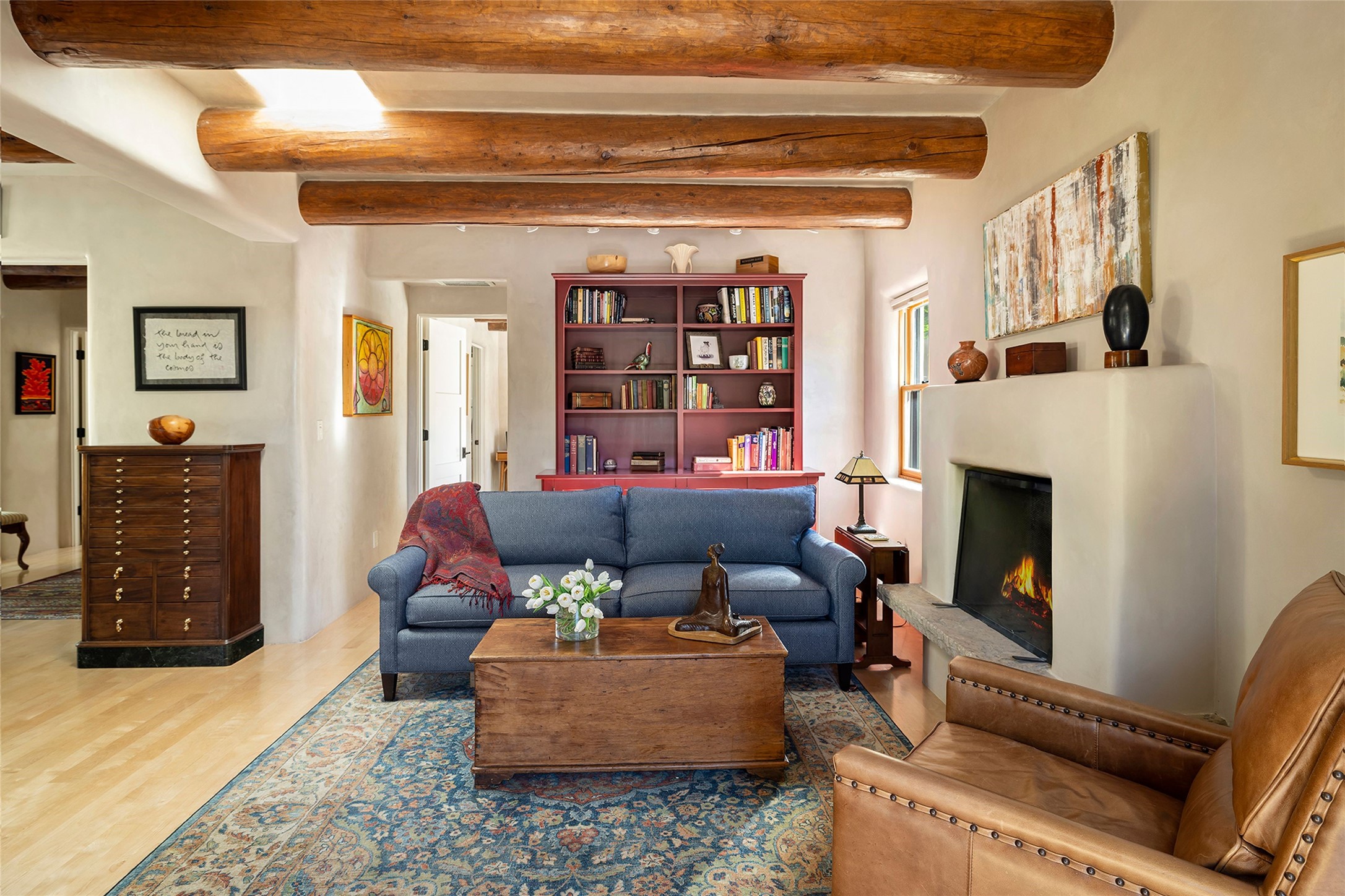 Just steps from the historic Santa Fe Plaza, this exquisite and beautifully updated Juniper Terrace condominium captures the essence of timeless Santa Fe architecture enhanced by sophisticated modern updates. Set within one of the city's most desirable locations, this rare single-level, two-bedroom, two-bath residence offers a seamless blend of style, comfort, and authenticity. The home's inviting living room, anchored by rich vigas and a grand central fireplace, creates a warm and elegant gathering space. The modern chef's kitchen, designed for both beauty and functionality, features granite countertops, high-end appliances, and a breakfast bar that opens gracefully to the dining area and expansive outdoor entertaining spaces. The private owner's suite is a serene retreat, featuring a spa-inspired bath with a jetted tub/shower, and direct access to a secluded patio. The guest suite, complete with its own ensuite bath and private patio access, provides versatility for hosting guests or creating a personal workspace. Multiple enclosed courtyards and lushly landscaped patios invite year-round outdoor living, enhanced by vibrant plantings and a tranquil water feature. Additional highlights include hardwood flooring, creamy plaster walls, rich vigas throughout, and convenient off-street parking. Offering both intimacy and sophistication, this remarkable property exemplifies the ultimate Santa Fe experience--just a short stroll from world-class dining, galleries, and the cultural heart of the city, this incredible home is not to be missed!