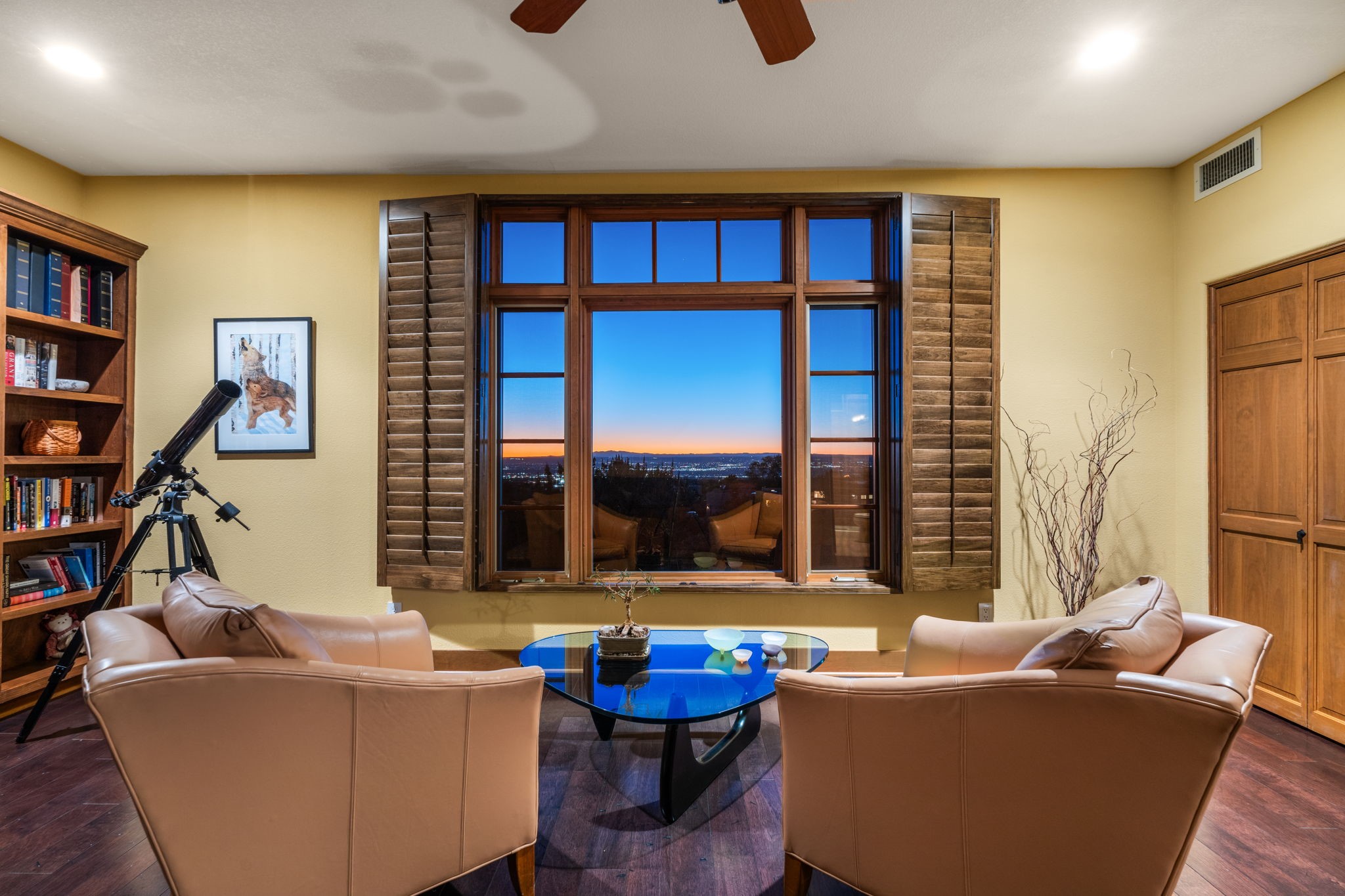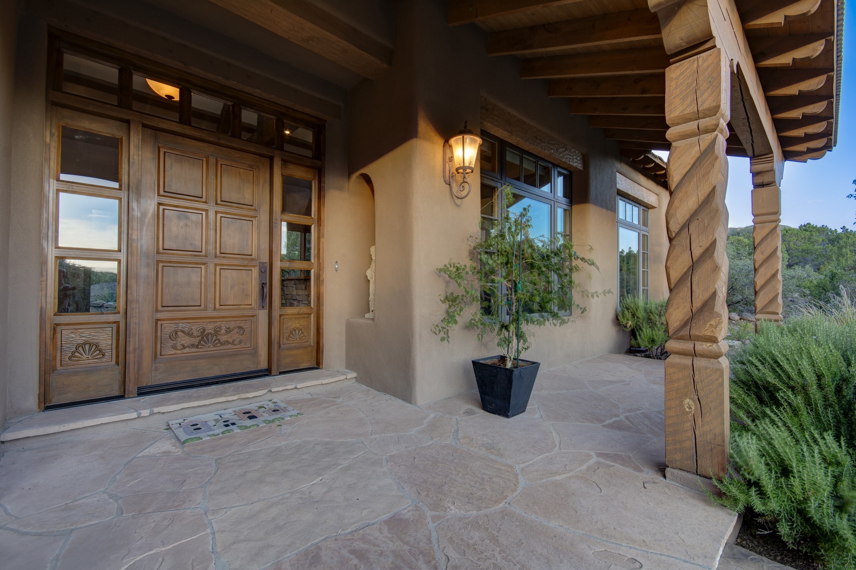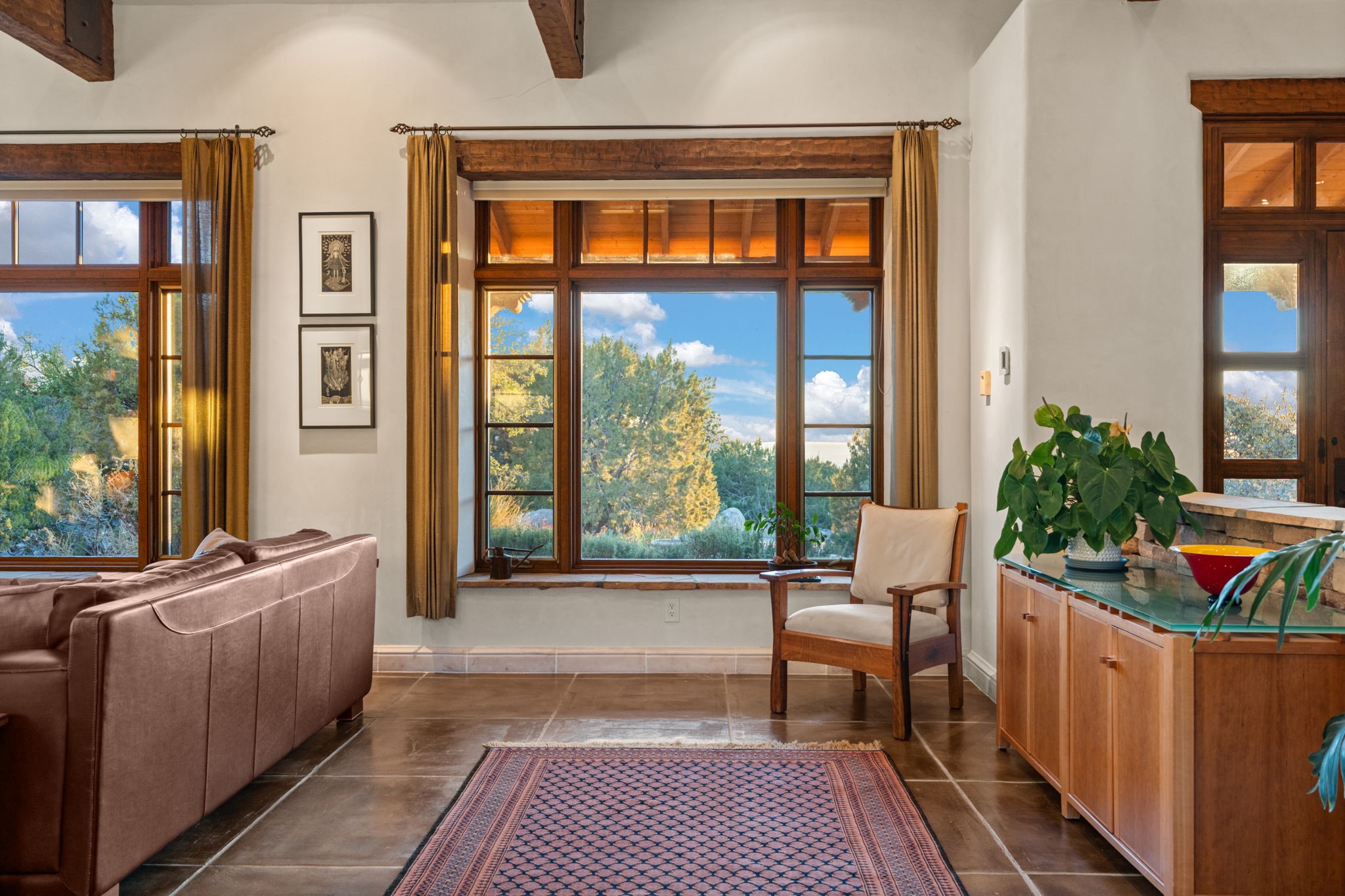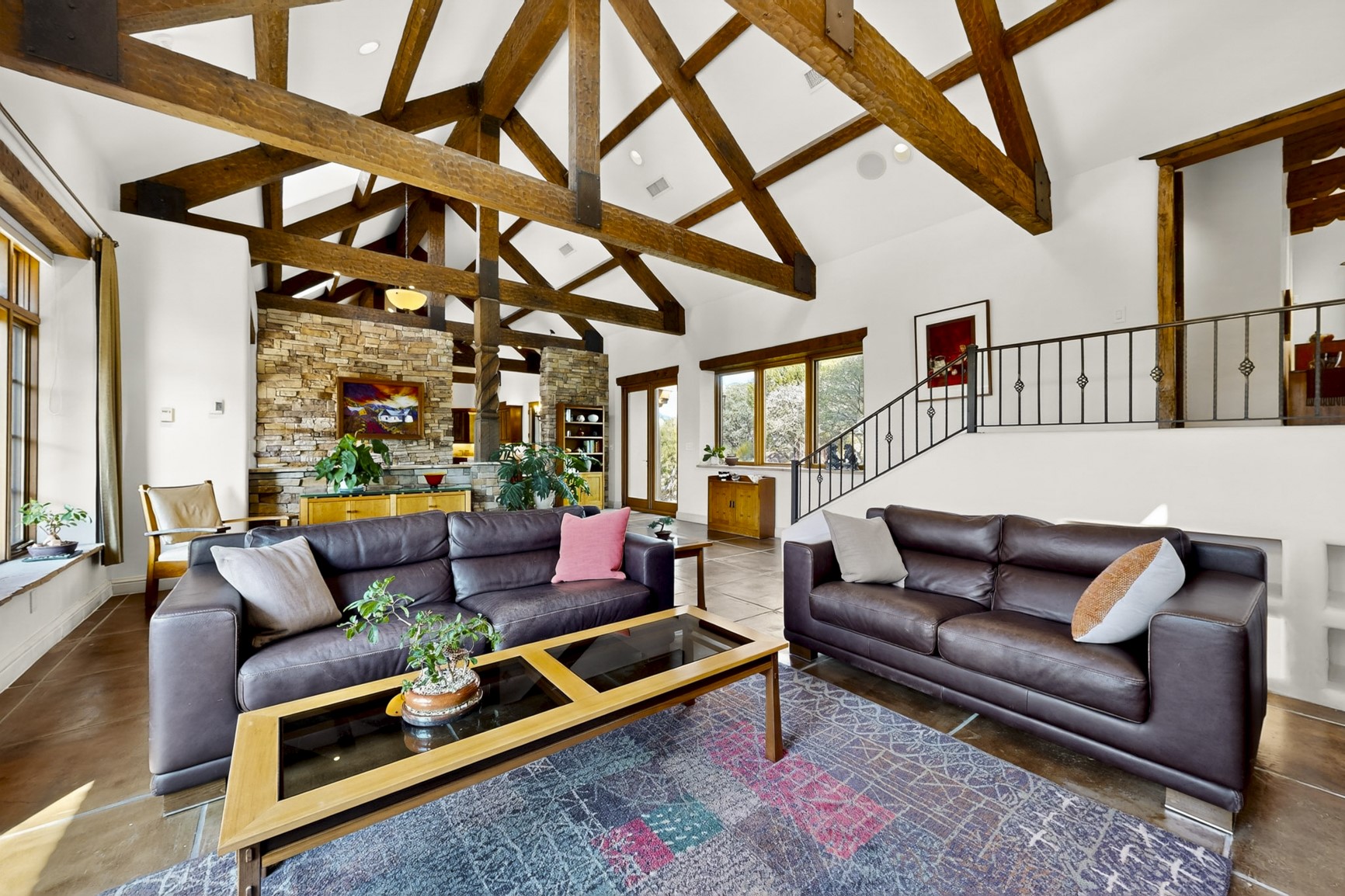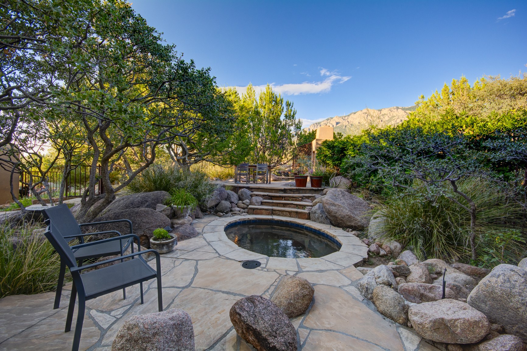 With vistas of the Sandia Mountains and city lights, this spacious 5,513 sq. ft. Sandia Heights estate is a rare blend of artistry, craftsmanship, and luxury. Upon entering the front door, the spacious living area introduces the understated beauty of this special home with hand-crafted details, deep sandstone sills, and a beautiful wood-burning fireplace. Features such as expansive chip-carved beams, custom doors, and diamond plaster walls provide warmth and refinement. Expansive windows frame breathtaking views and bath the house with natural light, magically merging the outdoor and indoor spaces. The kitchen is a chef's dream with a Sub-Zero refrigerator and freezer, Viking Professional 6-burner stove with griddle, and a butler's pantry complete with a Sub-Zero wine and beverage coolerTogether with the eating nook, kiva fireplace seating area, and formal dining room the kitchen area is perfect for evenings with family or elegant entertaining. The primary suite is a true sanctuary featuring a coved ceiling with exposed beams and corbels, a gas log fireplace, and a cozy seating area with latilla ceiling and built-in bookcases. The adjoining spa-inspired bath has it all - a steam shower, dual shower heads, travertine seating, a skylight over the garden jetted tub, and a private yoga and meditation room. Additional living spaces include a home office attached to a secondary living room and multiple generous ensuite bedrooms. The private backyard feels like a Zen oasis under New Mexico skies with a tiered garden, in-ground spa, outdoor fireplace, and covered patio. Modern comforts abound with in-floor hot water radiant heat, large 3-car garage, abundant storage, central vacuum, built-in speakers, new stucco and septic in 2025! This could be your ABQ Dream Home!