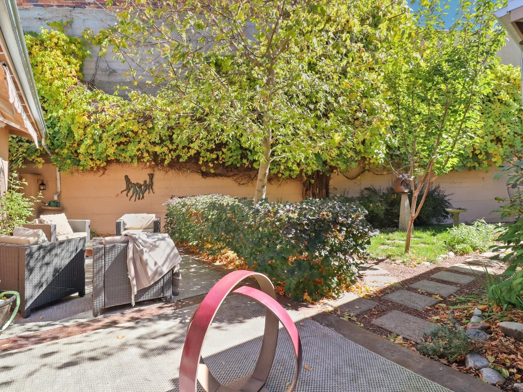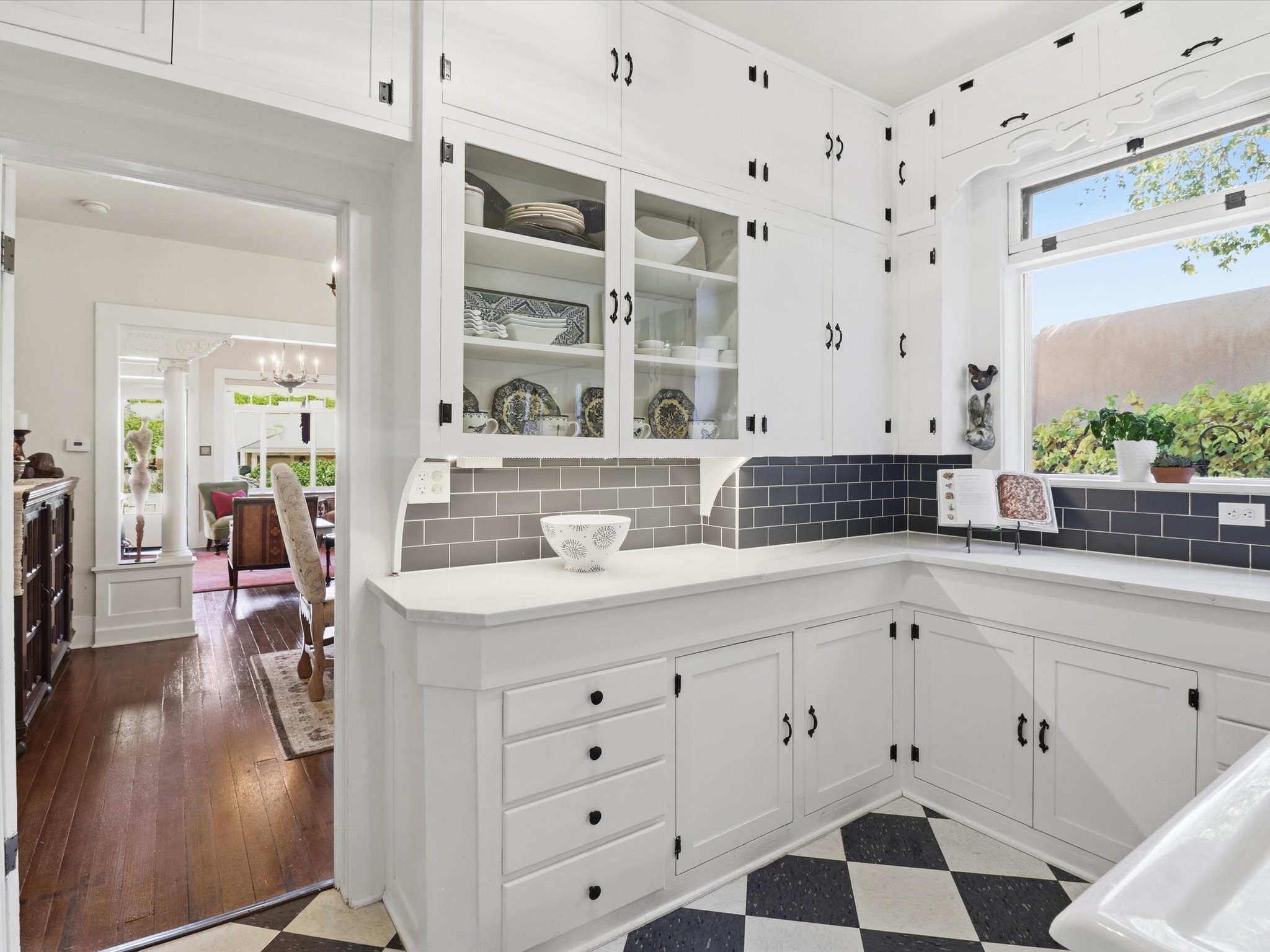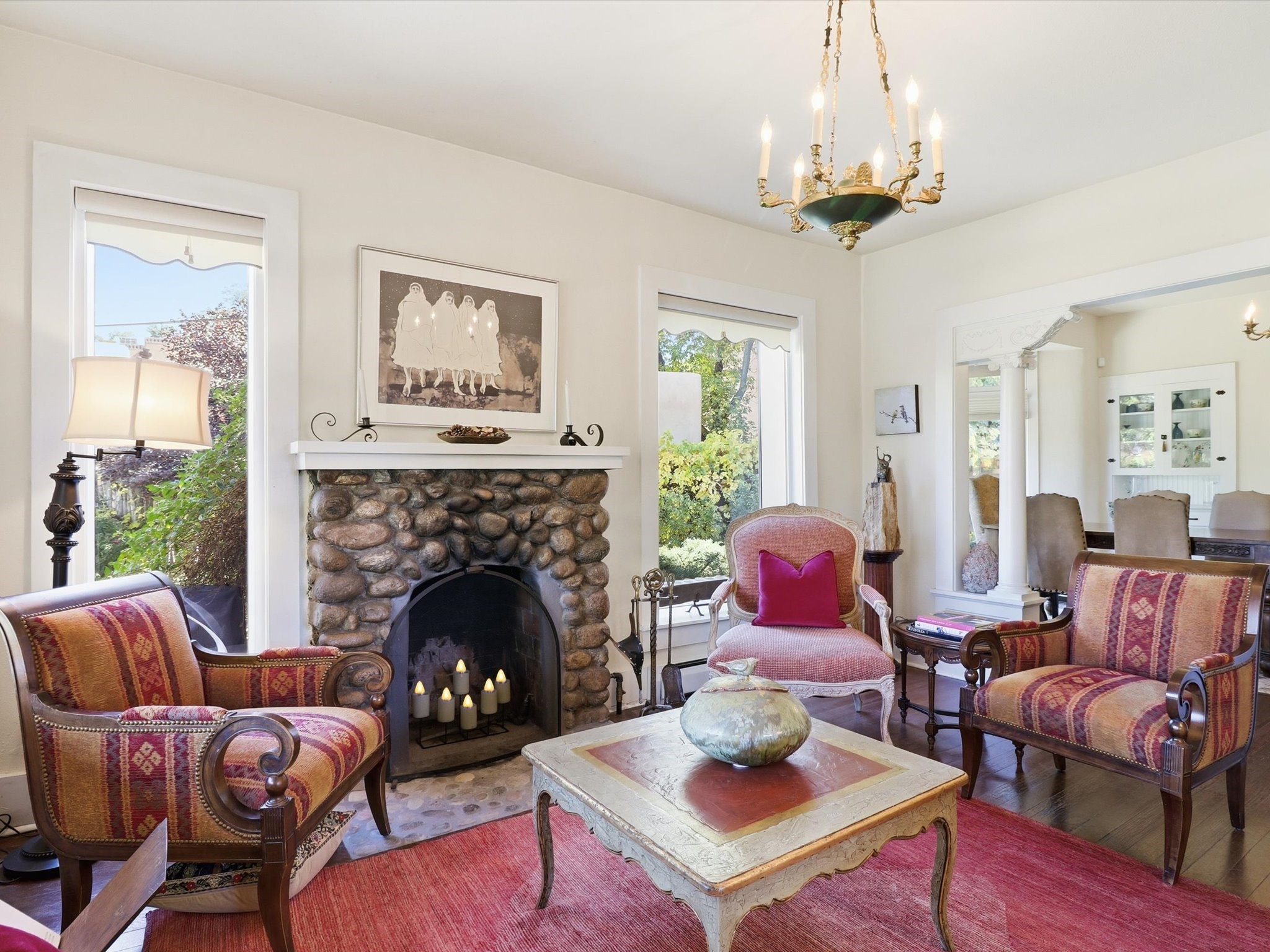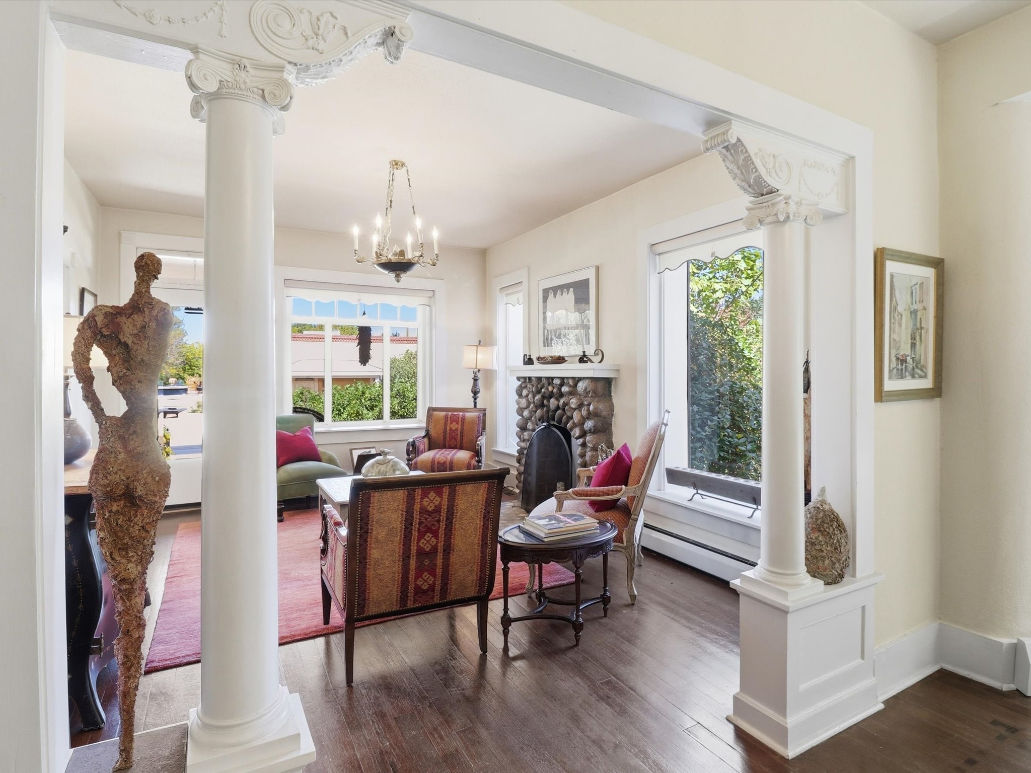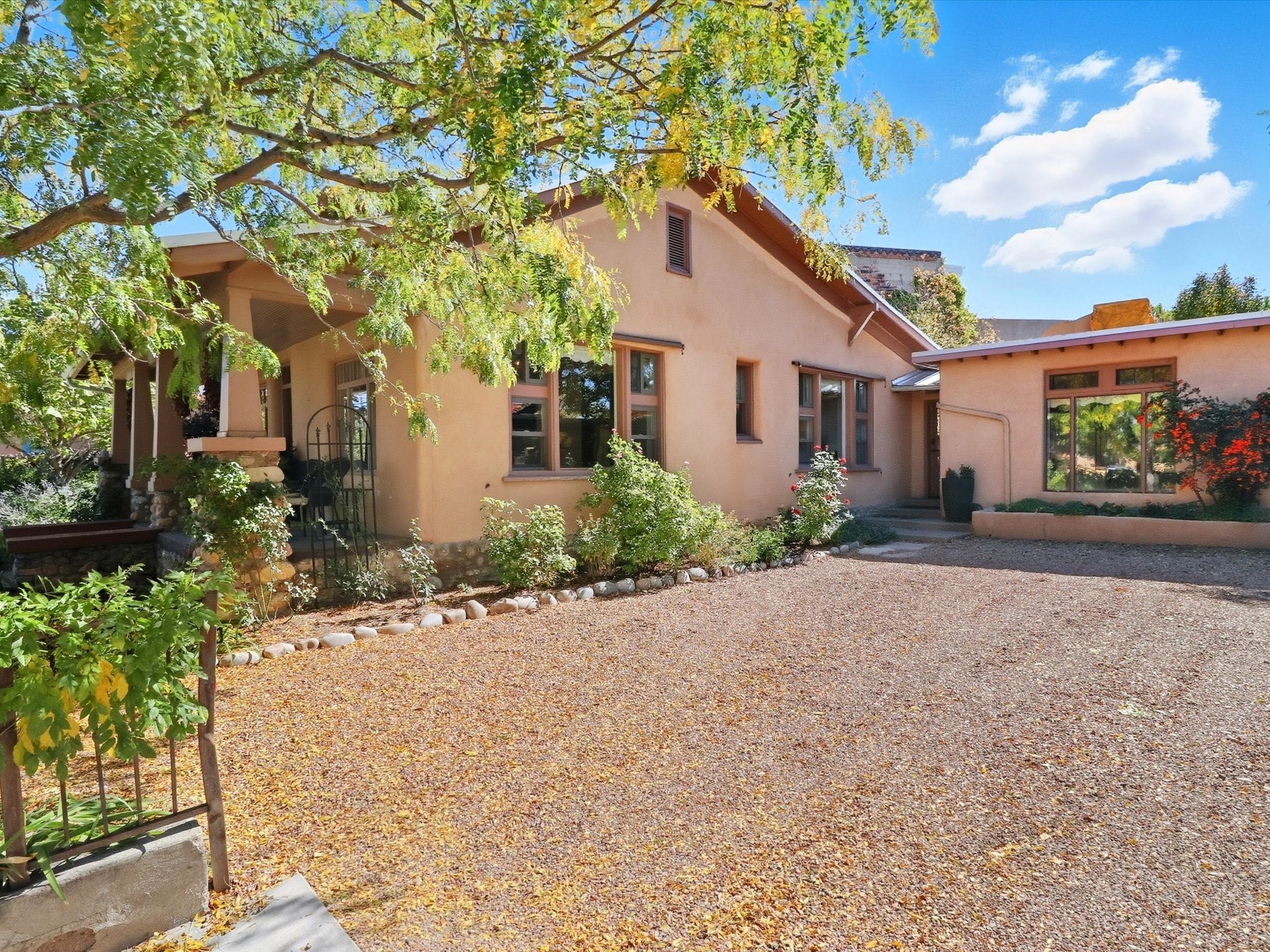 One of Santa Fe's most desirable locations. This historically 'contributing' home on East Agua Fria is a light-filled jewel, perfectly situated to enjoy all the vibrancy of Santa Fe's Railyard District and Santa Fe's Downtown. Imagine being just blocks away from world-class art galleries, dining, shopping, movie theaters, and music. The Santa Fe Farmers Market, a beloved community hub, is just a few blocks to the south. This charming 1900 Craftsman Bungalow home offers four bedrooms, 2 baths, many thoughtful upgrades, double adobe construction with exterior stone base pillars, creating a timeless, inviting and quiet home. A gracious interior - original stenciled fir floors, bay windows, gorgeous antique lighting fixtures, a crisp black and white kitchen. Additionally, this property offers an attractive flexibility with two distinct areas, each featuring separate entrances and sitting areas providing excellent options for guests or potential rental income. The home boasts a charming, deep Craftsman-style porch, perfect for relaxing and enjoying the neighborhood. The current owners have meticulously cultivated romantic garden areas over many years, showcasing roses, wisteria, daylilies, and climbing vines, maintained by an automatic drip system. The large rear patio serves as an urban sanctuary, ideal for entertaining or simply unwinding. Further enhancing convenience and livability are the unusually generous gated off-street parking in the front, a single-story design and a 200-square-foot storage area in the rear. Come see and be captivated! Neither Listing Brokers nor Seller warrants the square footage of the home or lot. If the size of the home or lot is of material consideration to the Buyer, then the Buyer should have them measured. Tax Levy is from the Assessor website. All fires depicted are photo-shopped. Buyer to verify the functionality of the fireplace.