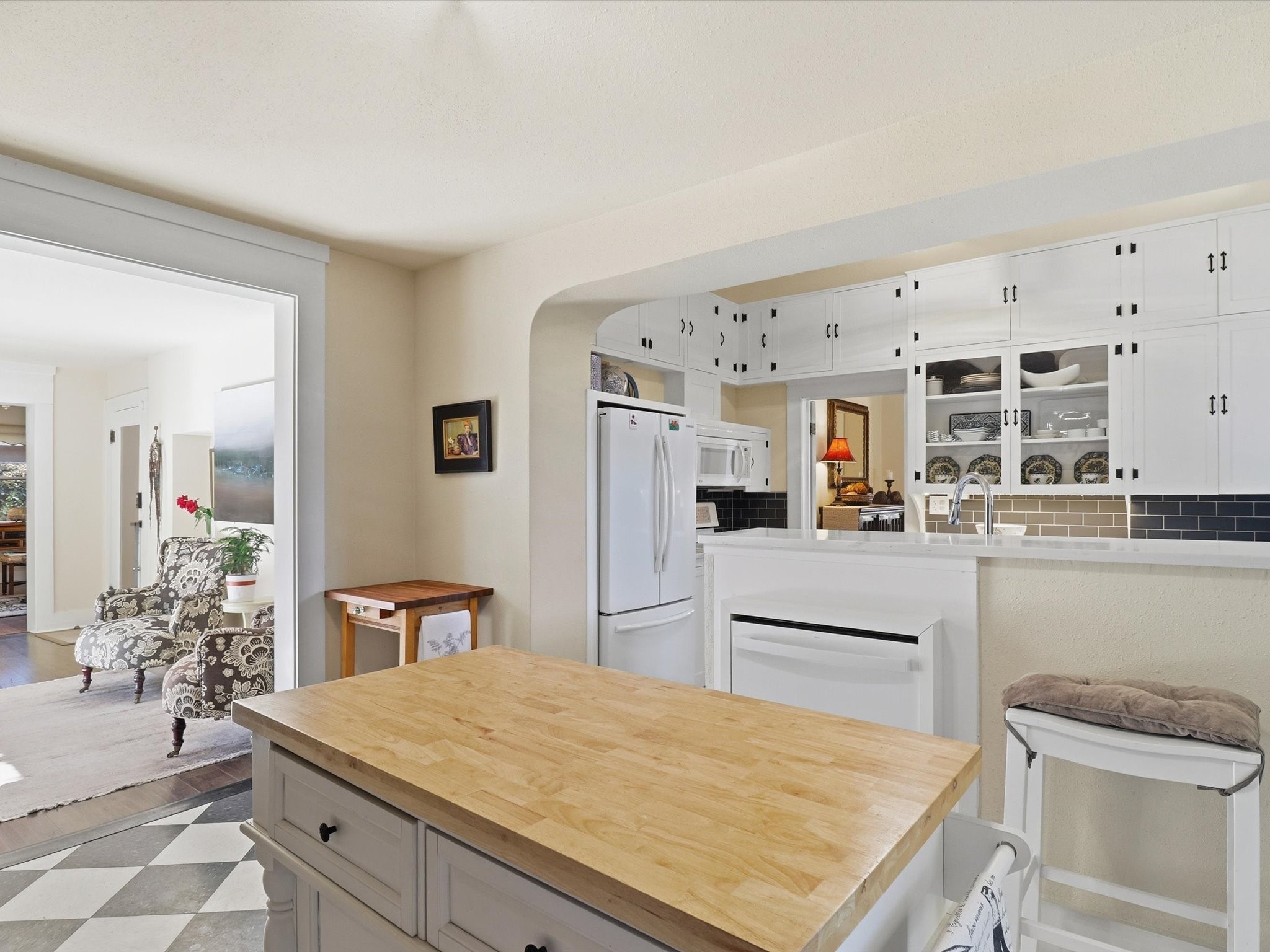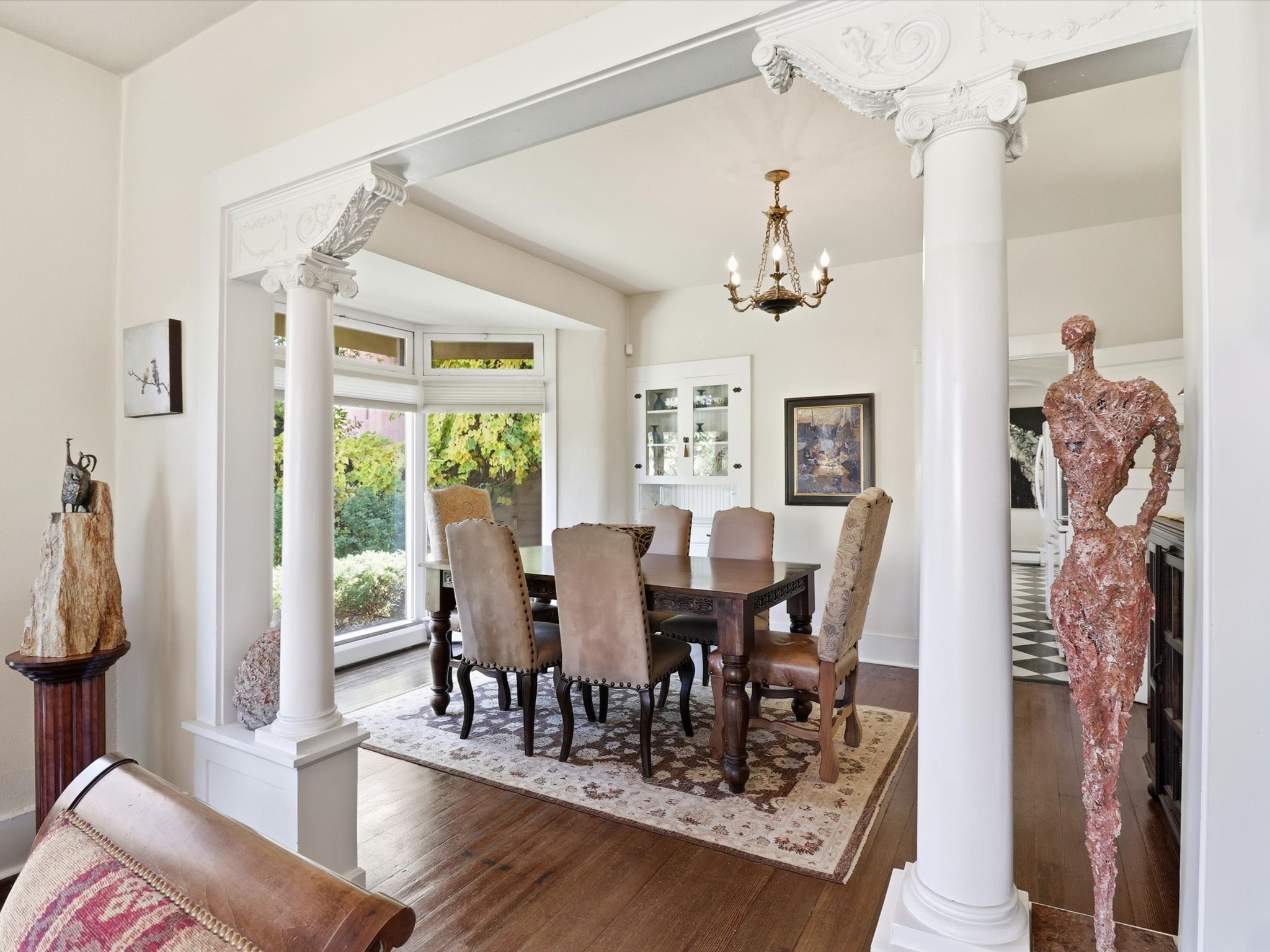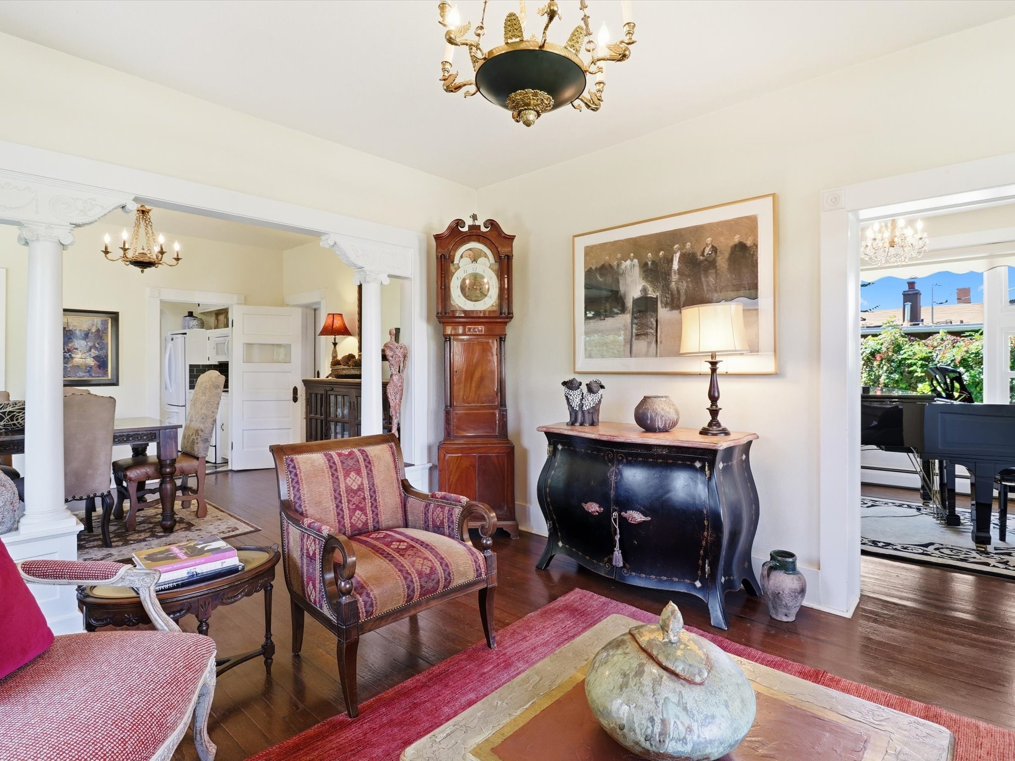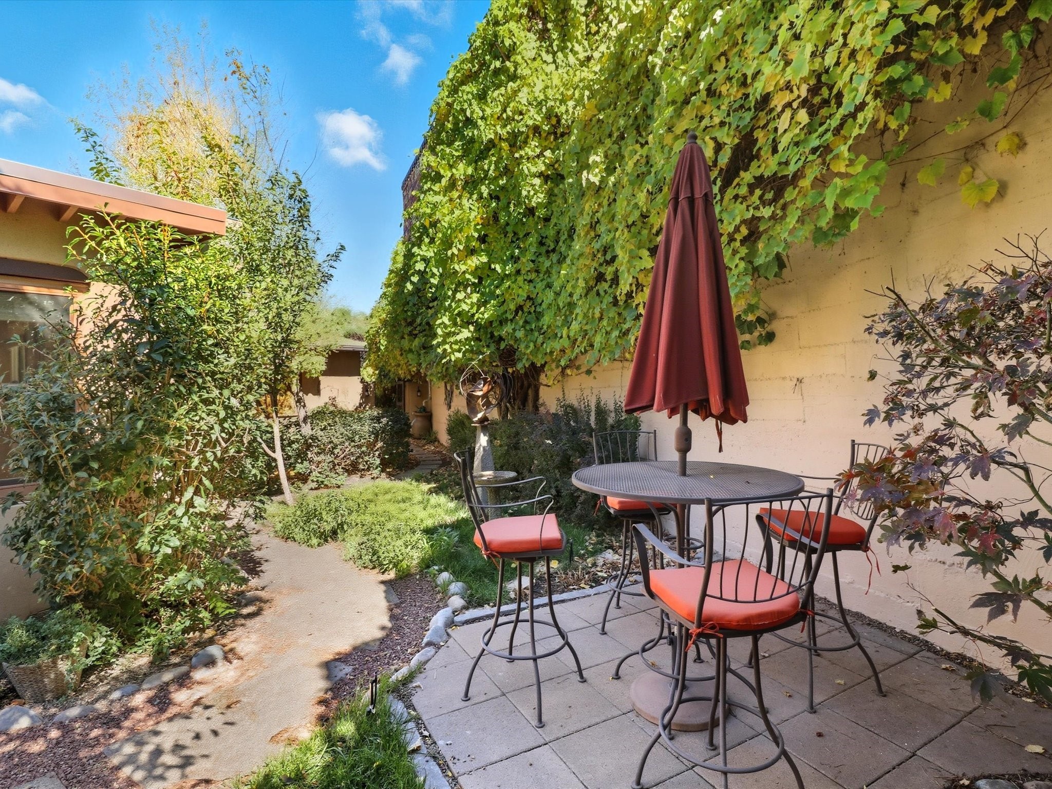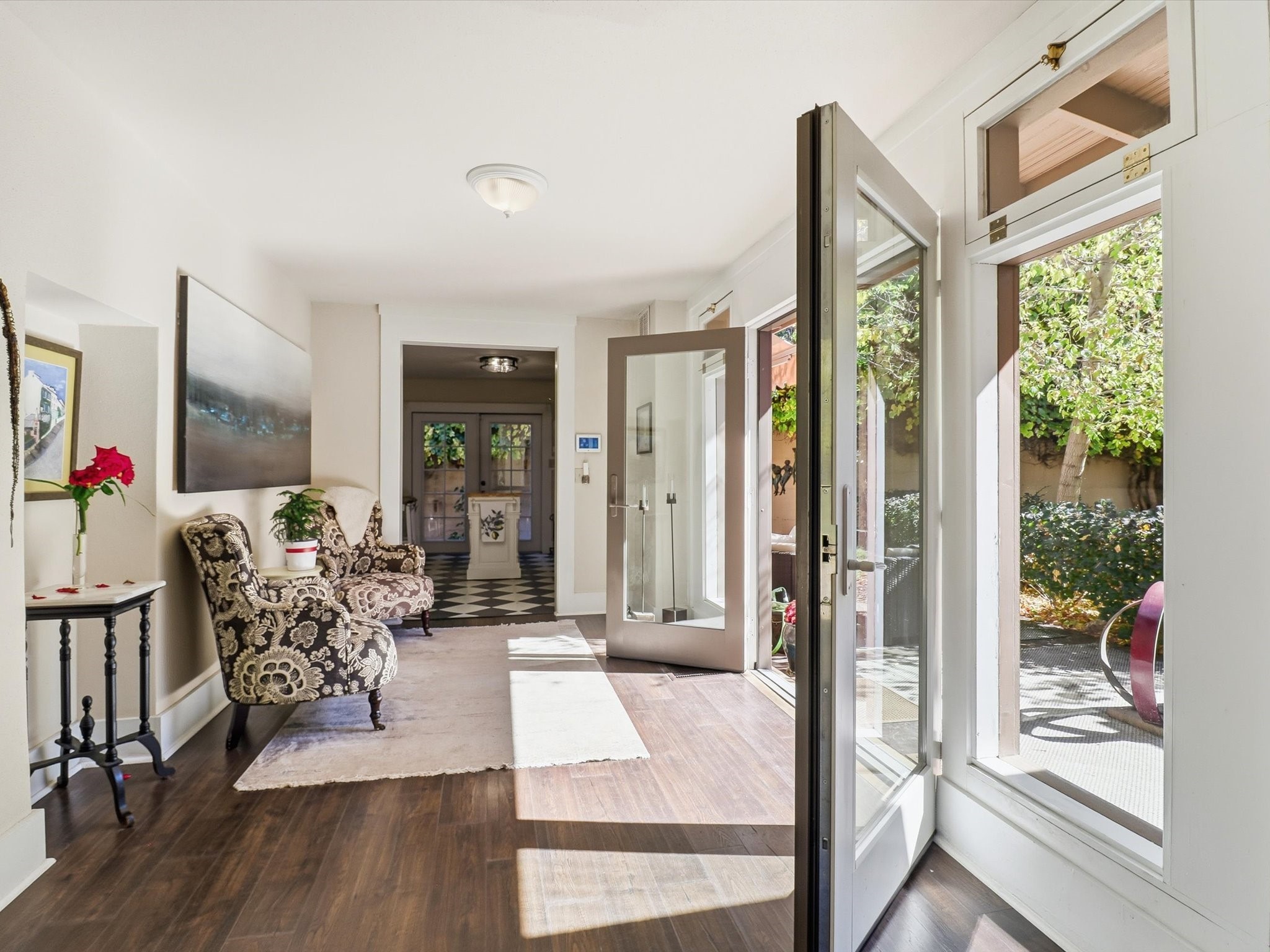 One of Santa Fe's most desirable locations. This historically 'contributing' home on East Agua Fria is a light-filled jewel, perfectly situated to enjoy all the vibrancy of Santa Fe's Railyard District and Santa Fe's Downtown. Imagine being just blocks away from world-class art galleries, dining, shopping, movie theaters, and music. The Santa Fe Farmers Market, a beloved community hub, is just a few blocks to the south. This charming 1900 Craftsman Bungalow home offers four bedrooms, 2 baths, many thoughtful upgrades, double adobe construction with exterior stone base pillars, creating a timeless, inviting and quiet home. A gracious interior - original stenciled fir floors, bay windows, gorgeous antique lighting fixtures, a crisp black and white kitchen. Additionally, this property offers an attractive flexibility with two distinct areas, each featuring separate entrances and sitting areas providing excellent options for guests or potential rental income. The home boasts a charming, deep Craftsman-style porch, perfect for relaxing and enjoying the neighborhood. The current owners have meticulously cultivated romantic garden areas over many years, showcasing roses, wisteria, daylilies, and climbing vines, maintained by an automatic drip system. The large rear patio serves as an urban sanctuary, ideal for entertaining or simply unwinding. Further enhancing convenience and livability are the unusually generous gated off-street parking in the front, a single-story design and a 200-square-foot storage area in the rear. Come see and be captivated! Neither Listing Brokers nor Seller warrants the square footage of the home or lot. If the size of the home or lot is of material consideration to the Buyer, then the Buyer should have them measured. Tax Levy is from the Assessor website. All fires depicted are photo-shopped. Buyer to verify the functionality of the fireplace.