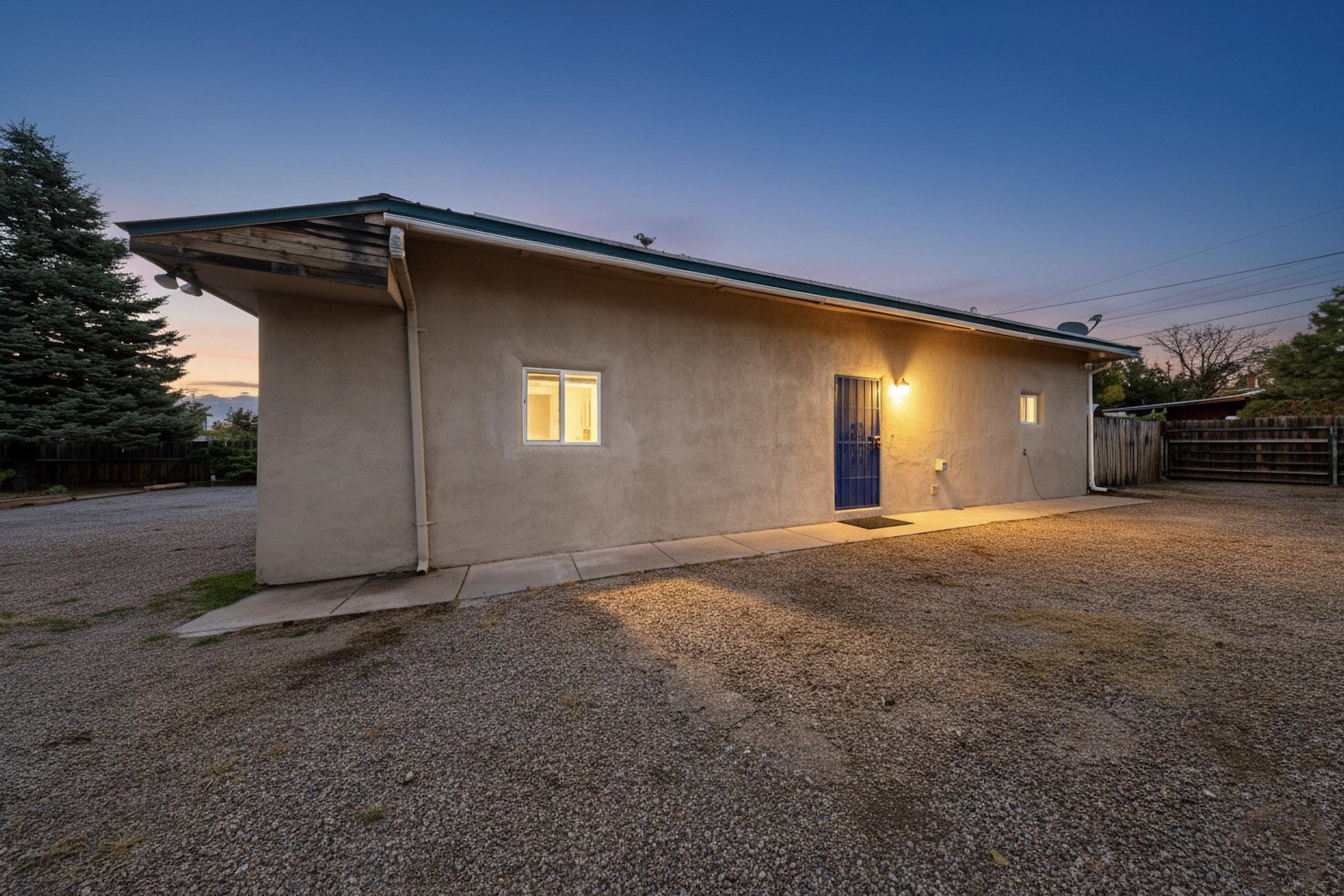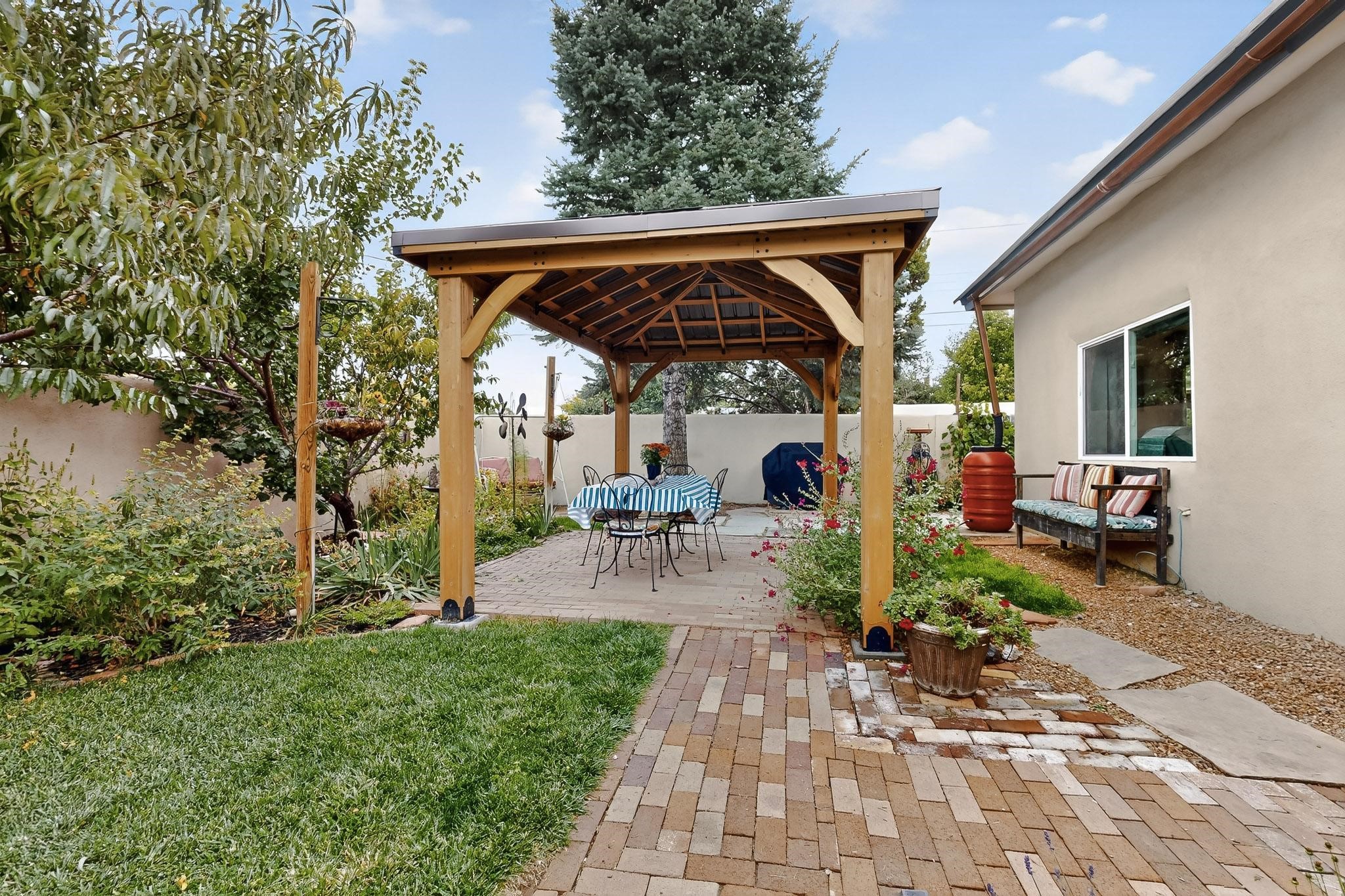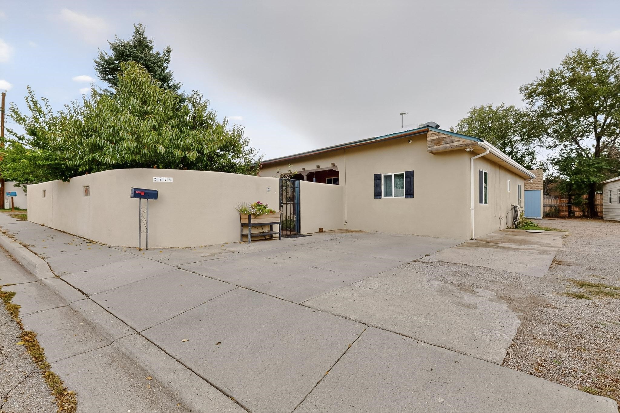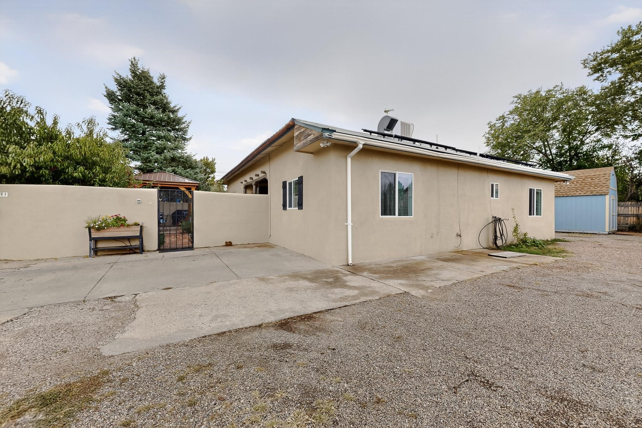 Enjoy country living in this well cared for .21 acre property in the heart of Santa Fe! The home's entry courtyard, with its new ramada, sets the tone for relaxed outdoor living. Inside, the adobe portion of the home, built in 1947, exudeswarmth and includes the spacious updated Kitchen, Living Room, Primary Bedroom; the newer stick-built wing features 2 substantial guest bedrooms, the primary bathroom and a remodeled bathroom. Interior improvements include newwindows, new paint, newer water heater, furnace and appliances. Owners have added a fabulous detached 18' X 30' garage, and will convey several sheds, a camping trailer, a green house and a hot tub, if wanted. Also included is fully paid for solar panels that were added in 2024. Lush and charming gardens with fruits, veggies and herbs plus mature trees on irrigation further enhance the property's appeal. A large basement is accessible from the side of the home for additional storage. Come see this sweet home at your first opportunity!