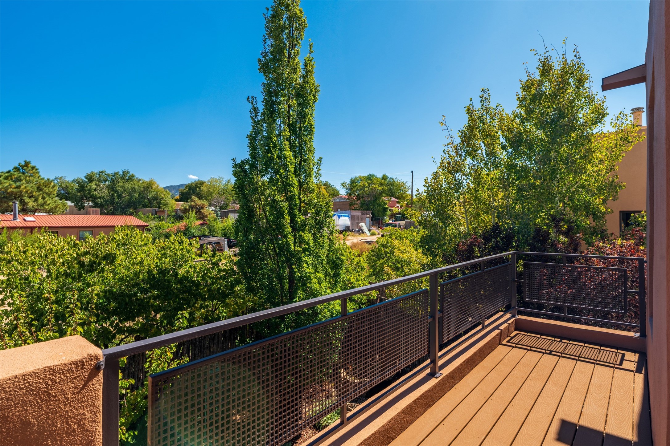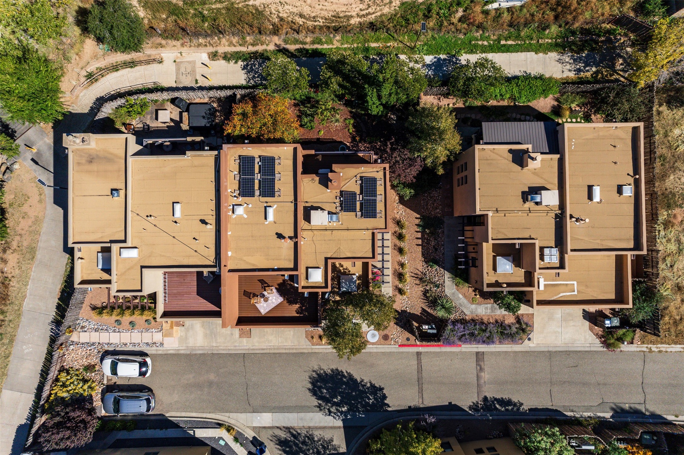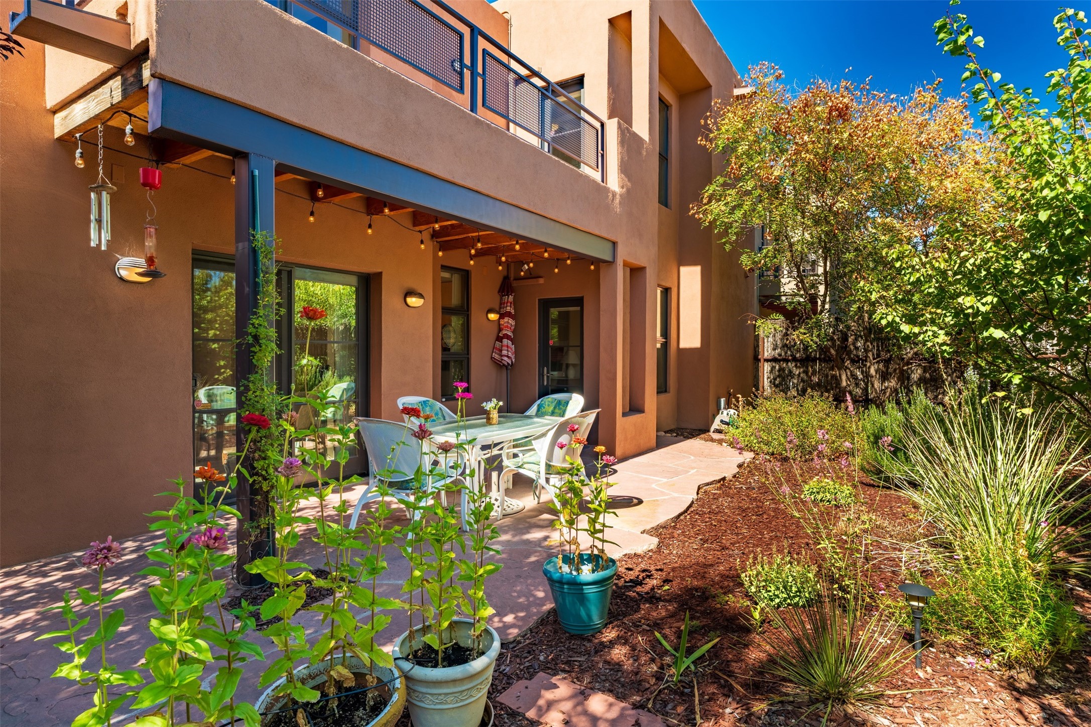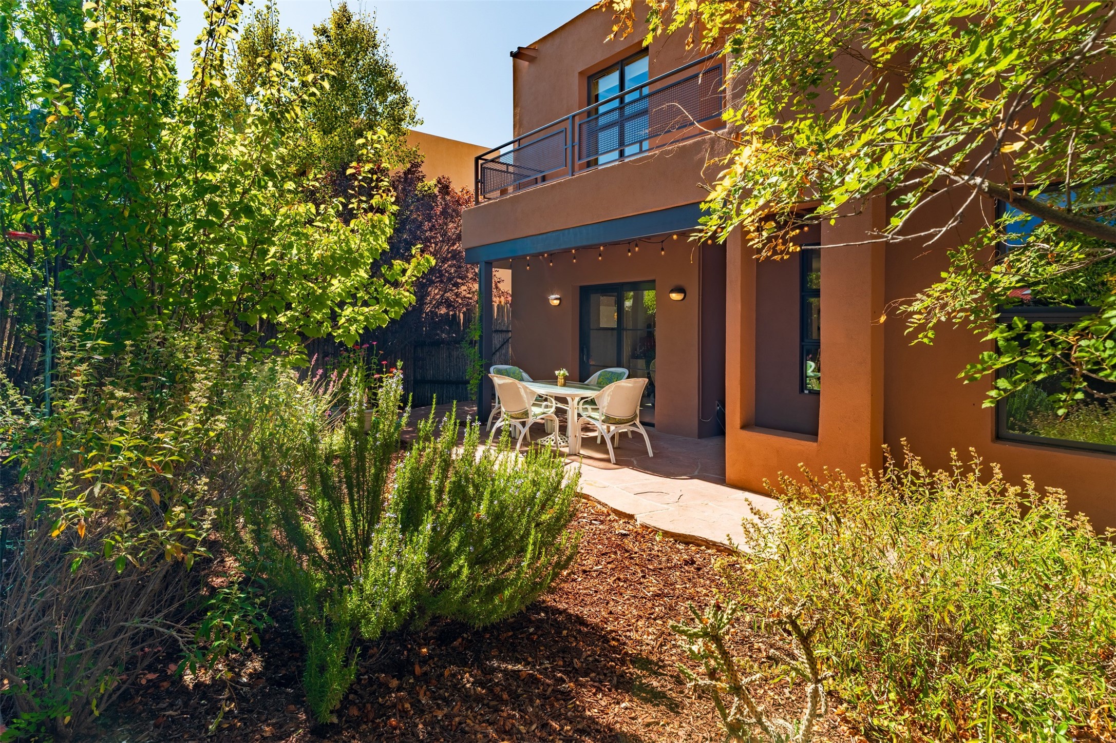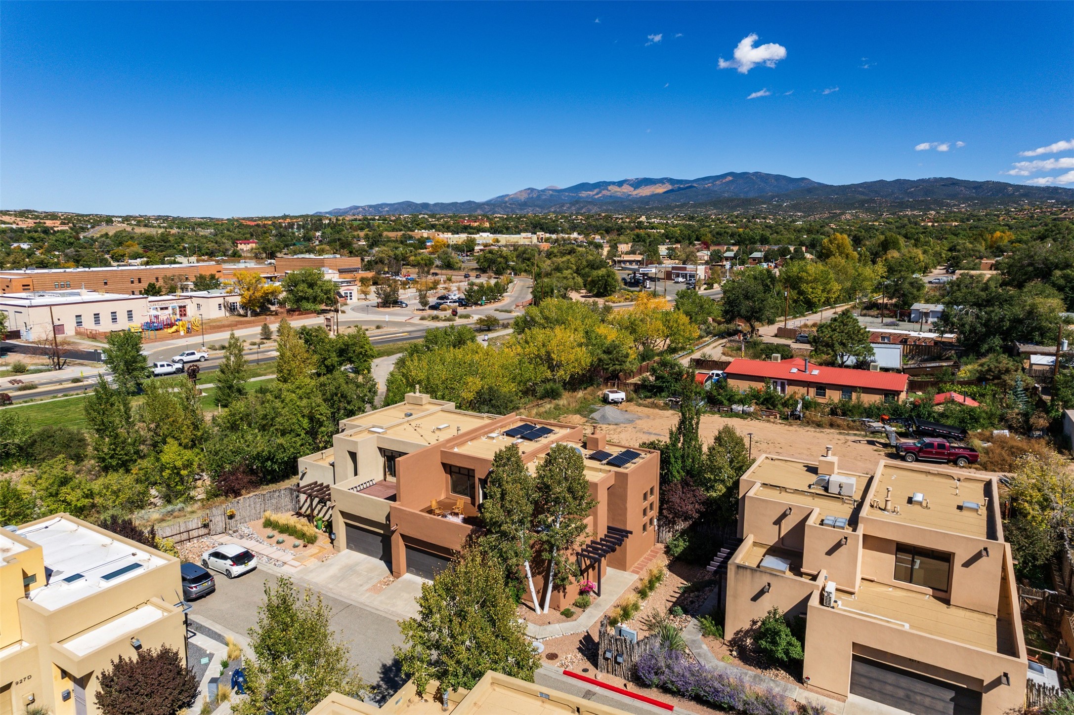 Located on the scenic Santa Fe River Trail, this exceptional townhome features contemporary architecture. Designed to maximize natural light and space, the home offers a serene retreat in one of the city's most desirable in-town locations--just minutes from the vibrant Santa Fe Plaza, Railyard, Famers Market, world-class restaurants, museums, and renowned art galleries. The nearby Solana Center features an organic market, dance studio, restaurants, and brewery. The Bicentennial Park is a short distance away and offers an outdoor pool, shady picnic areas, and tennis courts. Inside, you will find a thoughtfully designed open-concept floor plan. Polished concrete floors in the main level ground the space with a modern aesthetic, with double height ceilings, clerestory windows, and a seamless flow to the rear patio. A fireplace adds warmth and character. The flow from living to dining to kitchen creates an inviting atmosphere perfect for entertaining or relaxing at home. The primary suite on the main level is a peaceful haven featuring a large walk-in closet with custom built-in shelving and an en-suite bathroom. Upstairs, a loft-style bonus area provides flexible living options--ideal for a den, creative studio, or media room. The two upstairs bedrooms each have a private balcony and walk in closets. This home is as comfortable as it is beautiful, with radiant in-floor heating and 5 mini-split units ensuring year-round climate control. The house boast passive and active solar - current owner has no electricity bills due to the owned solar panels. A two-car garage with extra storage space provides plenty of space for outdoor gear and everyday essentials. Whether you're seeking a full-time residence or a low-maintenance Santa Fe getaway, this beautiful townhome delivers a perfect balance of modern design, elegant finishes, and unbeatable location. Here, you're not just buying a home--you're embracing the Santa Fe lifestyle....
