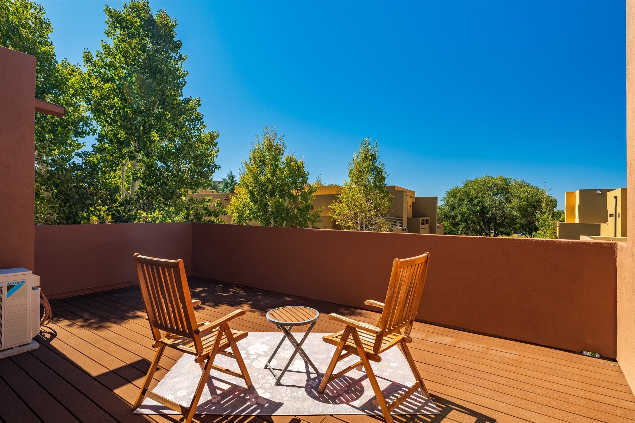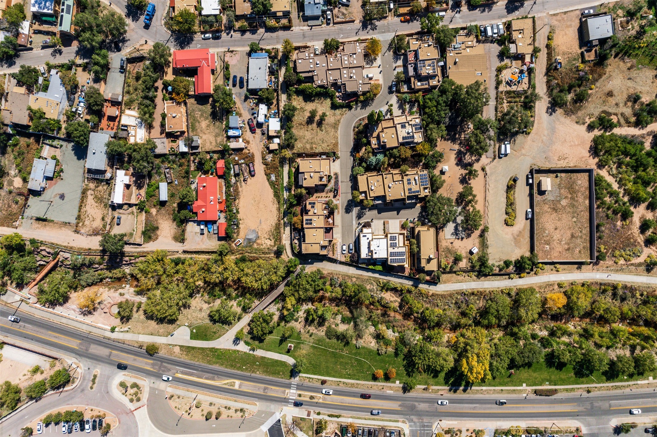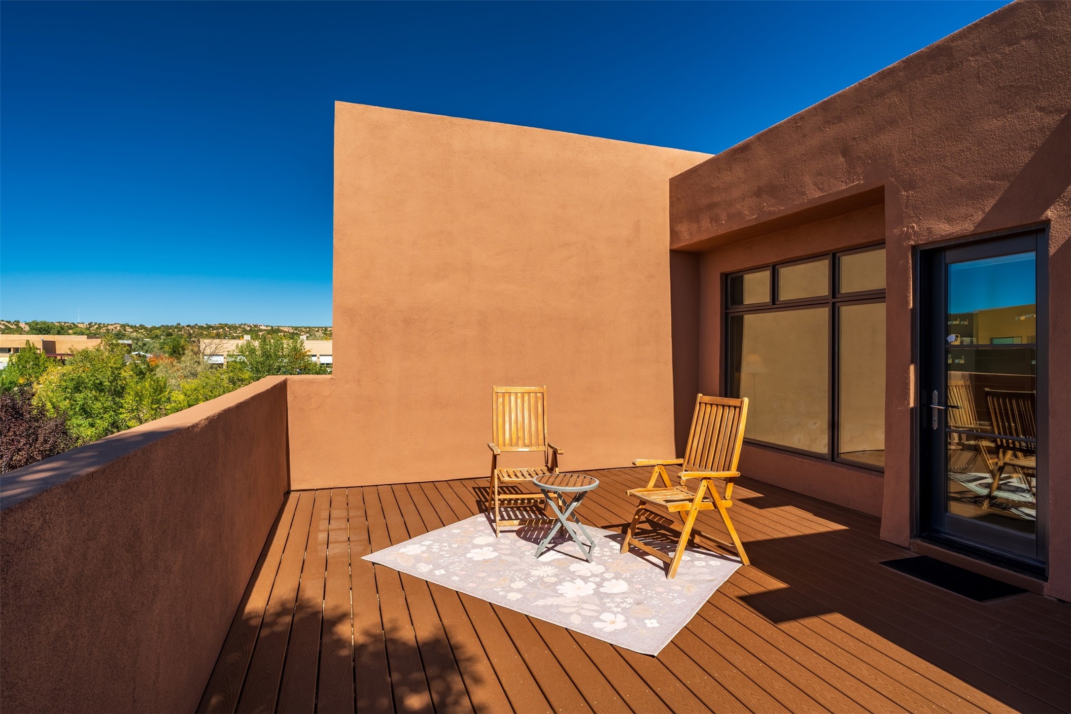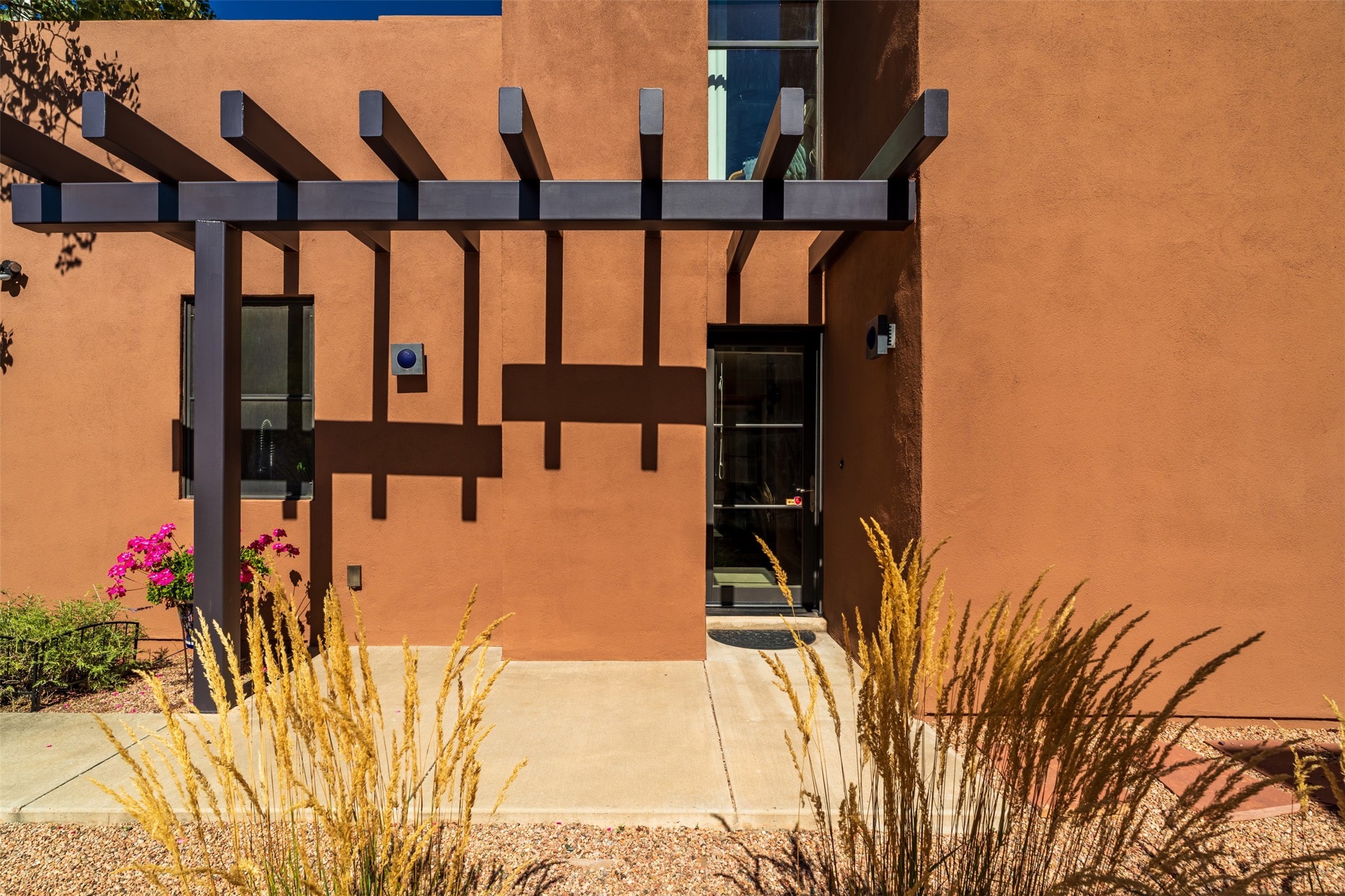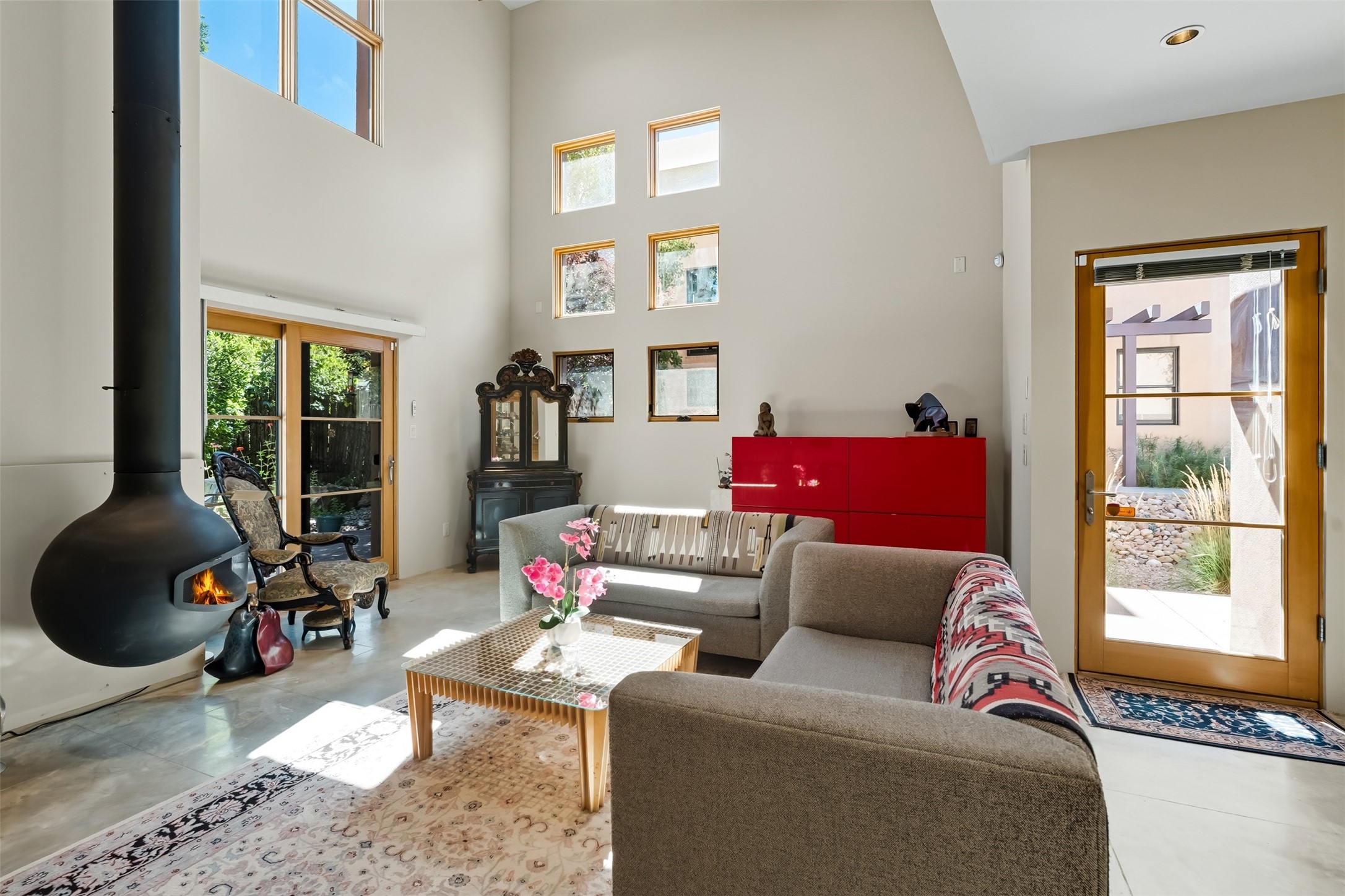 Located on the scenic Santa Fe River Trail, this exceptional townhome features contemporary architecture. Designed to maximize natural light and space, the home offers a serene retreat in one of the city's most desirable in-town locations--just minutes from the vibrant Santa Fe Plaza, Railyard, Famers Market, world-class restaurants, museums, and renowned art galleries. The nearby Solana Center features an organic market, dance studio, restaurants, and brewery. The Bicentennial Park is a short distance away and offers an outdoor pool, shady picnic areas, and tennis courts. Inside, you will find a thoughtfully designed open-concept floor plan. Polished concrete floors in the main level ground the space with a modern aesthetic, with double height ceilings, clerestory windows, and a seamless flow to the rear patio. A fireplace adds warmth and character. The flow from living to dining to kitchen creates an inviting atmosphere perfect for entertaining or relaxing at home. The primary suite on the main level is a peaceful haven featuring a large walk-in closet with custom built-in shelving and an en-suite bathroom. Upstairs, a loft-style bonus area provides flexible living options--ideal for a den, creative studio, or media room. The two upstairs bedrooms each have a private balcony and walk in closets. This home is as comfortable as it is beautiful, with radiant in-floor heating and 5 mini-split units ensuring year-round climate control. The house boast passive and active solar - current owner has no electricity bills due to the owned solar panels. A two-car garage with extra storage space provides plenty of space for outdoor gear and everyday essentials. Whether you're seeking a full-time residence or a low-maintenance Santa Fe getaway, this beautiful townhome delivers a perfect balance of modern design, elegant finishes, and unbeatable location. Here, you're not just buying a home--you're embracing the Santa Fe lifestyle....