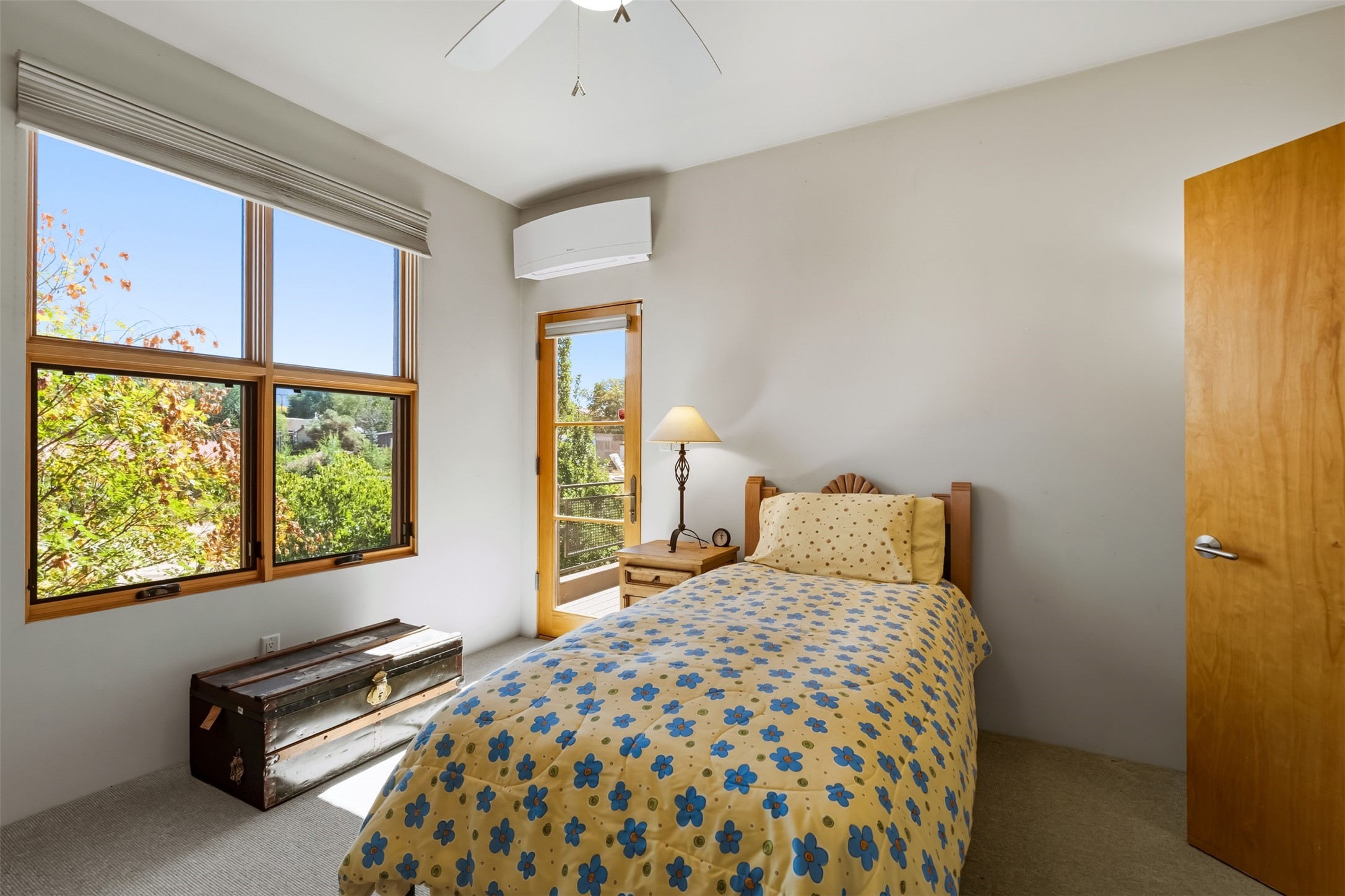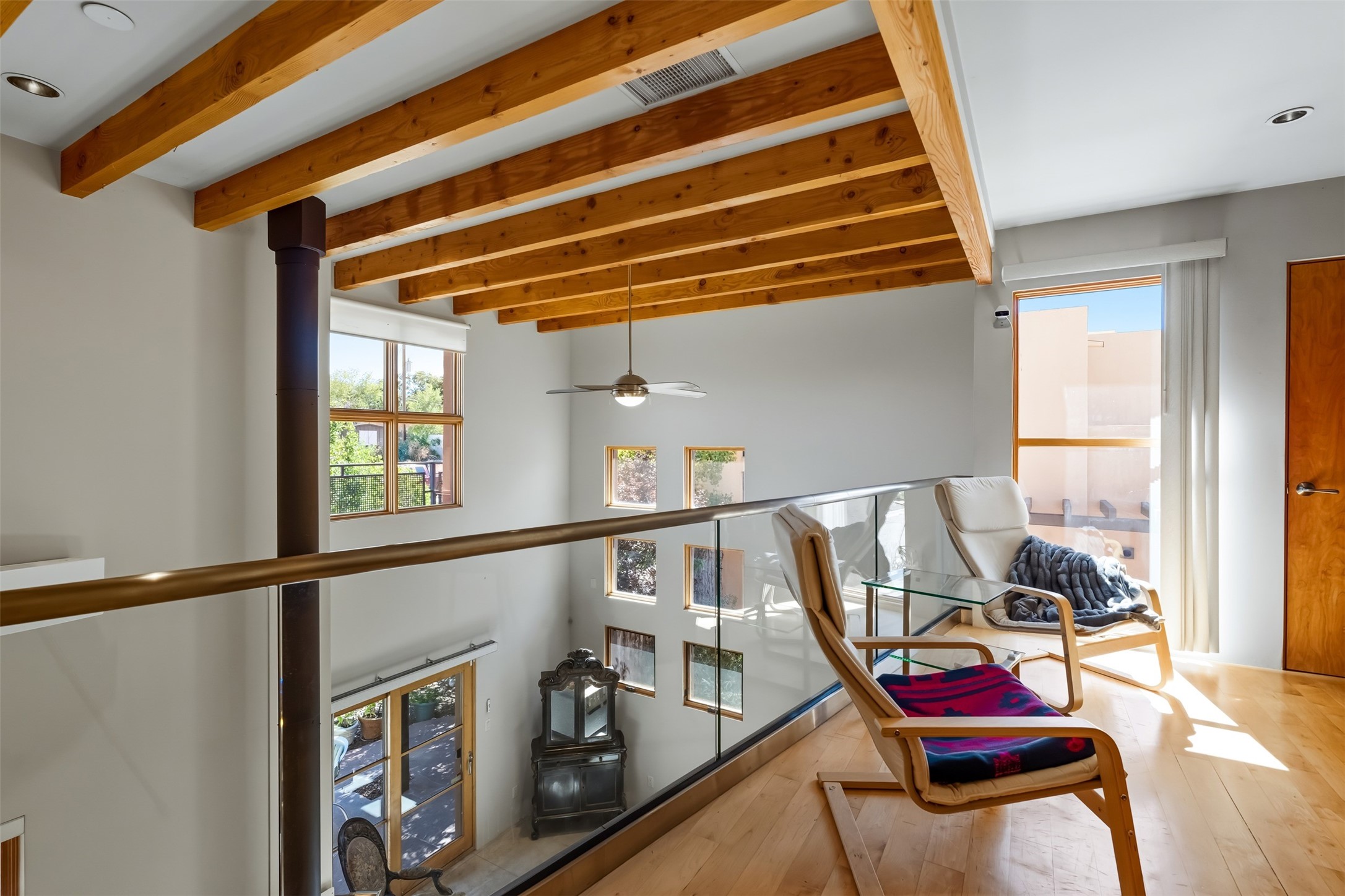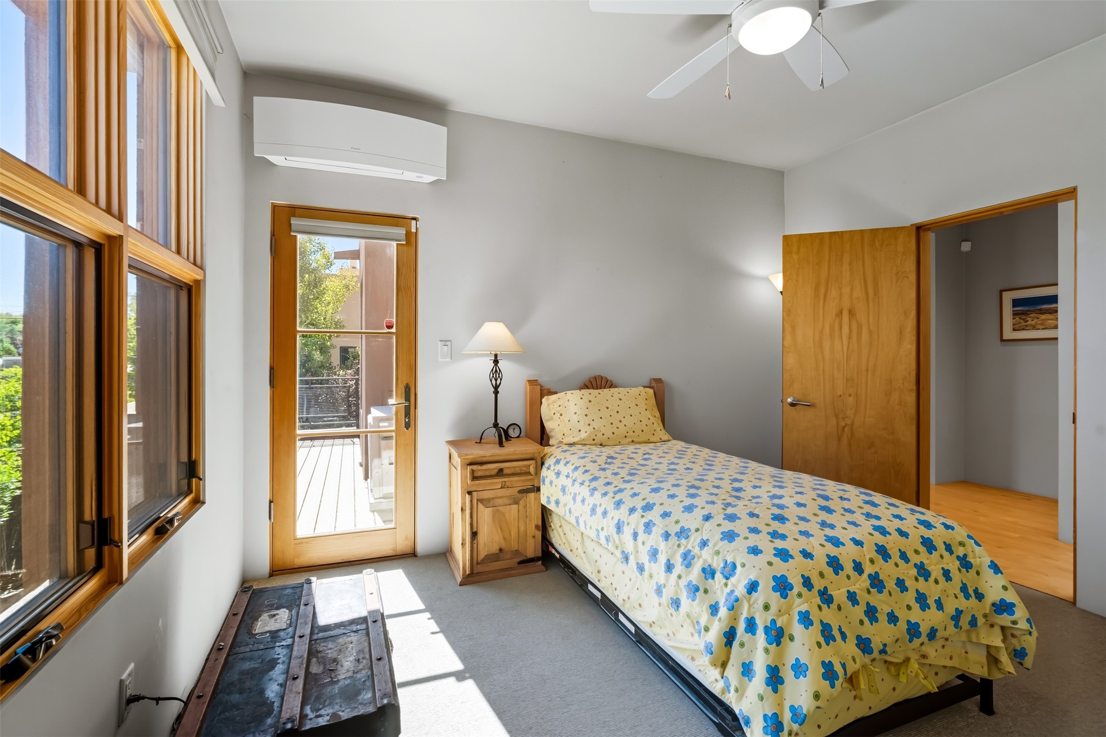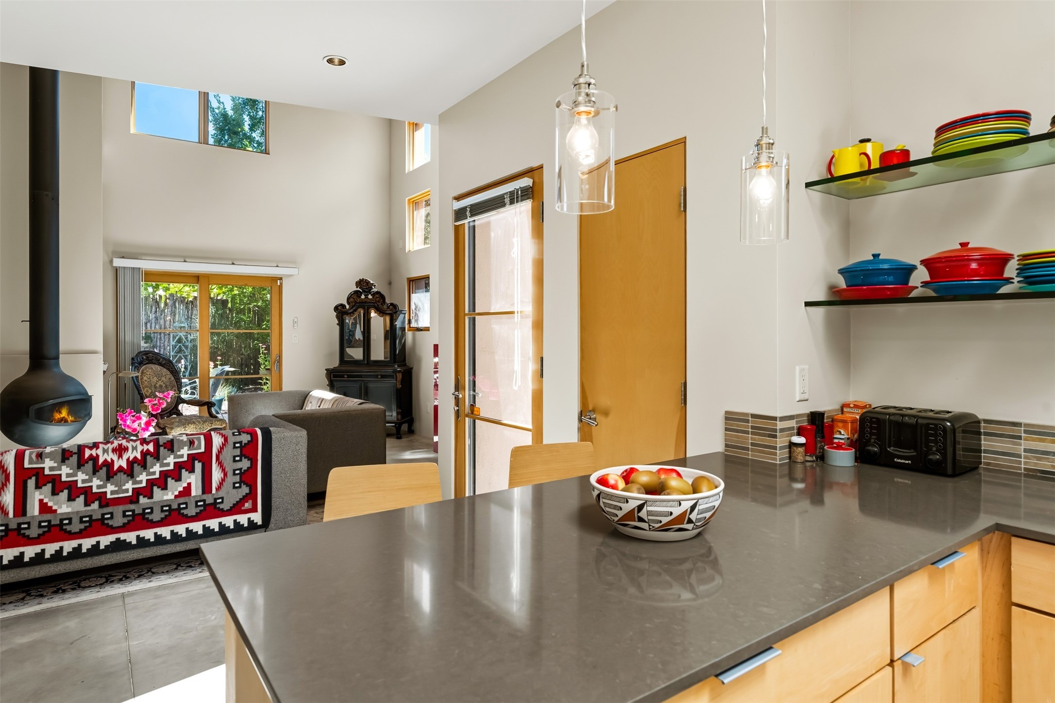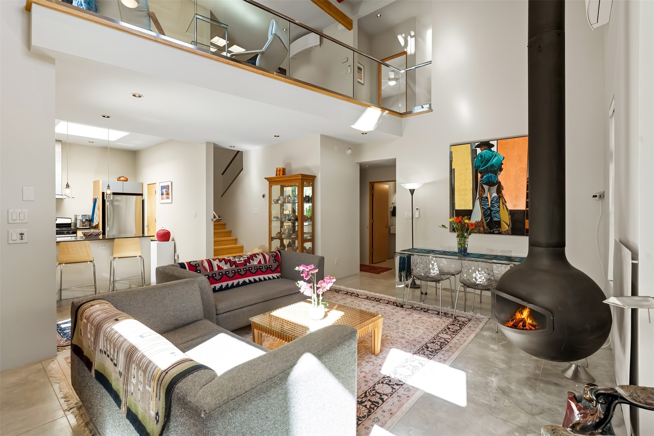 Located on the scenic Santa Fe River Trail, this exceptional townhome features contemporary architecture. Designed to maximize natural light and space, the home offers a serene retreat in one of the city's most desirable in-town locations--just minutes from the vibrant Santa Fe Plaza, Railyard, Famers Market, world-class restaurants, museums, and renowned art galleries. The nearby Solana Center features an organic market, dance studio, restaurants, and brewery. The Bicentennial Park is a short distance away and offers an outdoor pool, shady picnic areas, and tennis courts. Inside, you will find a thoughtfully designed open-concept floor plan. Polished concrete floors in the main level ground the space with a modern aesthetic, with double height ceilings, clerestory windows, and a seamless flow to the rear patio. A fireplace adds warmth and character. The flow from living to dining to kitchen creates an inviting atmosphere perfect for entertaining or relaxing at home. The primary suite on the main level is a peaceful haven featuring a large walk-in closet with custom built-in shelving and an en-suite bathroom. Upstairs, a loft-style bonus area provides flexible living options--ideal for a den, creative studio, or media room. The two upstairs bedrooms each have a private balcony and walk in closets. This home is as comfortable as it is beautiful, with radiant in-floor heating and 5 mini-split units ensuring year-round climate control. The house boast passive and active solar - current owner has no electricity bills due to the owned solar panels. A two-car garage with extra storage space provides plenty of space for outdoor gear and everyday essentials. Whether you're seeking a full-time residence or a low-maintenance Santa Fe getaway, this beautiful townhome delivers a perfect balance of modern design, elegant finishes, and unbeatable location. Here, you're not just buying a home--you're embracing the Santa Fe lifestyle....