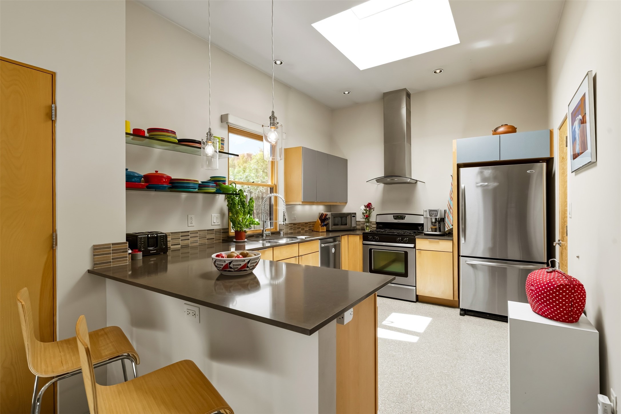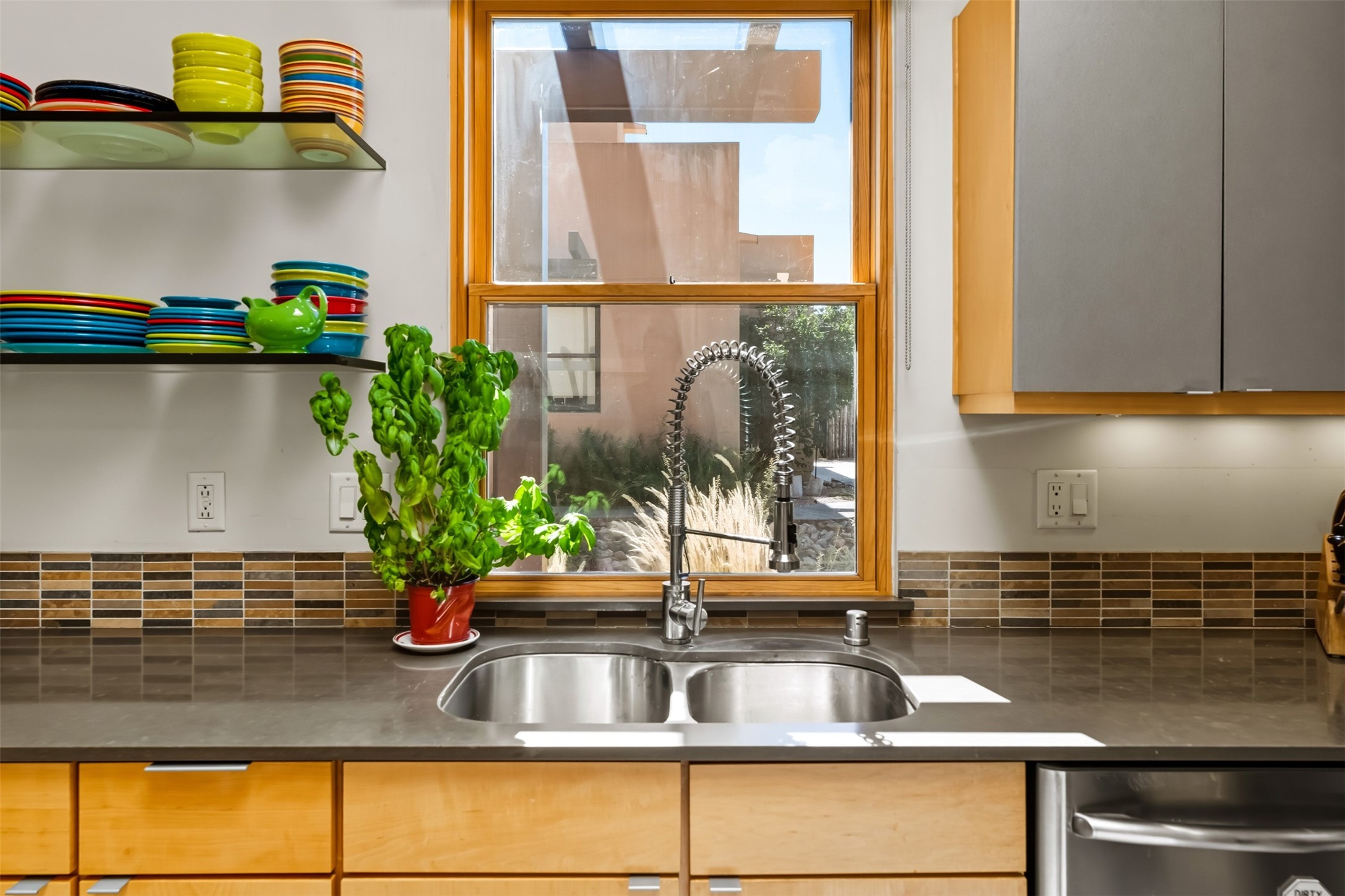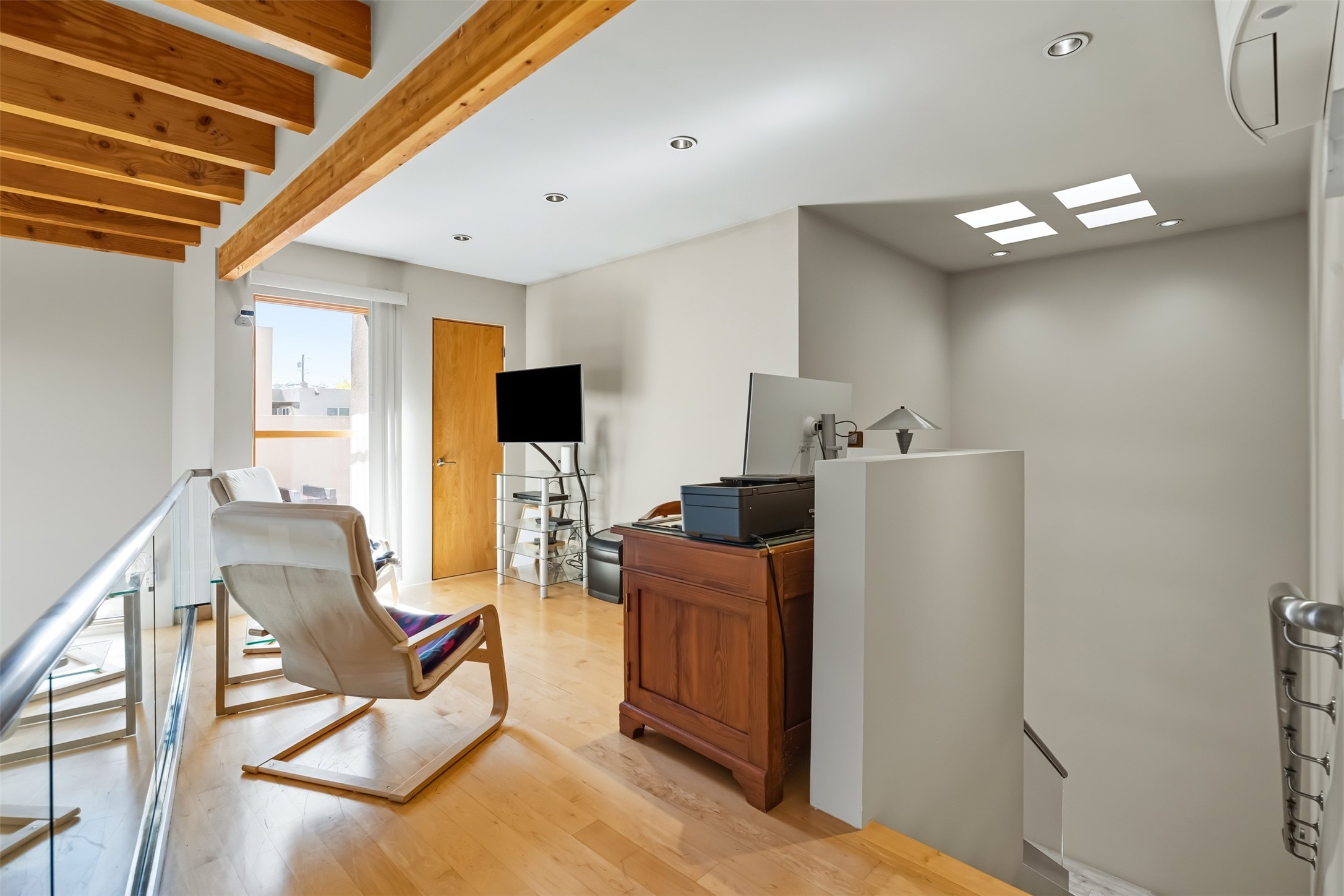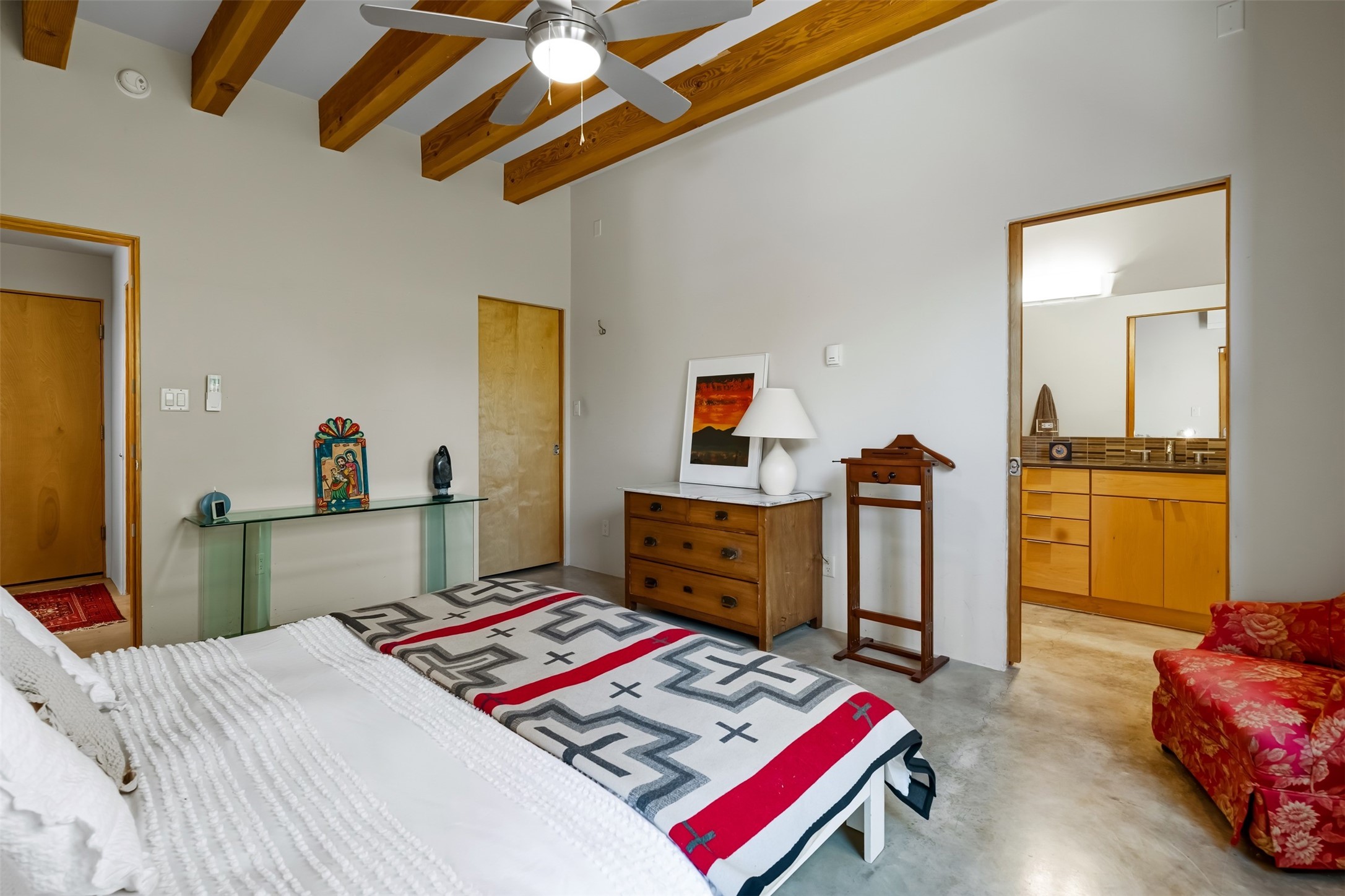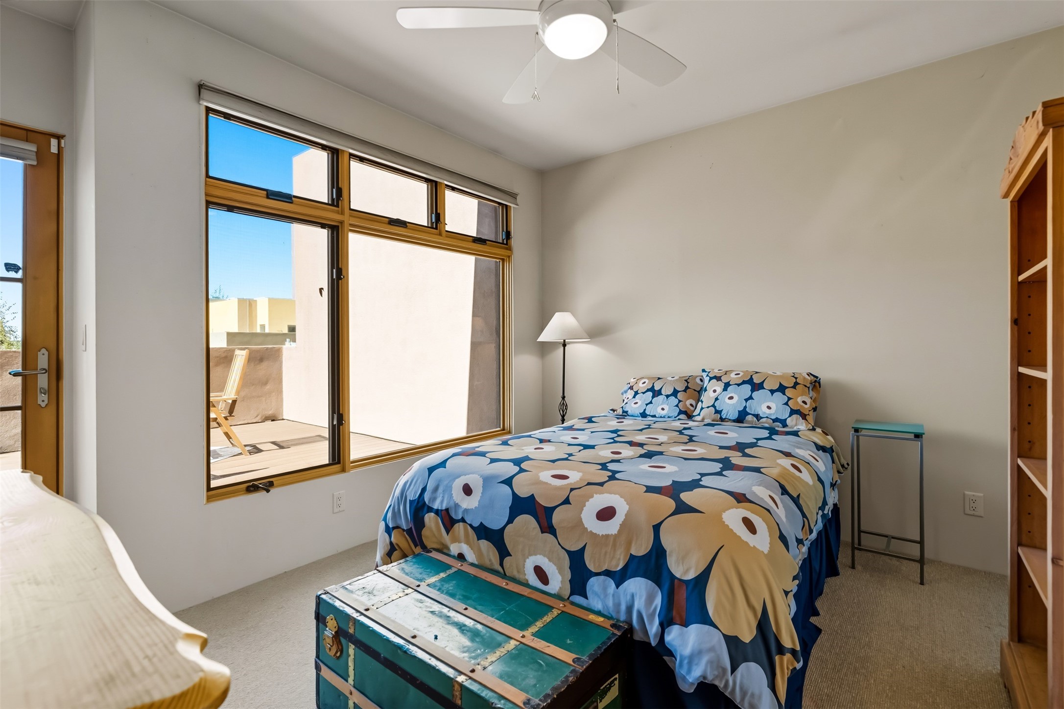 Located on the scenic Santa Fe River Trail, this exceptional townhome features contemporary architecture. Designed to maximize natural light and space, the home offers a serene retreat in one of the city's most desirable in-town locations--just minutes from the vibrant Santa Fe Plaza, Railyard, Famers Market, world-class restaurants, museums, and renowned art galleries. The nearby Solana Center features an organic market, dance studio, restaurants, and brewery. The Bicentennial Park is a short distance away and offers an outdoor pool, shady picnic areas, and tennis courts. Inside, you will find a thoughtfully designed open-concept floor plan. Polished concrete floors in the main level ground the space with a modern aesthetic, with double height ceilings, clerestory windows, and a seamless flow to the rear patio. A fireplace adds warmth and character. The flow from living to dining to kitchen creates an inviting atmosphere perfect for entertaining or relaxing at home. The primary suite on the main level is a peaceful haven featuring a large walk-in closet with custom built-in shelving and an en-suite bathroom. Upstairs, a loft-style bonus area provides flexible living options--ideal for a den, creative studio, or media room. The two upstairs bedrooms each have a private balcony and walk in closets. This home is as comfortable as it is beautiful, with radiant in-floor heating and 5 mini-split units ensuring year-round climate control. The house boast passive and active solar - current owner has no electricity bills due to the owned solar panels. A two-car garage with extra storage space provides plenty of space for outdoor gear and everyday essentials. Whether you're seeking a full-time residence or a low-maintenance Santa Fe getaway, this beautiful townhome delivers a perfect balance of modern design, elegant finishes, and unbeatable location. Here, you're not just buying a home--you're embracing the Santa Fe lifestyle....