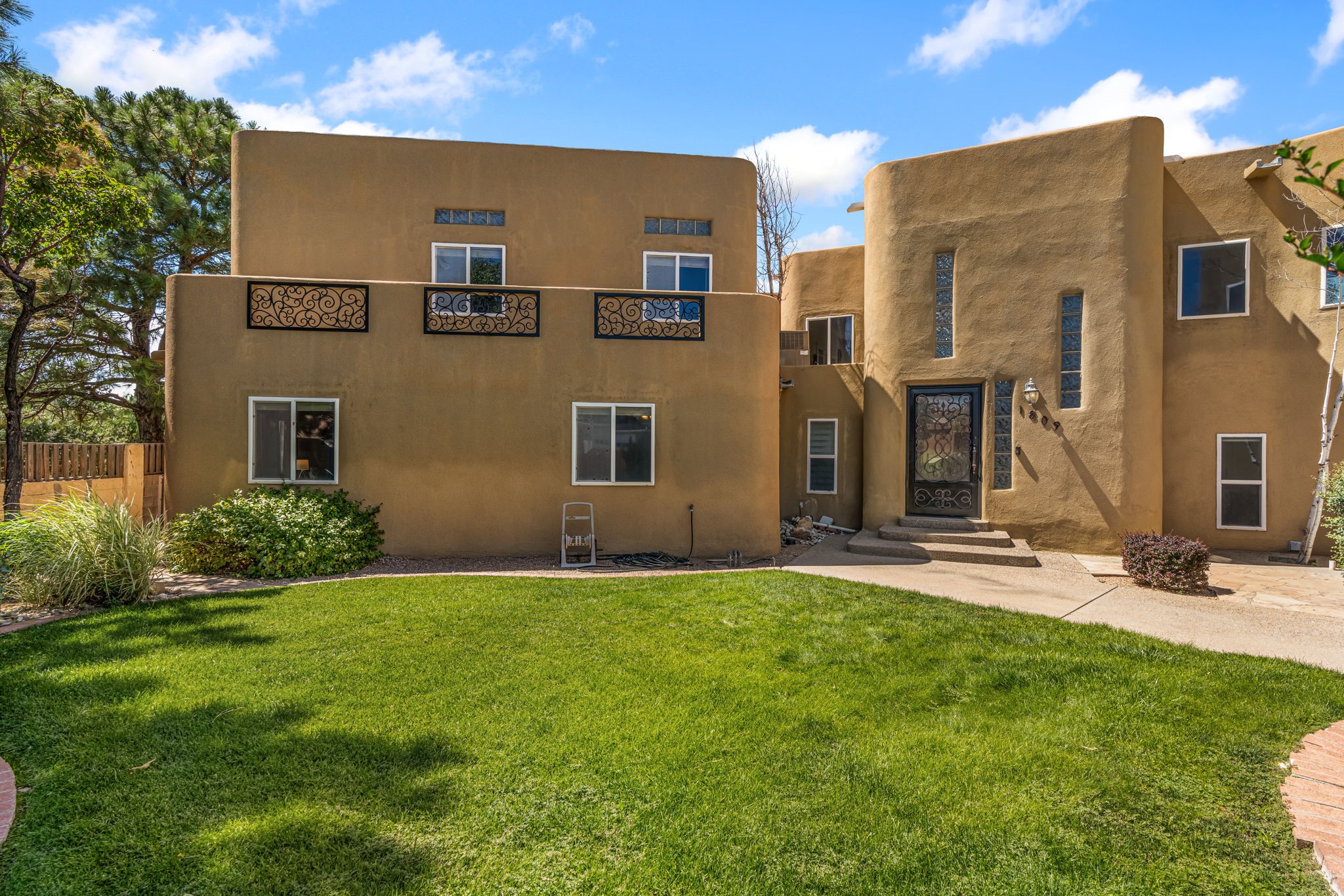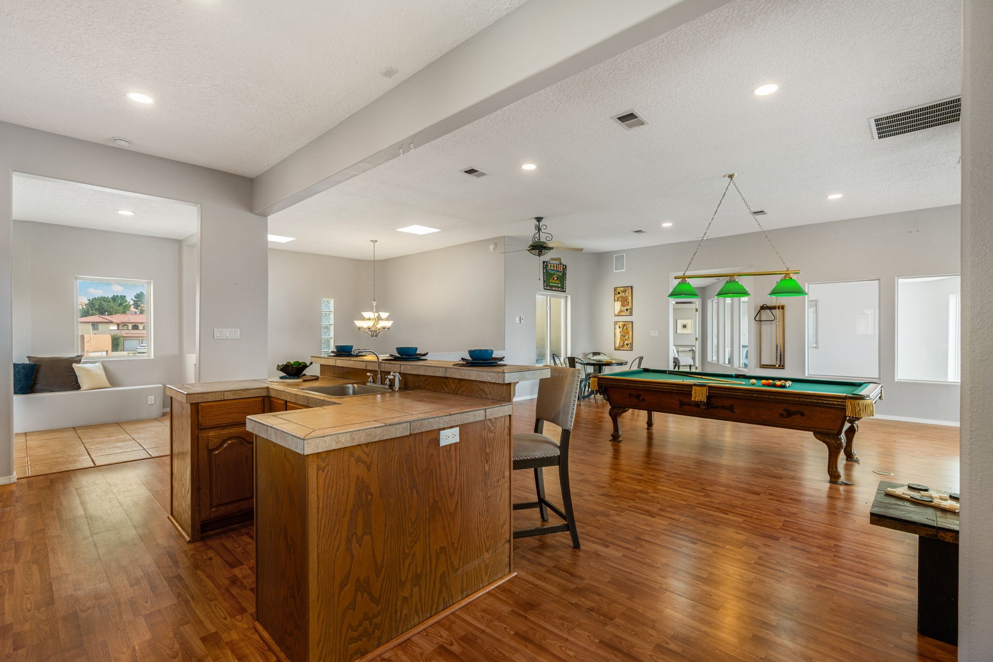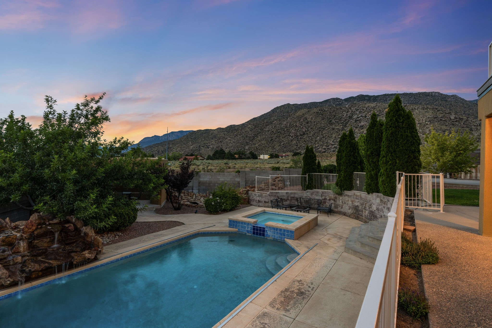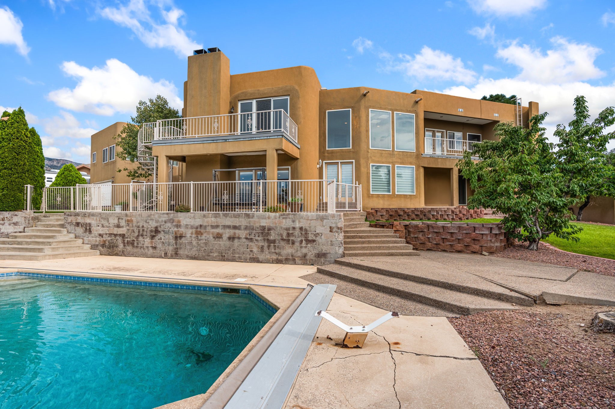 This elegant 1809 Archuleta Dr NE. This expansive 6-bedroom, 4-bath home offers an updated kitchen that blends style and functionality, two primary suites, a spacious upstairs living/game room with a bar, and an inviting atrium. Enjoy a cinematic experience in the private movie theater room, or take advantage of the tandem pull-through garage, which leads to a beautifully landscaped backyard. Nestled next to Embudo Canyon, the property ensures privacy and tranquility. The outdoor space includes an inground pool, outdoor kitchen, fruit trees (peach, cherry, apricot), and grapevines--perfect for both relaxation and entertainment.