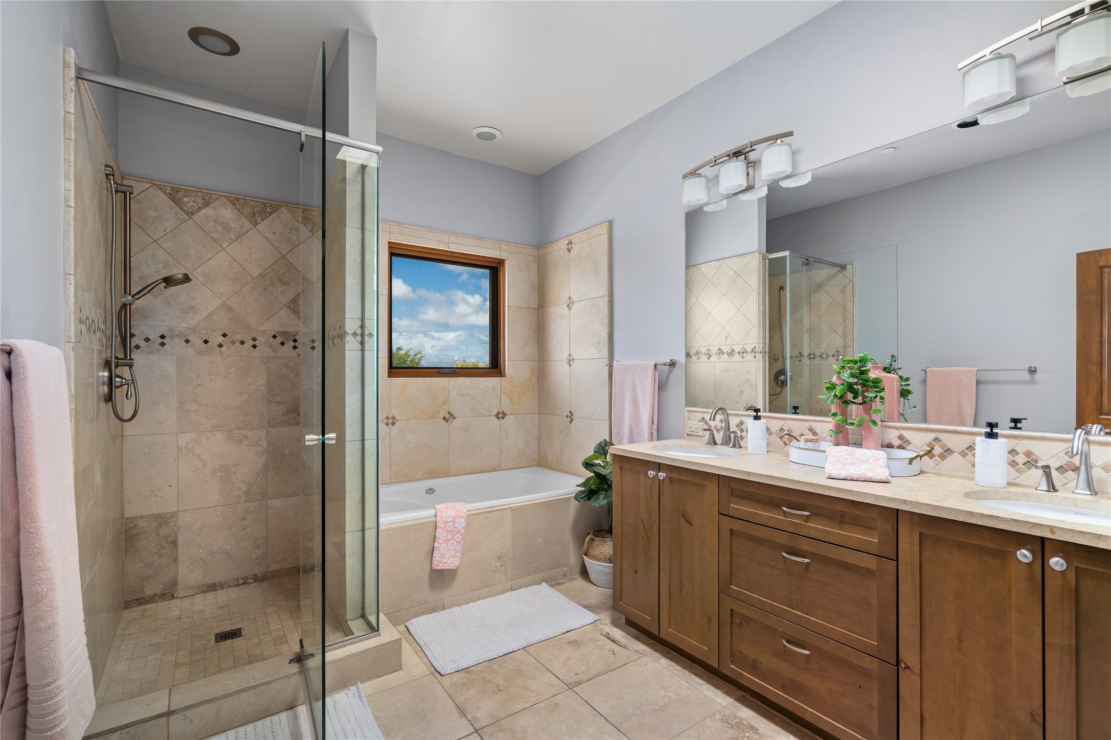 This modern corner-lot property in desirable Oshara Village offers the perfect blend of work and lifestyle flexibility. The ground floor features a spacious gallery/workshop--ideal for an artist, creative professional, or small business--divided into two rooms with expansive windows that flood the space with natural light. Additional highlights include a half-bath, workspace with a sink, durable concrete floors, and a lovely walled courtyard with flagstone, artificial grass, a pergola entertaining area, fountain, and mature landscaping, with direct access to a two-car garage.Upstairs, the light-filled two-bedroom, two-bath residence impresses with soaring ceilings, large windows, and an open floor plan. The chef's kitchen includes abundant workspace, a barstool-friendly island, sleek tile backsplash, and a GE Monogram six-burner cooktop/oven. The living area extends to a delightful outdoor deck, perfect for entertaining or enjoying mountain views. Luxury vinyl plank floors run throughout, creating a warm, modern feel.The spacious primary suite boasts a California Closets walk-in with built-ins, plus a spa-like bathroom with dual sinks, soaking tub, and separate shower. A second upstairs entrance from the back courtyard offers added flexibility--allowing the option to rent one level while living in the other.This unique property is a rare opportunity to combine work and home life in one stylish, functional space--or two separate spaces. Many other adjacent homes have also repurposed the downstairs as living space to provide the ultimate in comfort with multiple living areas. The popular Pantry Dos restaurant is within walking distance, along with an inviting community park and sculpture garden. The Santa Fe Community College with gym and swimming pool is nearby, and Richards and Rabbit Road offer easy access to Cerrillos/Zafarano shopping and the St. Francis Drive shopping area. The Plaza is an easy 15-minute drive.