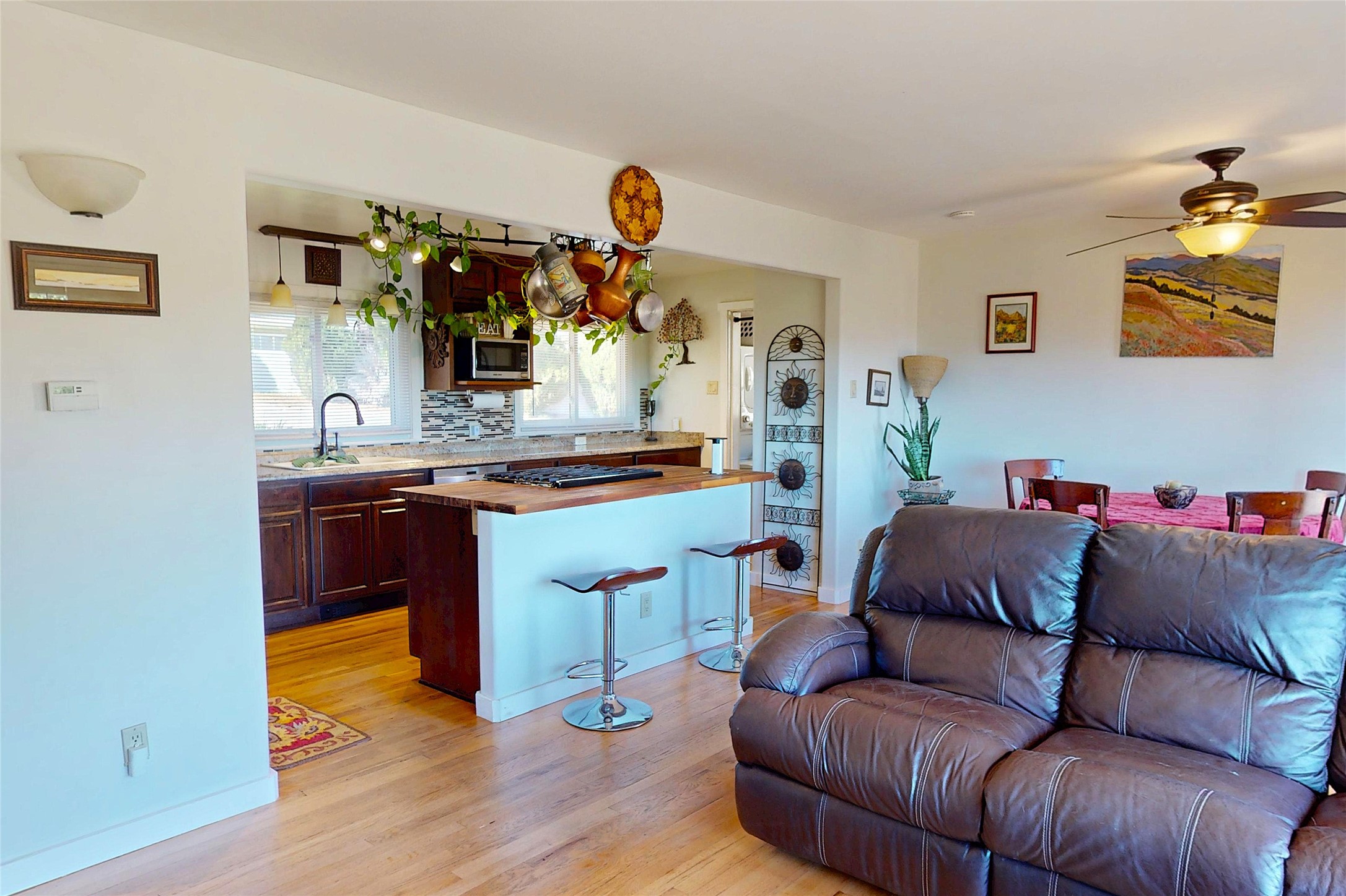 Charming Single-Story with Views and Spacious Backyard! This delightful 3-bedroom, 1-bath home combines comfort, functionality, and scenic beauty. Located near the end of a quiet street, it offers peaceful surroundings and sweeping views of Los Alamos, the mountains, and the mesas. Inside, the open floor plan seamlessly connects the living and dining areas, creating a bright, welcoming space perfect for everyday living or entertaining. The updated kitchen features rich wood cabinetry, walnut butcherblock countertops, modern appliances, and abundant storage--including a pantry and an extra freezer conveniently located just off the kitchen near the laundry. The track lighting in the kitchen provides ambient lighting while undercounter lights brighten work areas and pendent lights provide additional style. Large windows fill the home with natural light and frame stunning views of the surrounding landscape, while beautiful hardwood floors add warmth and character throughout the home. Outside, the expansive lot offers endless opportunities for outdoor living, gardening, and play. The spacious backyard and wooden deck provide the perfect spots to relax, dine al fresco, or take in the breathtaking New Mexico sunrises. A sprinkler and drip system with rain delay keeps the landscaping easy to maintain, and a 30-amp circuit offers power for an RV. With easy access to hiking trails, schools, LANL, and LAMC, this home offers the ideal blend of Los Alamos tranquility and everyday practicality. Schedule your showing today!