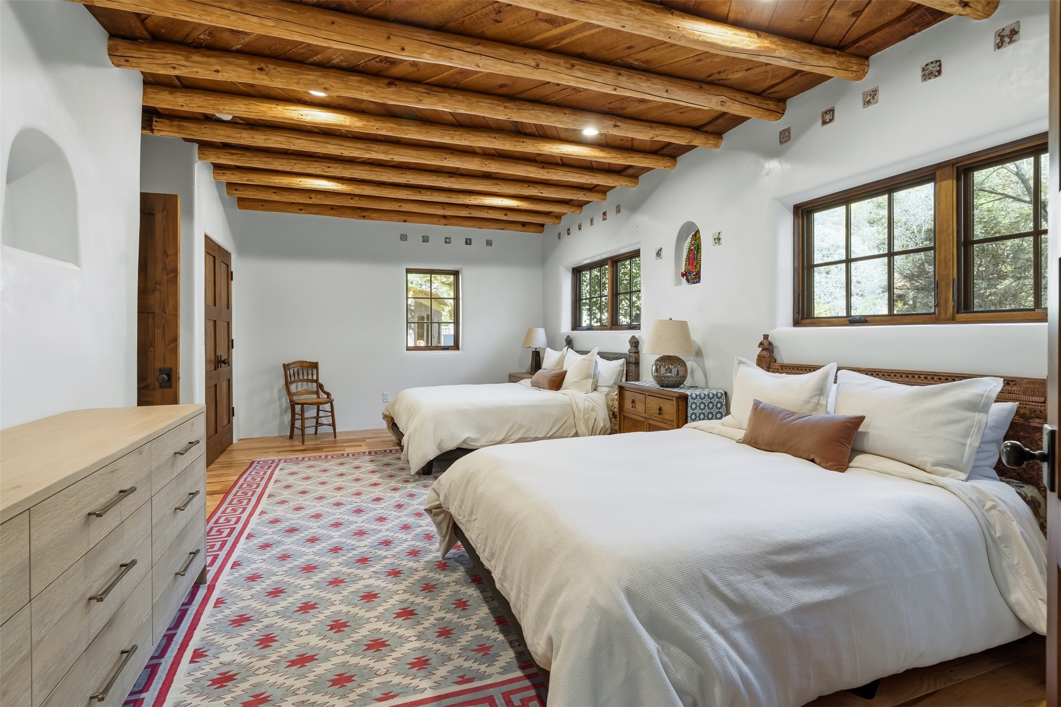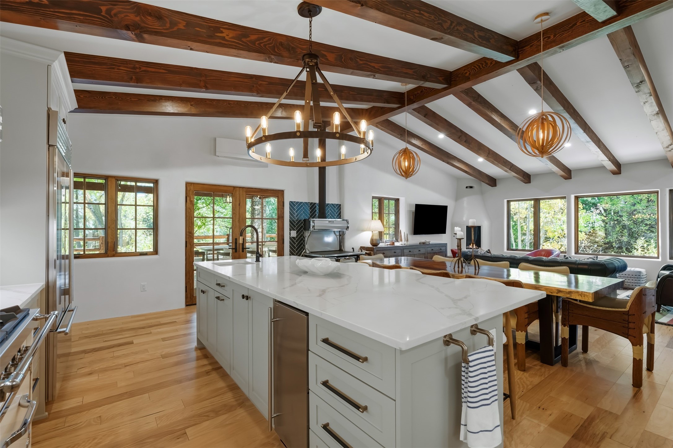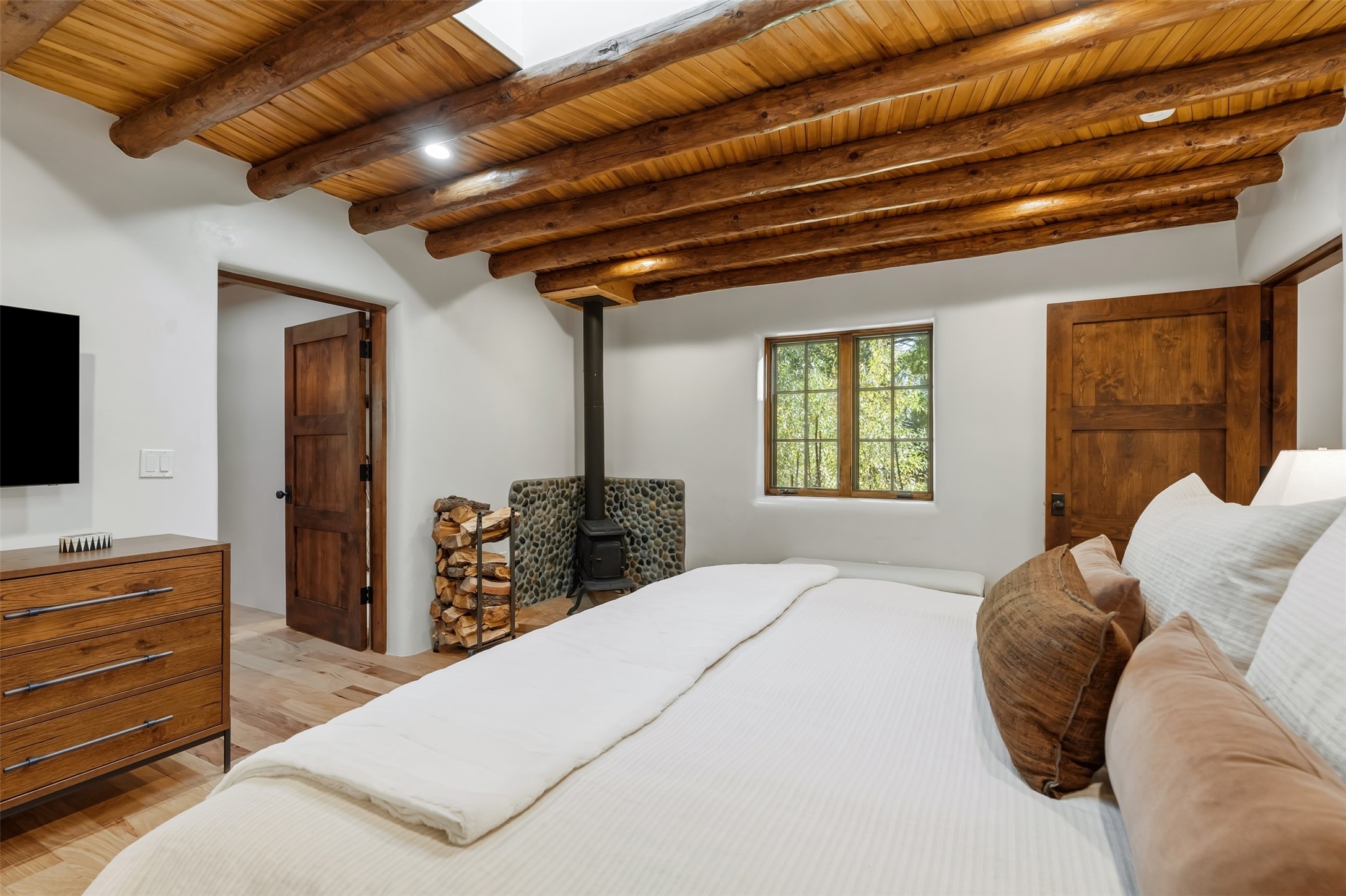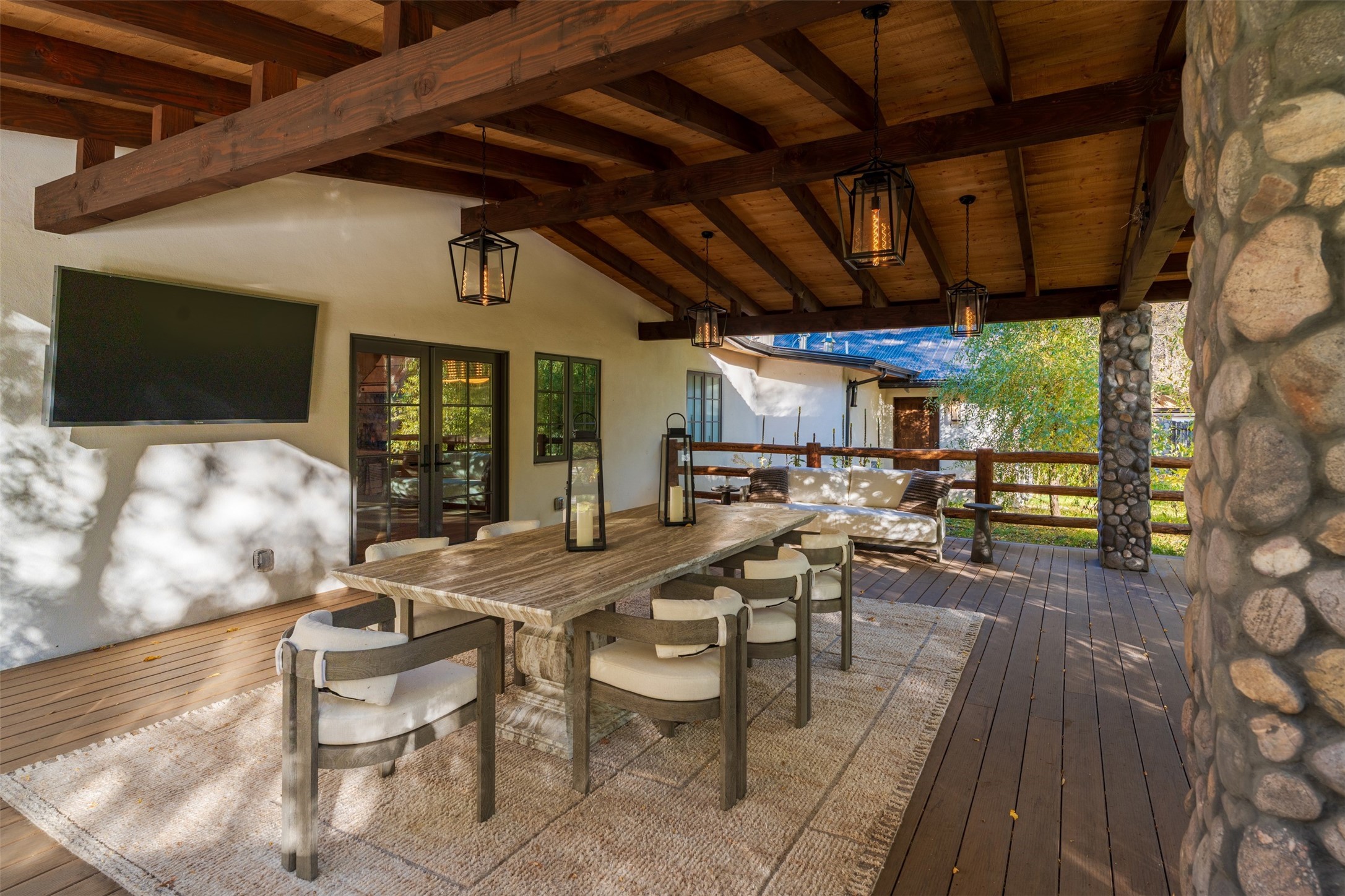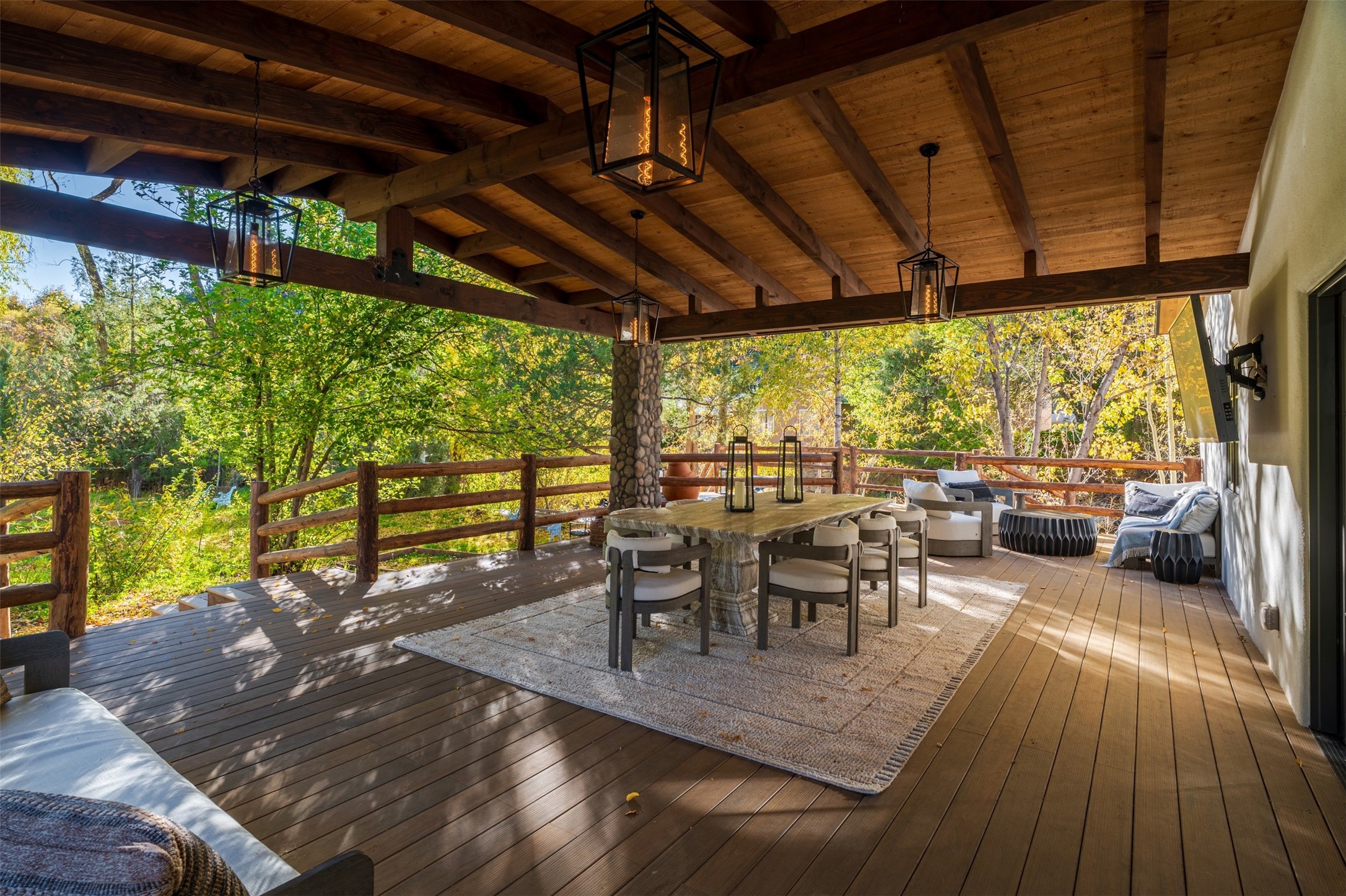 Welcome to 14 The Ledge, a rare offering in the heart of Pecos, NM, where tranquility meets luxury. This exquisite 2,439-square-foot estate is nestled on 5.35 acres of prime Pecos Riverfront, boasting 362 feet of private river access. Perfectly remodeled, this home features three ensuite bedrooms, each offering a private sanctuary for relaxation. The chef's kitchen features a large island, Sub-Zero fridge, under-counter ice maker, and Viking Tuscany range, dishwasher, and hood beautifully accented by smooth plaster walls and artisan tile throughout.Step outside to discover covered outdoor living spaces, complete with a hot tub, ideal for entertaining or unwinding amidst nature. The property is adorned with charming features such as an antique wood stove, gas kiva fireplaces, and a potbelly stove, enhancing its rustic elegance. Recent upgrades include new stucco, a new roof, and new windows, ensuring modern comfort and efficiency.The oversized finished garage provides ample space for vehicles and storage, while the additional outbuildings, make this property horse-friendly. The guest house offers studio potential, making it an artist retreat or writer's haven. A private well and new septic system further enhance the self-sufficiency of this secluded oasis.Located near the Santa Fe National Forest and Lisboa Springs, this property offers unparalleled opportunities for fly-fishing and outdoor adventures. With no HOA restrictions, this estate is perfect for seasonal or full-time living. The option to purchase furnished makes this a turnkey opportunity for discerning buyers.14 The Ledge is more than a home; it is a lifestyle. Whether you seek a peaceful retreat or an active outdoor haven, this property offers the best of Northern New Mexico living. Experience the serenity and beauty of this exceptional estate, where every detail has been thoughtfully curated for the ultimate in comfort and style.
