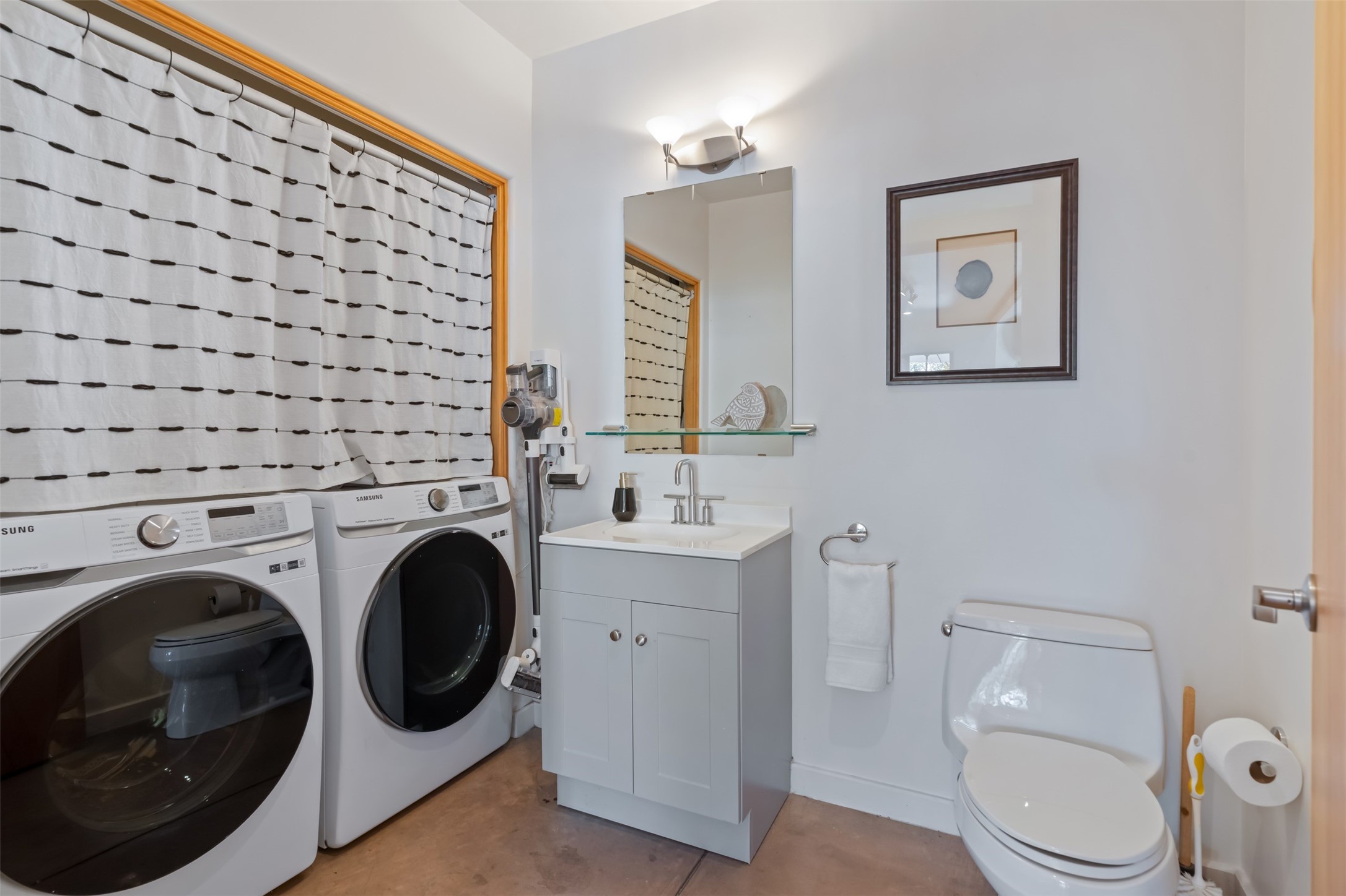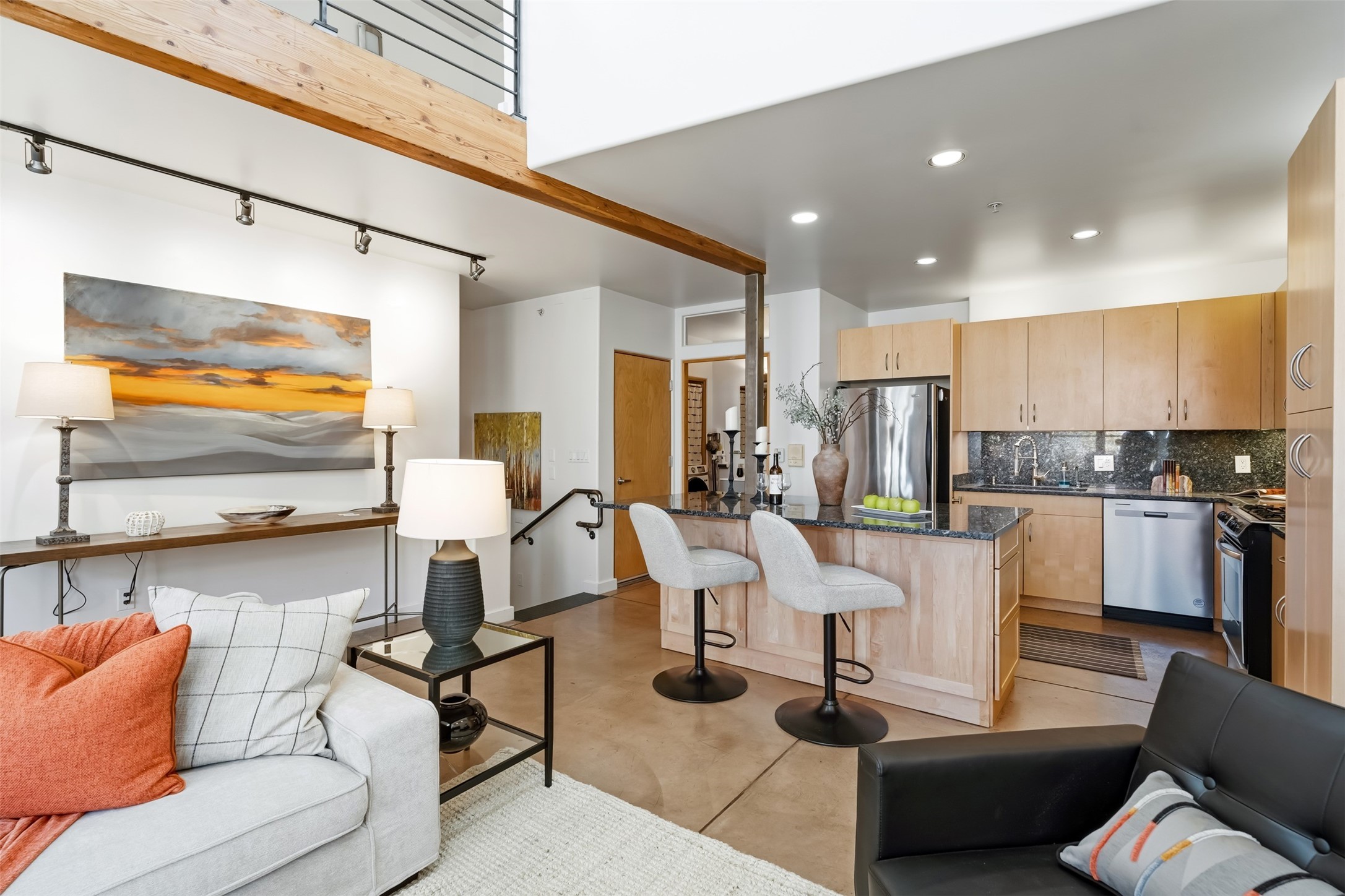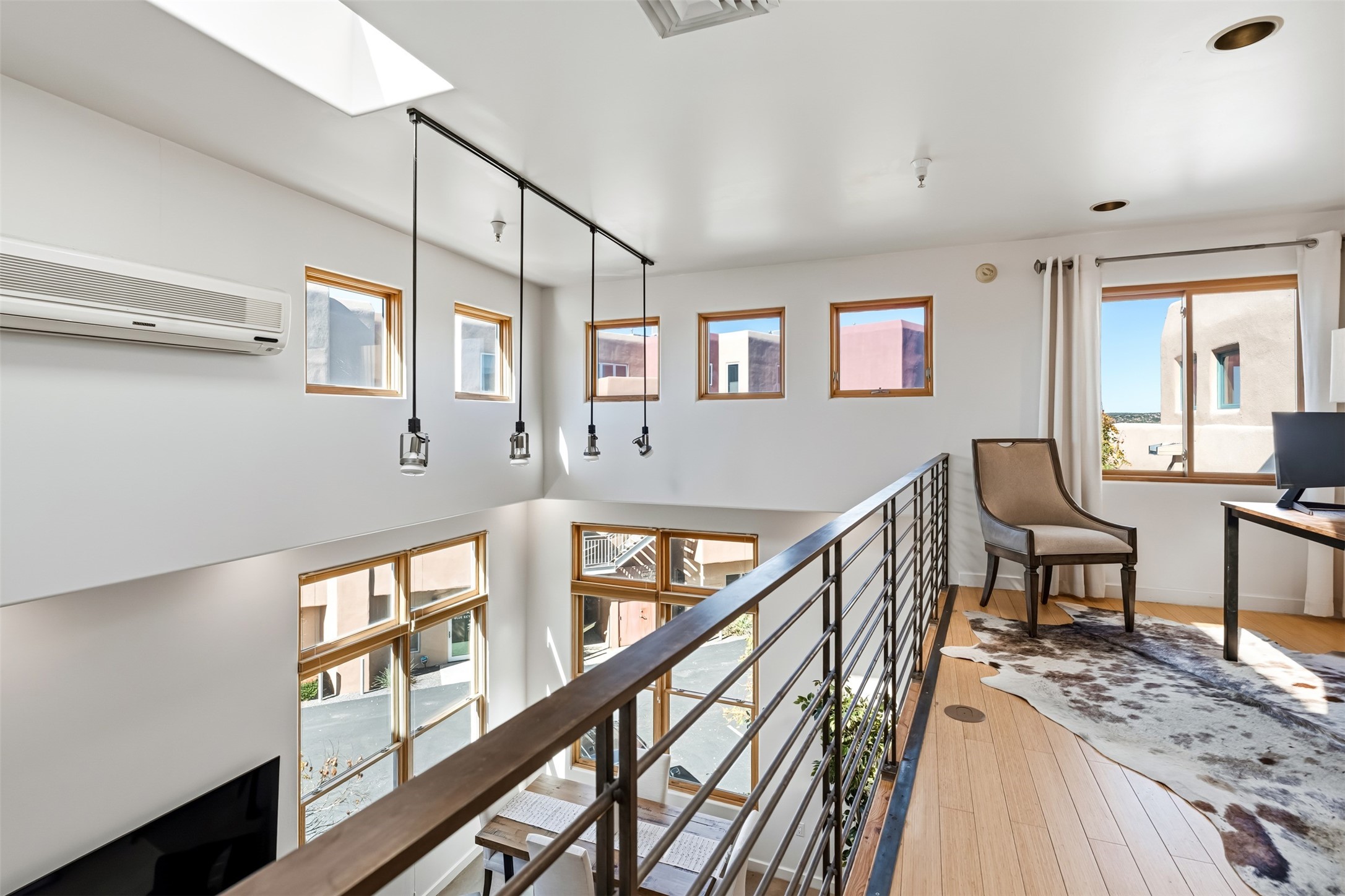 CONTEMPORARY LOFT - Modern live/work 1,400 sq. ft in Marquez Place1 BR -enclosed + 1 work space loft -open with high ceilings, great natural light. Features include Maple cabinets, Stainless kitchen appliances with marble counters and a 7' island, concrete and bamboo floors. 2nd Floor balcony with southwest views. Radiant heat (new furnace), Mini-split A/C, skylights, and efficient windows. HOA covers exterior and roof; landscaped grounds include a dog park. Prime central location near Plaza, shops, galleries and restaurants.