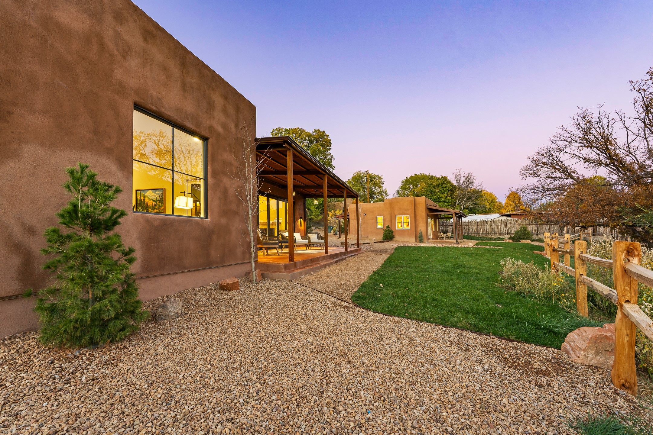 Contemporary Elegance Above the Santa Fe River Nature Preserve. Perched above the Santa Fe River Nature Preserve, with breathtaking views of Picacho Peak, this brand-new, all-single-level 2025 contemporary residence is a masterful blend of architecture, nature, and modern comfort--just minutes from Canyon Road, The Teahouse, and downtown Santa Fe.Designed for effortless living and entertaining, the main residence offers three bedrooms and two baths, an open-concept living space with soaring ceilings, wood flooring, a sleek gas fireplace with a built-in banco, and a wall of glass articulating doors that frame Picacho Peak and the surrounding foothills, inviting the outdoors in with seamless flow onto the southeast-facing, view-filled portal--perfect for entertaining or quiet moments of reflection. The open, well-designed chef's kitchen features Nocturne quartz countertops, soft-hued cabinetry, and stainless-steel appliances.Set on over half an acre, the landscaped property features lush green grass framed by a graceful grove of native oak trees and is graced by the historic Acequia, its gentle spring-fed waters flowing near the primary suite. The spa-like primary bath offers a freestanding soaking tub and a separate walk-in shower, creating a serene retreat inspired by nature.A TPO roof and two-car garage speak to both form and function, while mindful touches--fire suppression system, drip irrigation, and central air conditioning--ensure lasting peace of mind. The detached one-bedroom, one-bath casita with a full kitchen provides the ideal retreat for guests, an art studio, an office, or a rental opportunity.All a five-minute drive from Canyon Road and moments from the Dale Ball Trails, the Beaver Pond, and the Audubon, this location offers endless opportunities to connect with Santa Fe's natural beauty and culture--an inspired sanctuary for those who live beautifully.