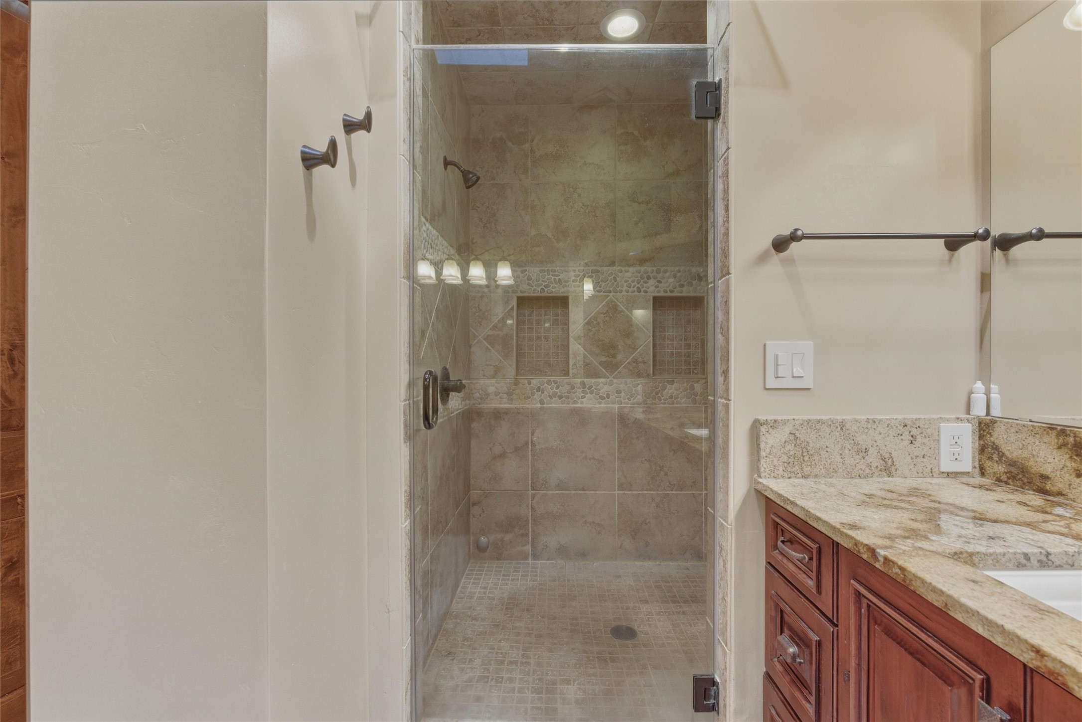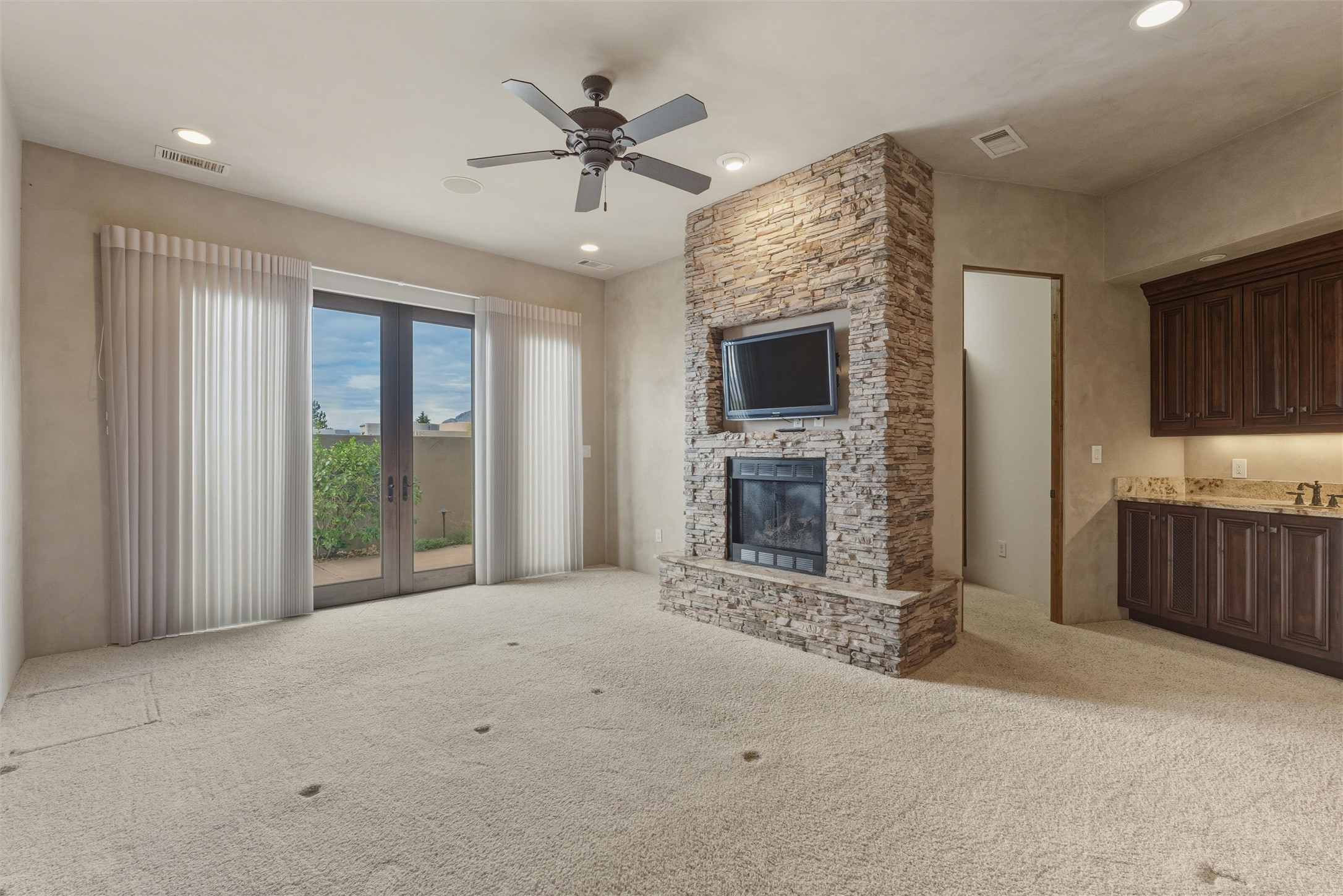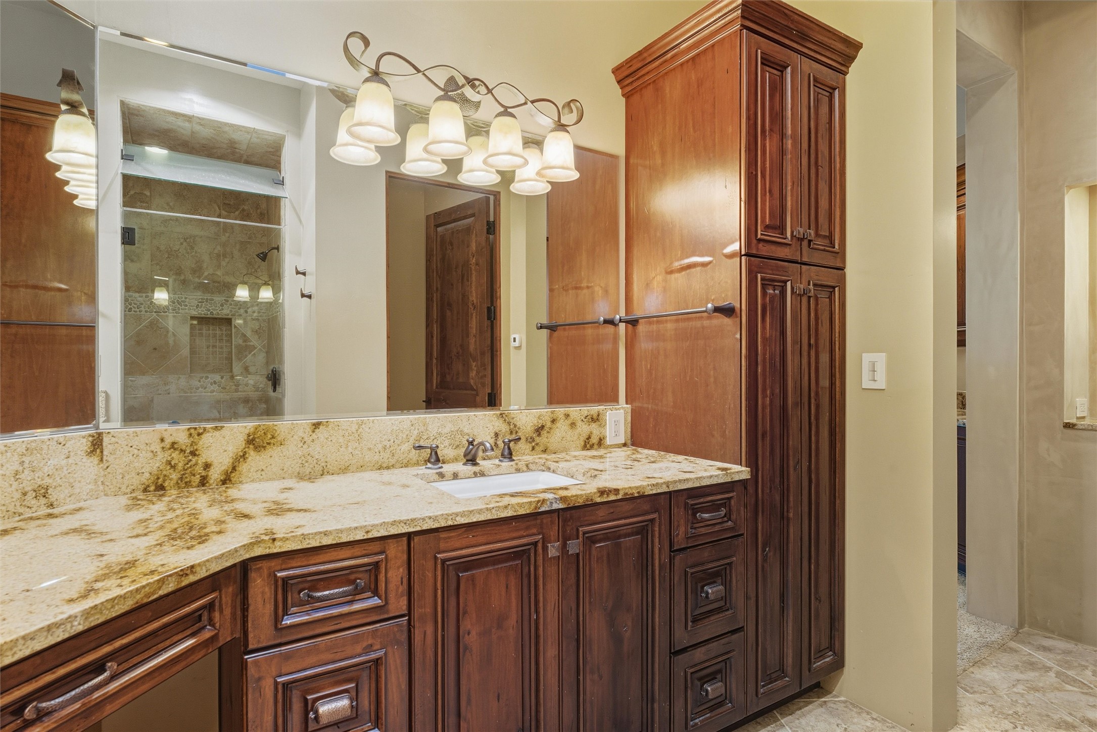 Discover a rare custom masterpiece at The Legends, where luxury and tranquility meet. This artfully designed home offers seamless indoor-outdoor living, highlighted by a chef's kitchen w/ all SS applainces & Sub-Zero wine storage, elegant great room for entertaining, and a spa-inspired primary suite with fireplace, steam shower & private patio. Enjoy alfresco evenings by the waterfall and outdoor fireplace. Private 2nd primary bedroom, potential basement wine cellar & gated privacy on a serene cul-de-sac make this residence an ultimate retreat for refined living near the Sandia Mountains. The owned solar system, full finished basement and privacy in this quiet High Desert community welcomes you home to serenity and peace. One owner has maintained this custom built and updated property.