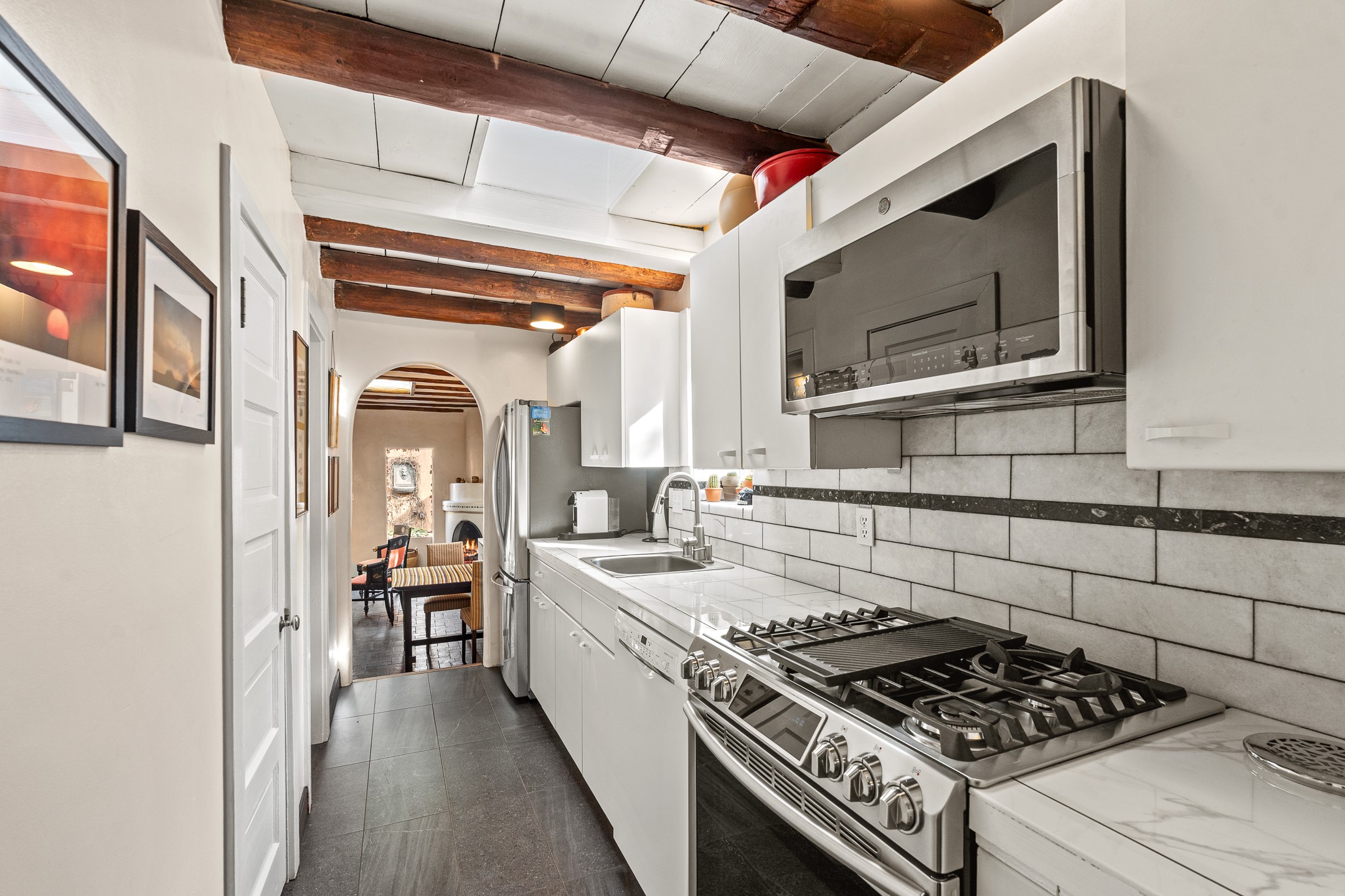 Exuding the timeless character of original Santa Fe style, this light-filled 1-bedroom, 1-bath adobe is perfectly positioned on picturesque Arroyo Tenorio--just around the corner from Kaune's, the Plaza, and your morning coffee at Downtown Subscription. The ideal Santa Fe pied--terre, lock-and-leave retreat, or turnkey rental.Showcasing the warmth of classic Territorial adobe architecture, the inviting living room features a wood-burning kiva fireplace, vigas, plaster walls, and tile floors that beautifully reflect the home's authentic character. Sunlight streams through the space, creating a bright and welcoming ambiance. A private outdoor patio extends the living area and offers a sunny, tranquil setting for morning coffee or evening gatherings--complete with its own kiva fireplace for year-round enjoyment. The cozy bedroom offers a peaceful retreat, while the sweet, efficient kitchen blends charm with functionality--perfect for preparing a quiet breakfast or hosting friends. Comfort is ensured with two mini-split systems providing efficient heating and cooling.Beautifully located, beautifully styled, and effortlessly livable--this enchanting home places you just steps from Santa Fe's finest dining, boutiques, galleries, and cultural landmarks. A rare opportunity to own a turnkey treasure in one of the city's most beloved and walkable neighborhoods.