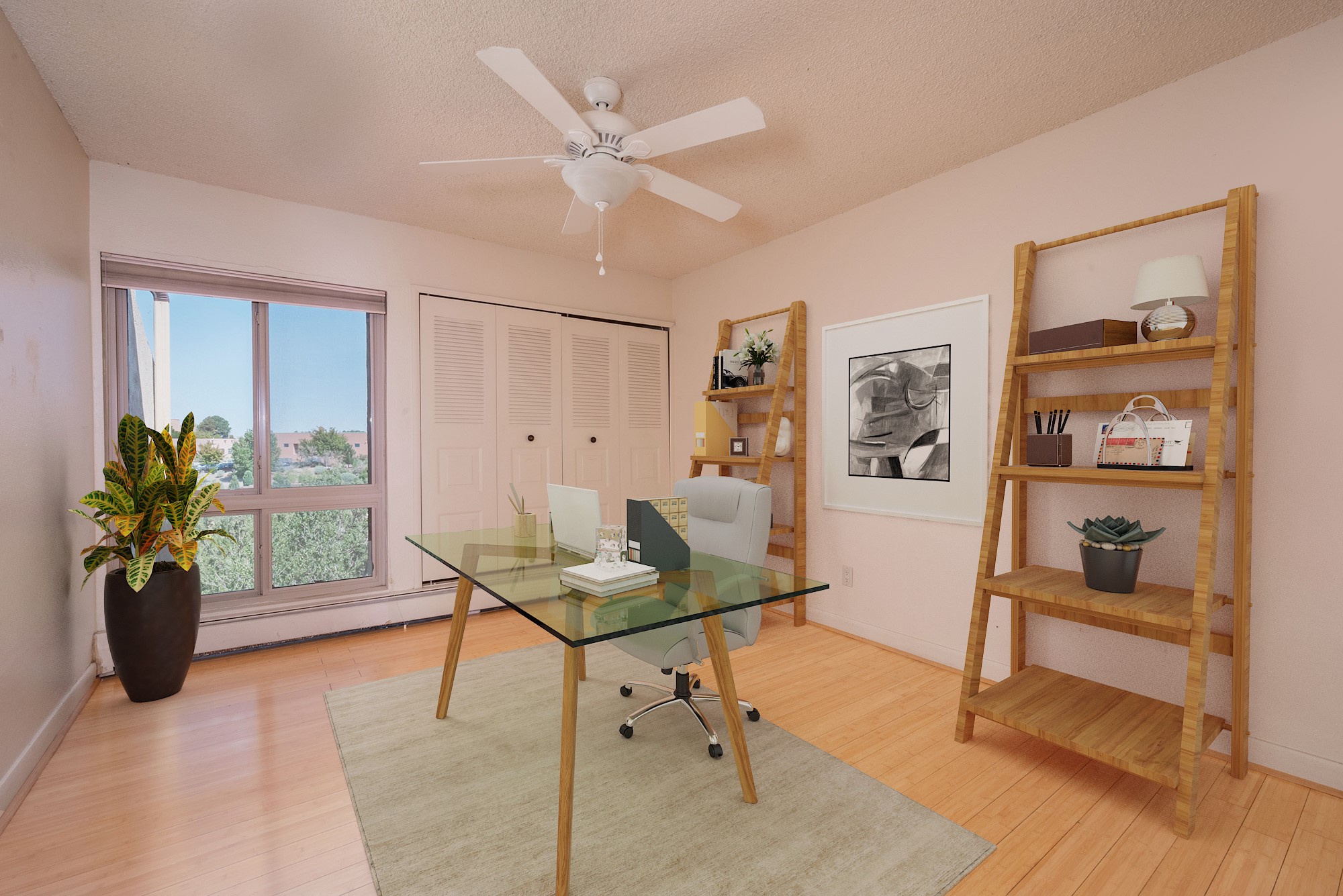 Where else can you find two bedrooms with access to a pool, sauna, and gym at this affordable price on the East side of St. Francis? Coming home begins at the beautiful garden path from the parking lot to the breezeway. This cute unit is a second-floor walk-up with a tree-shaded deck overlooking the arroyo and a cozy fireplace for winter vibes. Los Arroyos is a wonderful community with beautiful grounds surrounded by million-dollar homes. Amenities include hot water baseboard heat, water, indoor pool, sauna, gym, lawn, BBQ area, tennis court, basketball hoops, walking trails and community room and more included in a reasonable condo association fee. This is also a rare complex that doesn't limit your number of small pets to two - a big win if your fur family is larger. If you've given up finding a sweet, affordable place in Santa Fe, come see this lovely home and community and put yourself at ease.
