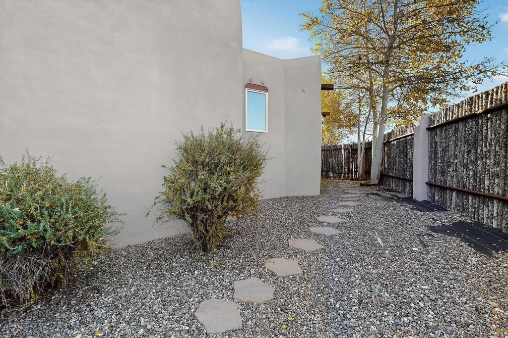 Don't miss this charming single-level home in Pueblos del Sol featuring three bedrooms and two bathrooms. This residence showcases classic Santa Fe details such as Vigas and a cozy Kiva fireplace. Lots of natural light streaming in from five skylights throughout the home. The open floor plan provides great flow and comfortable bedroom separation, while the spacious deck with a solid portal--accessible from both the living room and primary bedroom--offers the perfect place to relax and enjoy the beautiful mountain views. York Central air conditioning and a two-car garage complete this wonderful Santa Fe home. Additionally, the raised subfloor design allows for easy access to plumbing for repairs or modifications. Situated on a large, beautifully landscaped corner lot with native plants and an apricot tree, the property backs onto a greenbelt for added privacy. Recent updates include a finished garage with a new door (2016), a new TPO roof (2021), new coyote and dog-eared fencing (2021), stucco patched and stained (2025), a new hot water heater (2025), a new sump pump (2023), and a new tankless water heater (2025). We invite you to come take a look at this wonderful property.