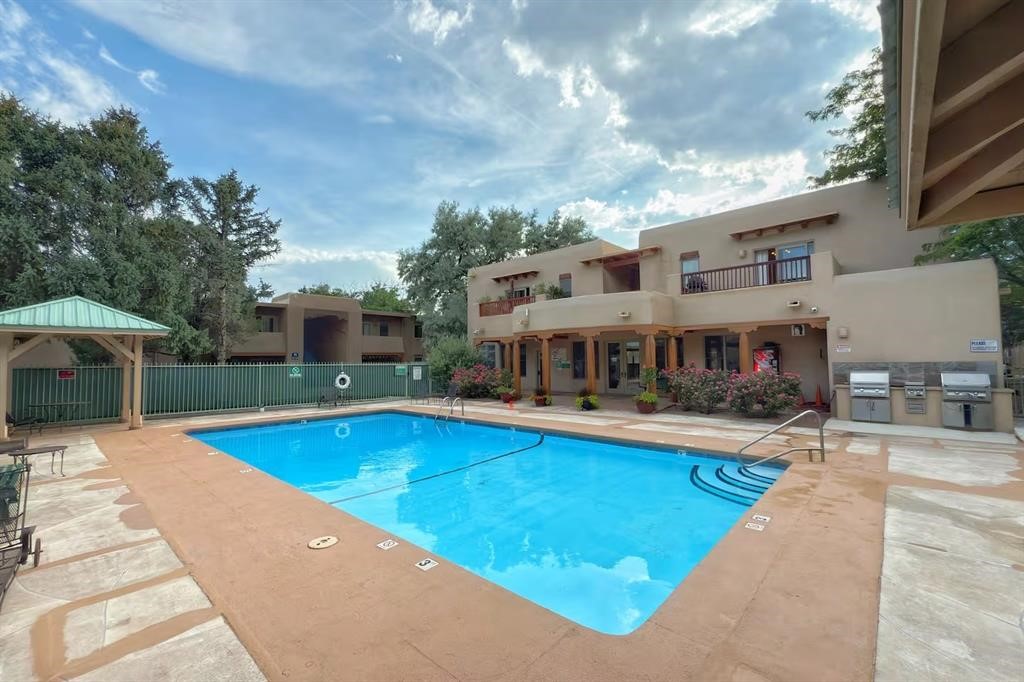 Tucked into one of the community's most desirable lanes, this rare and **oversized townhouse** delivers an effortless blend of style, comfort, and Santa Fe living. These are upgraded units from the standard sized Townhouse.Offering 2 bedrooms and 2 baths, the flexible floorplan is designed for easy everyday living with room to entertain.The main level features an open kitchen, dining, and oversized living space anchored by a welcoming gas fireplace. Glass doors lead to a private garden courtyard--your own outdoor retreat for quiet mornings, alfresco dinners, or relaxed evenings with friends.Upstairs, the primary suite includes an **oversized bedroom**, and **oversized walk-in closet**, full bath, and a balcony perfect for savoring the day's last light. The second bedroom offers its own ensuite bath and eastern views. High ceilings, vigas, Pella windows, and stainless steel appliances bring classic Santa Fe character to the modern layout.The community rounds out the experience with thoughtful amenities: a clubhouse, fitness center, and seasonal pool surrounded by beautifully maintained grounds, lush landscaping, and open green space.Step outside and you're moments from neighborhood favorites--Iconik Coffee, Backroads Pizza, Midtown Bistro, Chocolate Maven, Anytime Fitness, and more. Prefer the outdoors? The Santa Fe Rail Trail sits just half a mile away, ideal for biking, running, or a leisurely stroll.Practical perks include strong cell service, optional carport rentals, and a lock-and-leave lifestyle that suits first-time buyers, downsizers, or anyone seeking a comfortable Santa Fe home base.This isn't just a townhouse--it's a vibrant, convenient, easygoing way of life.