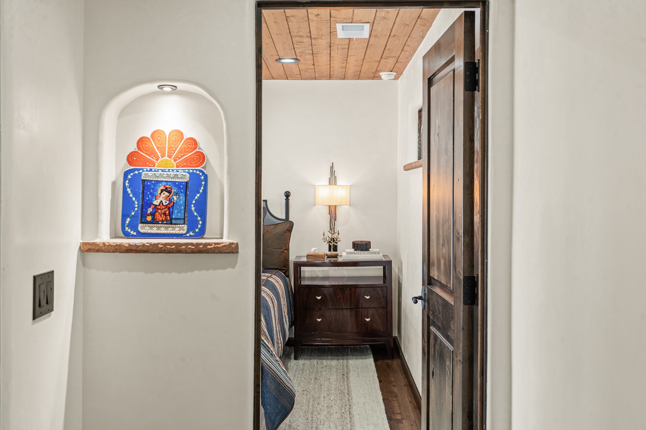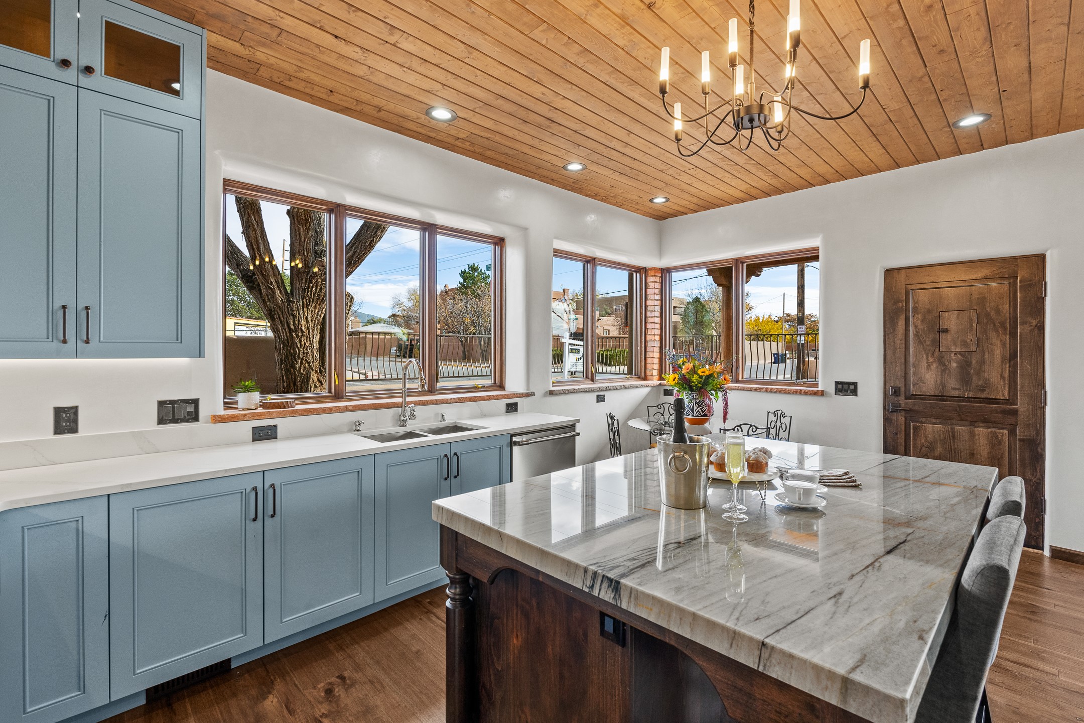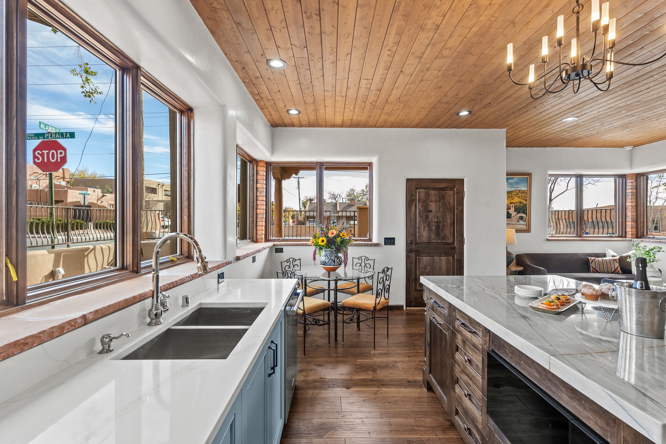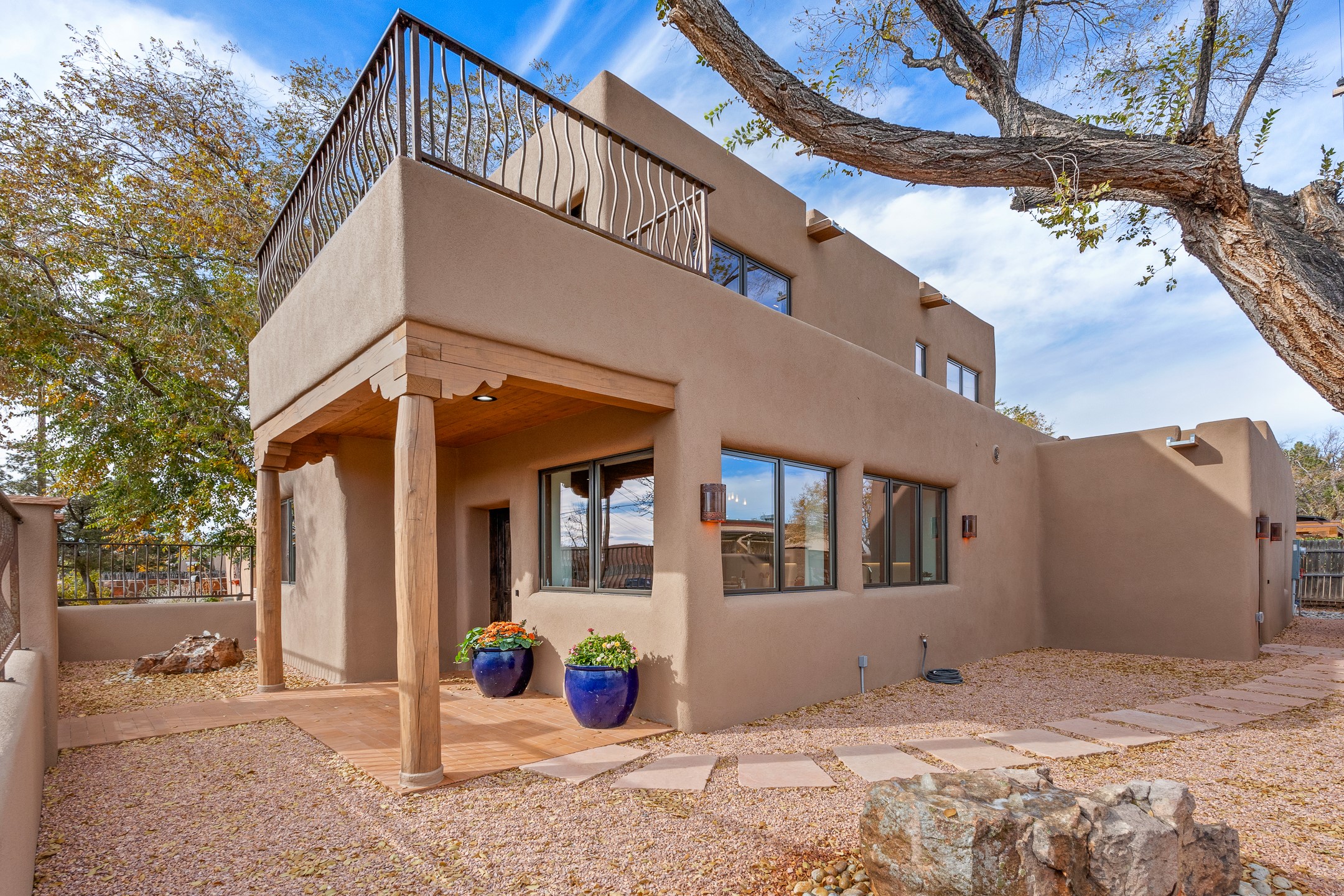 Timeless Santa Fe Charm Just Steps from the Railyard. Nestled in one of Santa Fe's most coveted locations, this beautifully restored adobe offers a rare blend of historic charm and modern luxury--just steps from the vibrant Railyard District and a short walk to the Plaza and Canyon Road. Originally constructed in the early 1900s, this 3-bedroom residence is complete with an attached studio or 4th bedroom that has been meticulously renovated to preserve its authentic character. Original vigas, flawless diamond plaster walls, arched entryways, and tongue-and-groove ceilings with recessed lighting create a warm, light-filled ambiance on a desirable corner lot. The home features two spacious primary suites--one on each level--offering flexibility and privacy. Entire second floor is dedicated to a primary suite with spa like bathroom with views of the Sangre De Cristo Mountains, an extra large closet and oversized suite with roof top access and dry bar with wine fridge. The attached studio, on the main level has its own private entrance, which is perfect for guests, extended family, or a dedicated creative space. The open-concept kitchen is a true showpiece, featuring new stainless steel appliances, a custom hood, hand-painted tile backsplash, and a stunning mix of Cambria and Quartzite countertops. Custom cabinetry, artistic lighting of hand forged steel and alabaster fixtures add a refined touch throughout. Nearly every room includes an ensuite bath with marble or quartzite countertops, premium Kohler plumbing fixtures, and exceptional craftsmanship in the tile showers. Rich, hand-scraped hickory wood floors flow seamlessly throughout, completing this designer-inspired remodel where no detail was overlooked. A rare opportunity to own a timeless Santa Fe treasure--just moments from world-class restaurants, galleries, and boutique shopping Santa Fe has to offer. The house appears to be permit eligible for an STR permit subject to change should someone new apply.