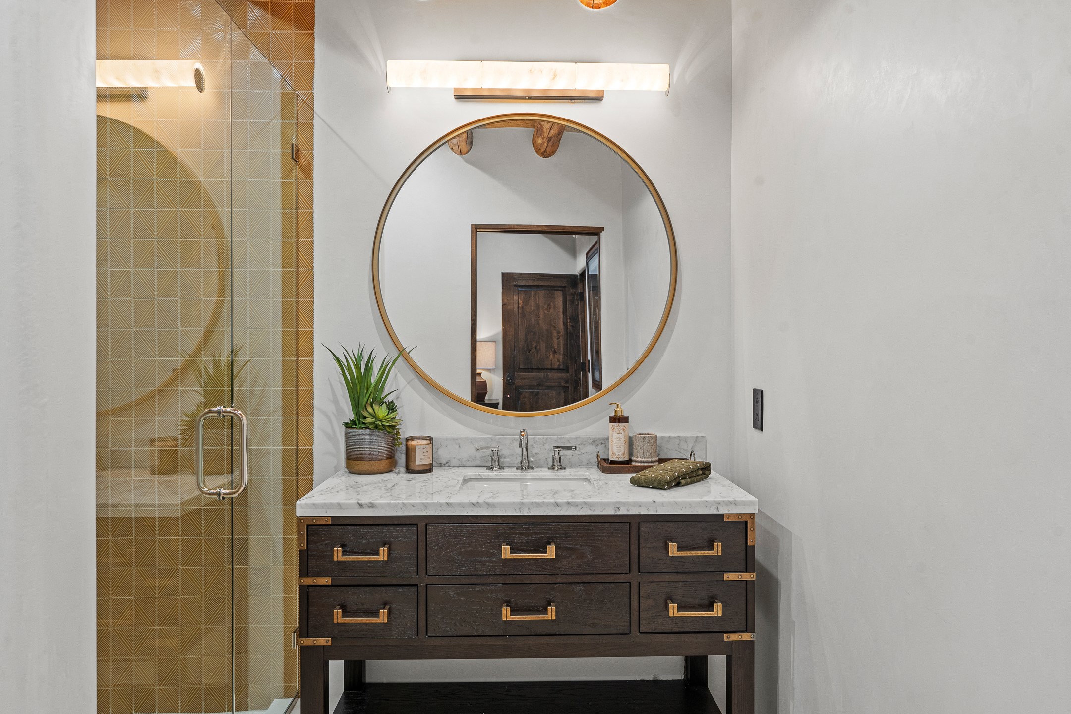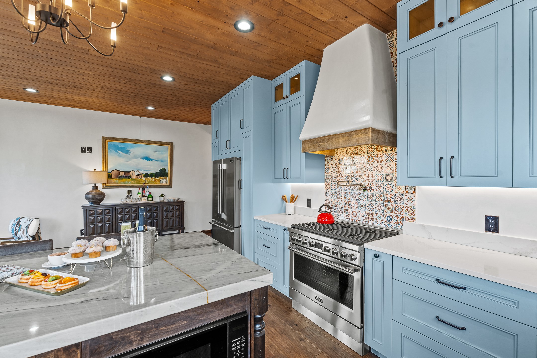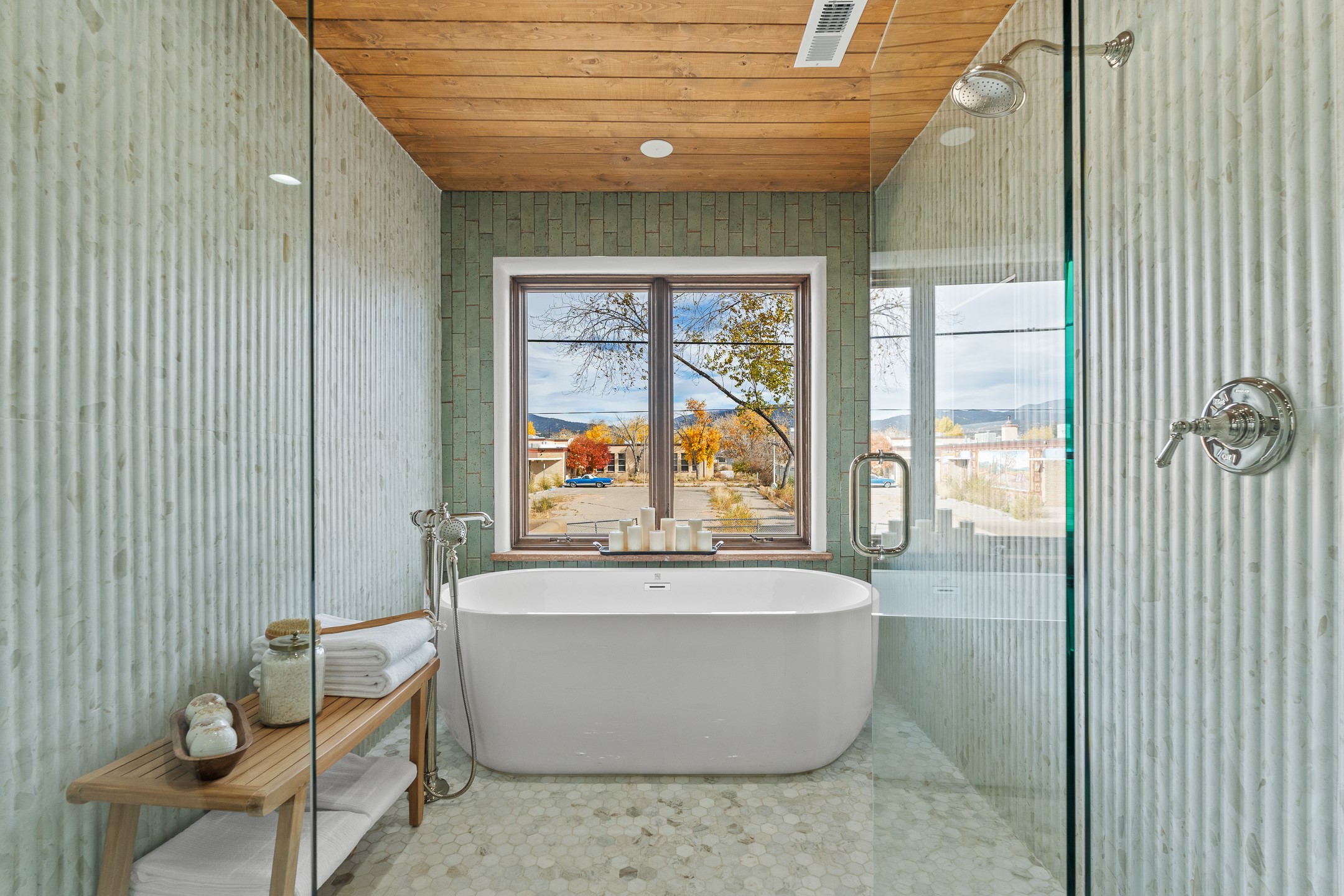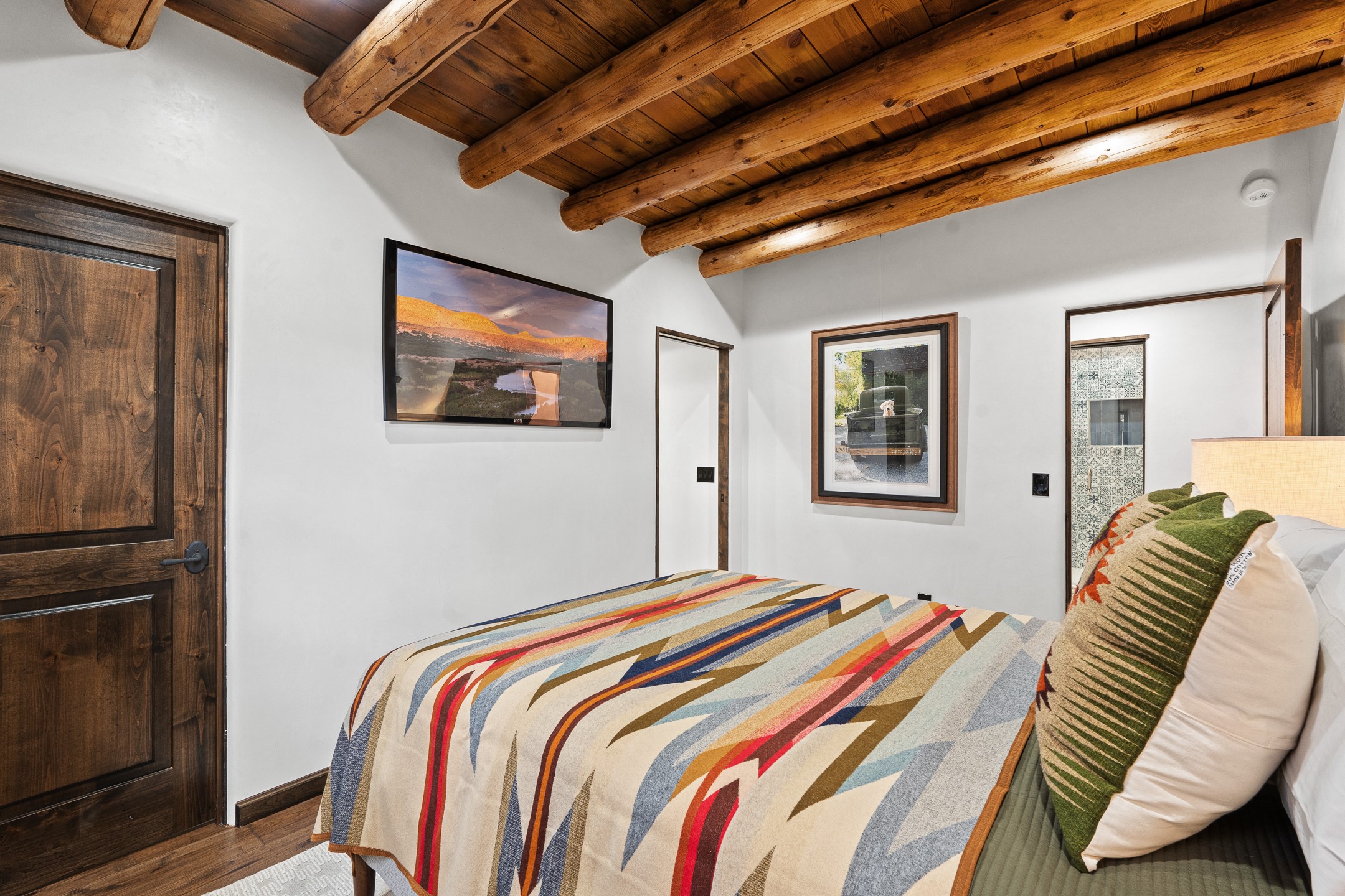 Timeless Santa Fe Charm Just Steps from the Railyard. Nestled in one of Santa Fe's most coveted locations, this beautifully restored adobe offers a rare blend of historic charm and modern luxury--just steps from the vibrant Railyard District and a short walk to the Plaza and Canyon Road. Originally constructed in the early 1900s, this 3-bedroom residence is complete with an attached studio or 4th bedroom that has been meticulously renovated to preserve its authentic character. Original vigas, flawless diamond plaster walls, arched entryways, and tongue-and-groove ceilings with recessed lighting create a warm, light-filled ambiance on a desirable corner lot. The home features two spacious primary suites--one on each level--offering flexibility and privacy. Entire second floor is dedicated to a primary suite with spa like bathroom with views of the Sangre De Cristo Mountains, an extra large closet and oversized suite with roof top access and dry bar with wine fridge. The attached studio, on the main level has its own private entrance, which is perfect for guests, extended family, or a dedicated creative space. The open-concept kitchen is a true showpiece, featuring new stainless steel appliances, a custom hood, hand-painted tile backsplash, and a stunning mix of Cambria and Quartzite countertops. Custom cabinetry, artistic lighting of hand forged steel and alabaster fixtures add a refined touch throughout. Nearly every room includes an ensuite bath with marble or quartzite countertops, premium Kohler plumbing fixtures, and exceptional craftsmanship in the tile showers. Rich, hand-scraped hickory wood floors flow seamlessly throughout, completing this designer-inspired remodel where no detail was overlooked. A rare opportunity to own a timeless Santa Fe treasure--just moments from world-class restaurants, galleries, and boutique shopping Santa Fe has to offer. The house appears to be permit eligible for an STR permit subject to change should someone new apply.