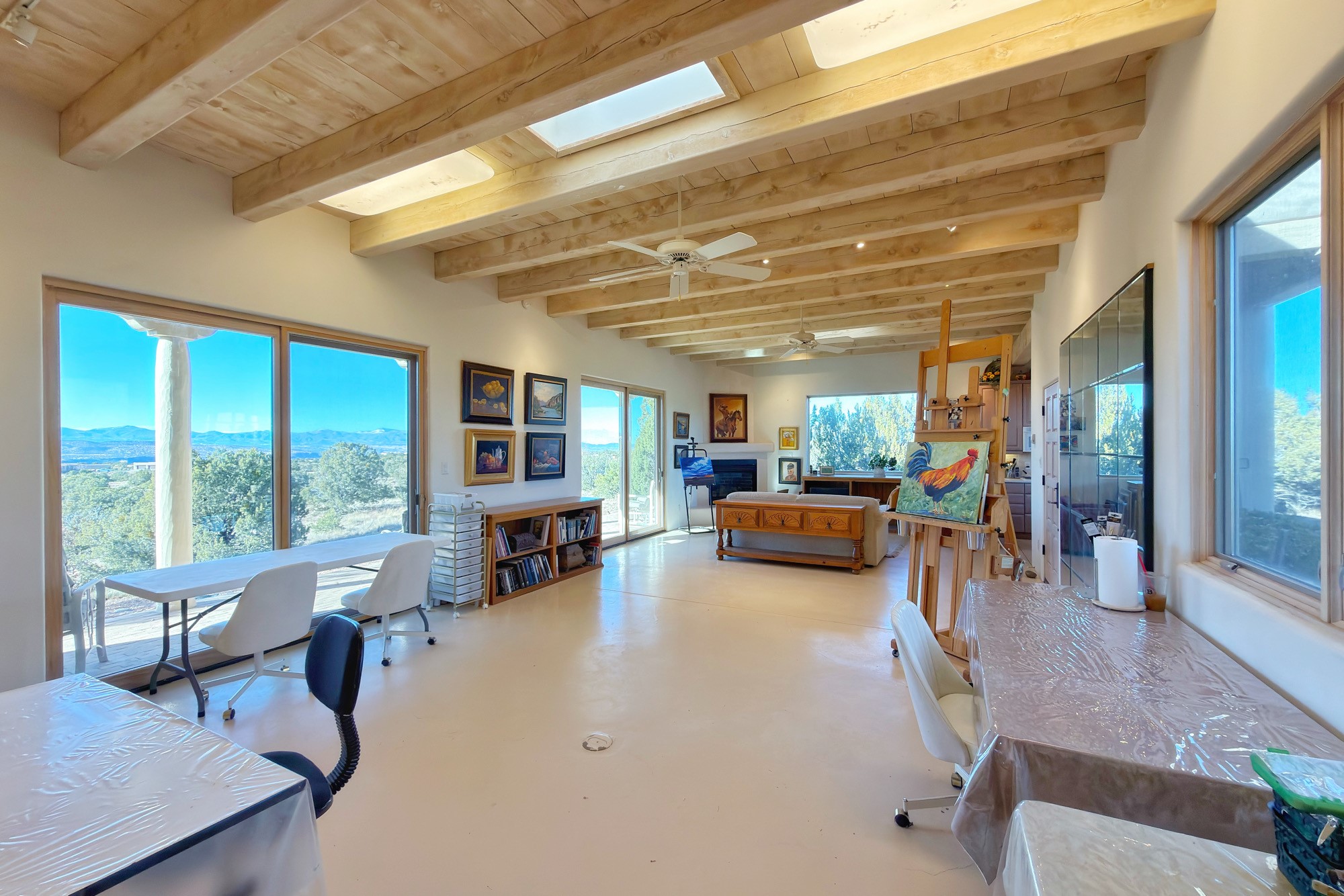 A long, private, winding driveway leads to this secluded, expansive hilltop retreat spanning 16.58 acre and showcasing unobstructed, panoramic sunrise & sunset views of the Jemez and Sangre de Cristo mountains- from inside and outside of the house. A sophisticated estate with detached studio/guest house and impressive 5 car garage encompasses 5,225 total sq ft in the equestrian friendly community of La Tiera Nueva. The 4,310 sq ft main home, with no steps, is introduced by a courtyard with a perennial garden, water feature and sculptures which leads inside to a dramatic galleria showcasing a great room with 10 floor-to-ceiling windows/doors, a gas fireplace and a entertainment center perfect for large gatherings plus a grand piano. The gourmet kitchen boasts a large center island, cozy eating area, gas fireplace and built-in bookcase. Perfect for large or intimate gatherings. The primary suite provides a quiet retreat with a sitting room, custom built-ins, dual walk in closets, picture windows and a spa-style bath with soaking tub and separate showers and views of the Jemez mountains. Two ensuite guest rooms, a powder room and laundry room complete the main home. Outside, an expansive portal spans the length of the home, and features two wood-burning fireplaces and semi-enclosed dining and seating areas capturing the views of the Jemez Mountains, ideal for year round enjoyment. The detached 915 sq ft. studio/guest house offers a flexible, light filled space with a fireplace, kitchen, walk-in closet, and 3/4 bath. All suitable for creative work, guests or multi-generational use. Two extra large bedrooms could be easily created in the studio. The landscaped grounds include sculptured gardens, water features, contemporary stone elements, and an orchard with a variety of trees, plus space for a horse barn to be built. Only 20 minutes to the Santa Fe airport and renowned Plaza, La Tierra Nueva provides manned security, gated privacy, and on-site tennis & pickleball.