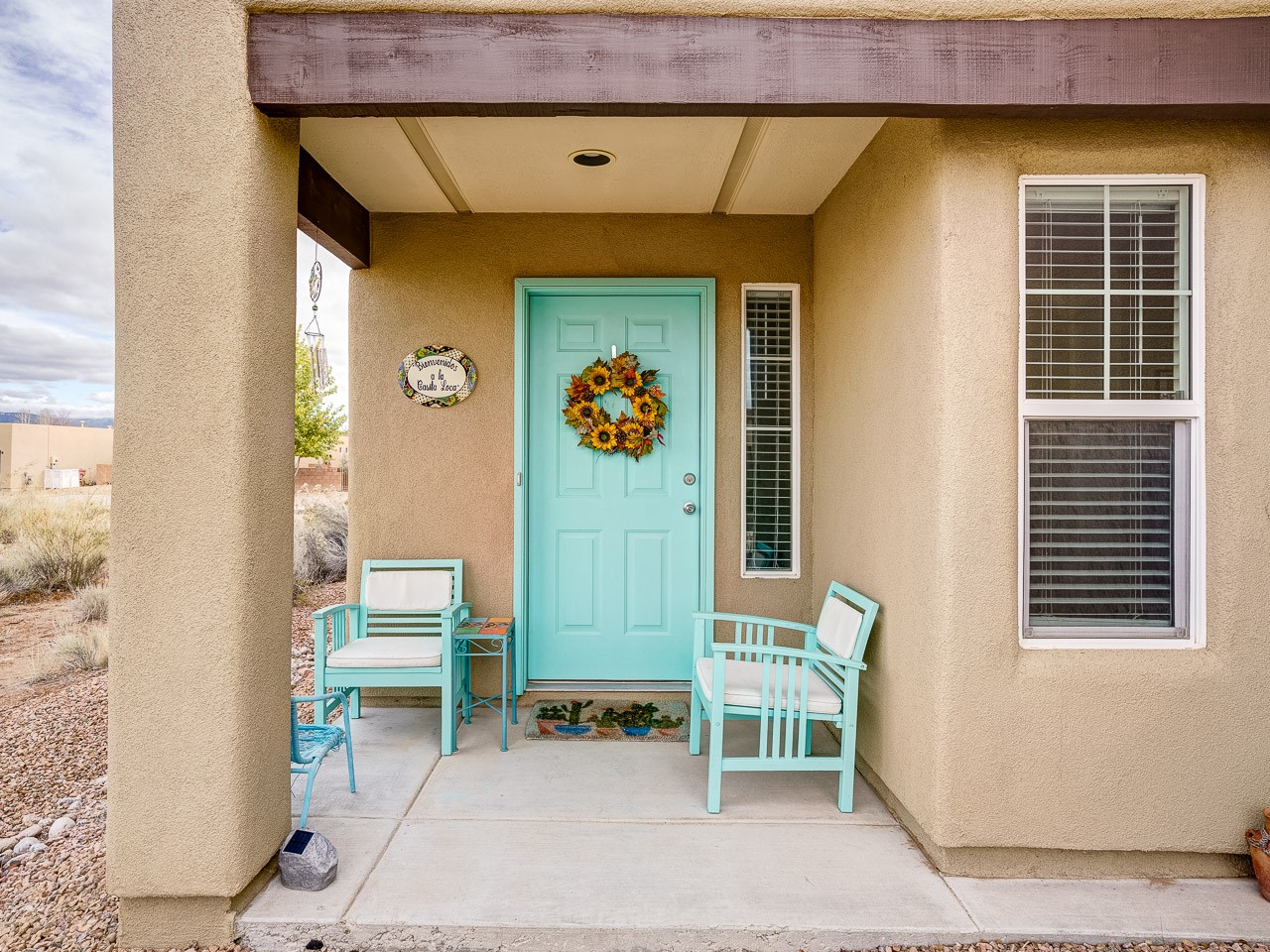 Discover the charm of Santa Fe living at 15 Via Sagrada, a delightful, lovingly maintained 2-bedroom, 1-bathroom single-family home located in the desirable La Entrada of Rancho Viejo community. Featuring a an open-concept design, this property offers a perfect blend of subtle finishes and inviting living spaces. The interior is nicely lit and centered around a cozy gas kiva fireplace, ideal for embracing the unique Santa Fe ambiance. Silicon GACO Roof Coating was applied in November 2025 and comes with a 6 year transferable labor and material warranty! Enjoy sunrise views from the backyard patio! This home is an excellent choice for a first-time buyer, a potential investment property, or a low-maintenance home base for those who love to travel. Over 50% of the Rancho Viejo community is dedicated to natural open space and parks, with miles of paved multi-purpose trails. Just minutes from the Santa Fe Community College, IAIA, shopping, restaurants, and Presbyterian Medical Center. Easy access to Hwy 599, Interstate 25 and a Railrunner Station. Move right in and enjoy the Santa Fe lifestyle!