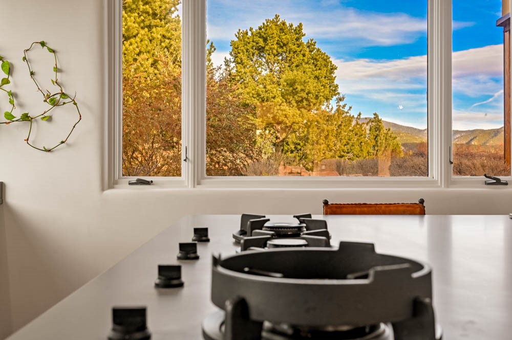 Exceptional mountain views! Beautifully updated Santa Fe home offering classic Southwestern charm and modern amenities. Features include a sun-filled remodeled chef's kitchen with walk-in pantry and an elevator from the oversized 2-car garage for easy access to the secondary refrigerator and multiple storage rooms.The primary suite offers an elegant soaking tub for two and private retreat deck. The two downstairs bedrooms have ensuite bathrooms and an adjoining steam shower, and individual French-door entries that open onto a patio framed by a blooming pollinator's haven.Expansive outdoor living with three distinct portals, the largest fully equipped with a built-in grill and cabinetry for seamless entertaining while enjoying sweeping views of the Sangre de Cristo Mountains, Santa Fe Ski Basin, and Badlands.Located in a private, secure, gated community surrounded by a mature pion and cedar forest. Approx. 2-acre lot provides peace and serenity, yet you're less than 10 minutes from exceptional culinary spots, the vibrant and historic Santa Fe Plaza, and the world-renowned Santa Fe Opera. Home is in the County and not subject to the Mansion Tax for buyers. Furniture package available.
