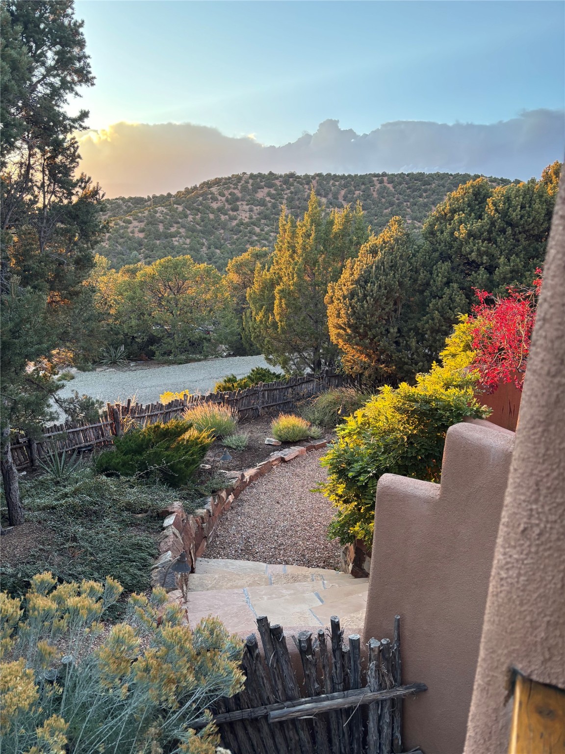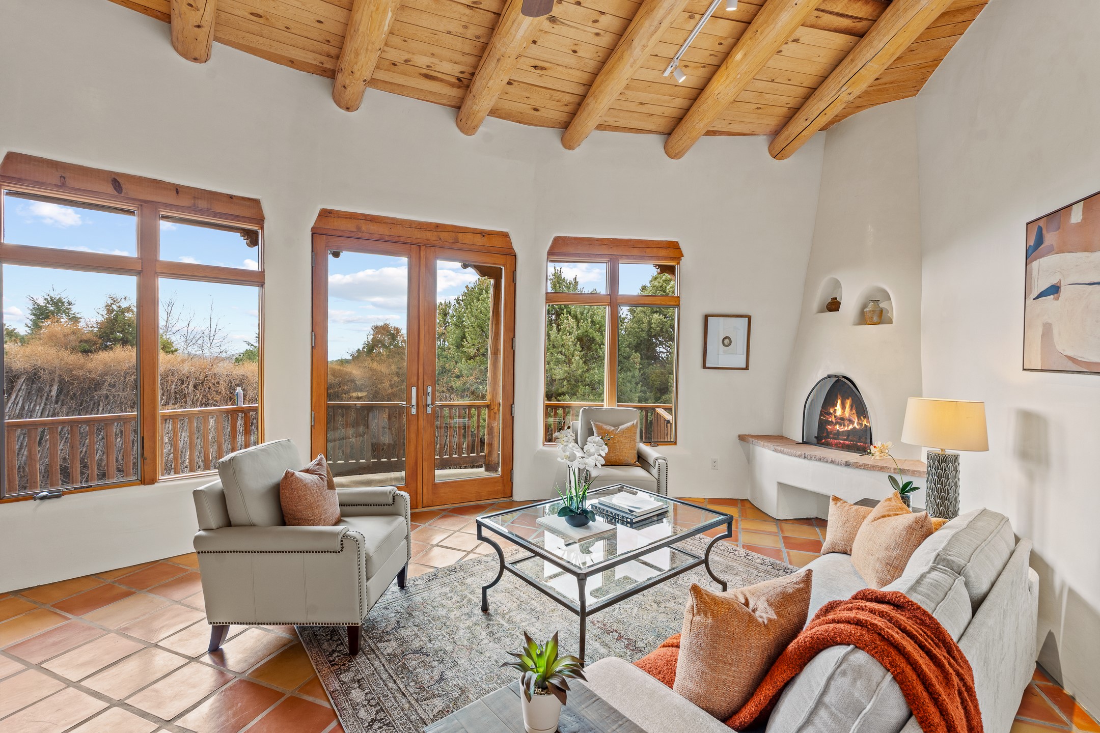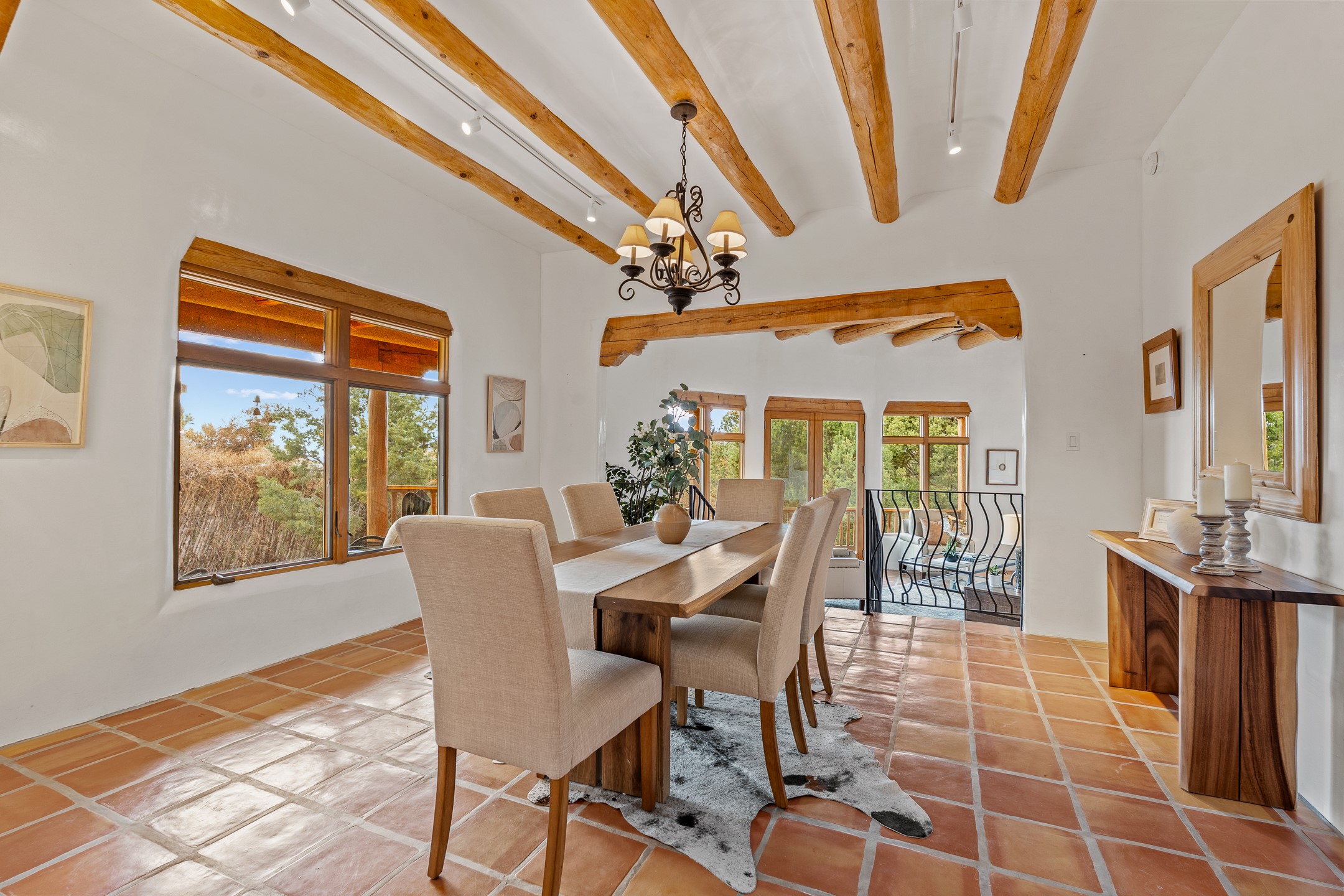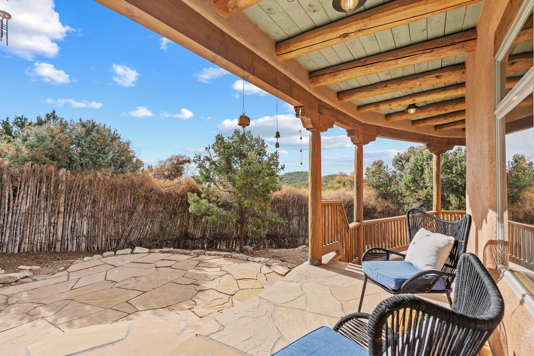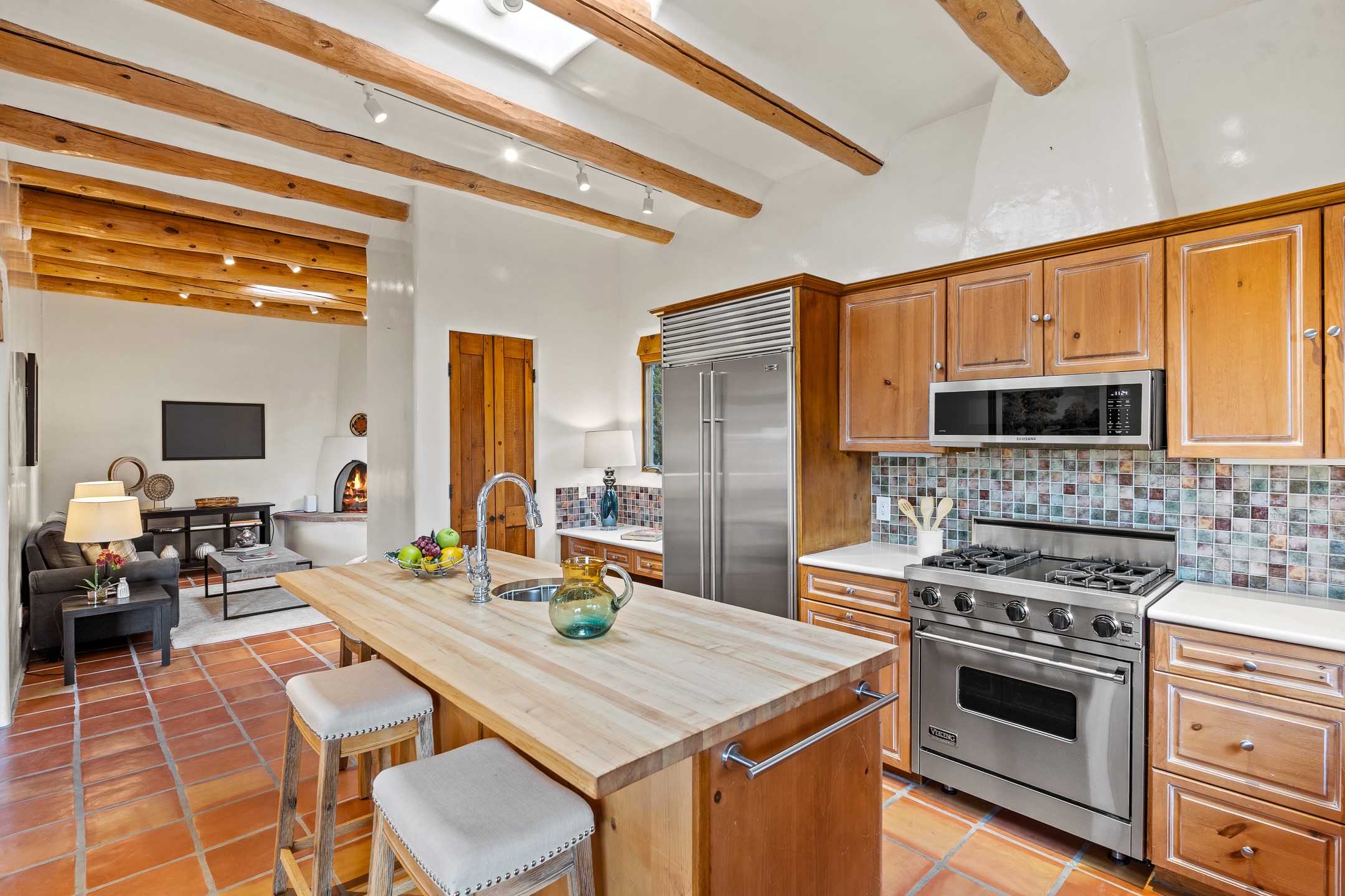 Located on a quiet cul-de-sac in the desirable Cerros Colorados neighborhood, this beautifully renovated 2,693 sq. ft. home sits on 0.58 acres with sunset and Sandia mountain views. Just 10 minutes to the Plaza and directly adjacent to the Dale Ball Trail system, this residence offers the perfect blend of natural beauty, privacy, and accessibility. Renovated down to the studs between 2022-2024, the home is filled with handcrafted Southwestern details--high viga ceilings, white hand-troweled plaster walls, coved ceilings, and a custom Indonesian front door. The main South-facing living area features a kiva fireplace and opens to a wraparound portal for seamless indoor-outdoor living. The kitchen is outfitted with white stone countertops, a butcher block island with prep sink, Viking range, Sub-Zero refrigerator, and bar seating--ideal for gatherings. A cozy den with its own kiva fireplace sits just off the kitchen. The private primary suite is located in the southwest corner with a balcony for stargazing and sunset views, one large West-facing banco and a spa-like bath with a clawfoot soaking tub, walk-in shower, and a generous walk-in closet. Two guest bedrooms and a full bath are located on the north side of the home, along with a large laundry room. A central powder room includes an additional shower for flexible guest use. A stairway leads to a heated 700 sq. ft. garage, perfect for storage, studio, or workshop needs. This property is a rare offering--artful, serene, and reimagined for modern Santa Fe living.