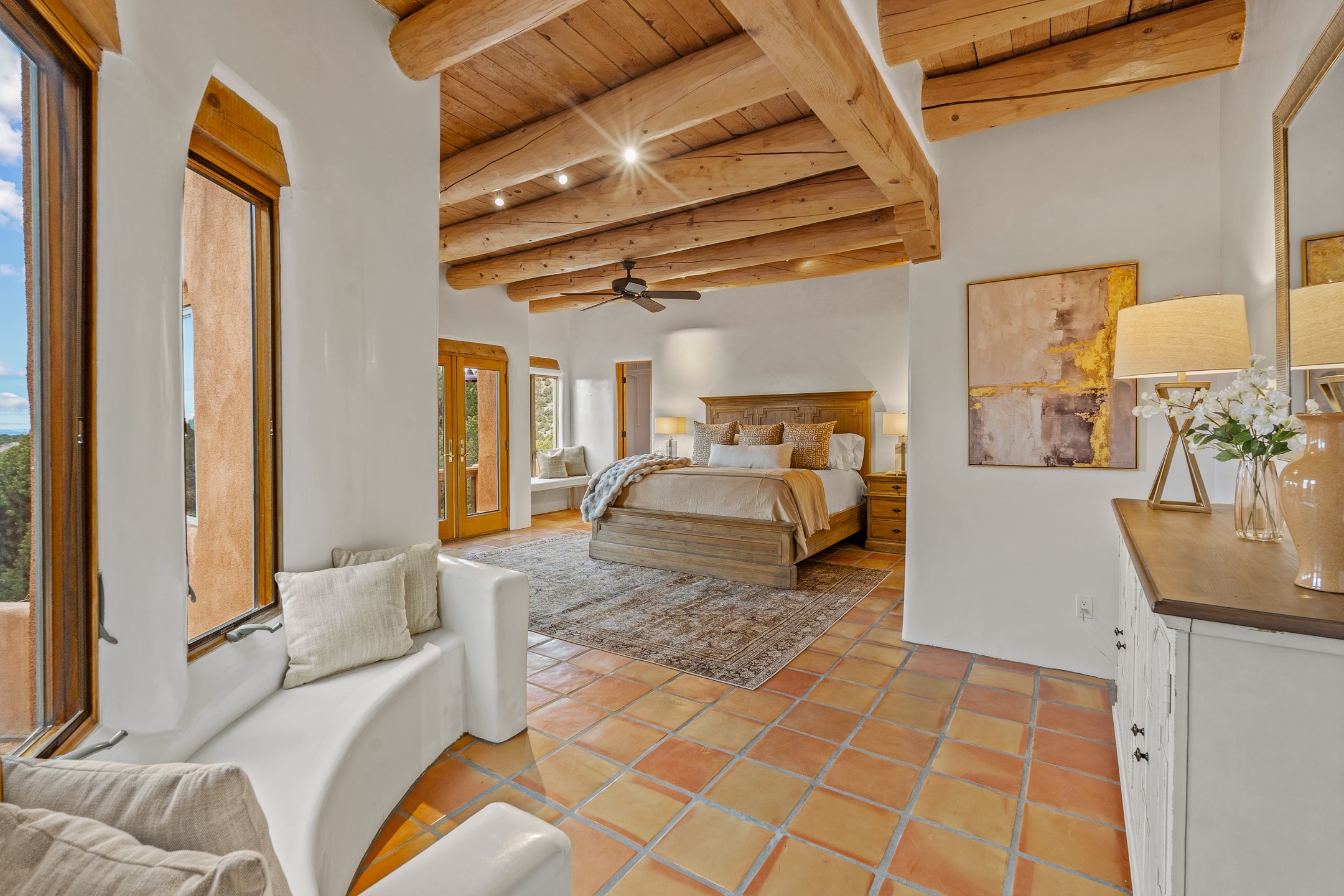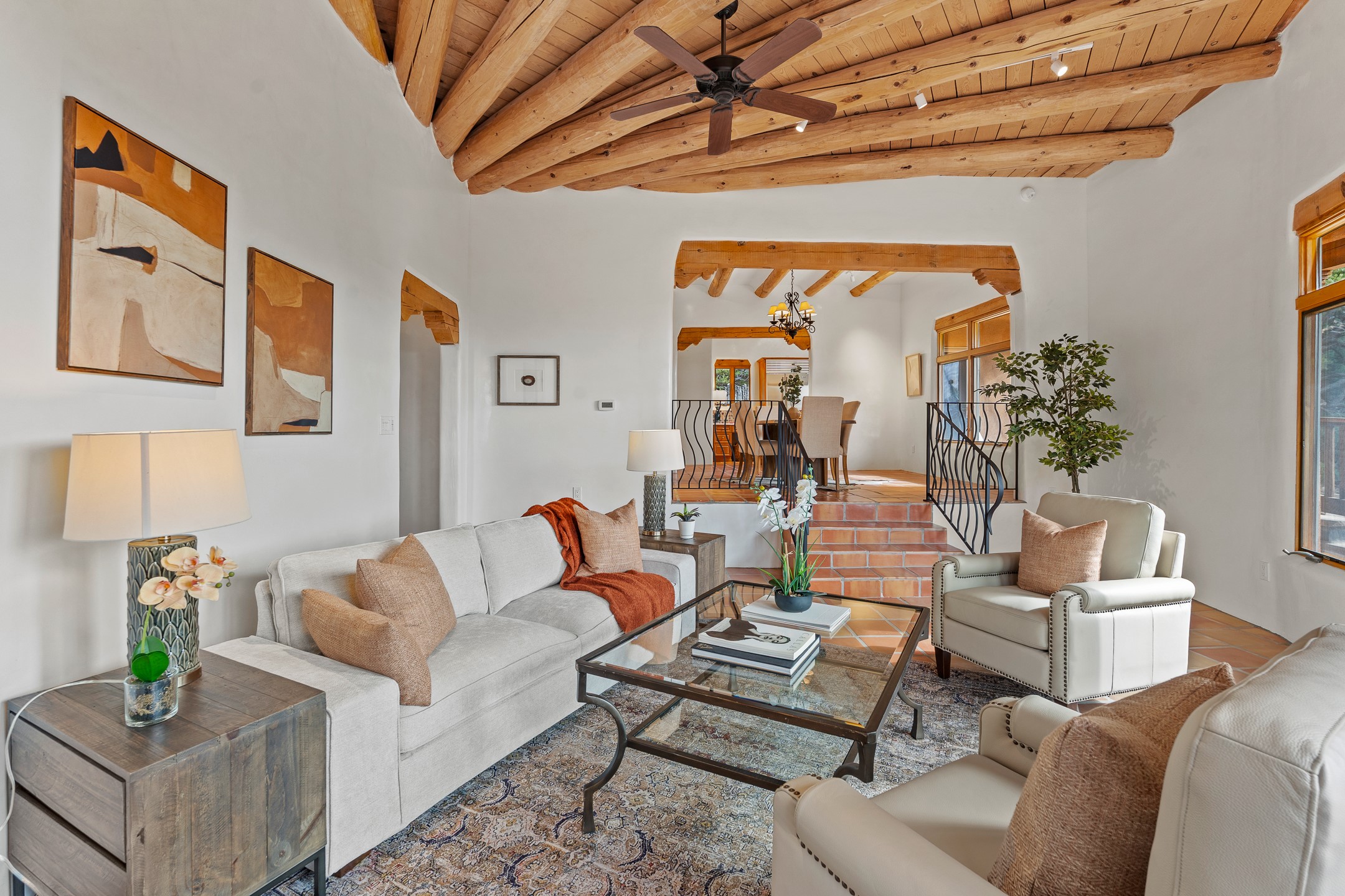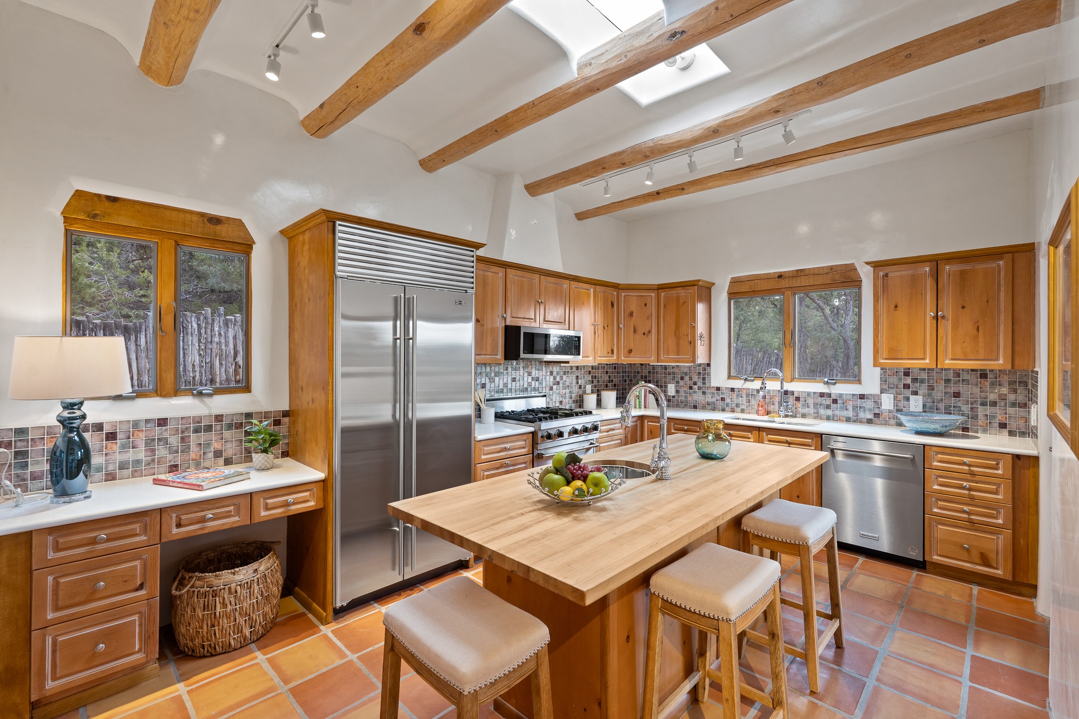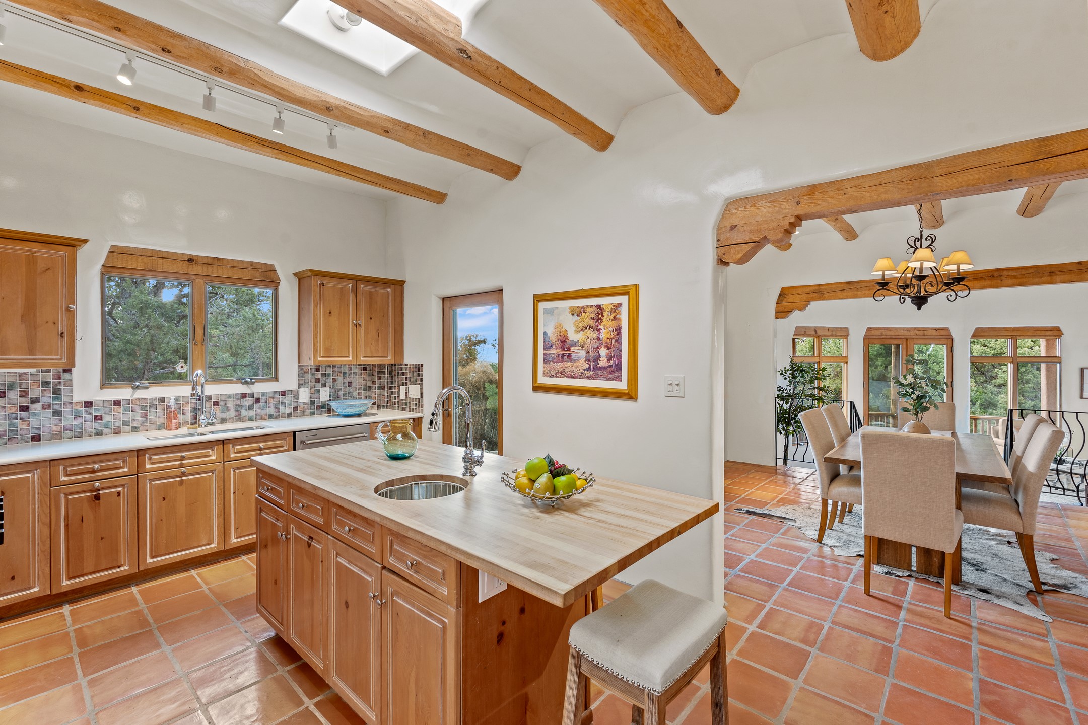 Located on a quiet cul-de-sac in the desirable Cerros Colorados neighborhood, this beautifully renovated 2,693 sq. ft. home sits on 0.58 acres with sunset and Sandia mountain views. Just 10 minutes to the Plaza and directly adjacent to the Dale Ball Trail system, this residence offers the perfect blend of natural beauty, privacy, and accessibility. Renovated down to the studs between 2022-2024, the home is filled with handcrafted Southwestern details--high viga ceilings, white hand-troweled plaster walls, coved ceilings, and a custom Indonesian front door. The main South-facing living area features a kiva fireplace and opens to a wraparound portal for seamless indoor-outdoor living. The kitchen is outfitted with white stone countertops, a butcher block island with prep sink, Viking range, Sub-Zero refrigerator, and bar seating--ideal for gatherings. A cozy den with its own kiva fireplace sits just off the kitchen. The private primary suite is located in the southwest corner with a balcony for stargazing and sunset views, one large West-facing banco and a spa-like bath with a clawfoot soaking tub, walk-in shower, and a generous walk-in closet. Two guest bedrooms and a full bath are located on the north side of the home, along with a large laundry room. A central powder room includes an additional shower for flexible guest use. A stairway leads to a heated 700 sq. ft. garage, perfect for storage, studio, or workshop needs. This property is a rare offering--artful, serene, and reimagined for modern Santa Fe living.