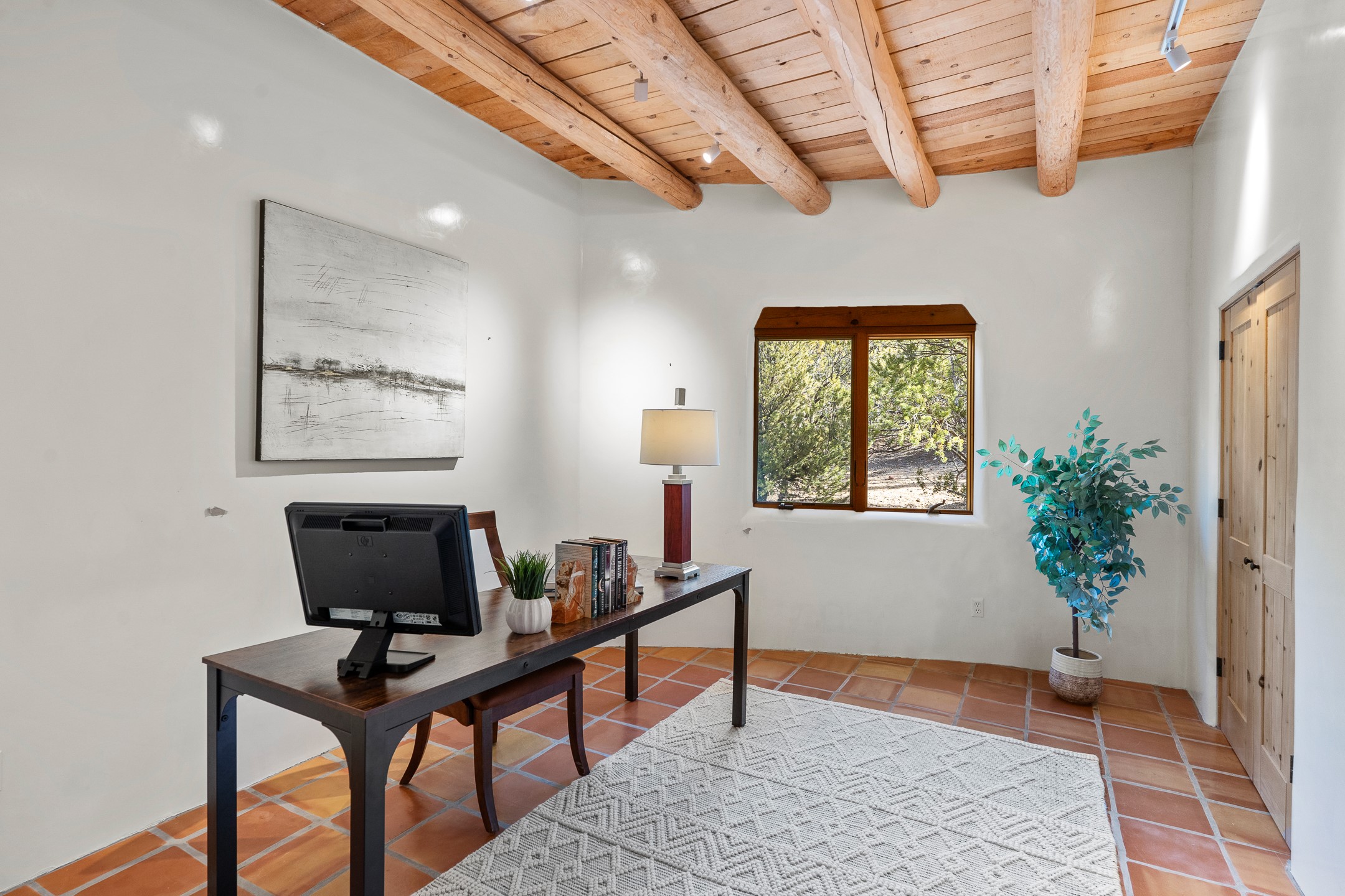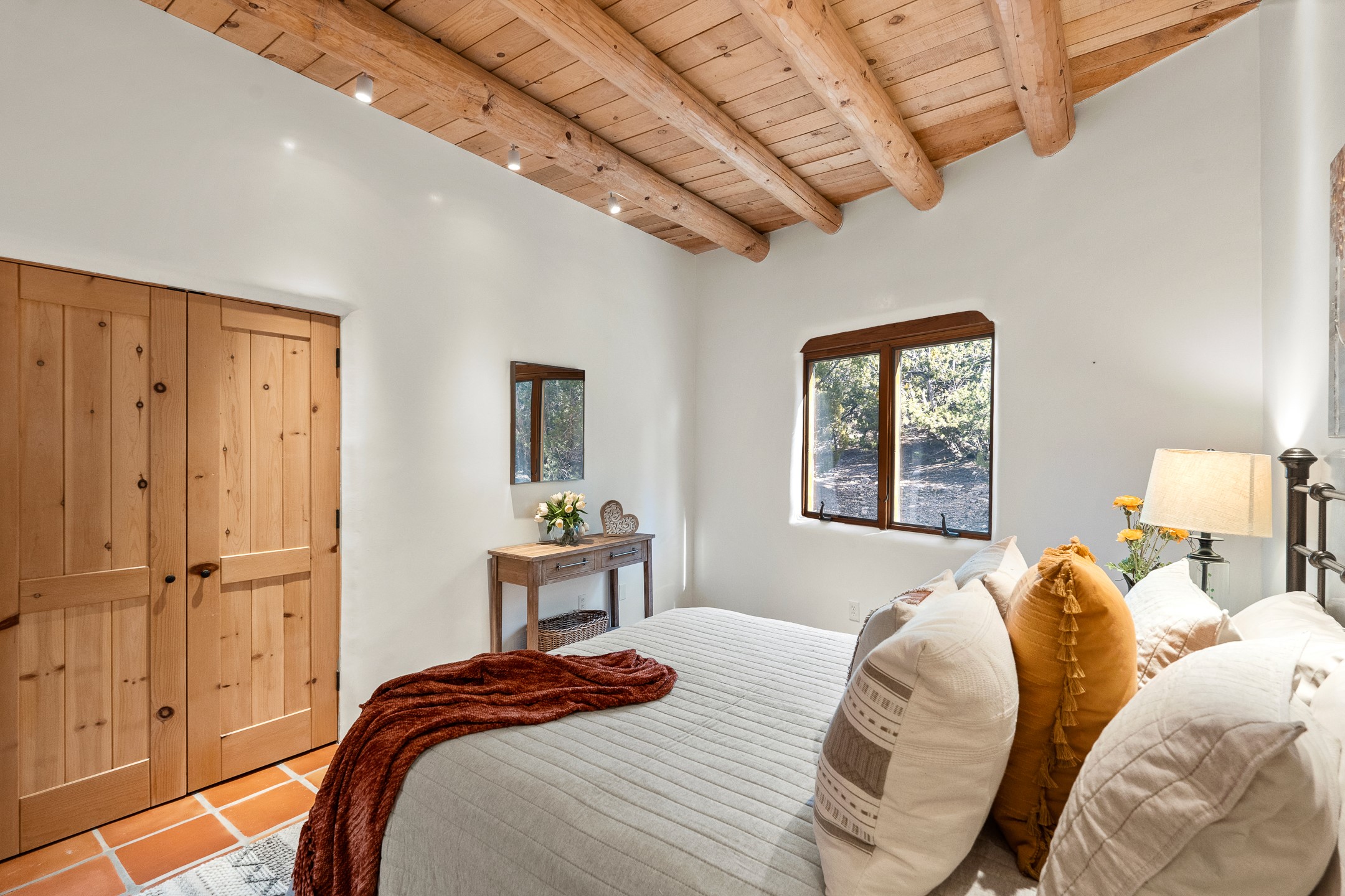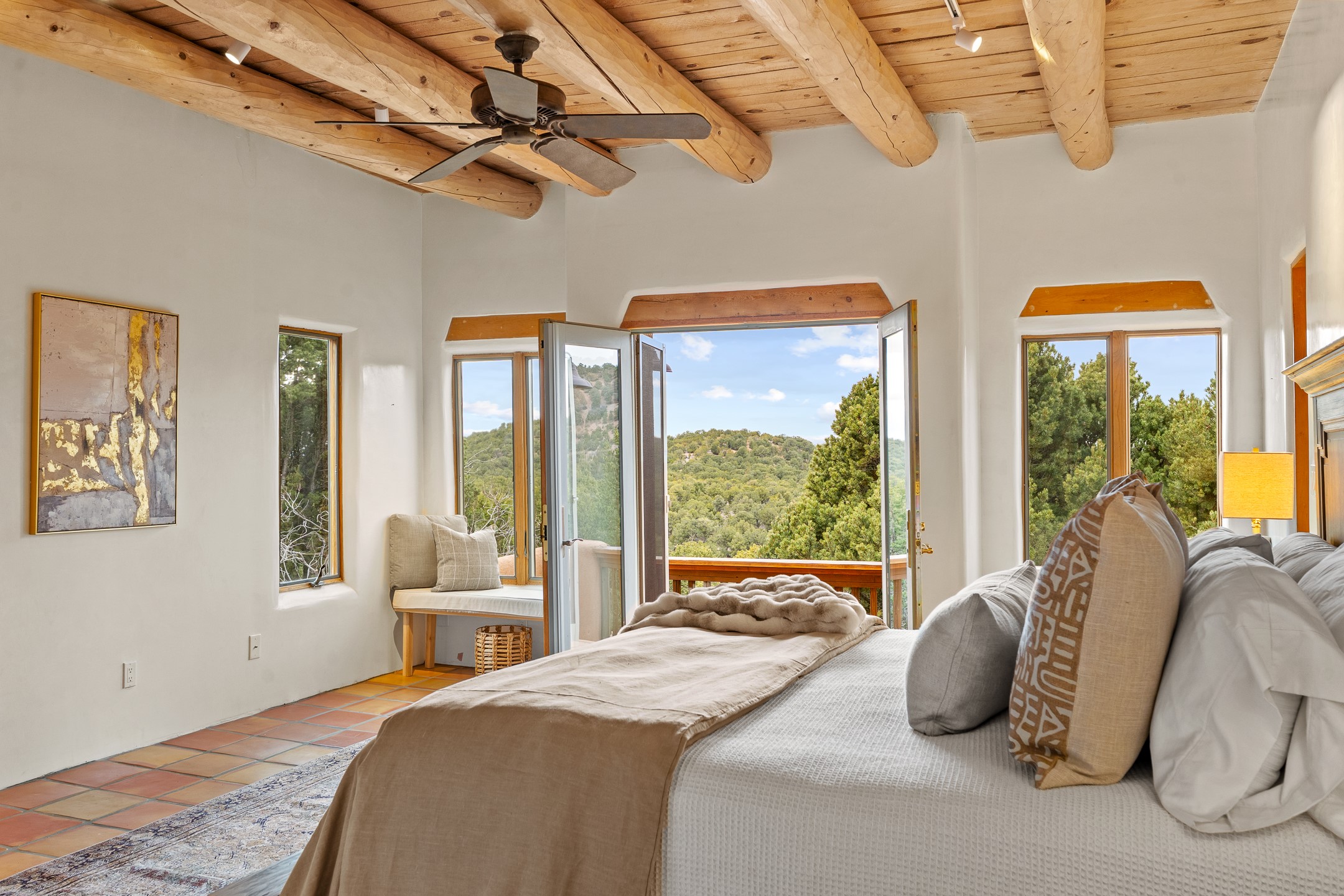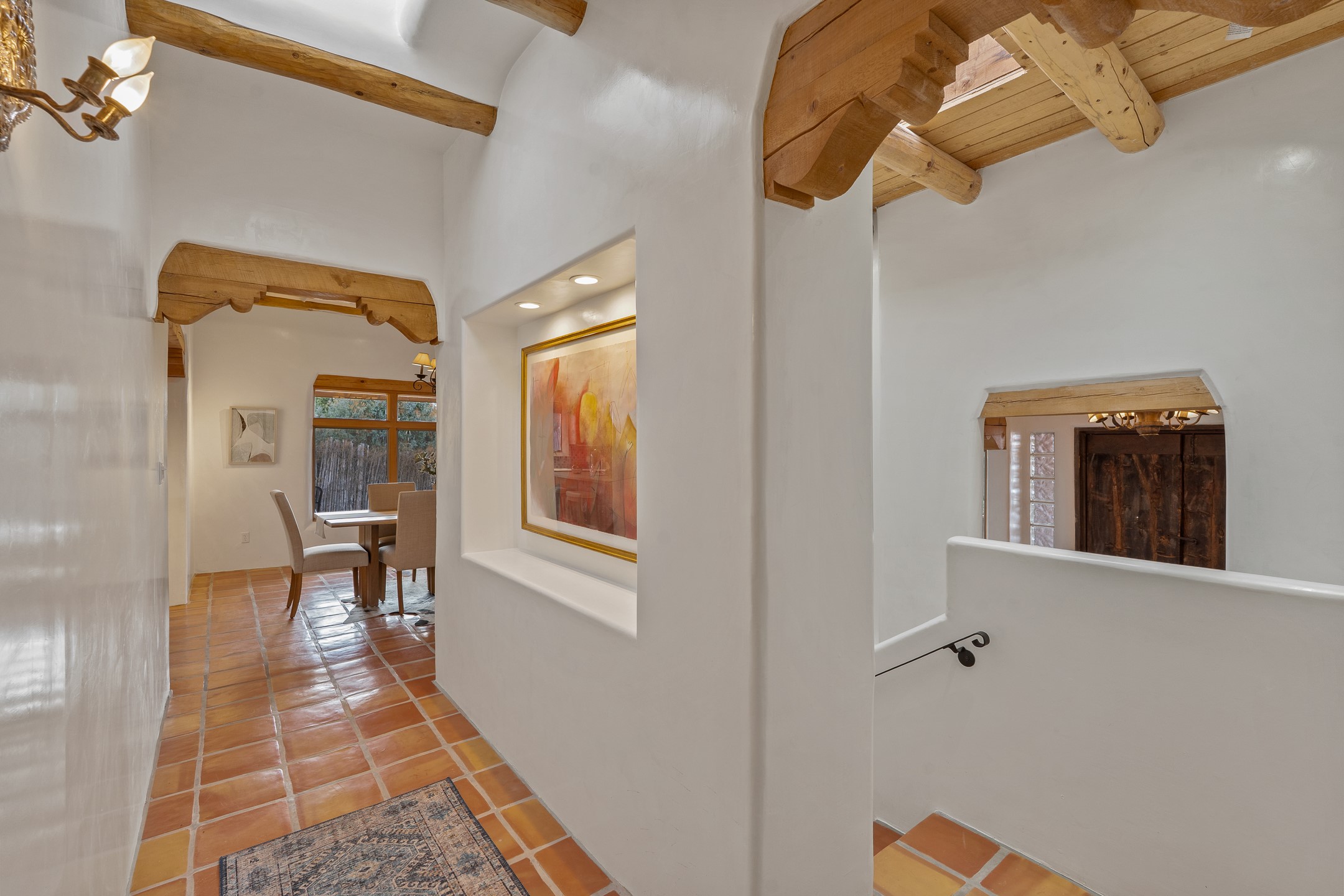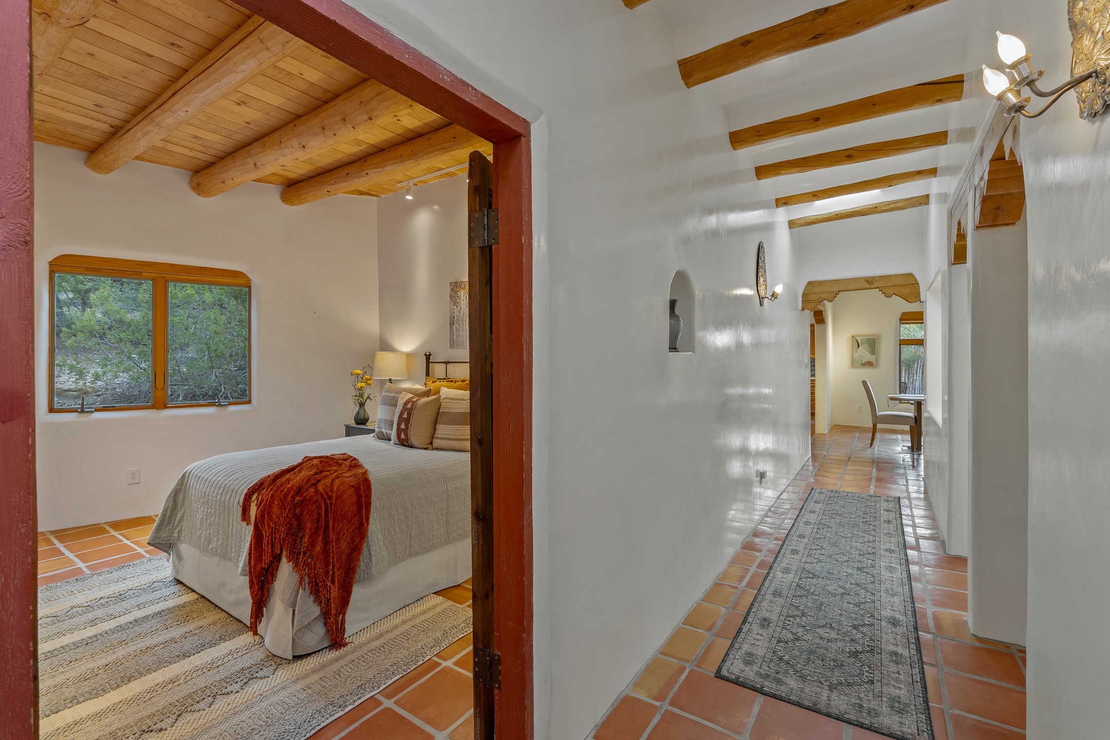 Located on a quiet cul-de-sac in the desirable Cerros Colorados neighborhood, this beautifully renovated 2,693 sq. ft. home sits on 0.58 acres with sunset and Sandia mountain views. Just 10 minutes to the Plaza and directly adjacent to the Dale Ball Trail system, this residence offers the perfect blend of natural beauty, privacy, and accessibility. Renovated down to the studs between 2022-2024, the home is filled with handcrafted Southwestern details--high viga ceilings, white hand-troweled plaster walls, coved ceilings, and a custom Indonesian front door. The main South-facing living area features a kiva fireplace and opens to a wraparound portal for seamless indoor-outdoor living. The kitchen is outfitted with white stone countertops, a butcher block island with prep sink, Viking range, Sub-Zero refrigerator, and bar seating--ideal for gatherings. A cozy den with its own kiva fireplace sits just off the kitchen. The private primary suite is located in the southwest corner with a balcony for stargazing and sunset views, one large West-facing banco and a spa-like bath with a clawfoot soaking tub, walk-in shower, and a generous walk-in closet. Two guest bedrooms and a full bath are located on the north side of the home, along with a large laundry room. A central powder room includes an additional shower for flexible guest use. A stairway leads to a heated 700 sq. ft. garage, perfect for storage, studio, or workshop needs. This property is a rare offering--artful, serene, and reimagined for modern Santa Fe living.