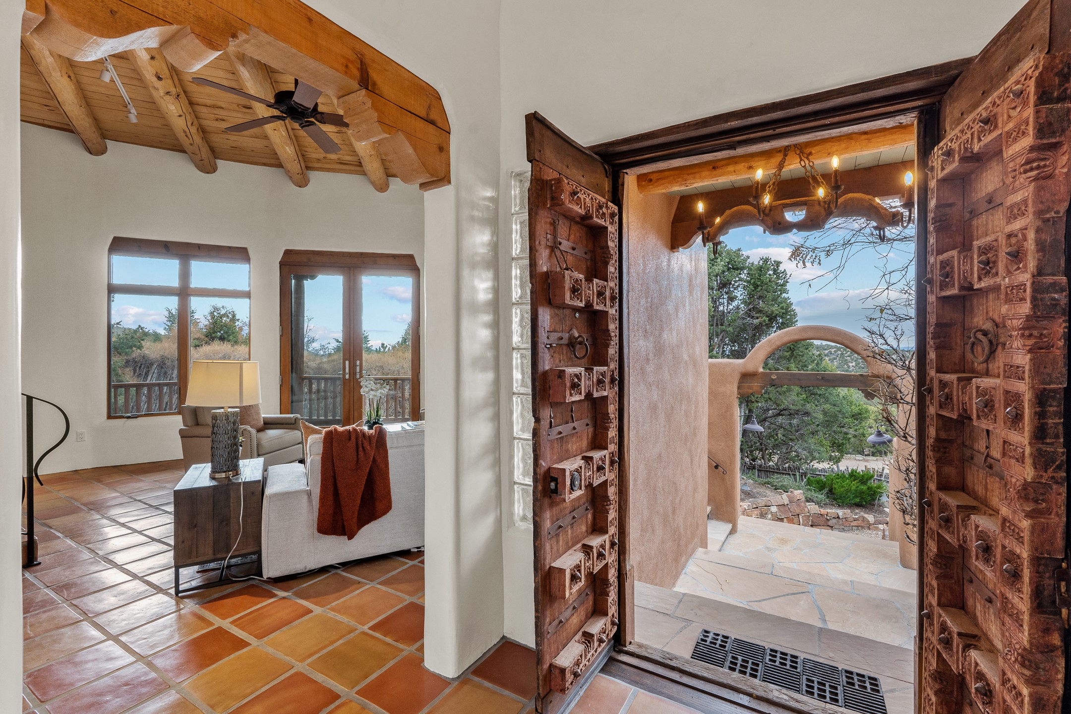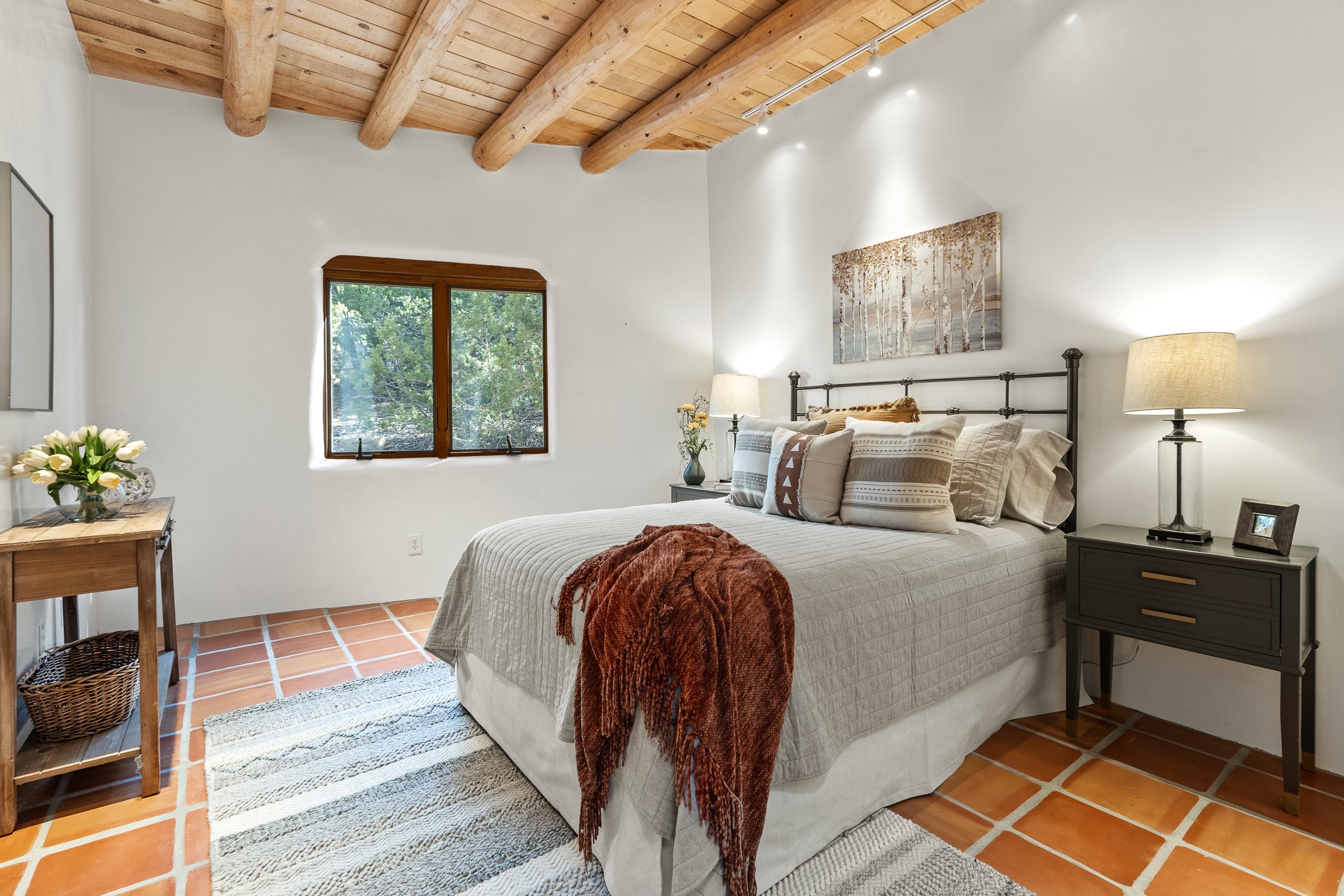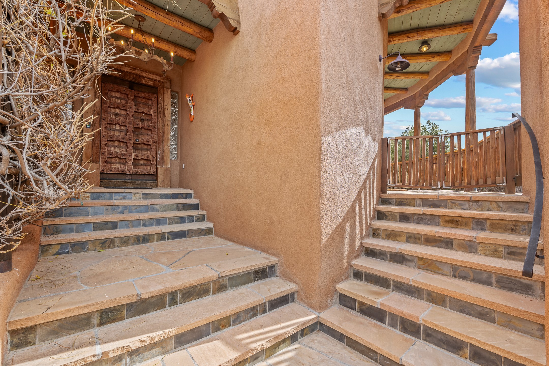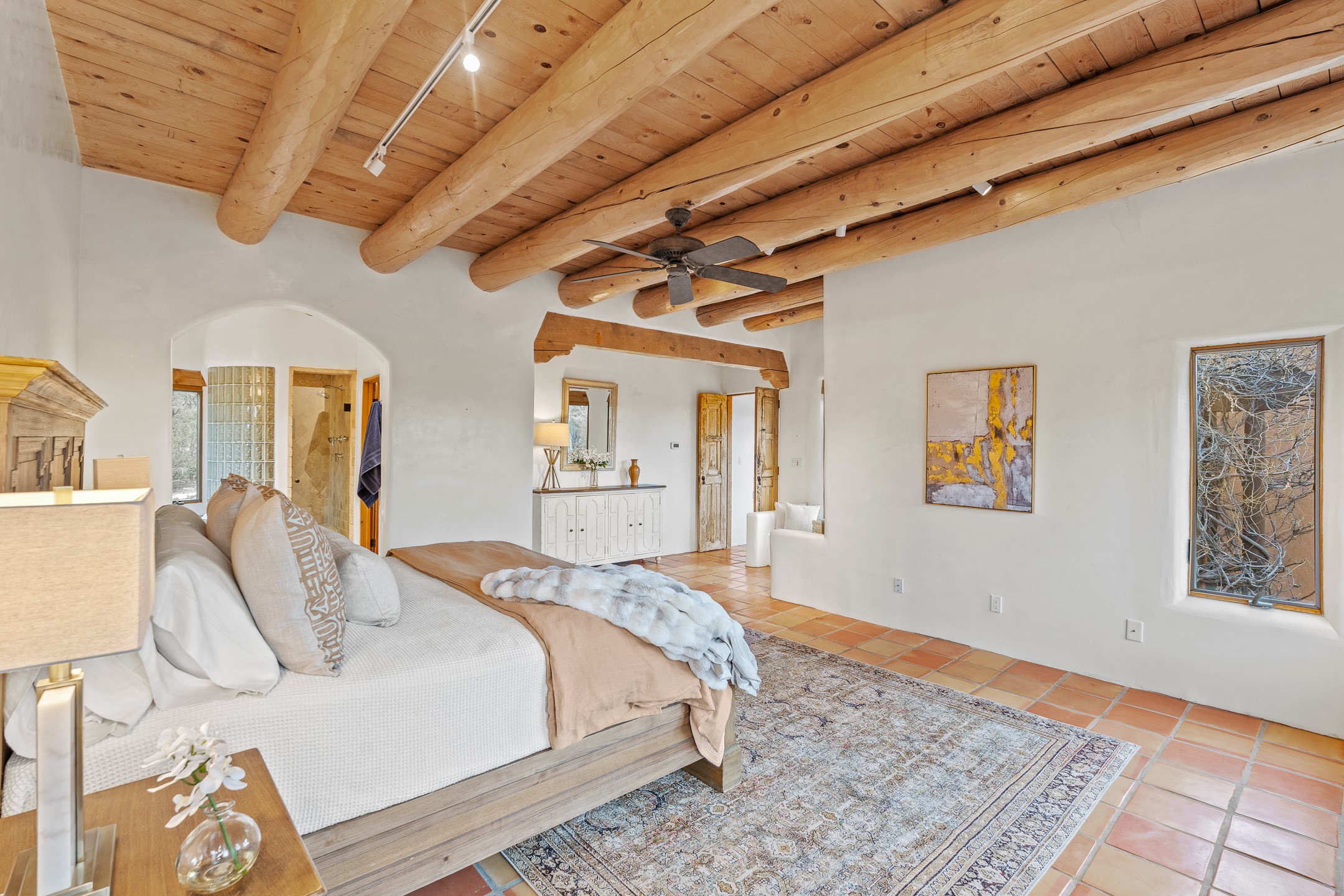 Located on a quiet cul-de-sac in the desirable Cerros Colorados neighborhood, this beautifully renovated 2,693 sq. ft. home sits on 0.58 acres with sunset and Sandia mountain views. Just 10 minutes to the Plaza and directly adjacent to the Dale Ball Trail system, this residence offers the perfect blend of natural beauty, privacy, and accessibility. Renovated down to the studs between 2022-2024, the home is filled with handcrafted Southwestern details--high viga ceilings, white hand-troweled plaster walls, coved ceilings, and a custom Indonesian front door. The main South-facing living area features a kiva fireplace and opens to a wraparound portal for seamless indoor-outdoor living. The kitchen is outfitted with white stone countertops, a butcher block island with prep sink, Viking range, Sub-Zero refrigerator, and bar seating--ideal for gatherings. A cozy den with its own kiva fireplace sits just off the kitchen. The private primary suite is located in the southwest corner with a balcony for stargazing and sunset views, one large West-facing banco and a spa-like bath with a clawfoot soaking tub, walk-in shower, and a generous walk-in closet. Two guest bedrooms and a full bath are located on the north side of the home, along with a large laundry room. A central powder room includes an additional shower for flexible guest use. A stairway leads to a heated 700 sq. ft. garage, perfect for storage, studio, or workshop needs. This property is a rare offering--artful, serene, and reimagined for modern Santa Fe living.