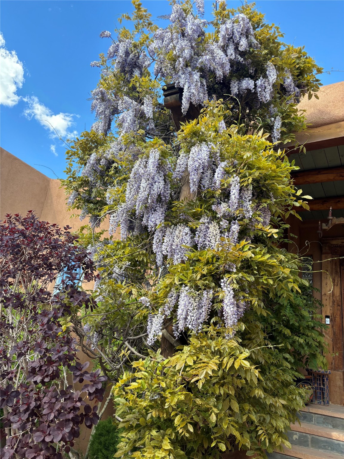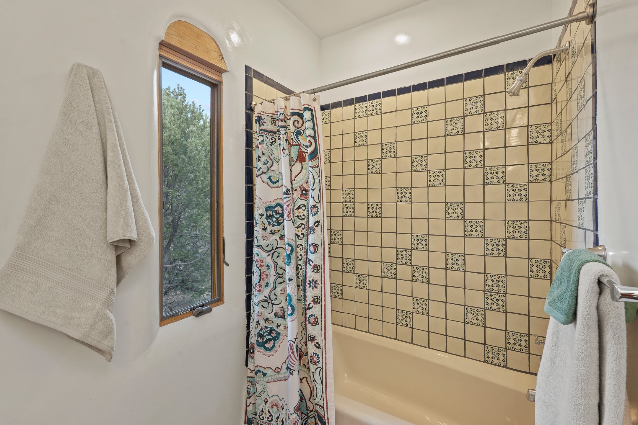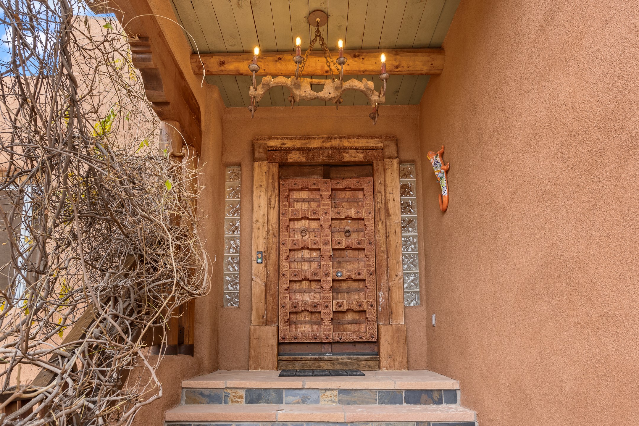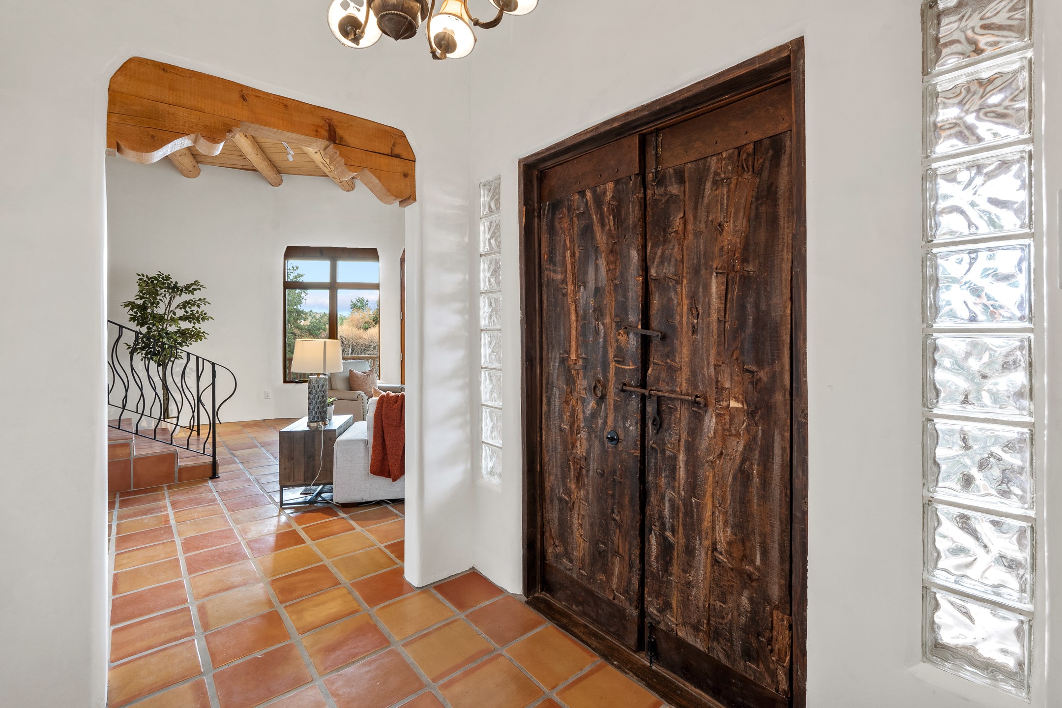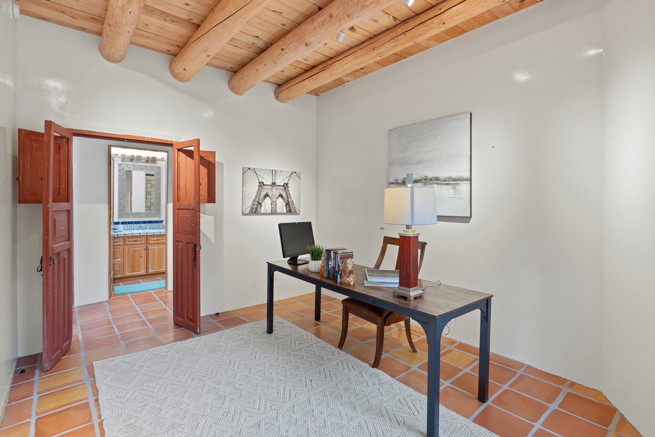 Located on a quiet cul-de-sac in the desirable Cerros Colorados neighborhood, this beautifully renovated 2,693 sq. ft. home sits on 0.58 acres with sunset and Sandia mountain views. Just 10 minutes to the Plaza and directly adjacent to the Dale Ball Trail system, this residence offers the perfect blend of natural beauty, privacy, and accessibility. Renovated down to the studs between 2022-2024, the home is filled with handcrafted Southwestern details--high viga ceilings, white hand-troweled plaster walls, coved ceilings, and a custom Indonesian front door. The main South-facing living area features a kiva fireplace and opens to a wraparound portal for seamless indoor-outdoor living. The kitchen is outfitted with white stone countertops, a butcher block island with prep sink, Viking range, Sub-Zero refrigerator, and bar seating--ideal for gatherings. A cozy den with its own kiva fireplace sits just off the kitchen. The private primary suite is located in the southwest corner with a balcony for stargazing and sunset views, one large West-facing banco and a spa-like bath with a clawfoot soaking tub, walk-in shower, and a generous walk-in closet. Two guest bedrooms and a full bath are located on the north side of the home, along with a large laundry room. A central powder room includes an additional shower for flexible guest use. A stairway leads to a heated 700 sq. ft. garage, perfect for storage, studio, or workshop needs. This property is a rare offering--artful, serene, and reimagined for modern Santa Fe living.