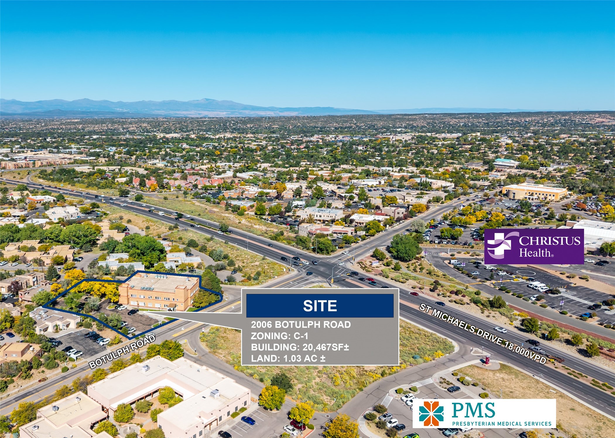 Premium office suites on the second floor with views, accessed by elevator and stairs. The Catron Building at 2006 Botulph Road is a well-located, two-story professional office property in the heart of Santa Fe's medical and business corridor. Offering 20,467 square feet on 0.90 acres, the building provides flexible suite configurations, excellent natural light, ADA-accessible restrooms, and elevator service. The property is ideal for medical, dental, behavioral health, administrative office, or professional services users. Currently, the building offers a balanced mix of leased suites and 11,323 RSF of vacancy, allowing versatile pathways for owner-users, investors, or businesses seeking a full-building HQ near Christus St. Vincent Hospital, St. Michael's Drive, and I-25. A fresh asphalt overlay, restriped 54-space parking lot, and mature landscaping make this an attractive and functional home for a wide range of professional uses. Zoning is C-1, permitting a variety of commercial and office applications. LOCATION: Situated just off St. Michael's Drive, this property offers seamless access to Santa Fe's medical hub, downtown, Hwy 285, and I-25. The immediate area includes medical clinics, law firms, financial services, and professional offices. The location serves both local residents and the region's robust healthcare community.