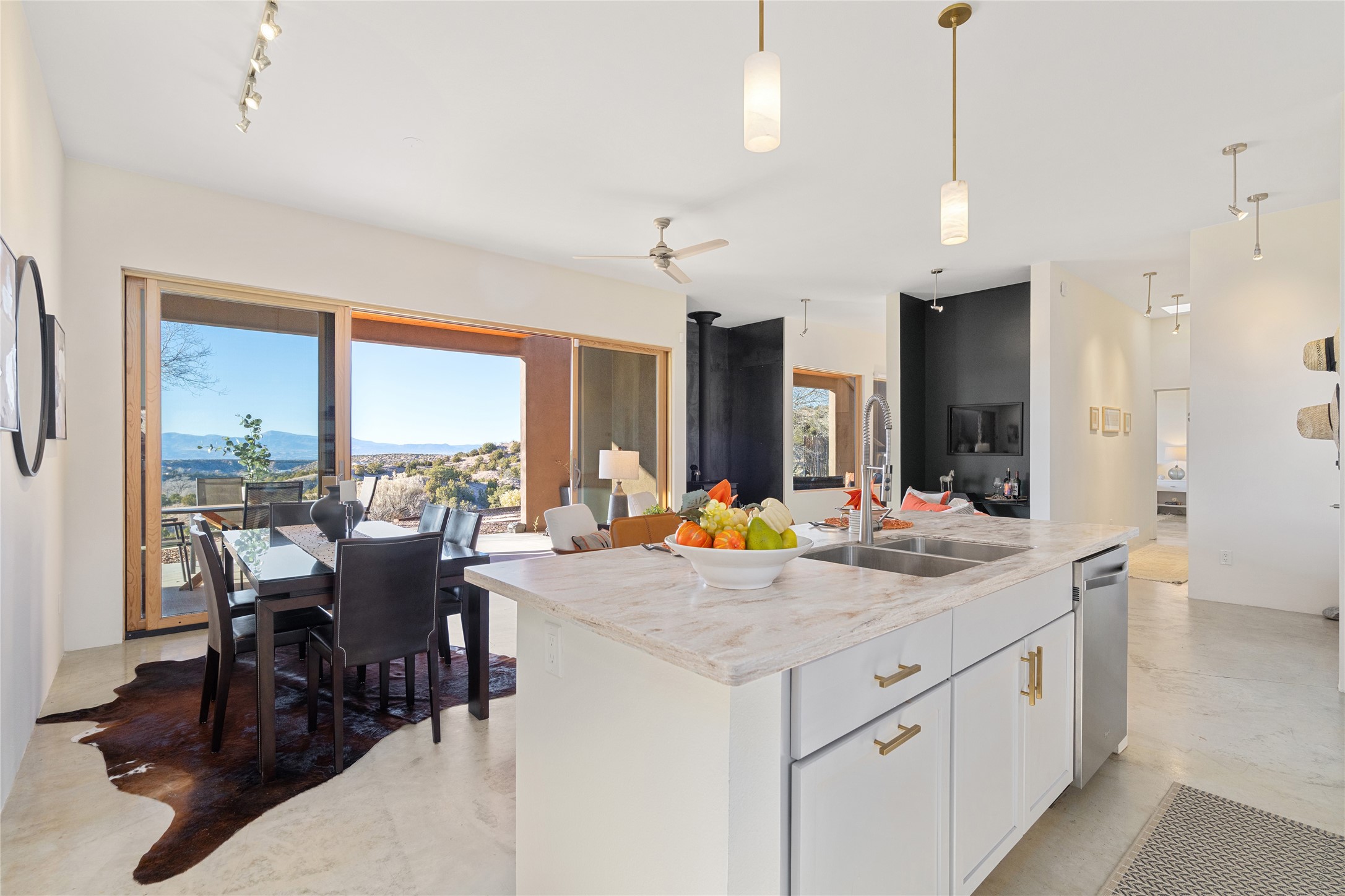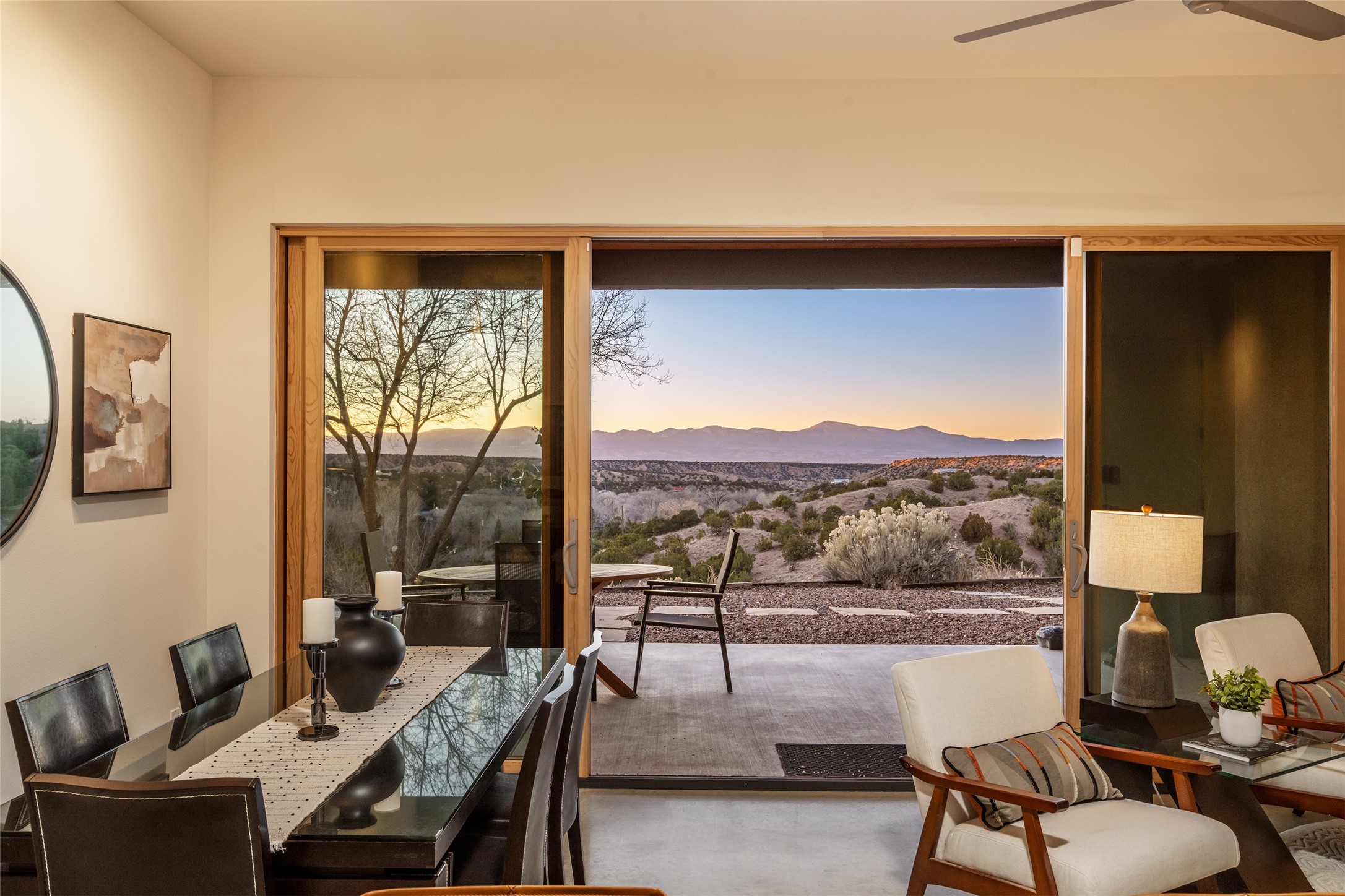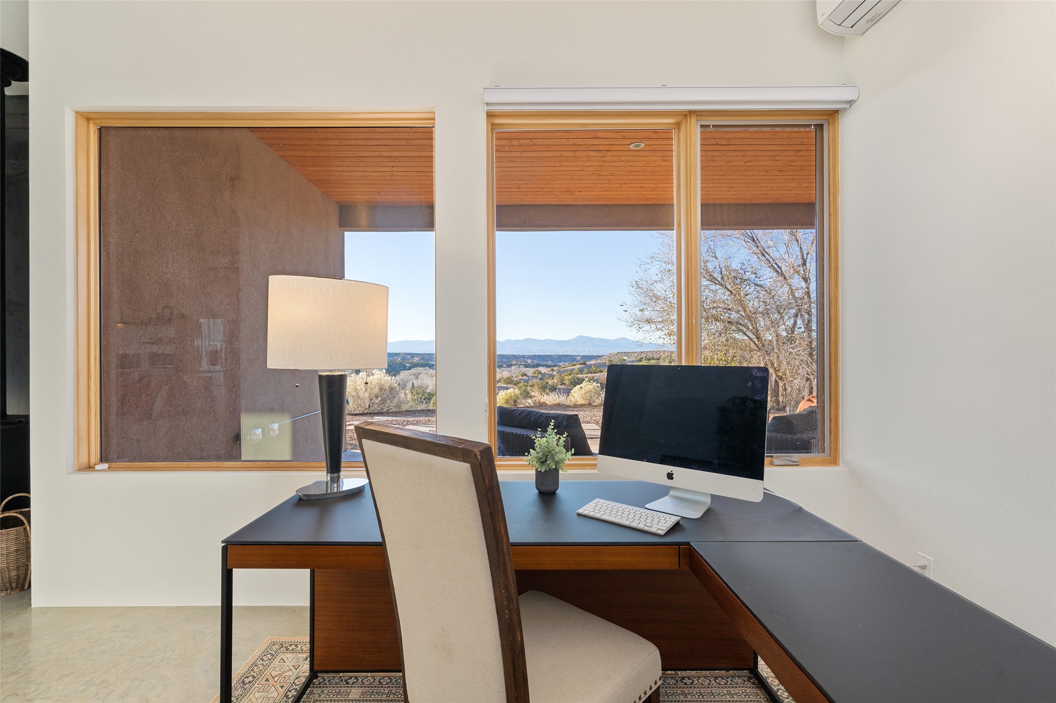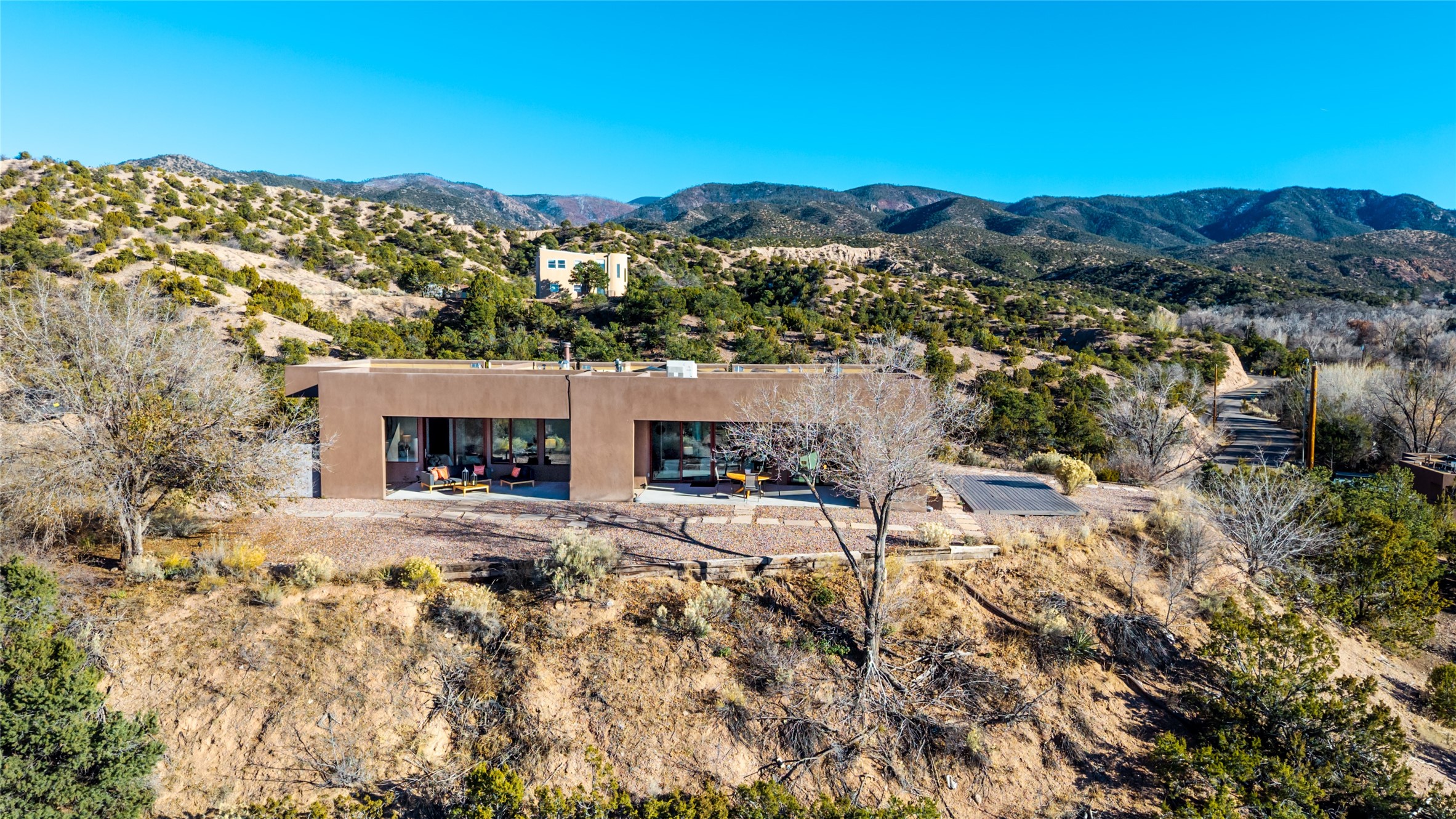 Perched atop a private hill in the storied community of Chupadero, this contemporary split floor plan 2-bed, 2-bath residence delivers the kind of views most people only dream about. Thoughtfully designed for high-desert living, the home includes solar power and water catchment, underscoring a sustainable, forward-thinking approach to life in this remarkable landscape. Indoor-outdoor living shines here, with each room offering direct access to the surrounding patios and the panorama beyond.Radiant in-floor heating, a wood-burning stove, and ductless mini splits that both warm and cool the home year-round. The kitchen sink frames a stunning view of the Sangre de Cristos.Just 20 minutes from downtown Santa Fe and even closer to amenities such as the Four Seasons, El Nido Restaurant, and Tesuque Village Market. Chupadero offers a lifestyle that feels both connected and wonderfully serene. Make an appointment to experience this special home for yourself.