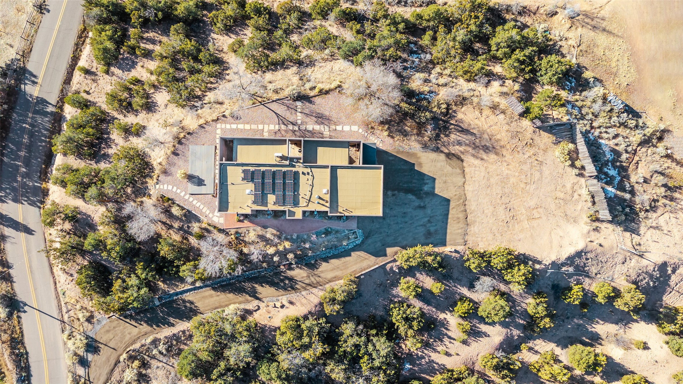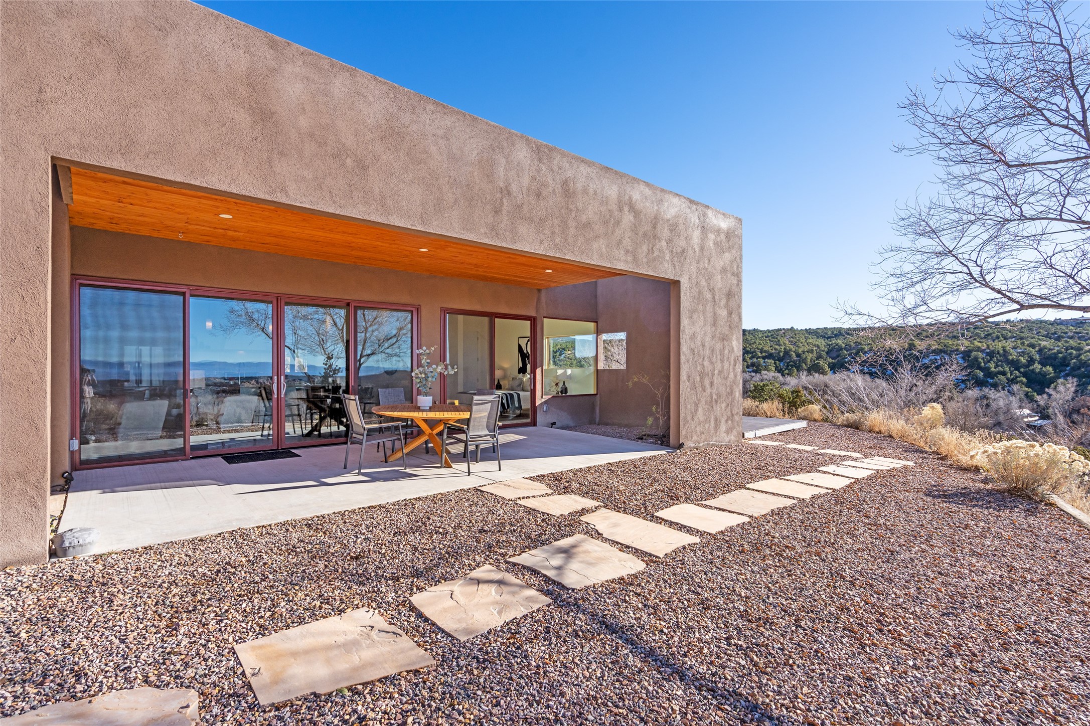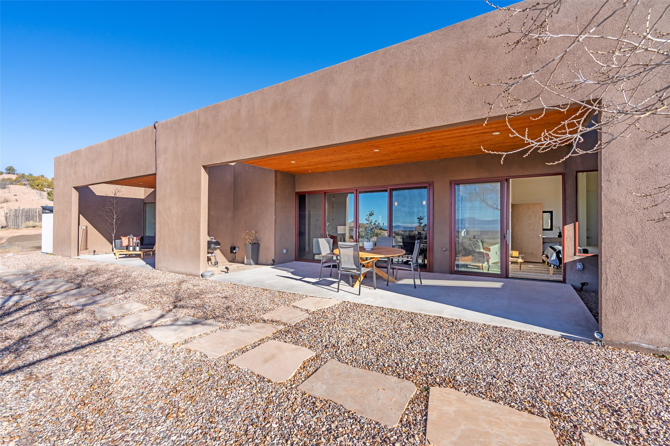 Perched atop a private hill in the storied community of Chupadero, this contemporary split floor plan 2-bed, 2-bath residence delivers the kind of views most people only dream about. Thoughtfully designed for high-desert living, the home includes solar power and water catchment, underscoring a sustainable, forward-thinking approach to life in this remarkable landscape. Indoor-outdoor living shines here, with each room offering direct access to the surrounding patios and the panorama beyond.Radiant in-floor heating, a wood-burning stove, and ductless mini splits that both warm and cool the home year-round. The kitchen sink frames a stunning view of the Sangre de Cristos.Just 20 minutes from downtown Santa Fe and even closer to amenities such as the Four Seasons, El Nido Restaurant, and Tesuque Village Market. Chupadero offers a lifestyle that feels both connected and wonderfully serene. Make an appointment to experience this special home for yourself.