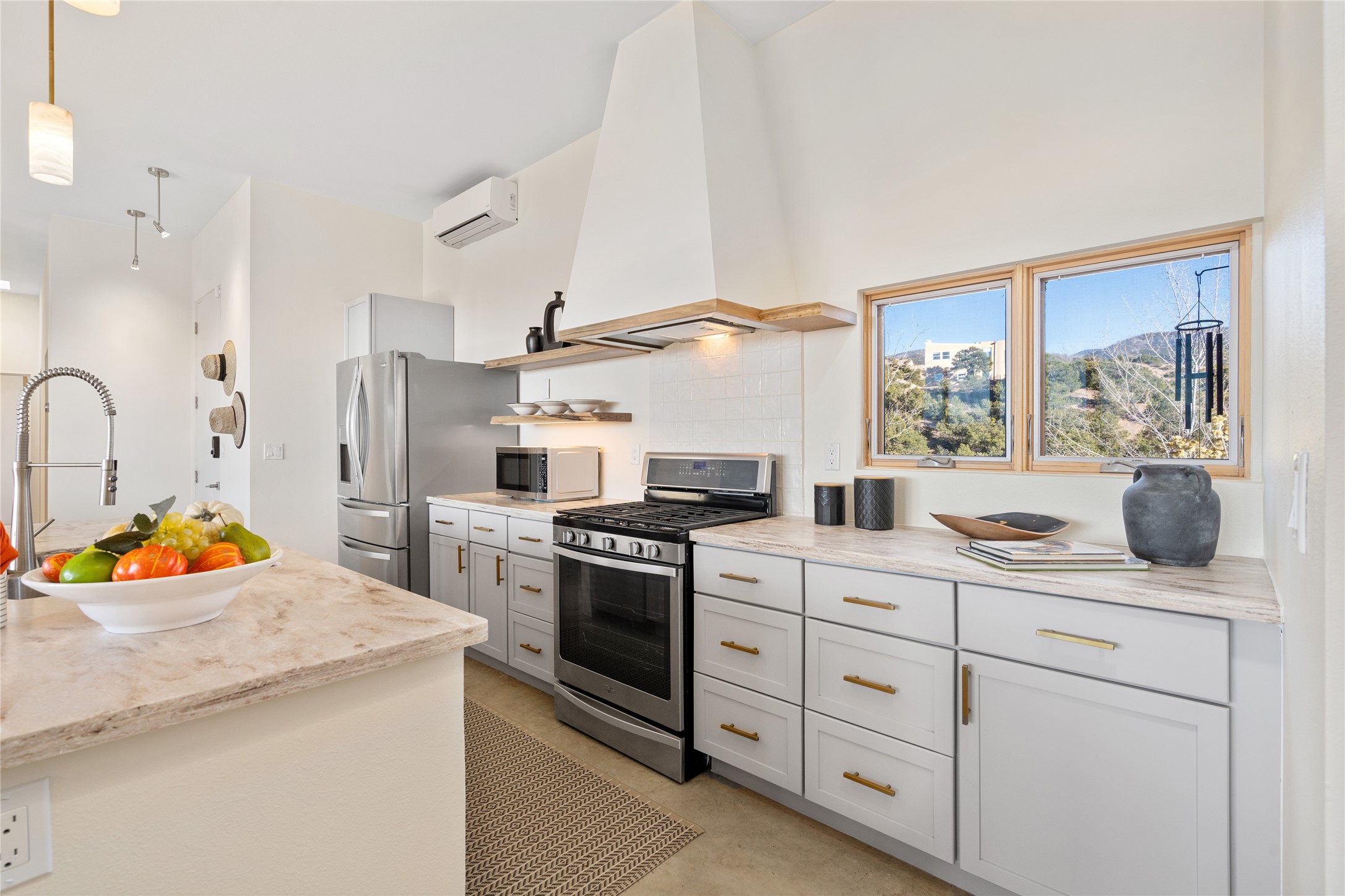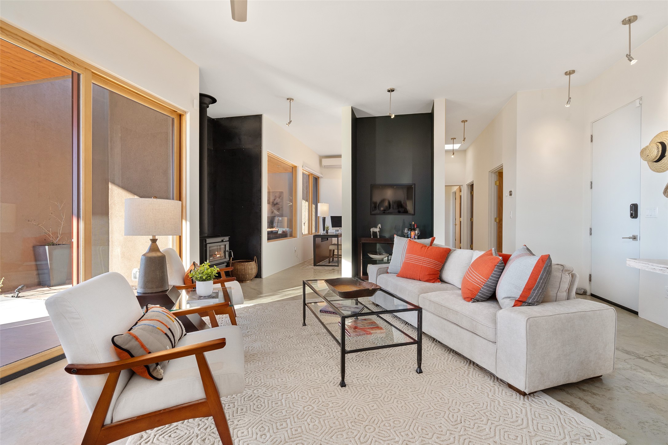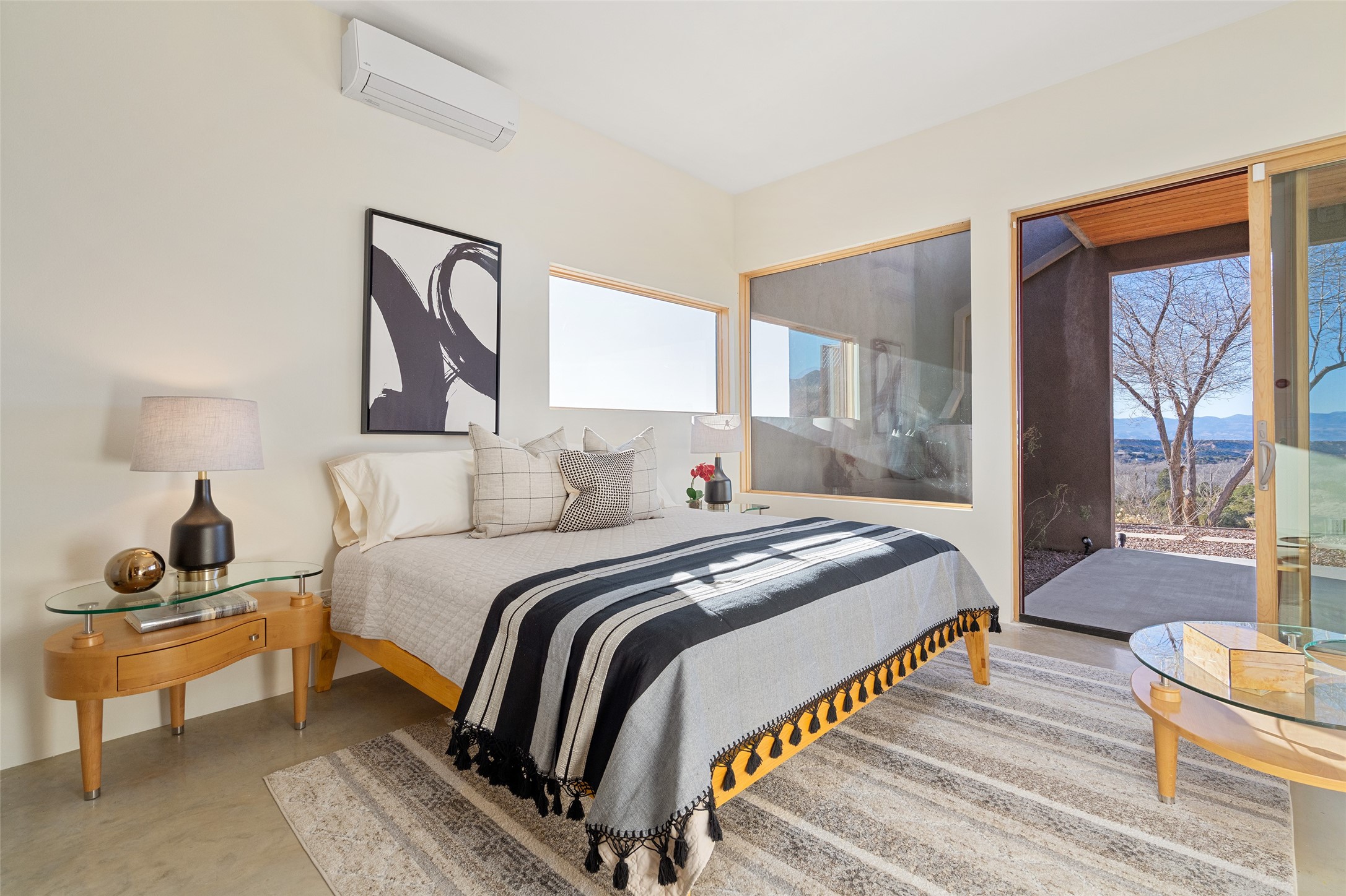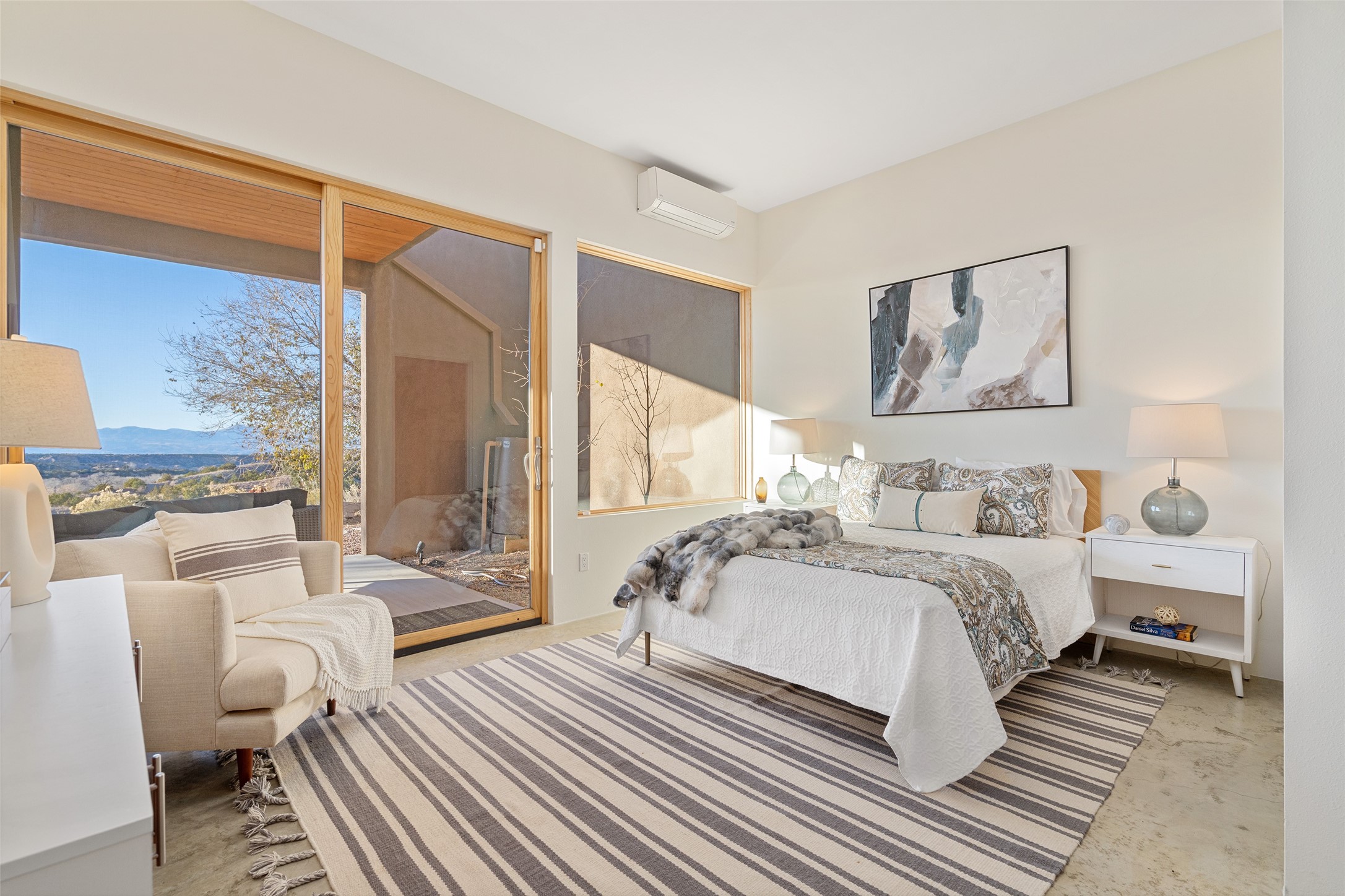 Perched atop a private hill in the storied community of Chupadero, this contemporary split floor plan 2-bed, 2-bath residence delivers the kind of views most people only dream about. Thoughtfully designed for high-desert living, the home includes solar power and water catchment, underscoring a sustainable, forward-thinking approach to life in this remarkable landscape. Indoor-outdoor living shines here, with each room offering direct access to the surrounding patios and the panorama beyond.Radiant in-floor heating, a wood-burning stove, and ductless mini splits that both warm and cool the home year-round. The kitchen sink frames a stunning view of the Sangre de Cristos.Just 20 minutes from downtown Santa Fe and even closer to amenities such as the Four Seasons, El Nido Restaurant, and Tesuque Village Market. Chupadero offers a lifestyle that feels both connected and wonderfully serene. Make an appointment to experience this special home for yourself.