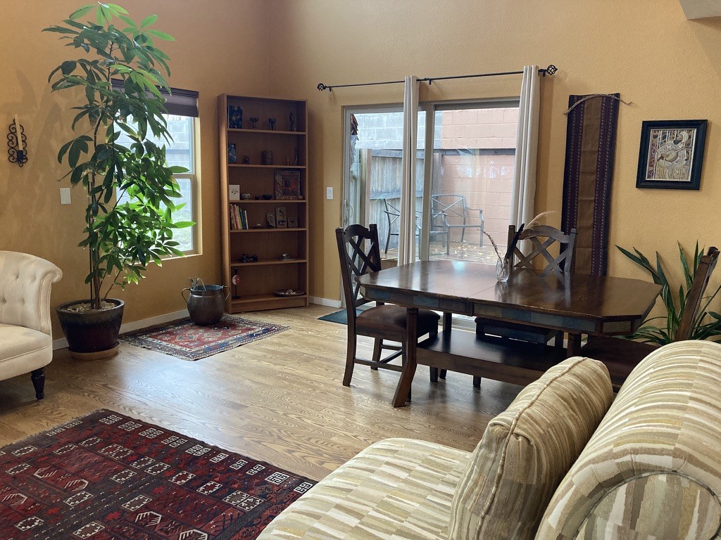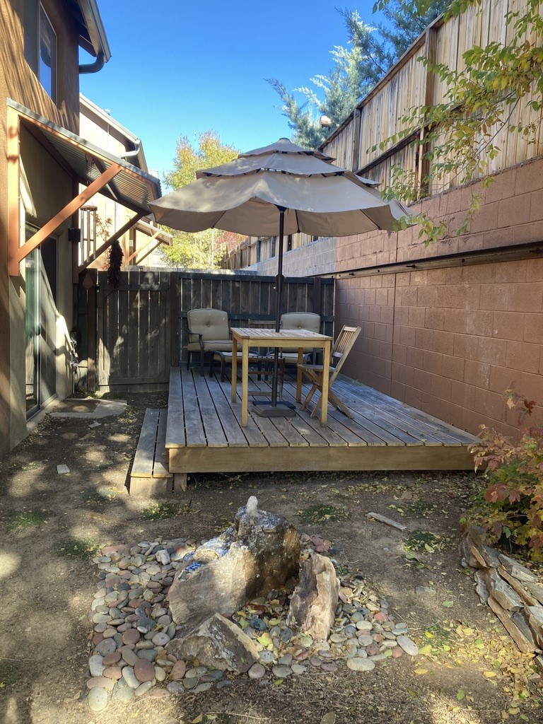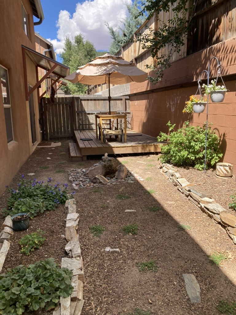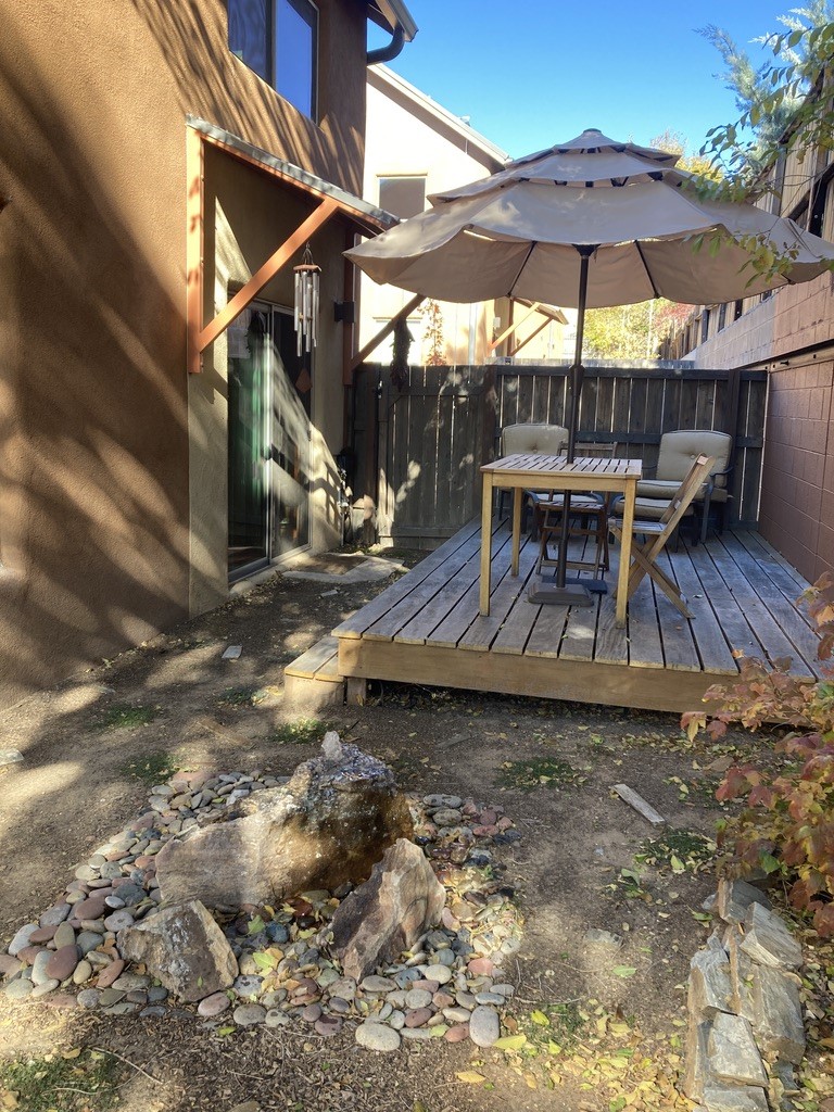 Discover an exceptional blend of comfort, style, and location at this beautifully upgraded 4 bed, 2 bath residence in River Trail Lofts. With direct access to the Santa Fe River Trail from your front door, this lightly used 1,877+/- sq ft home offers bright, inviting living spaces and a thoughtful two-story layout. Interior features include radiant heat, red oak flooring, high and vaulted ceilings, deep closets, upgraded kitchen appliances, and top down bottom up cellular blinds throughout. The kitchen and baths feature padded gym flooring for added comfort, with tile in the laundry room. The private backyard has been transformed into a serene outdoor retreat with a custom hardwood deck, fountain, custom storage shed, flower beds, new ground coverings, shrubs, and automated irrigation. It feels like a true extension of the living space and works well for quiet enjoyment or outdoor dining. Ample parking adds to the convenience. River Trail Lofts is tucked below Alameda with no through street, offering a peaceful setting with minimal traffic while still being minutes from downtown, the Railyard, shopping, and the airport. The seller is open to conveying the home furnished, including art, rugs, TV, dishware, and washer dryer, which can create a seamless turnkey move-in experience or investment opportunity. All furnishings would be sold separately under a separate agreement. The seller would like to close near the end of March 2026.