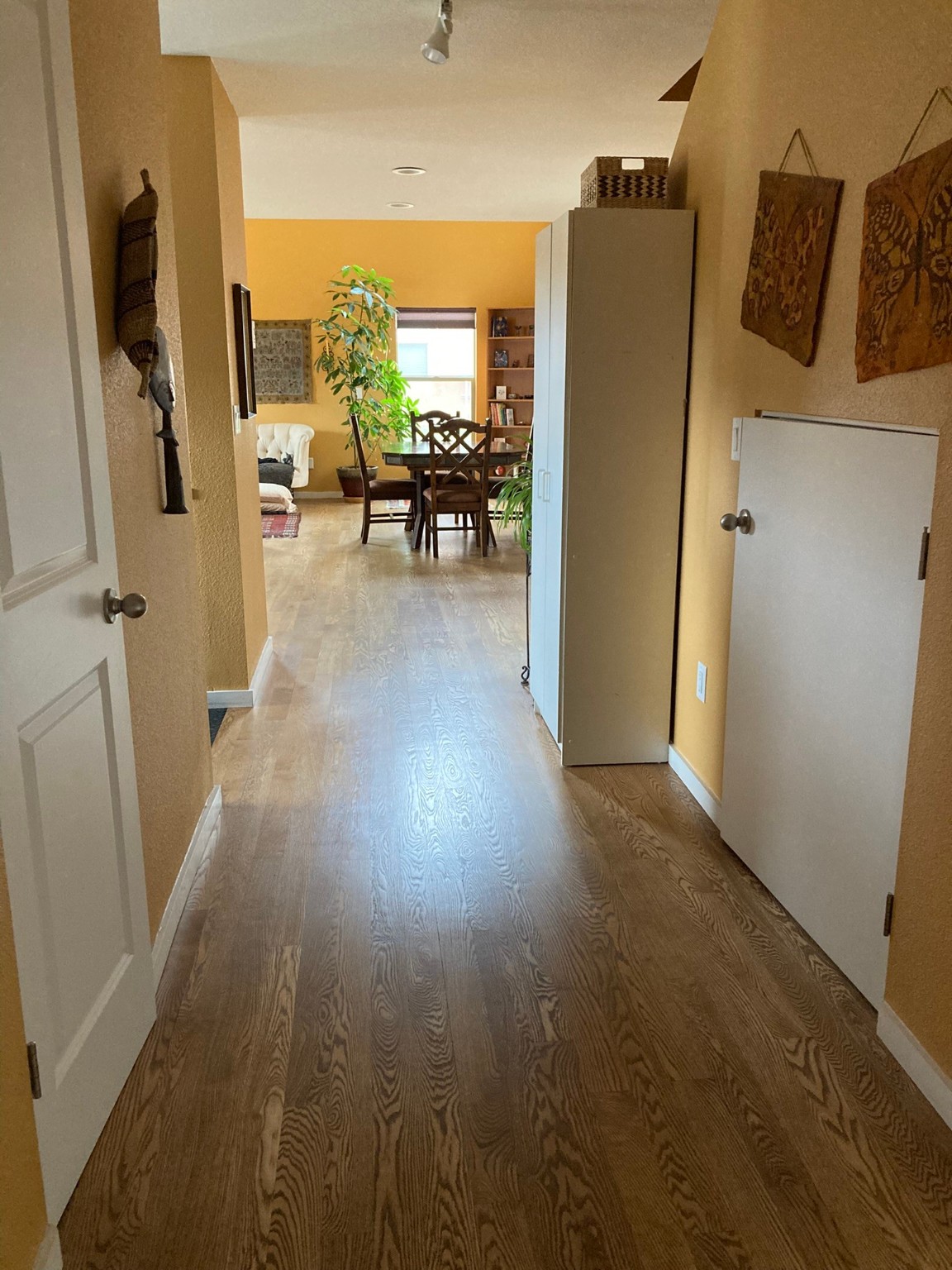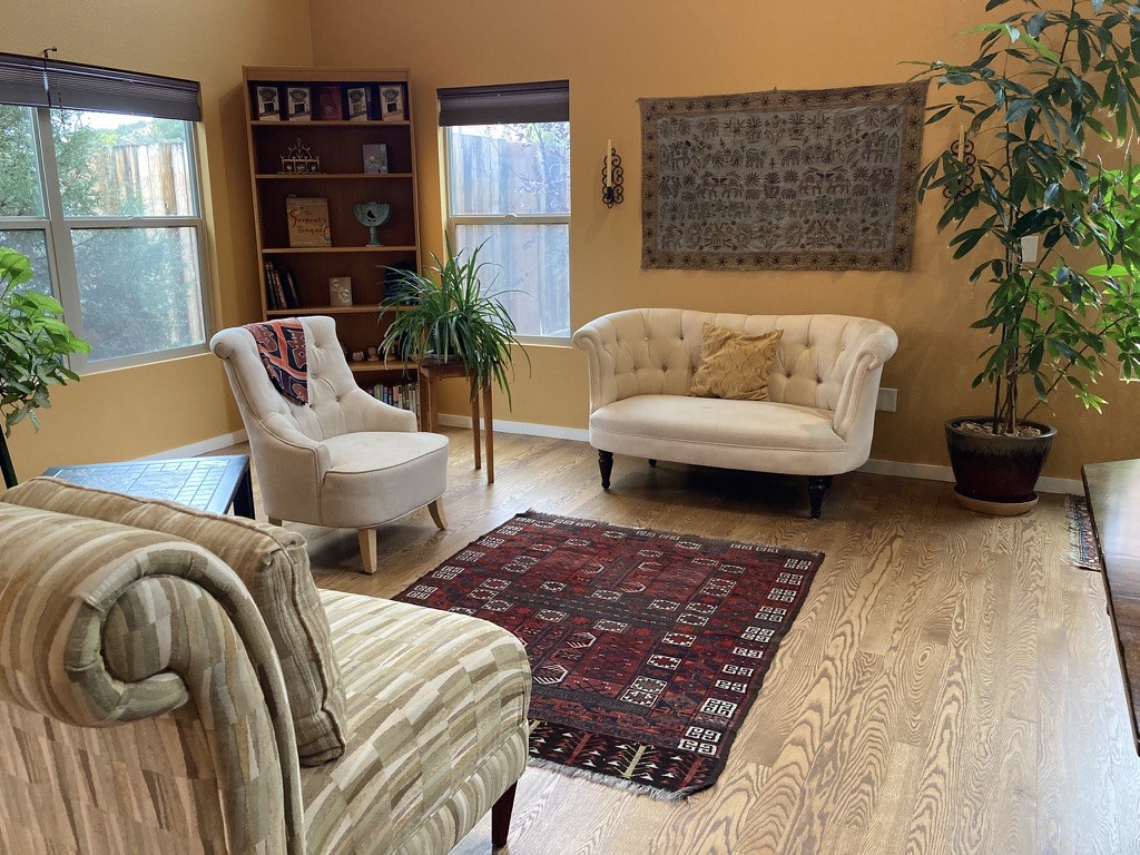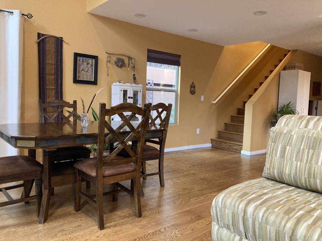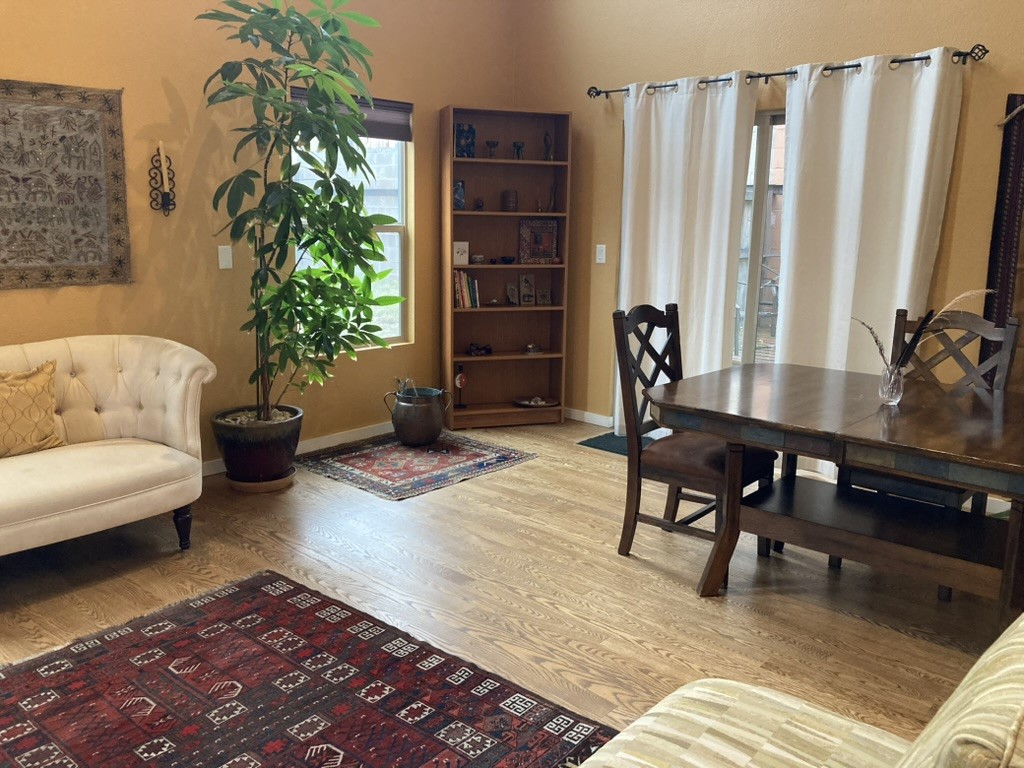 Discover an exceptional blend of comfort, style, and location at this beautifully upgraded 4 bed, 2 bath residence in River Trail Lofts. With direct access to the Santa Fe River Trail from your front door, this lightly used 1,877+/- sq ft home offers bright, inviting living spaces and a thoughtful two-story layout. Interior features include radiant heat, red oak flooring, high and vaulted ceilings, deep closets, upgraded kitchen appliances, and top down bottom up cellular blinds throughout. The kitchen and baths feature padded gym flooring for added comfort, with tile in the laundry room. The private backyard has been transformed into a serene outdoor retreat with a custom hardwood deck, fountain, custom storage shed, flower beds, new ground coverings, shrubs, and automated irrigation. It feels like a true extension of the living space and works well for quiet enjoyment or outdoor dining. Ample parking adds to the convenience. River Trail Lofts is tucked below Alameda with no through street, offering a peaceful setting with minimal traffic while still being minutes from downtown, the Railyard, shopping, and the airport. The seller is open to conveying the home furnished, including art, rugs, TV, dishware, and washer dryer, which can create a seamless turnkey move-in experience or investment opportunity. All furnishings would be sold separately under a separate agreement. The seller would like to close near the end of March 2026.