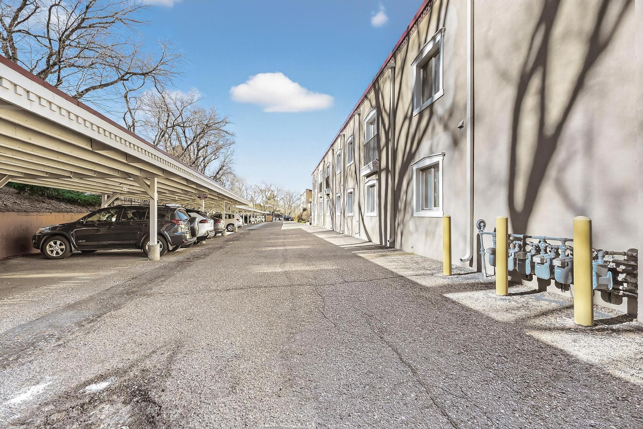 Just in time for the holidays in Santa Fe! Ideally located just six blocks from the Santa Fe Plaza, this spacious one-bedroom, one-bath condominium offers rare walkability paired with privacy and quiet. Situated on the second floor at the back of the complex, this corner unit enjoys a peaceful setting along with a covered, dedicated parking space. Thoughtfully upgraded throughout, the home features granite countertops, stainless steel appliances, new wood flooring in the kitchen and bath, diamond plaster walls, and updated lighting. Built-in bookcases flank the cozy gas fireplace, adding both charm and function. French doors open to a tranquil patio with two private storage closets, creating an inviting indoor-outdoor flow. Additional highlights include central heating and air conditioning, a second balcony, and an HOA that covers exterior maintenance, landscaping, and gated security, making this an easy full-time residence or a perfect Santa Fe lock-and-leave. A furniture package is available with a satisfactory offer, allowing for a seamless move-in experience.