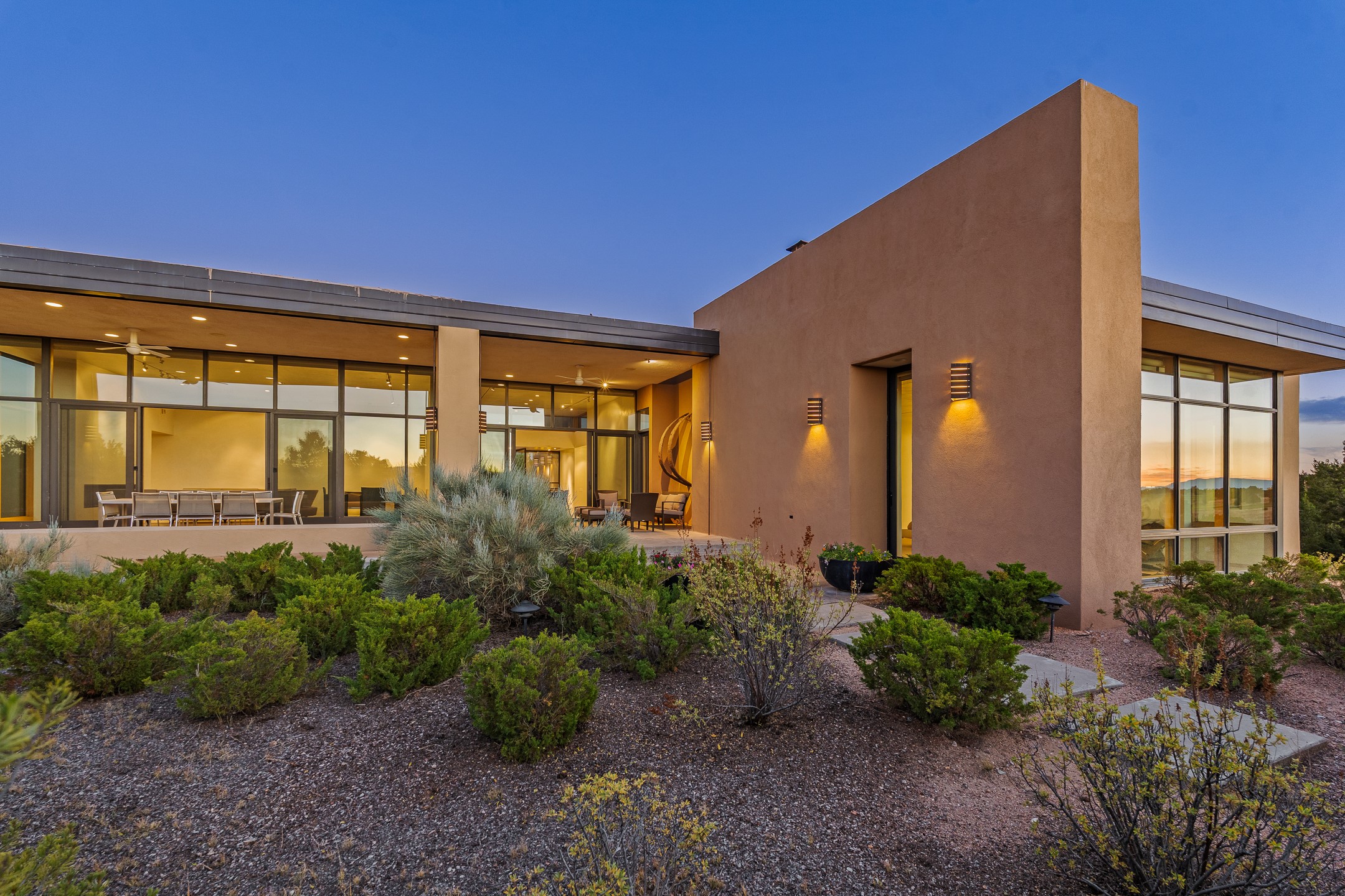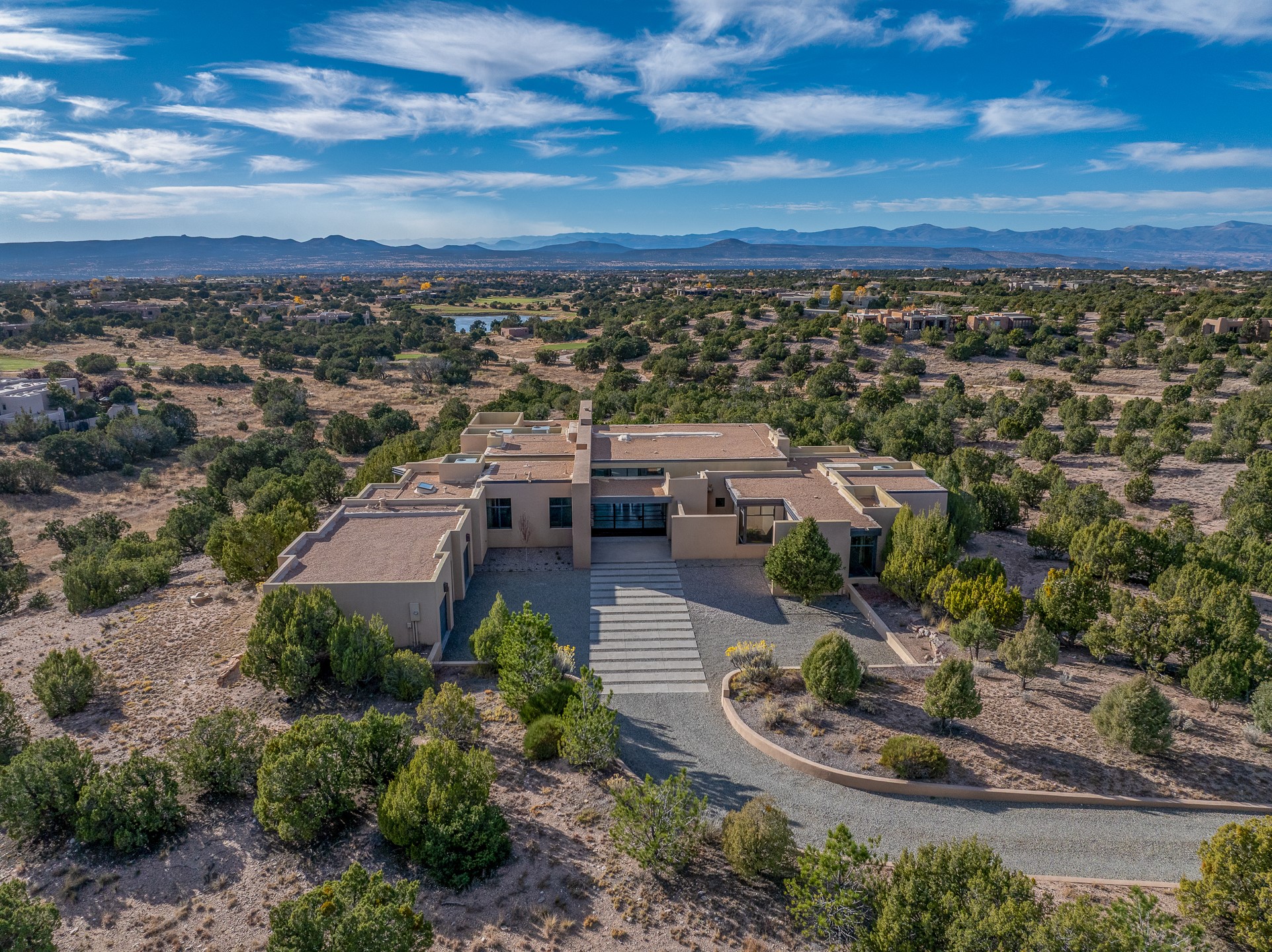 Striking modern architecture in Las Campanas! 26 Bishop's Dome was designed by Craig Hoopes and built by Chuck Apple to capture light, views, and refined Santa Fe living. The home offers 5 bedrooms and 7 bathrooms, including two powder rooms, with a thoughtfully designed floor plan featuring two living rooms and two portals, ideal for both elegant entertaining and relaxed daily living. Walls of glass frame extraordinary east-facing views of the snow-capped Sangre de Cristo Mountains and west-facing Jemez Mountain vistas, delivering exquisite sunset views. The portals extend the living spaces outdoors, creating seamless indoor-outdoor living for gatherings or quiet enjoyment of the surrounding landscape.Private bedroom suites provide comfort and flexibility, while a generous 3-car garage adds convenience and functionality. A rare opportunity to own a true architectural home where modern design, exceptional construction, and breathtaking mountain views converge.