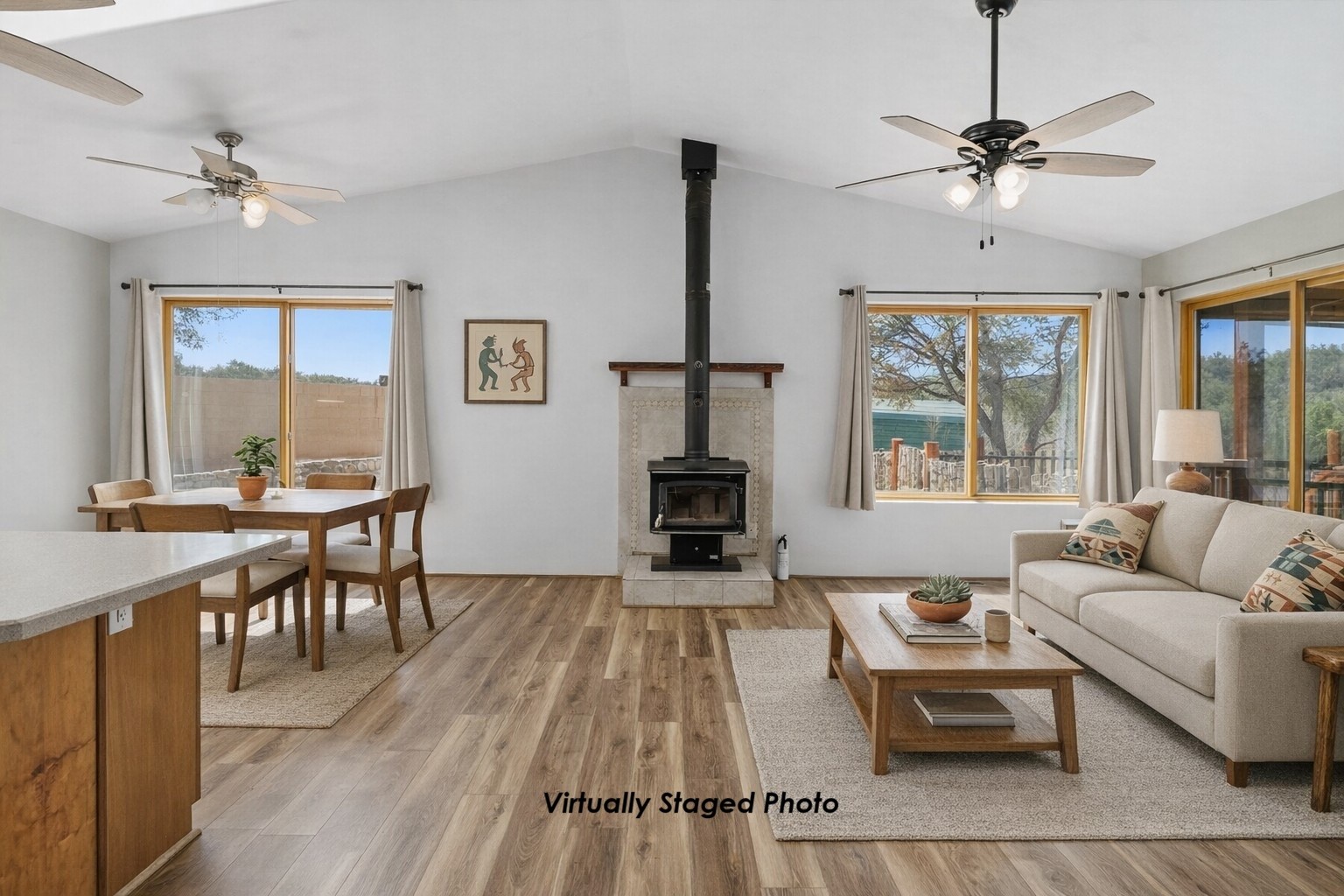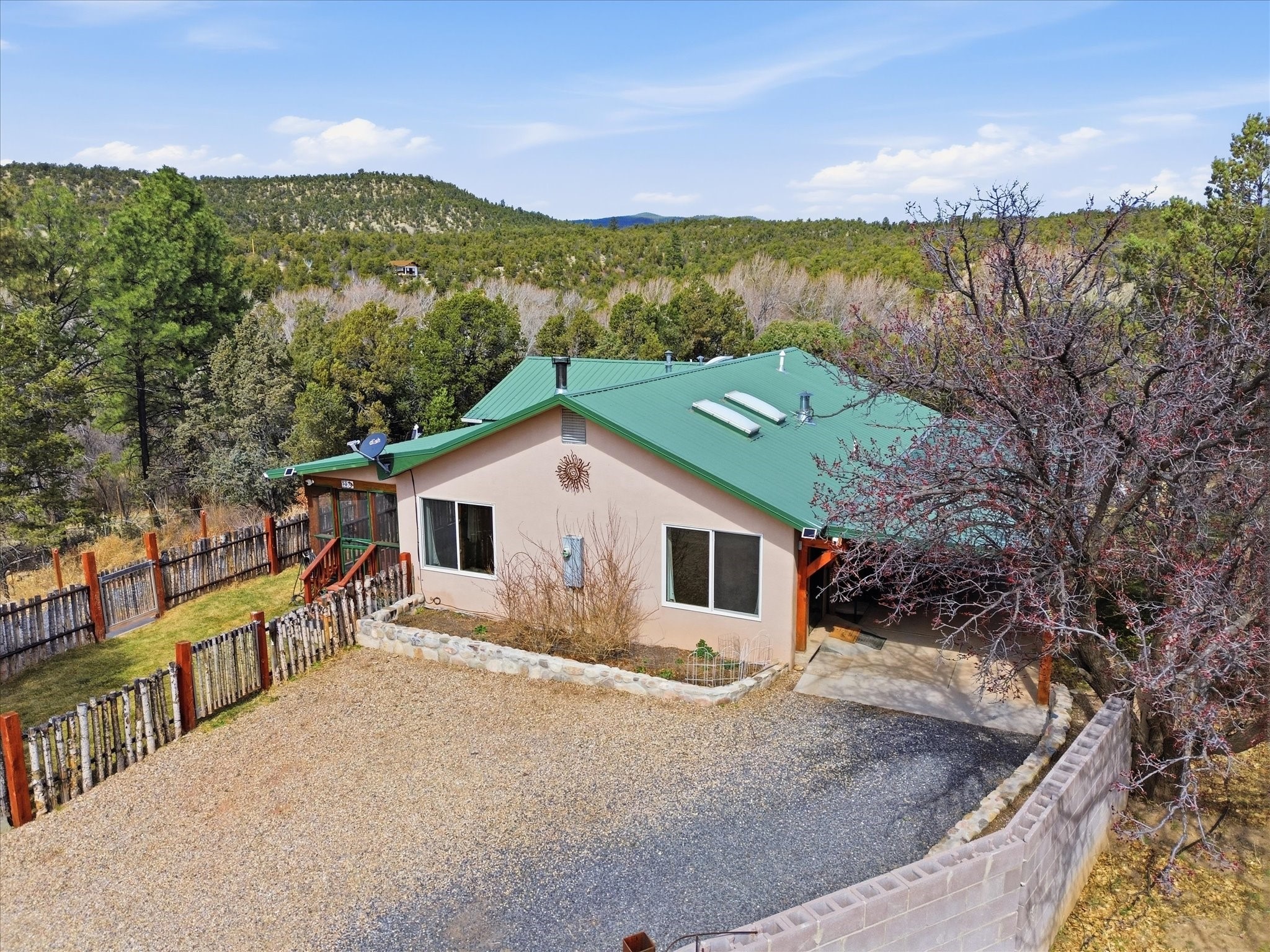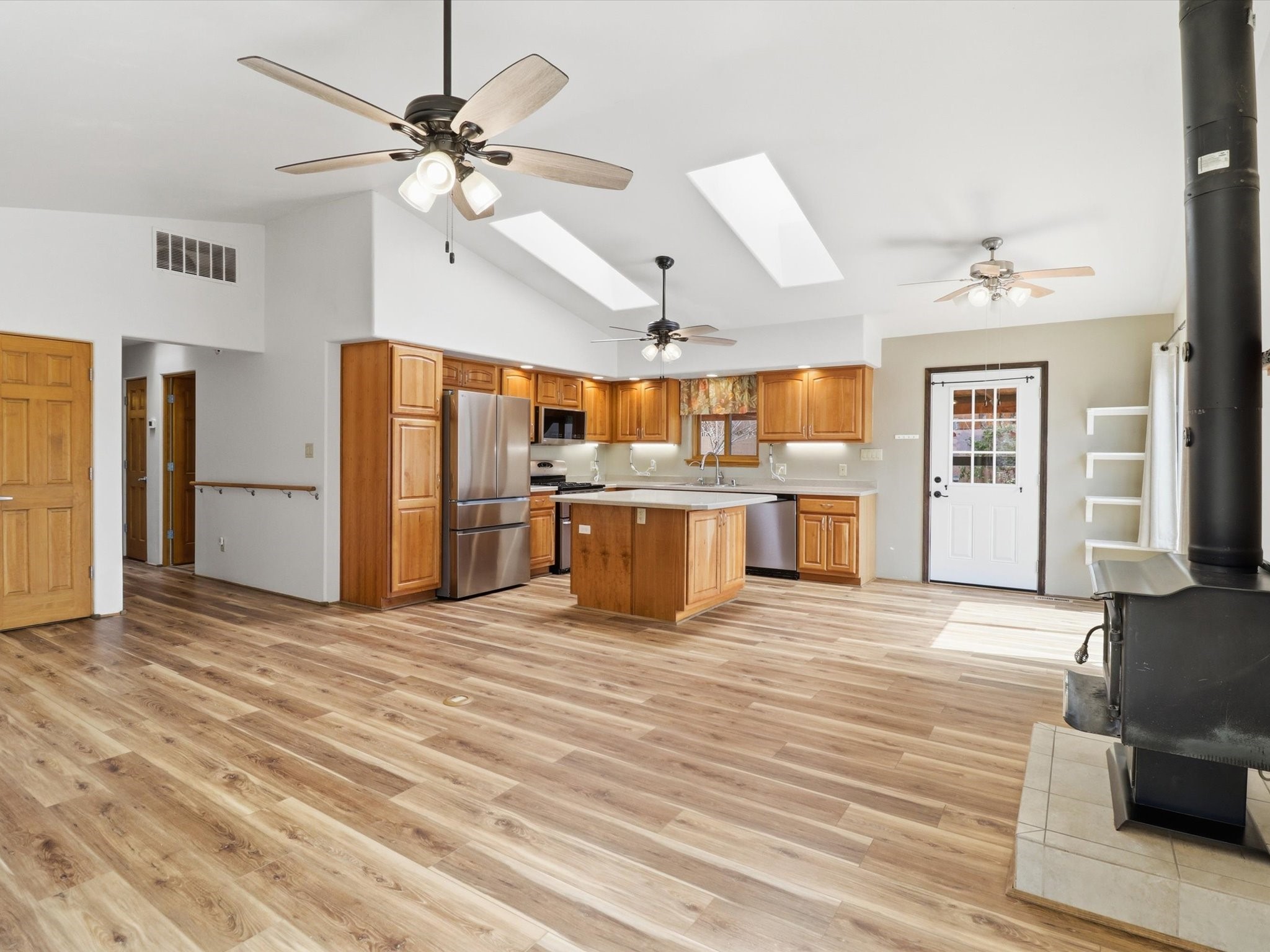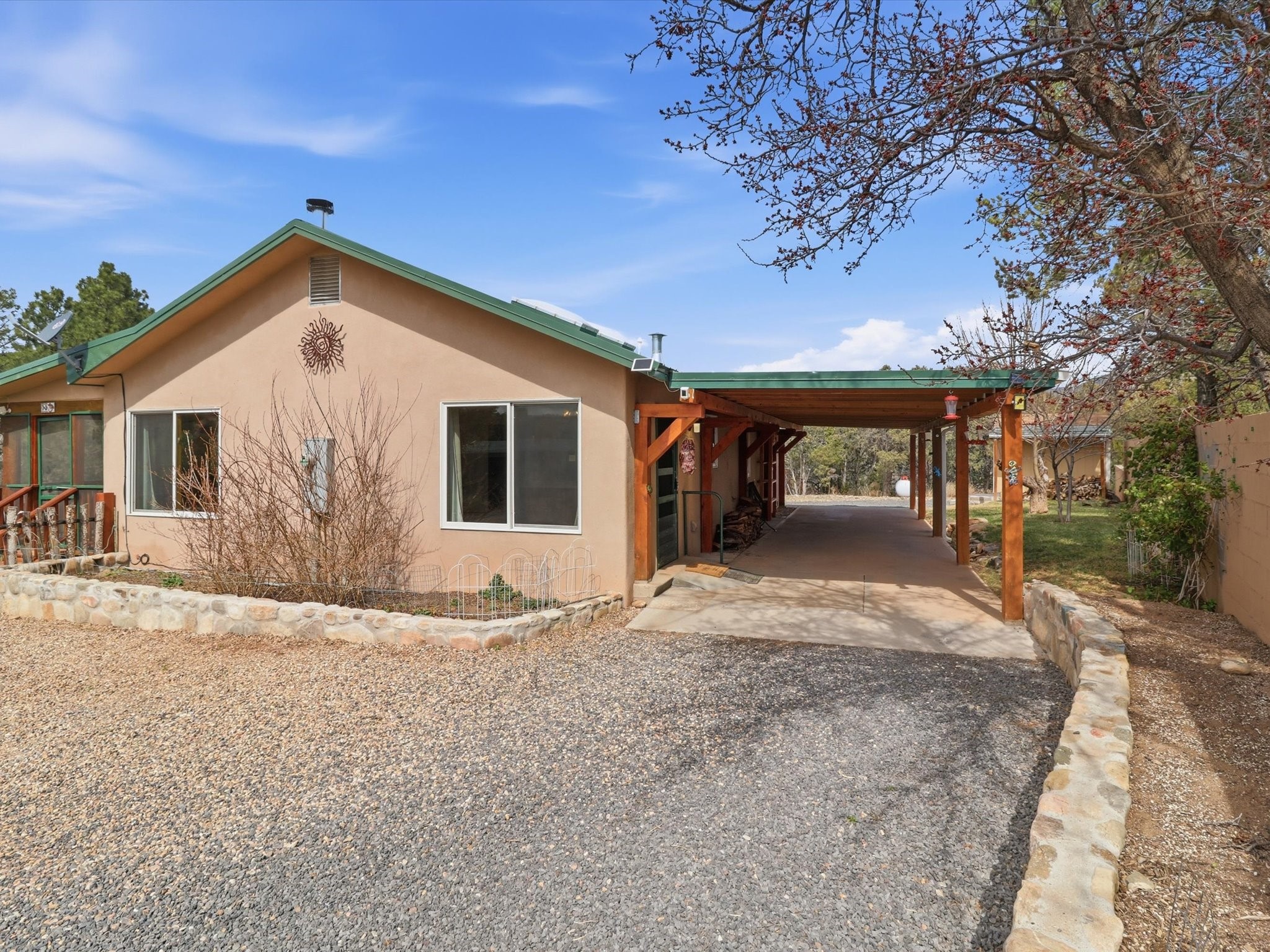 Step into this charming 3-bedroom, 2-bath single-level home, built in 2006, perfectly designed for comfort, style, and ease of living. From the moment you arrive, the spacious facade with a covered portal welcomes you inside.Enjoy the open-concept living area, where the vaulted ceiling, skylights, and abundant windows fill the space with natural light. The living room features a wood stove and flows seamlessly into the kitchen with ample cabinets, island breakfast counter, and all stainless-steel appliances.Step through the living area exit door to the covered patio, which overlooks the side yard, providing a relaxing outdoor space. A short walk leads to the Pecos River, whose soothing sounds can be enjoyed from the home. Additional features include laminate flooring, exterior storage, and a Propanel roof. The primary suite offers a spacious walk-in closet and an ensuite bath with his & her sinks and a glass-enclosed shower. With bright, inviting interiors and all living spaces on one level, this home offers comfort, convenience, and a touch of Santa Fe charm. A must-see at this price and condition!