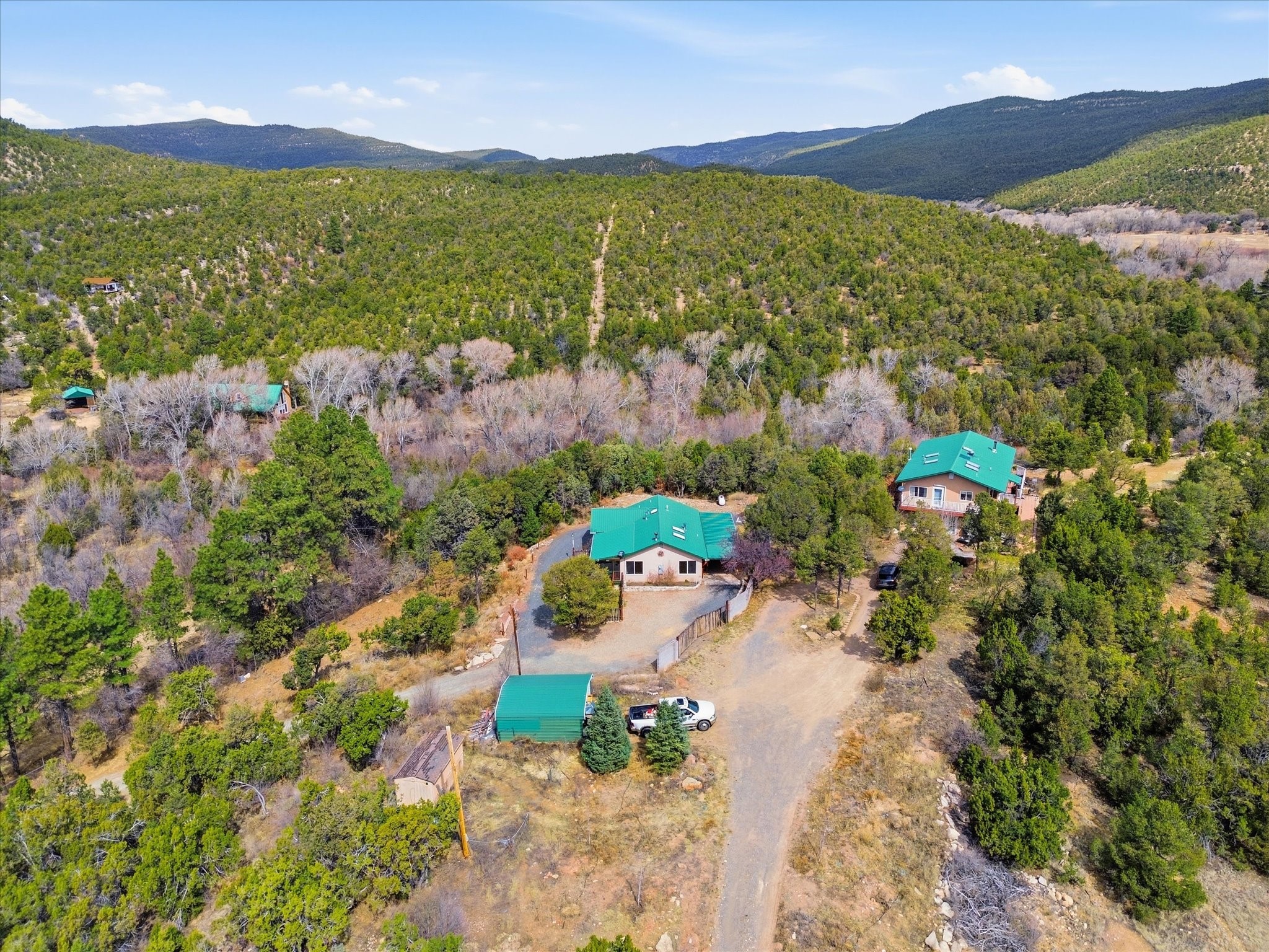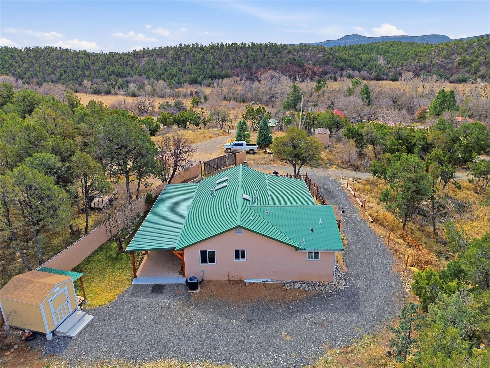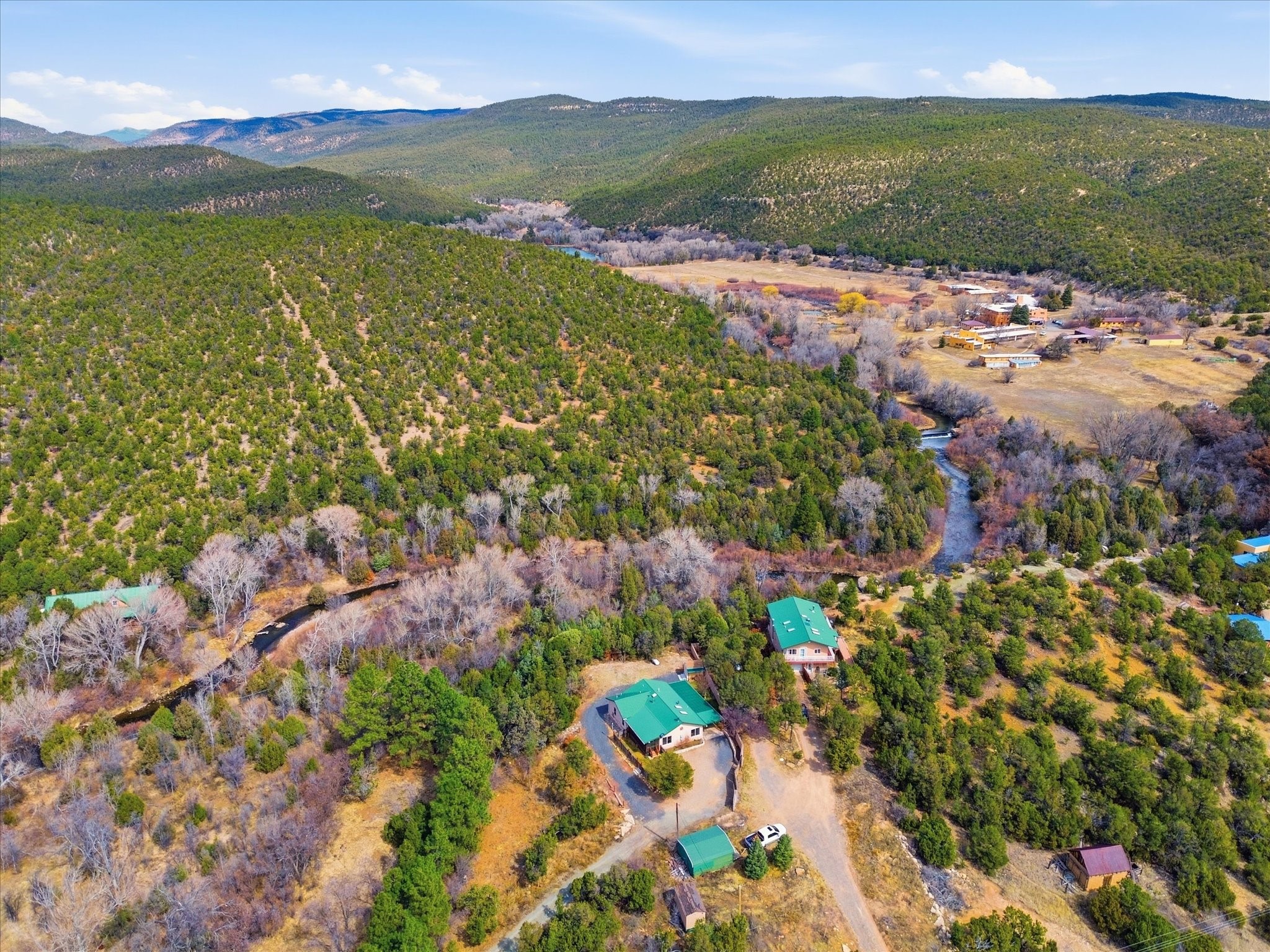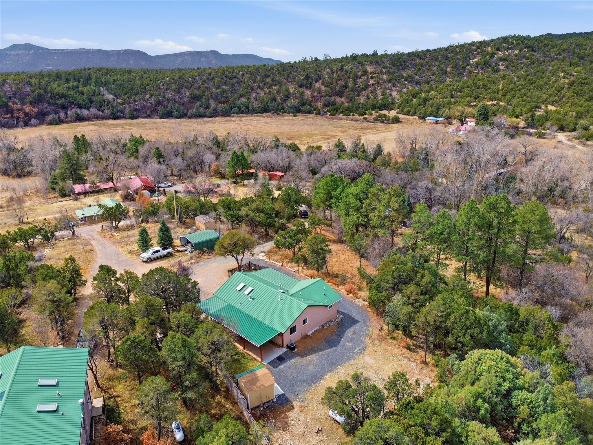Step into this charming 3-bedroom, 2-bath single-level home, built in 2006, perfectly designed for comfort, style, and ease of living. From the moment you arrive, the spacious facade with a covered portal welcomes you inside.Enjoy the open-concept living area, where the vaulted ceiling, skylights, and abundant windows fill the space with natural light. The living room features a wood stove and flows seamlessly into the kitchen with ample cabinets, island breakfast counter, and all stainless-steel appliances.Step through the living area exit door to the covered patio, which overlooks the side yard, providing a relaxing outdoor space. A short walk leads to the Pecos River, whose soothing sounds can be enjoyed from the home. Additional features include laminate flooring, exterior storage, and a Propanel roof. The primary suite offers a spacious walk-in closet and an ensuite bath with his & her sinks and a glass-enclosed shower. With bright, inviting interiors and all living spaces on one level, this home offers comfort, convenience, and a touch of Santa Fe charm. A must-see at this price and condition!