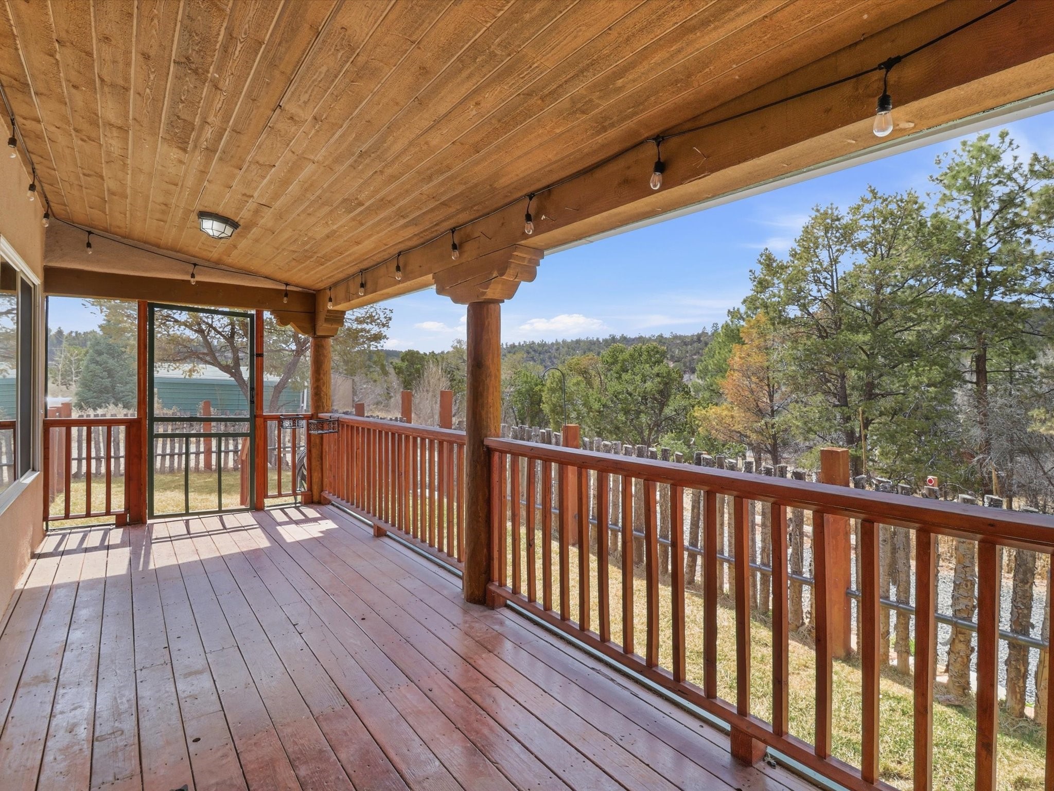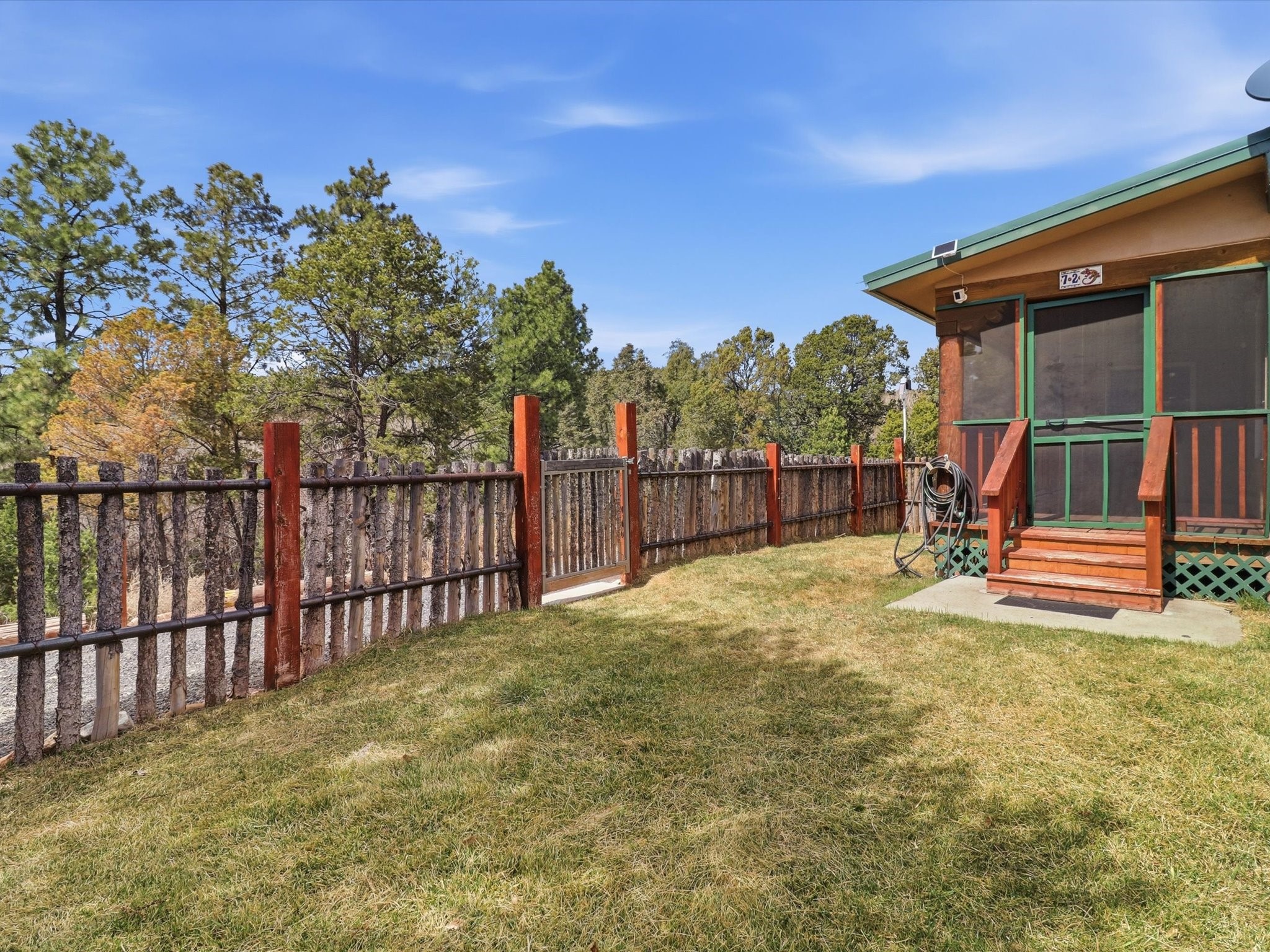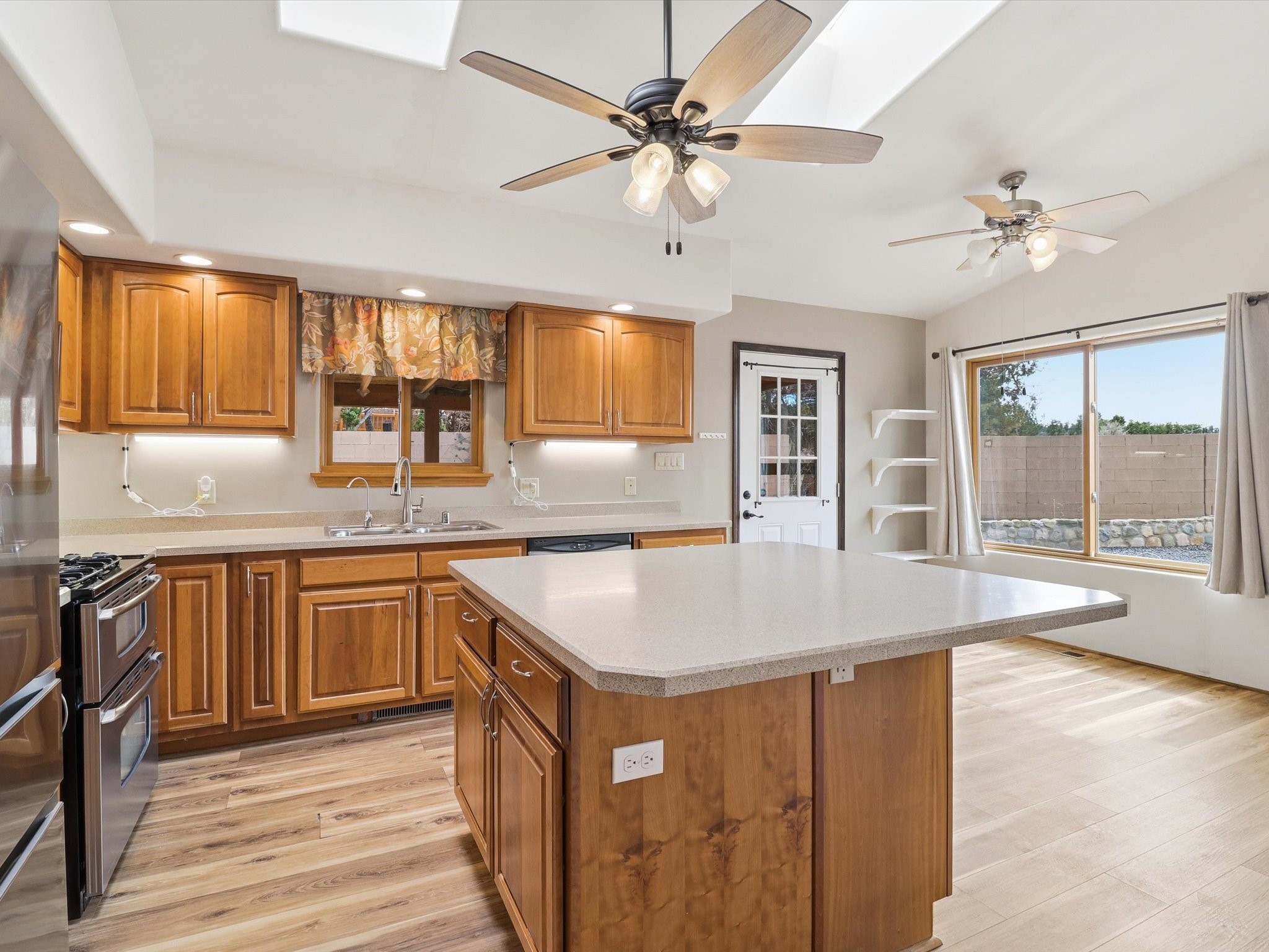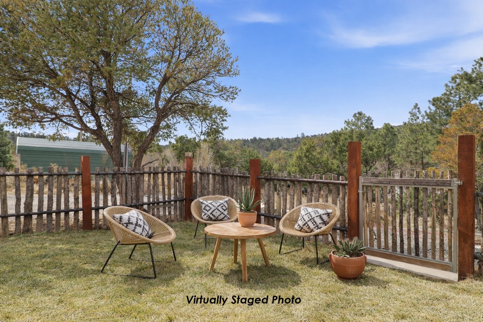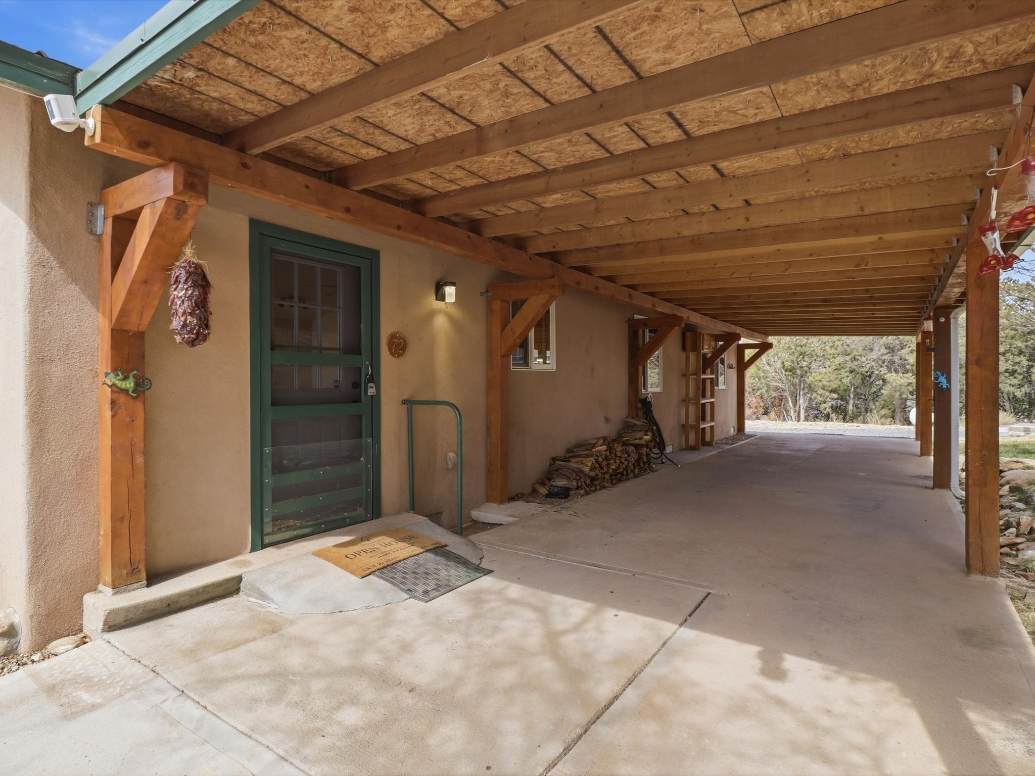 Step into this charming 3-bedroom, 2-bath single-level home, built in 2006, perfectly designed for comfort, style, and ease of living. From the moment you arrive, the spacious facade with a covered portal welcomes you inside.Enjoy the open-concept living area, where the vaulted ceiling, skylights, and abundant windows fill the space with natural light. The living room features a wood stove and flows seamlessly into the kitchen with ample cabinets, island breakfast counter, and all stainless-steel appliances.Step through the living area exit door to the covered patio, which overlooks the side yard, providing a relaxing outdoor space. A short walk leads to the Pecos River, whose soothing sounds can be enjoyed from the home. Additional features include laminate flooring, exterior storage, and a Propanel roof. The primary suite offers a spacious walk-in closet and an ensuite bath with his & her sinks and a glass-enclosed shower. With bright, inviting interiors and all living spaces on one level, this home offers comfort, convenience, and a touch of Santa Fe charm. A must-see at this price and condition!