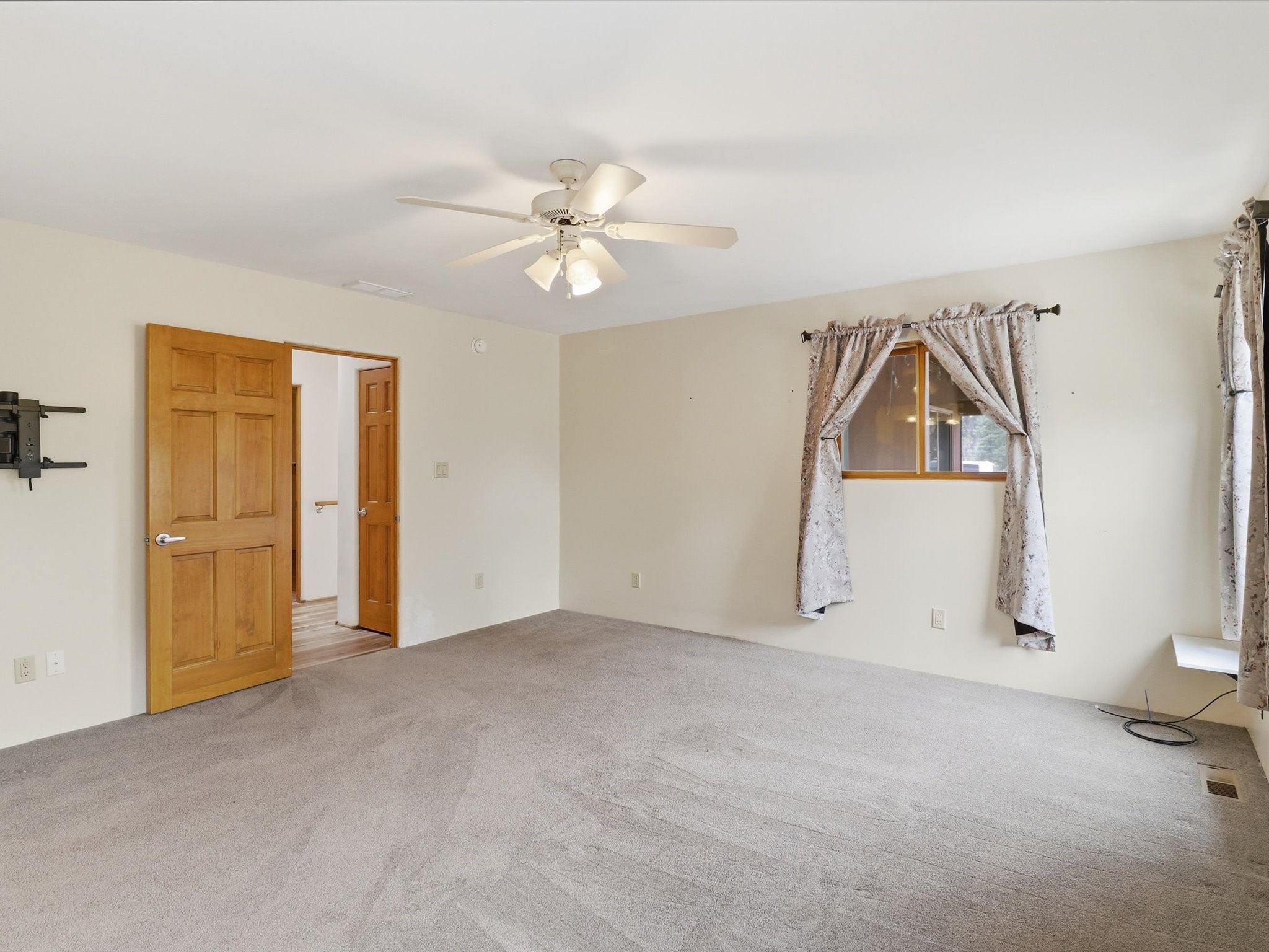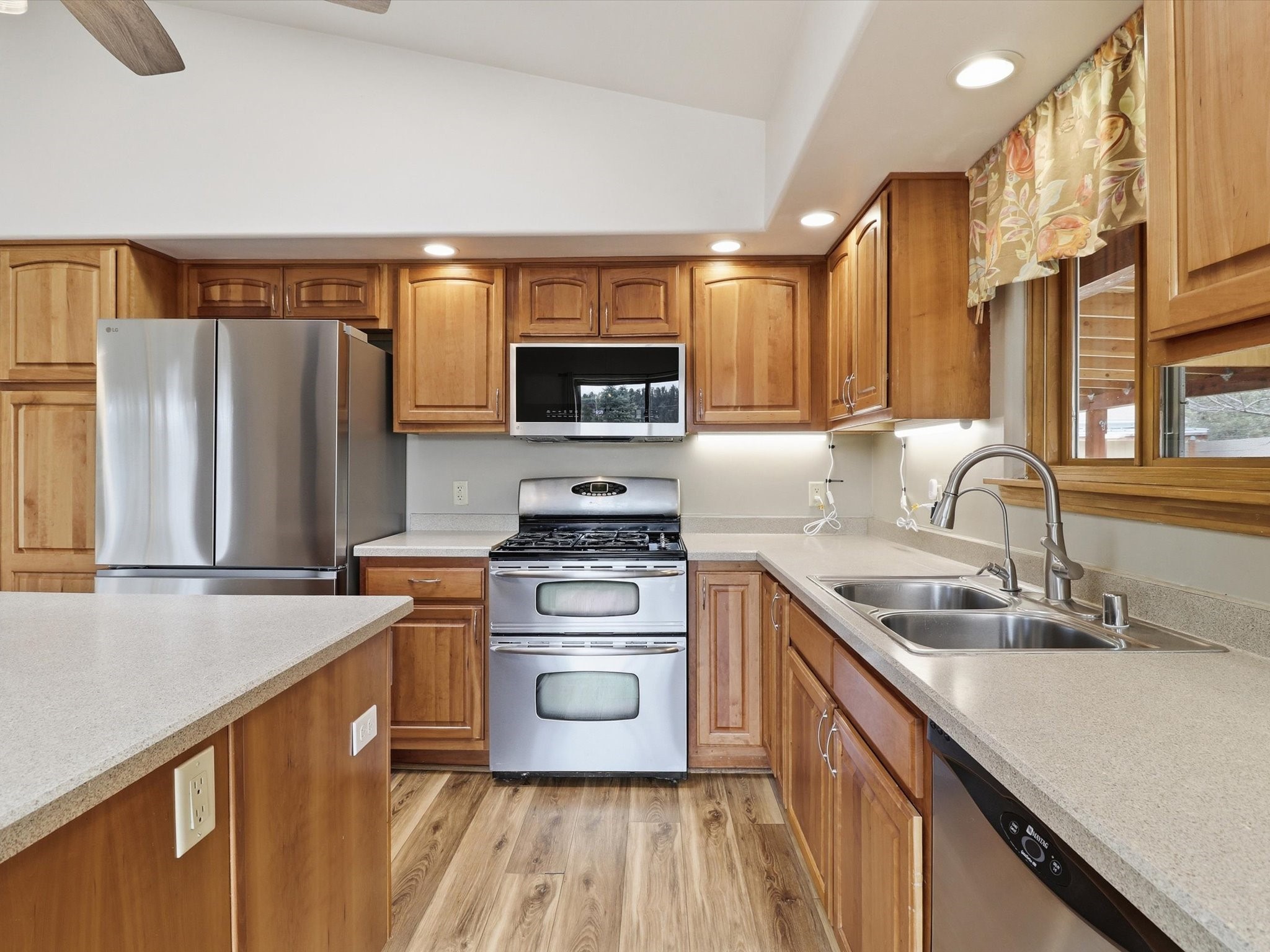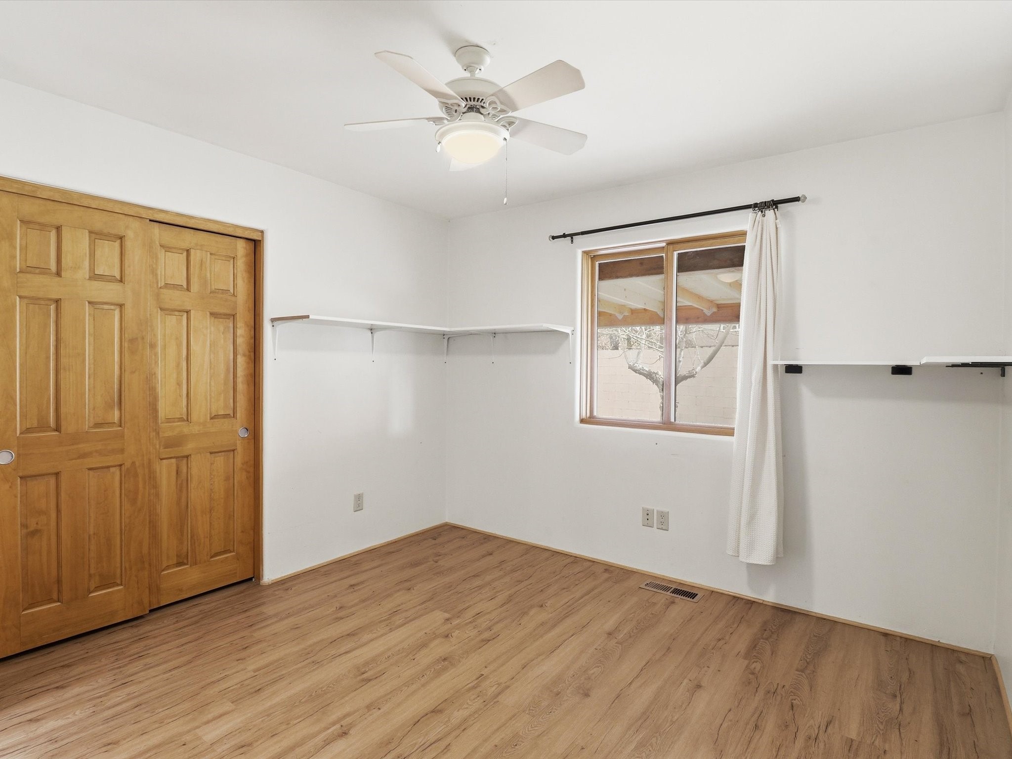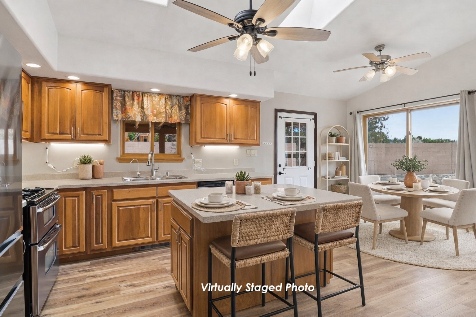 Step into this charming 3-bedroom, 2-bath single-level home, built in 2006, perfectly designed for comfort, style, and ease of living. From the moment you arrive, the spacious facade with a covered portal welcomes you inside.Enjoy the open-concept living area, where the vaulted ceiling, skylights, and abundant windows fill the space with natural light. The living room features a wood stove and flows seamlessly into the kitchen with ample cabinets, island breakfast counter, and all stainless-steel appliances.Step through the living area exit door to the covered patio, which overlooks the side yard, providing a relaxing outdoor space. A short walk leads to the Pecos River, whose soothing sounds can be enjoyed from the home. Additional features include laminate flooring, exterior storage, and a Propanel roof. The primary suite offers a spacious walk-in closet and an ensuite bath with his & her sinks and a glass-enclosed shower. With bright, inviting interiors and all living spaces on one level, this home offers comfort, convenience, and a touch of Santa Fe charm. A must-see at this price and condition!